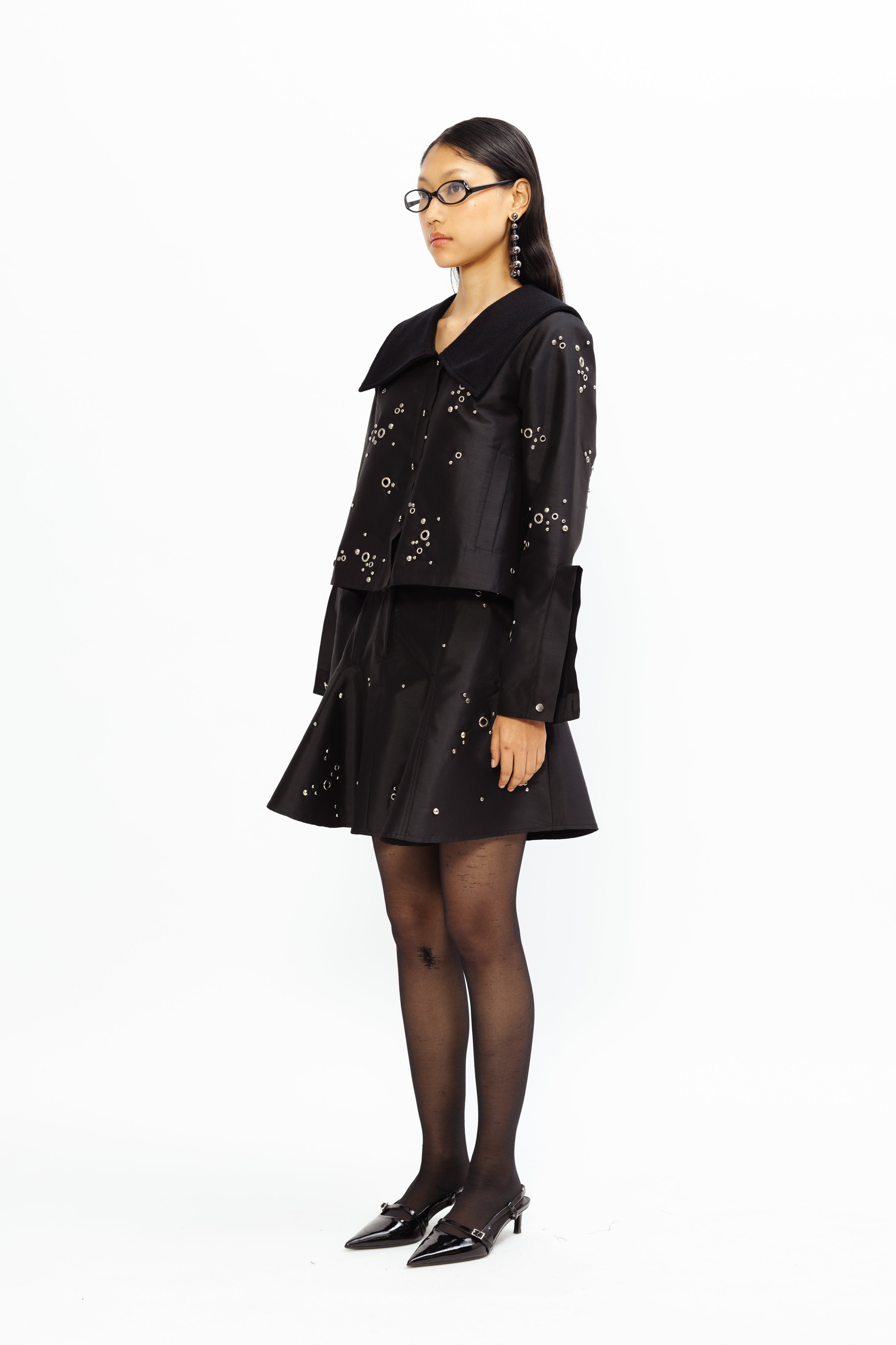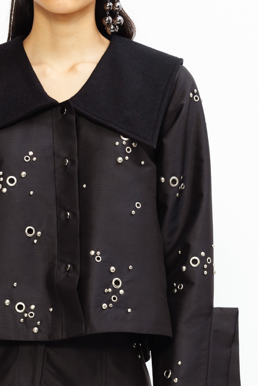 This cropped, structured top features an oversized sailor-style collar that adds a playful yet refined touch. The straight hemline creates a clean finish, while the long sleeves with dramatic, slightly flared cuffs lend a bold, contemporary edge to the silhouette.