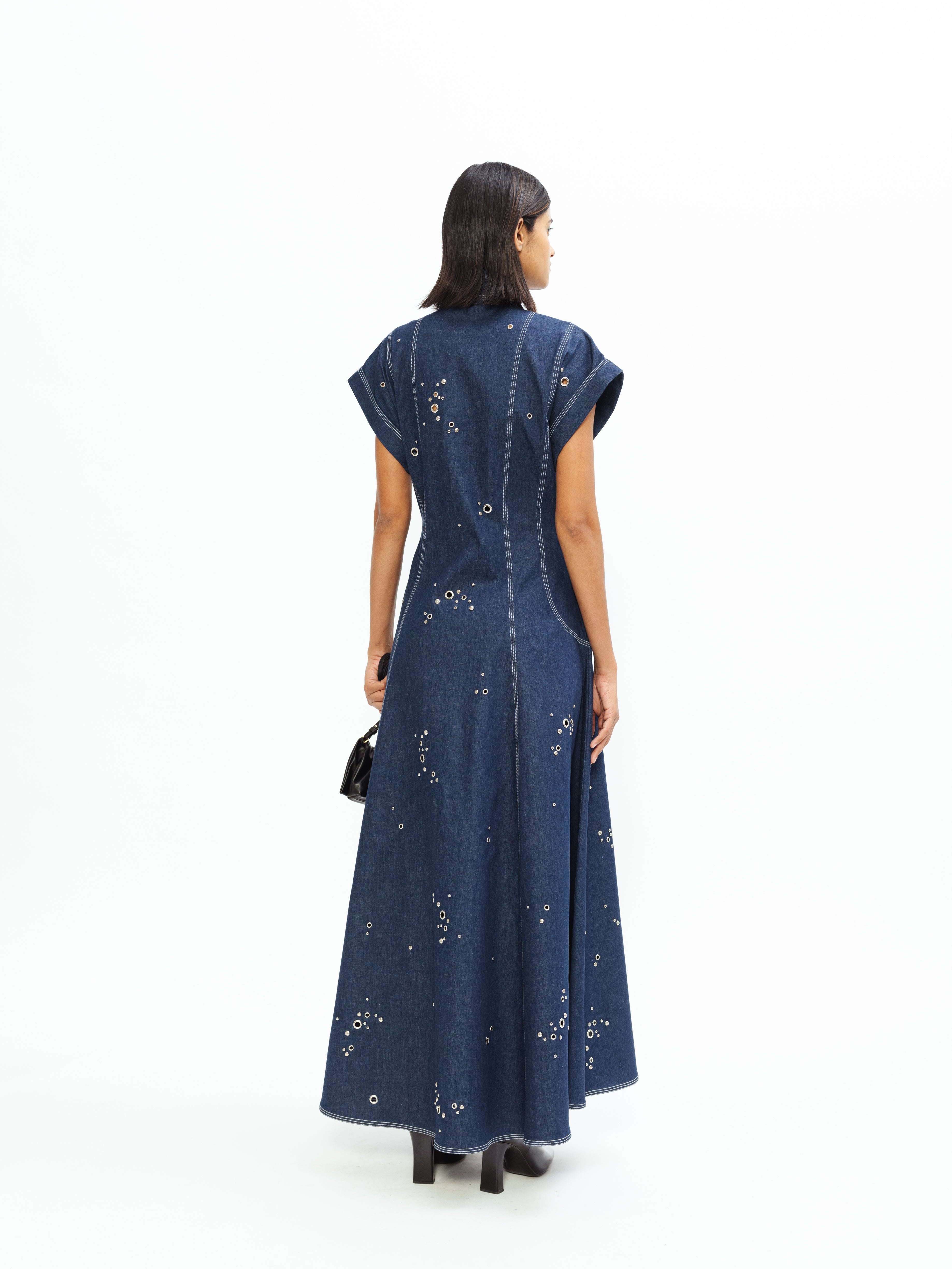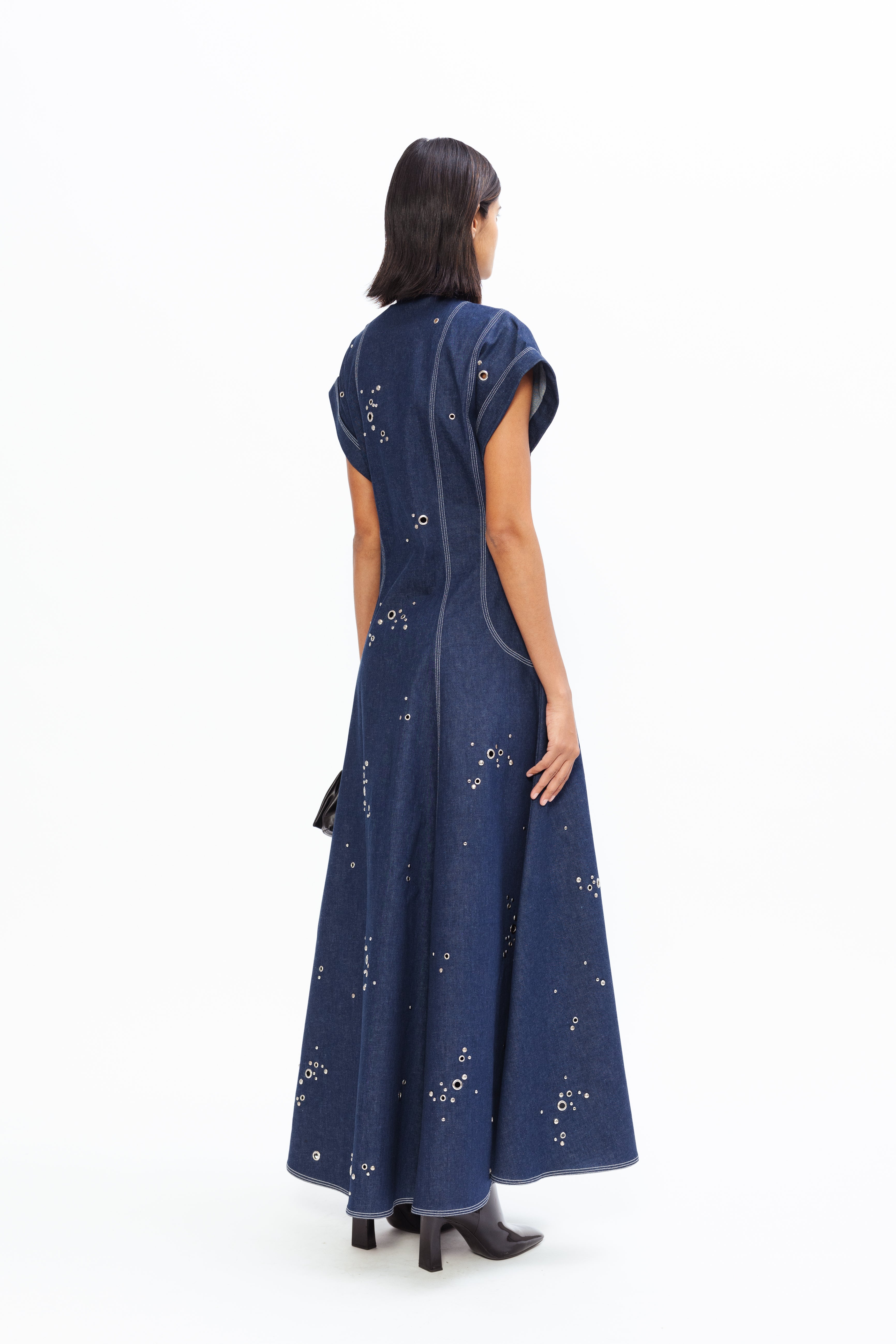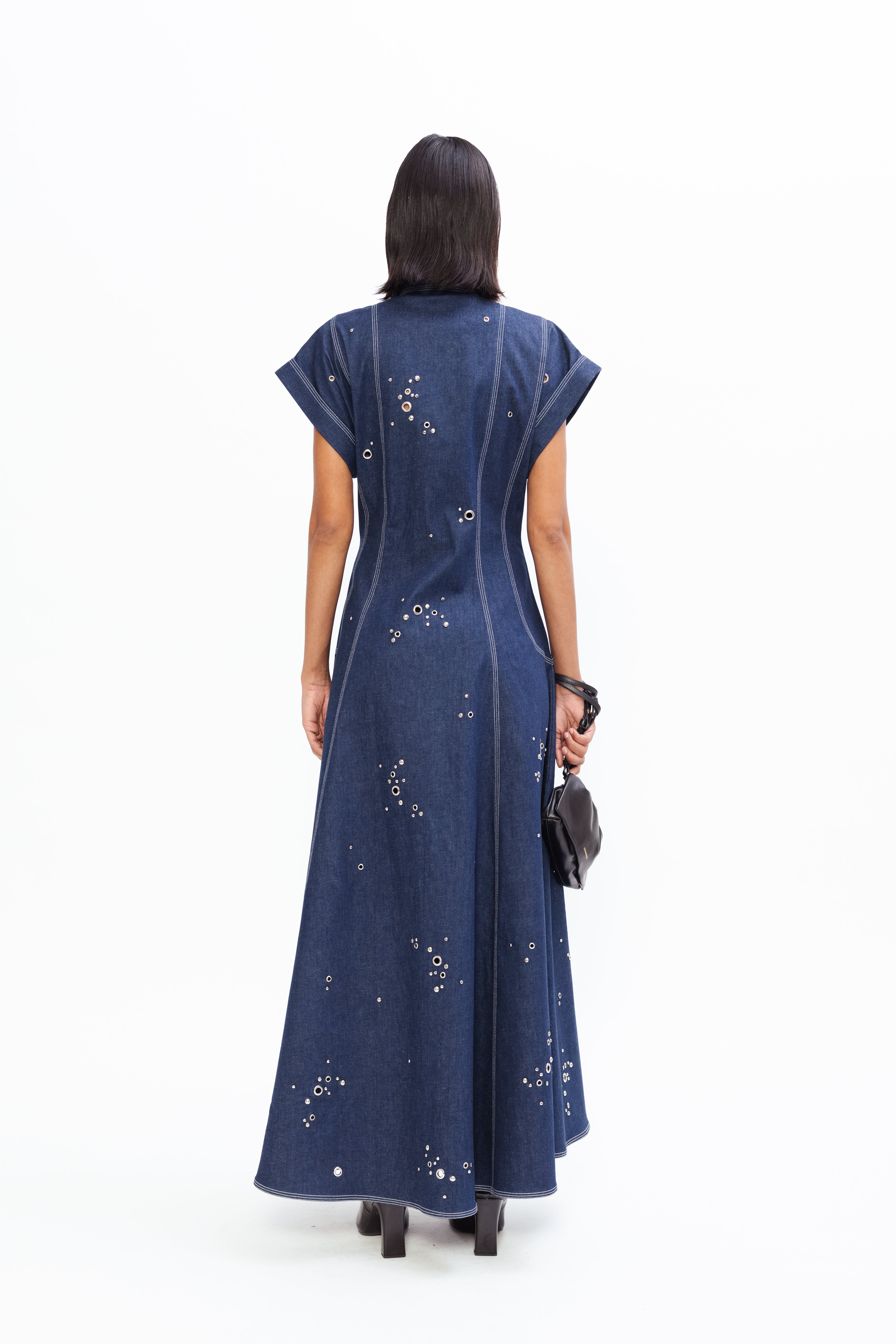 Sculpted to hold its shape, it’s finished with a front zipper and placket, detailed with circular rivets that emphasize its clean geometry. The deep, tonal surface lends a grounded feel, while precise seams and paneling give it clarity and confidence. A study in contrast: tough, tender, and unmistakably bold.