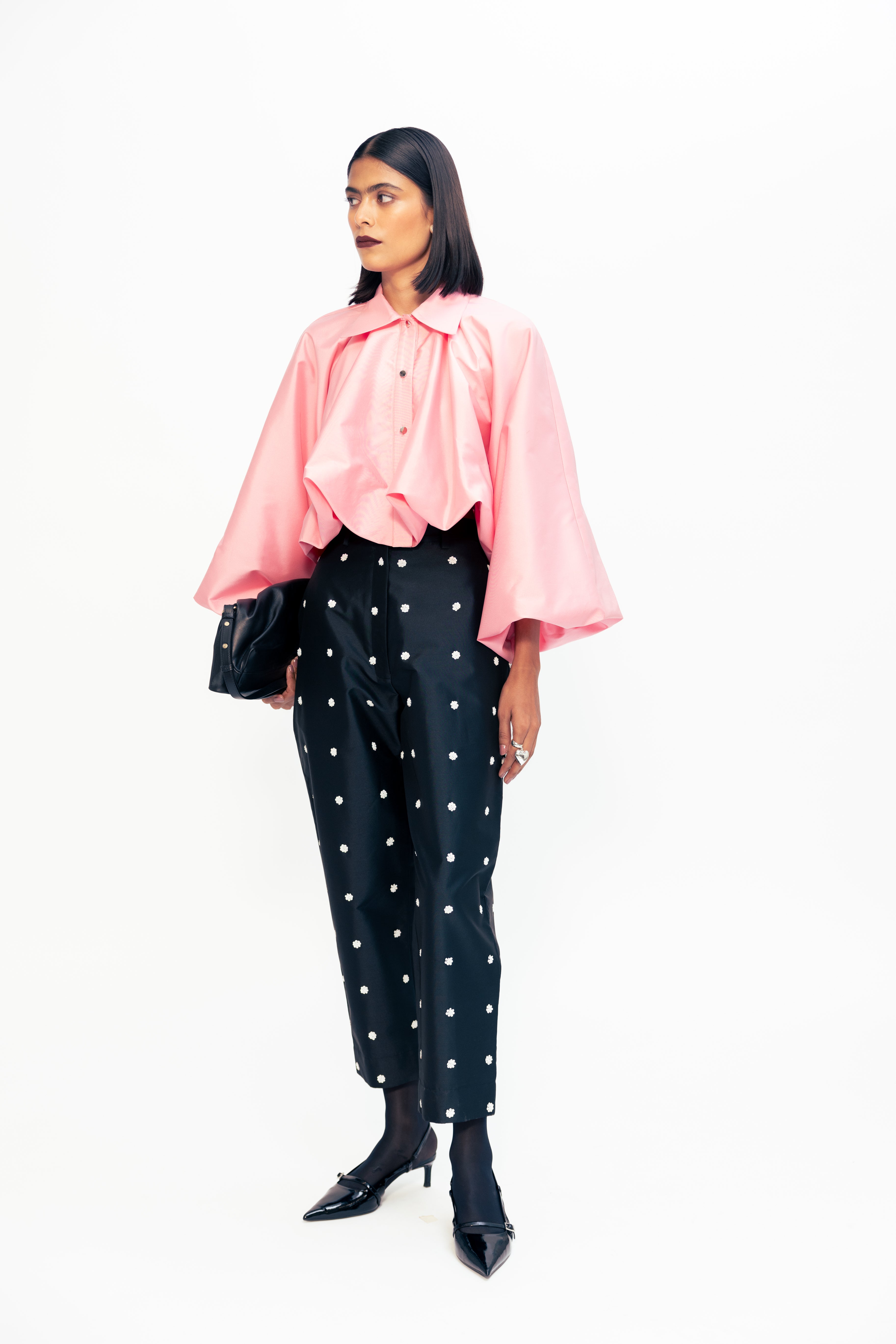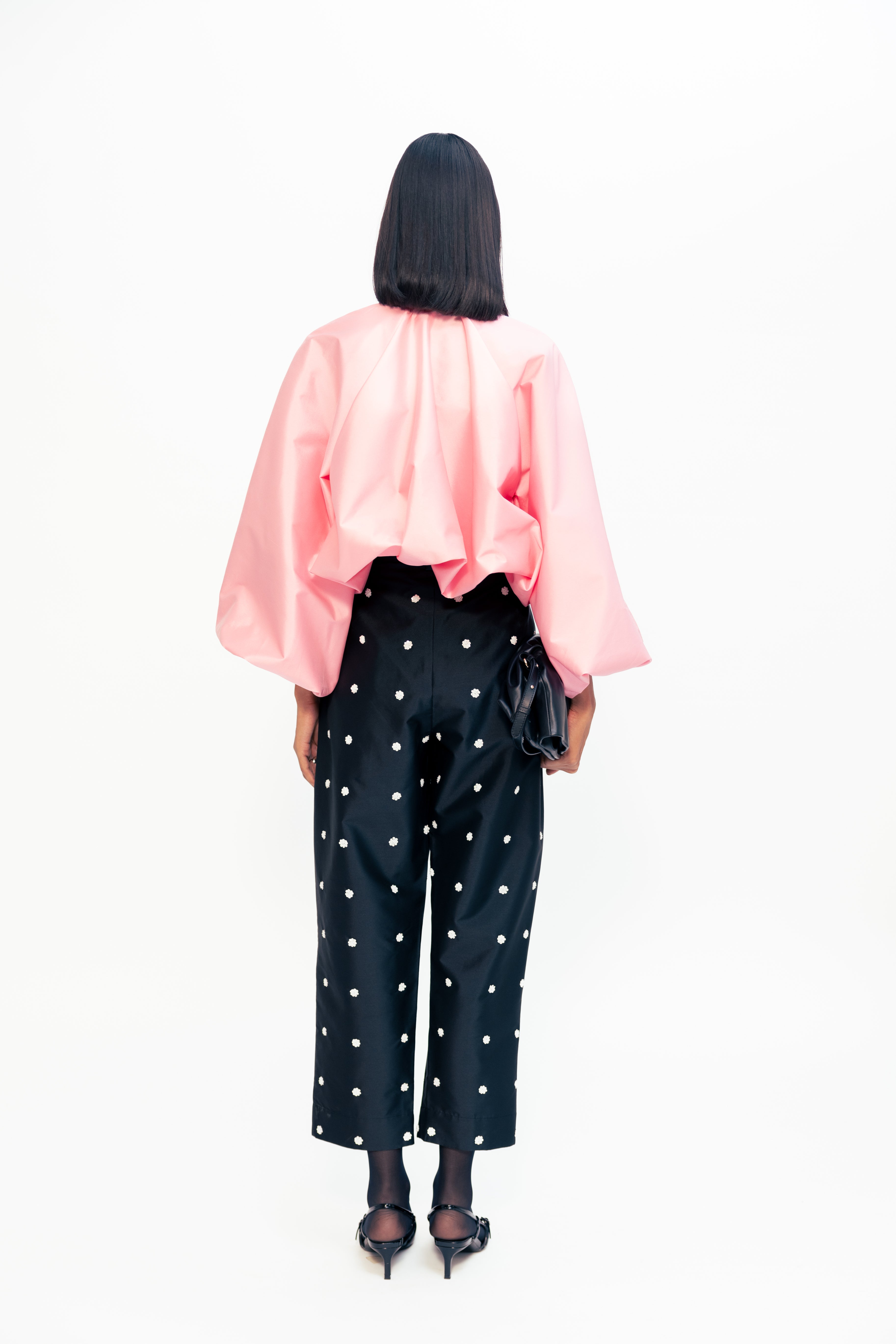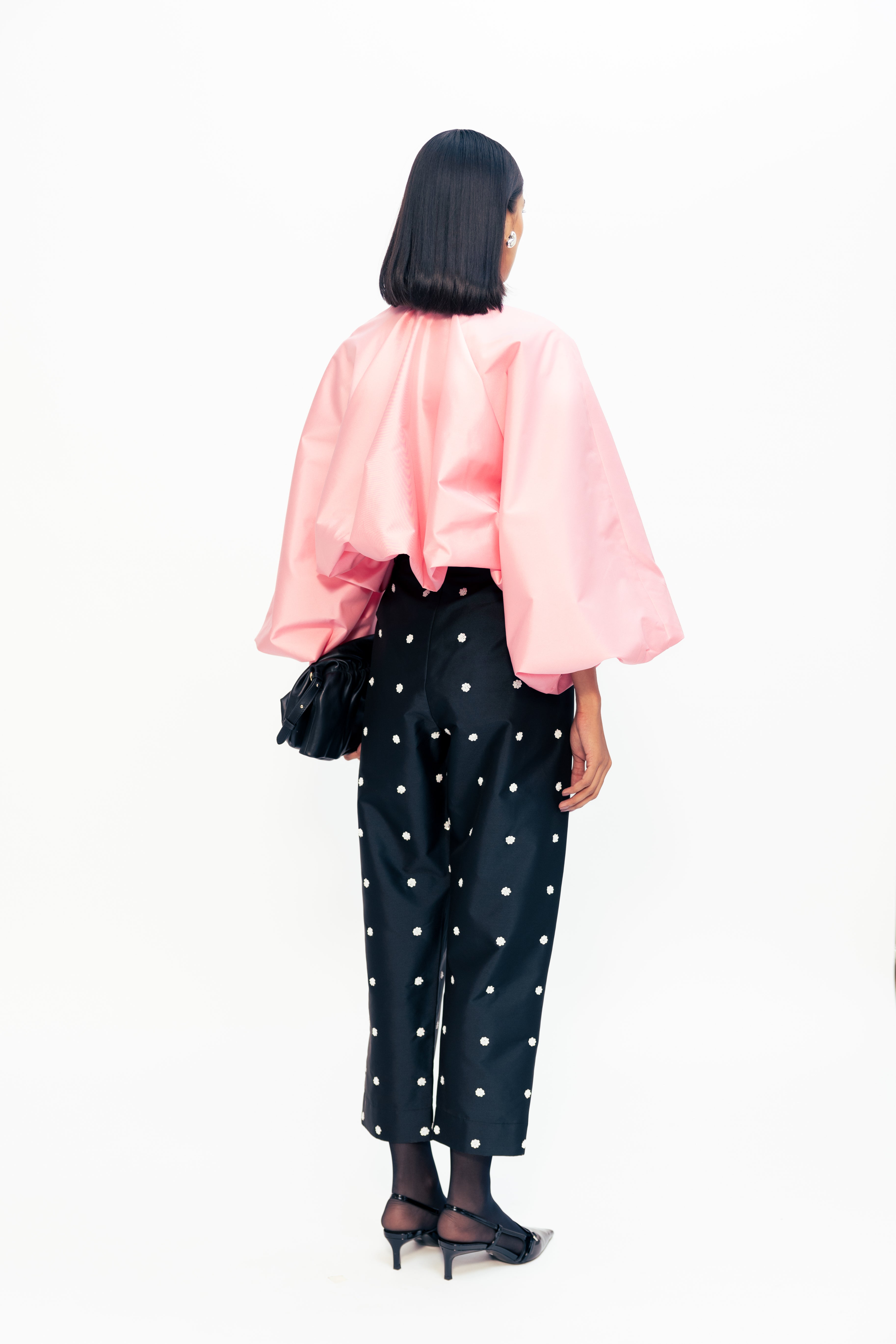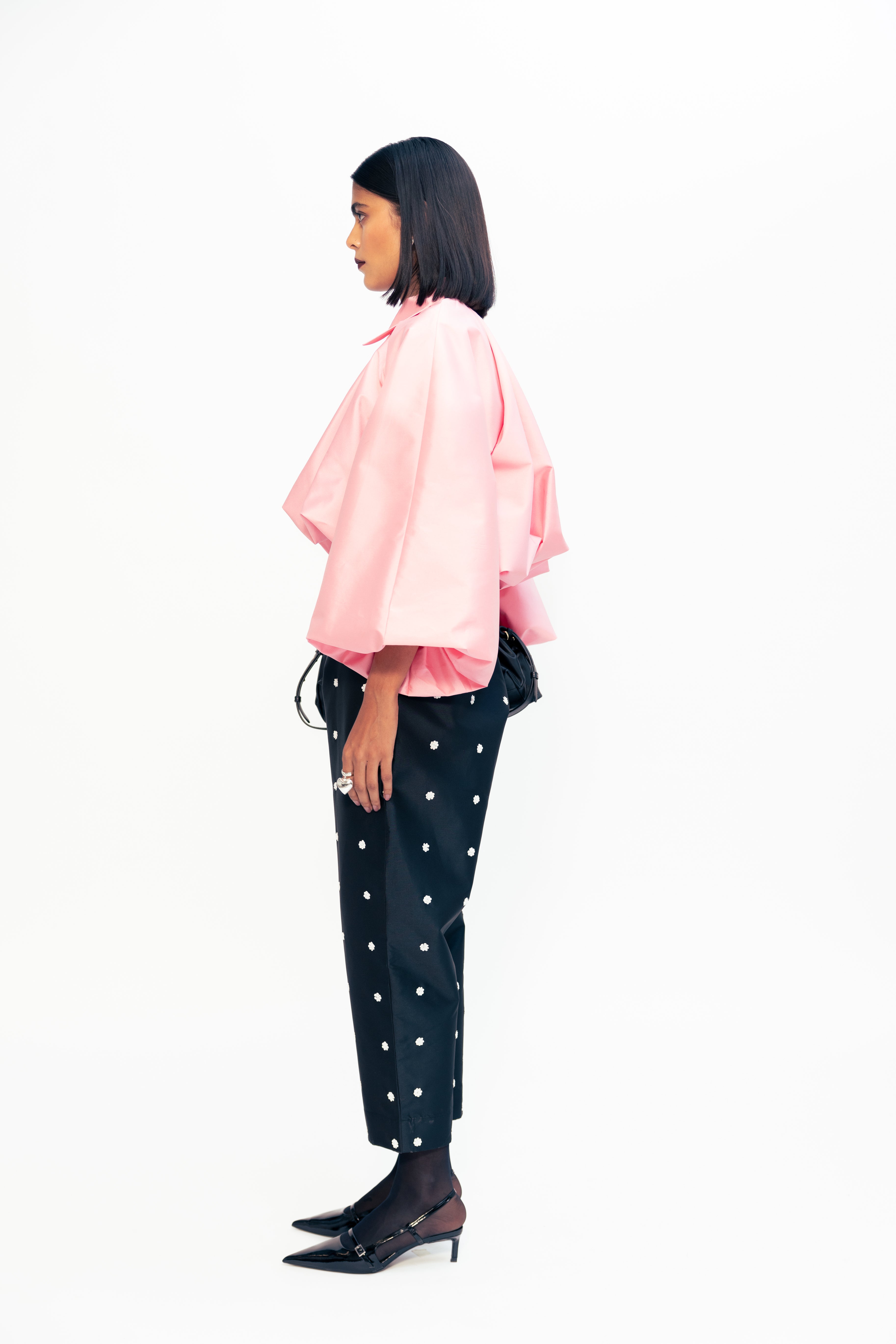 This balloon jacket adorned with tying detail at the hem offers a whimsical and feminine touch to outerwear. The balloon silhouette adds volume and drama and romantic aesthetic. The tying detail at the hem allows for customizable styling options, adding versatility to the piece. Perfect for adding a statement layer to any outfit, this jacket exudes both style and personality.