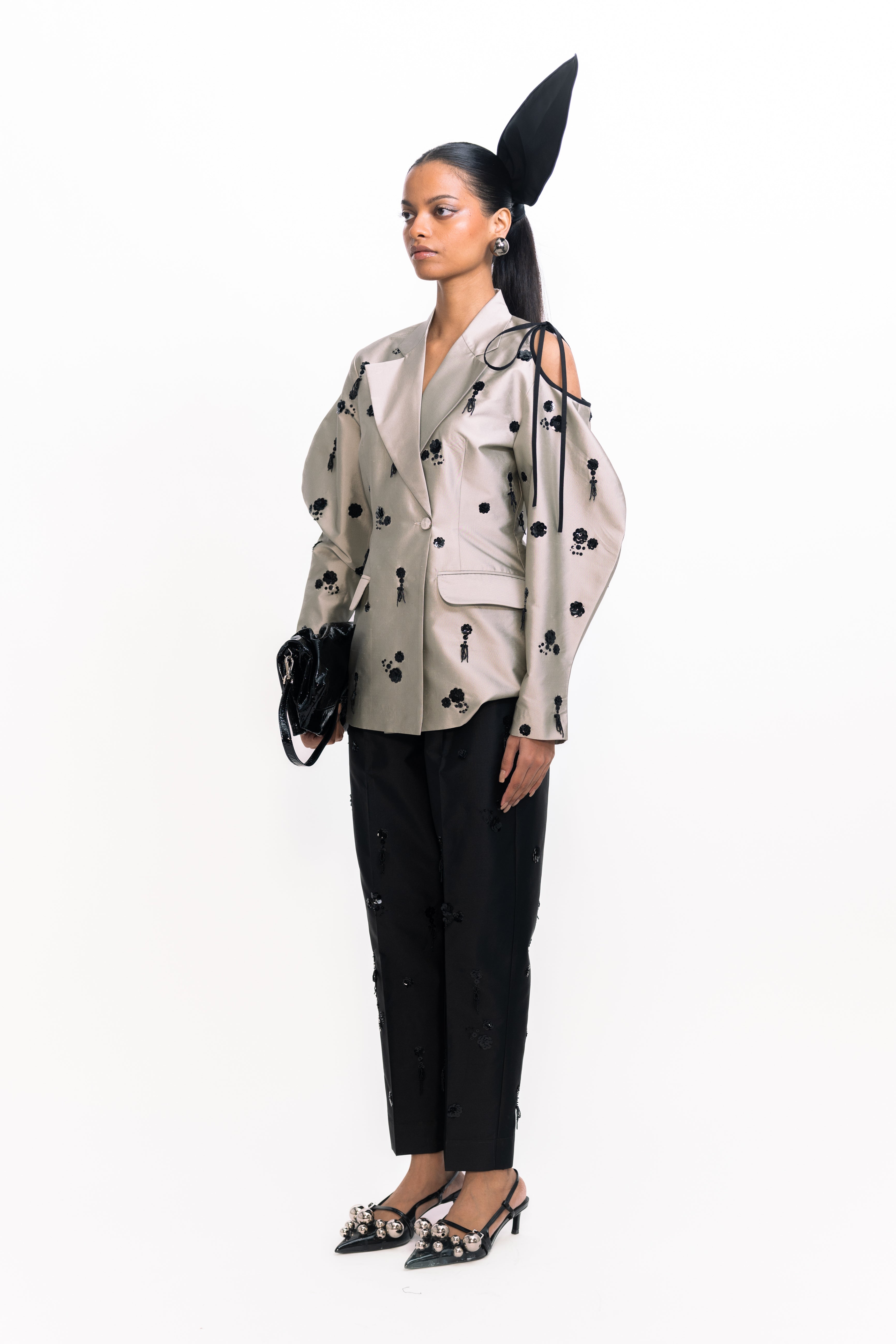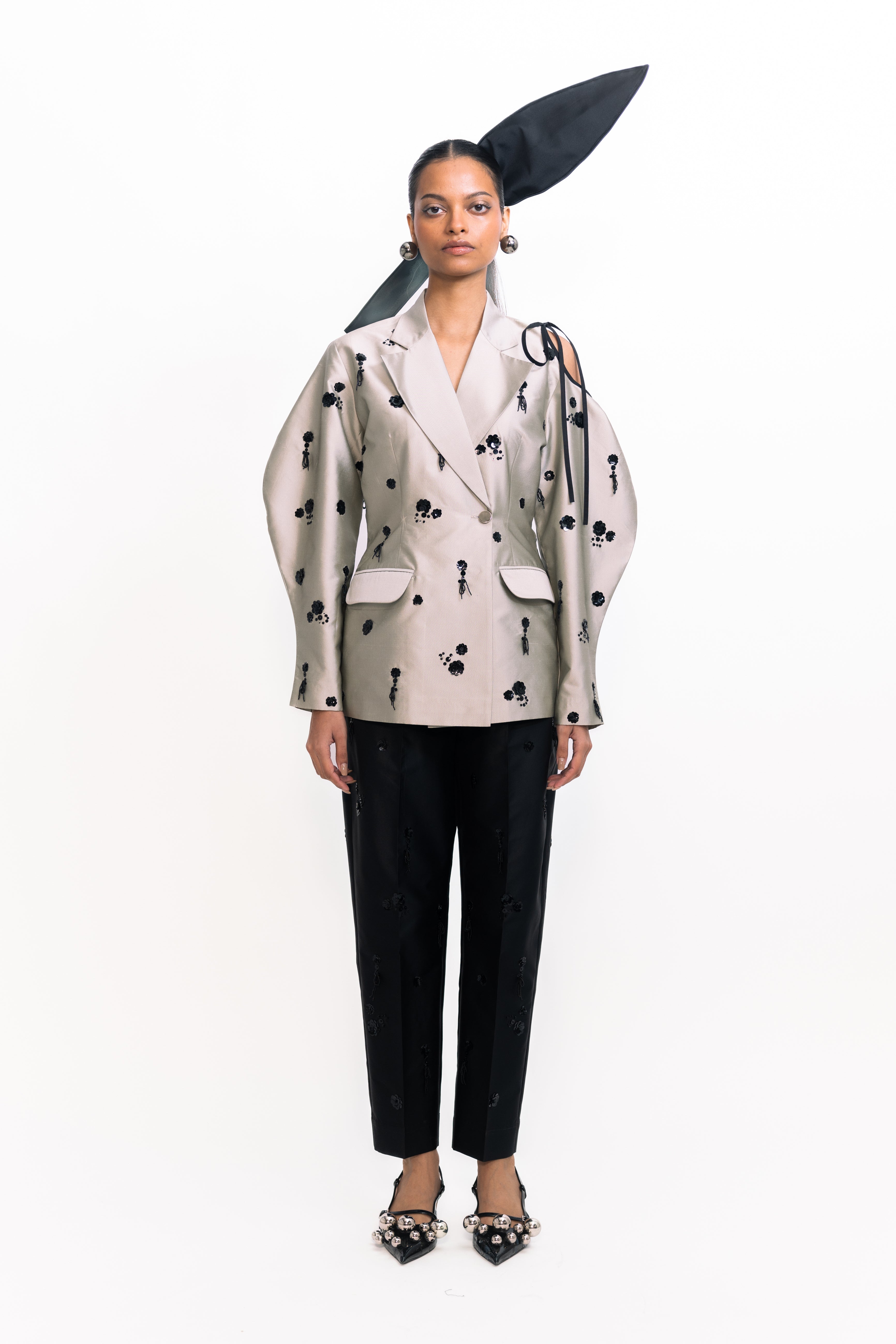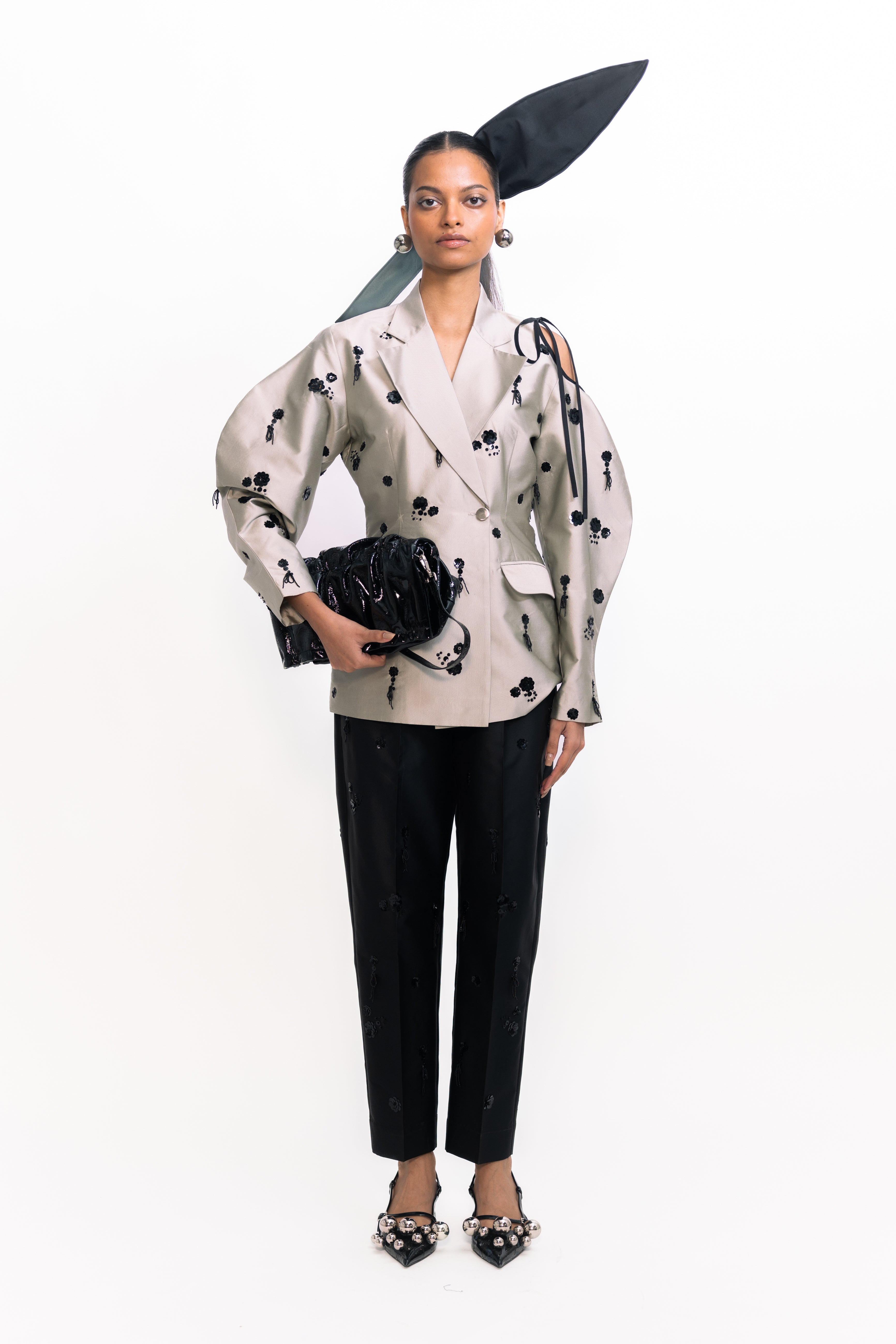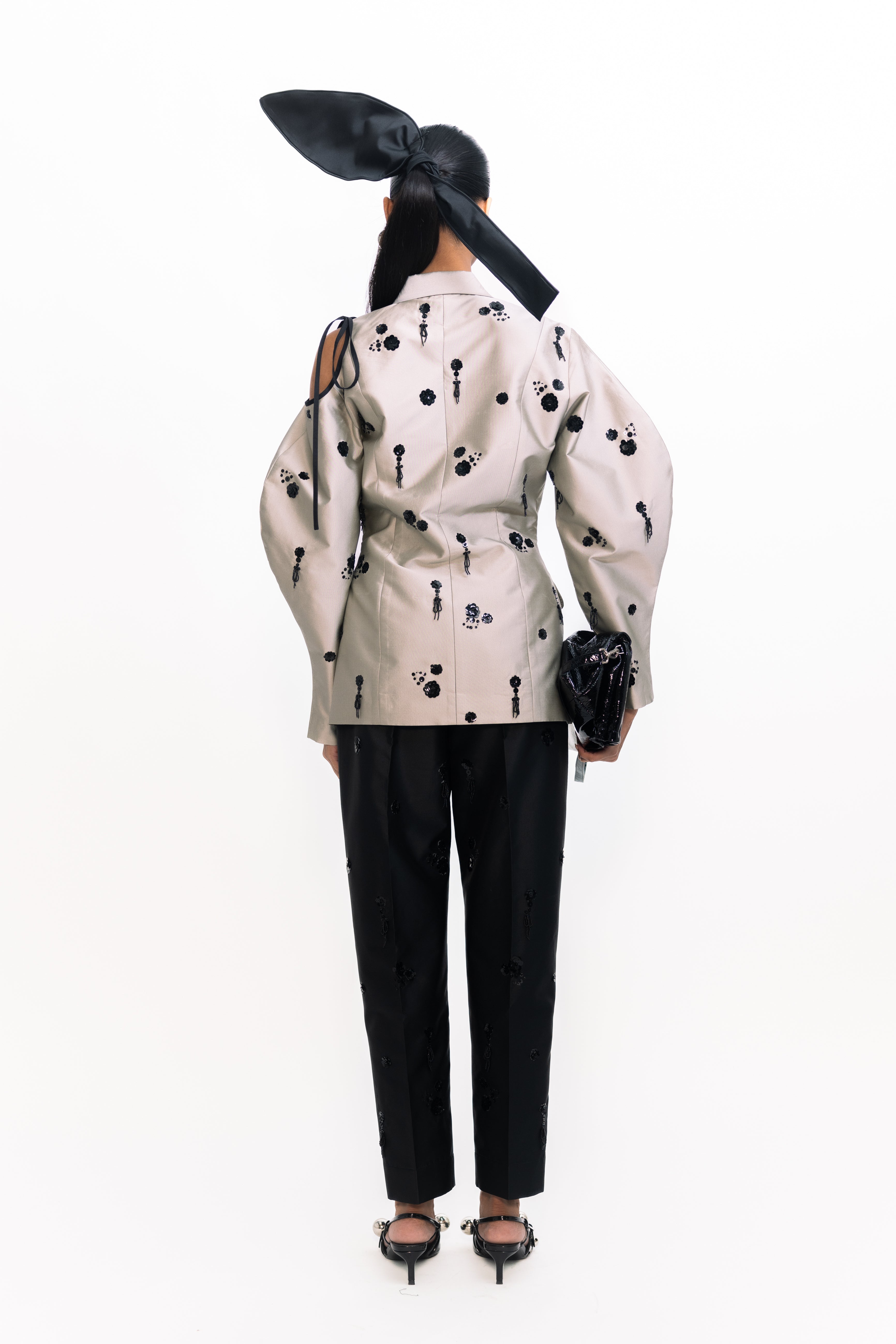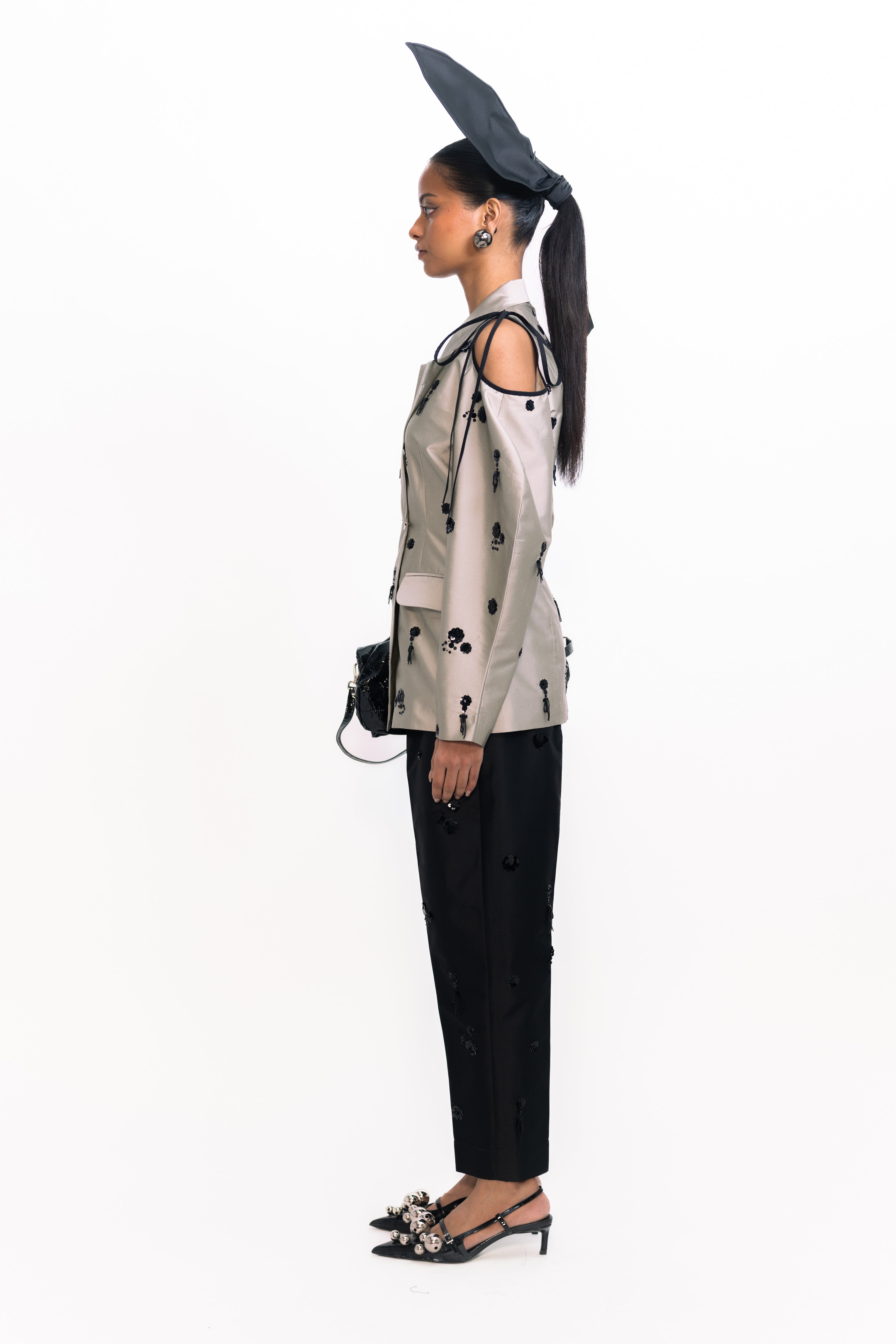 These high-waisted cigarette trousers offer a sleek, tailored silhouette that hugs the body from waist to ankle. Embellished with shimmering floral dangler sequins, they bring a striking, textural sparkle to the classic slim fit. Perfect for evening events or standout styling, this versatile piece pairs effortlessly with everything from minimalist tops to coordinated statement pieces.
