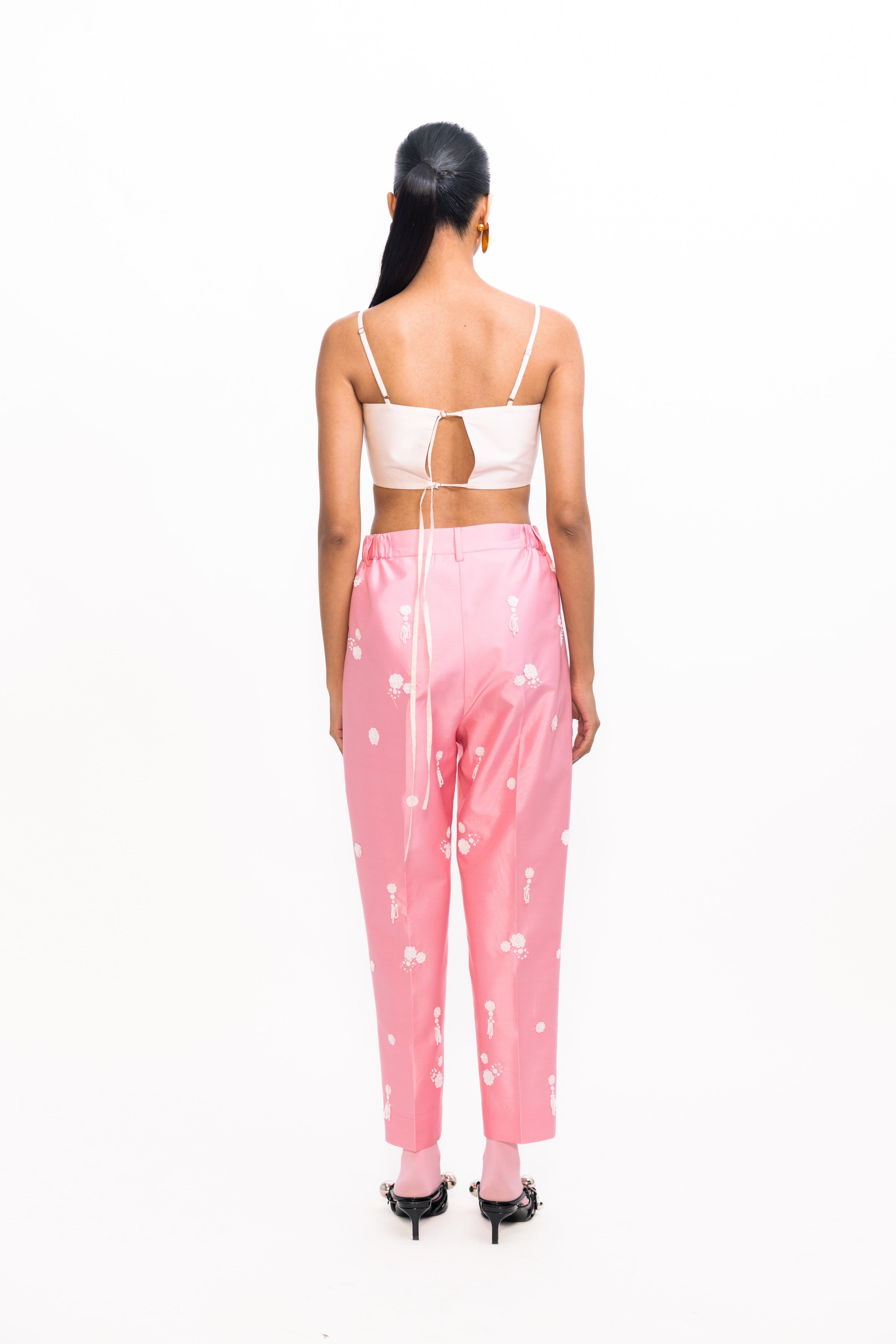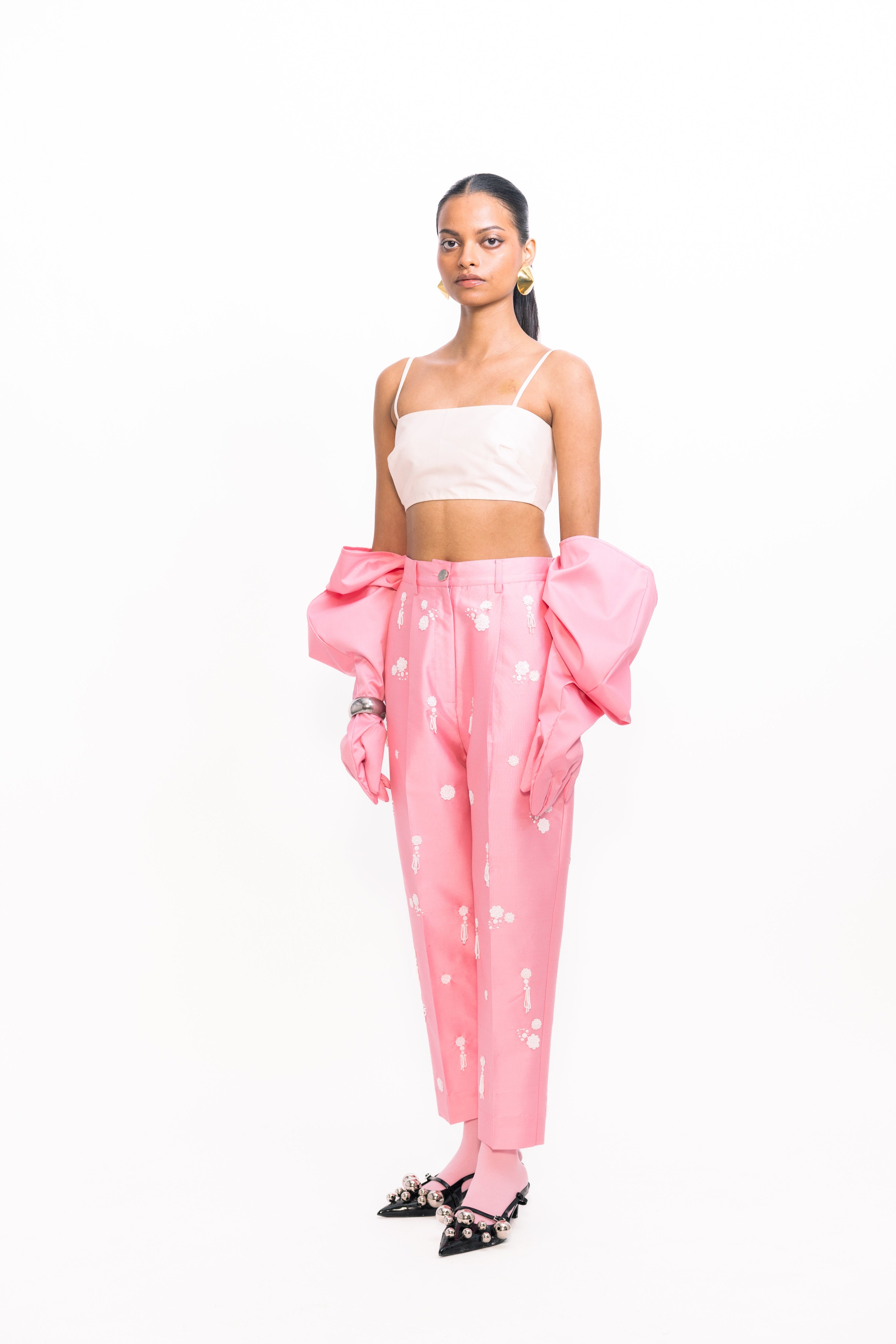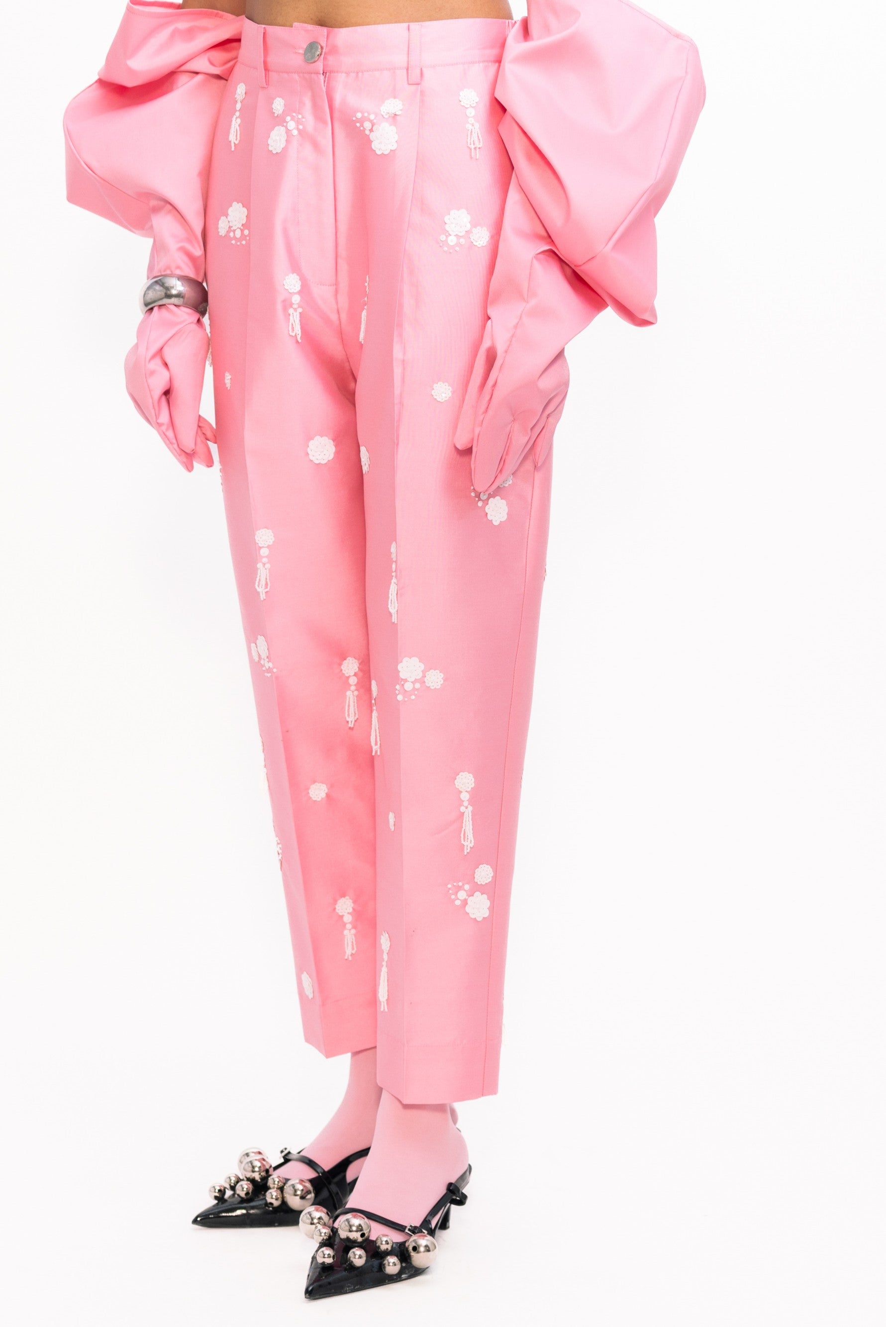 These high-waisted cigarette trousers offer a sleek, tailored silhouette that hugs the body from waist to ankle. Embellished with shimmering floral dangler sequins, they bring a striking, textural sparkle to the classic slim fit. Perfect for evening events or standout styling, this versatile piece pairs effortlessly with everything from minimalist tops to coordinated statement pieces.