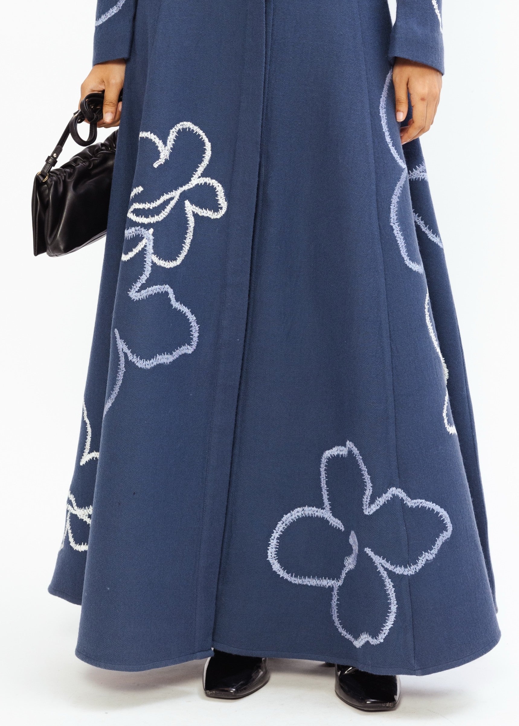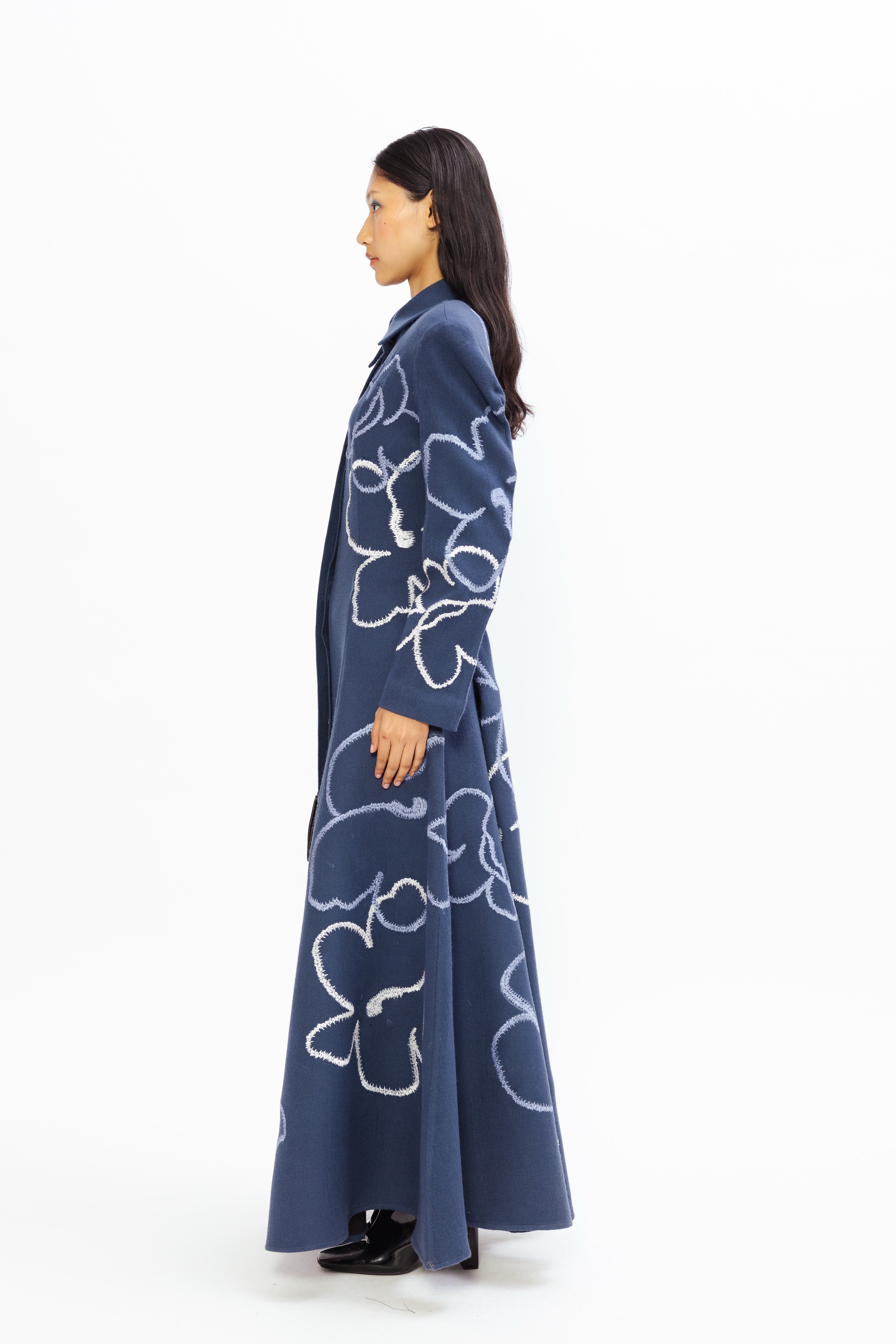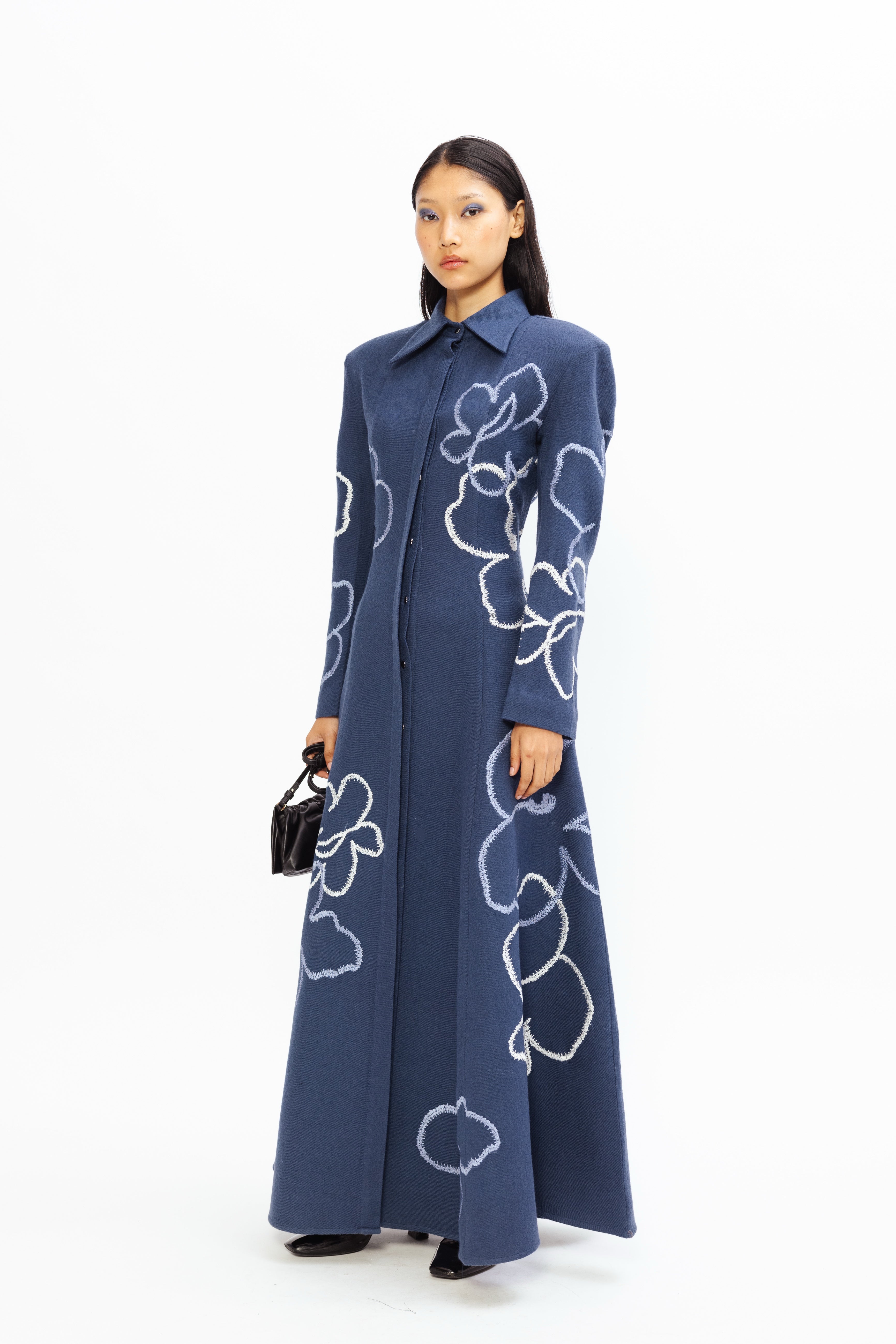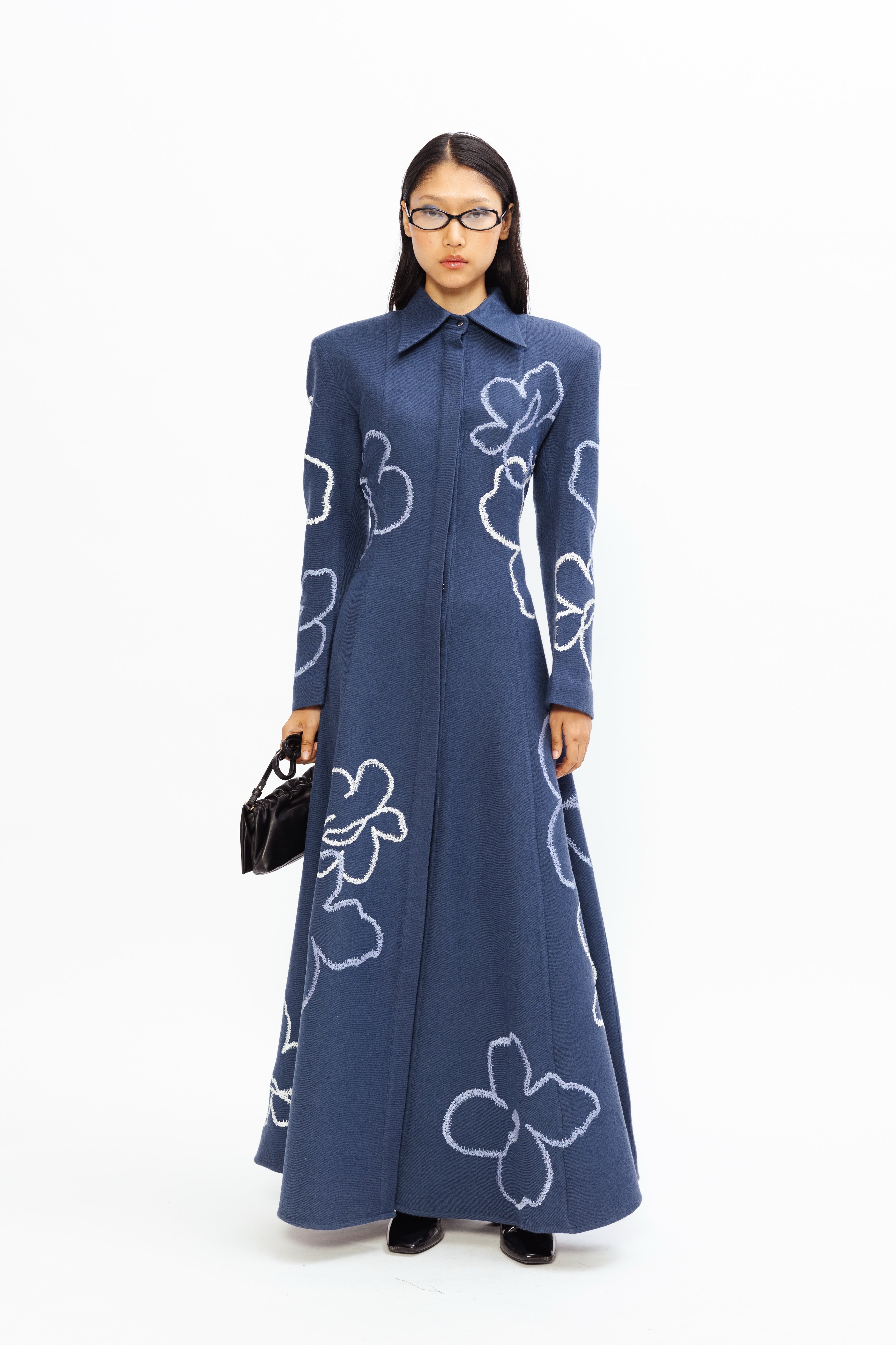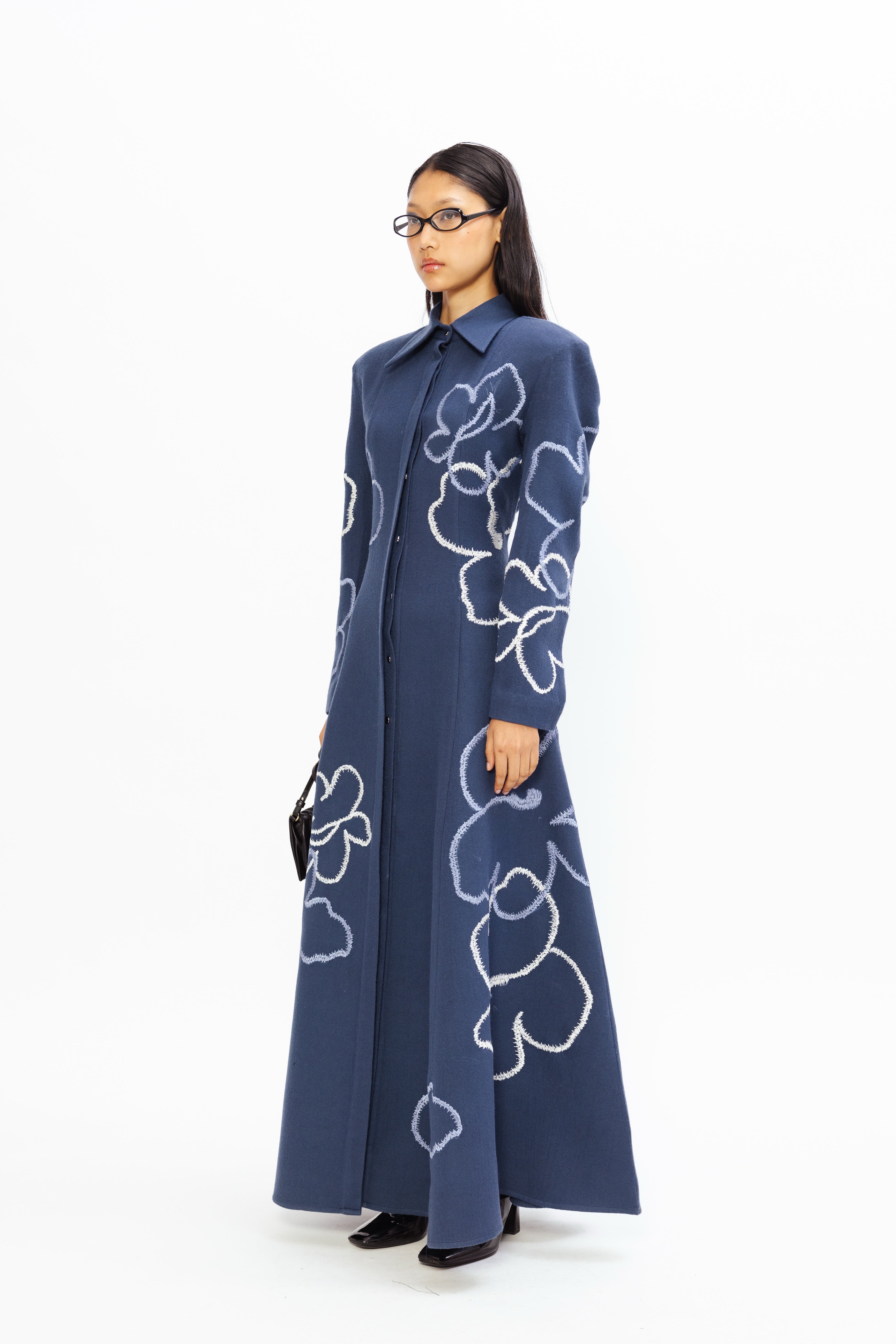 Crafted from luxurious merino wool, this full-length button-down shirt dress in midnight blue exudes effortless sophistication. Delicate floral embroidery adds depth and charm, while the flowing silhouette and tailored structure create a perfect balance between everyday comfort and refined elegance. An ideal piece for transitional seasons and polished occasions alike.