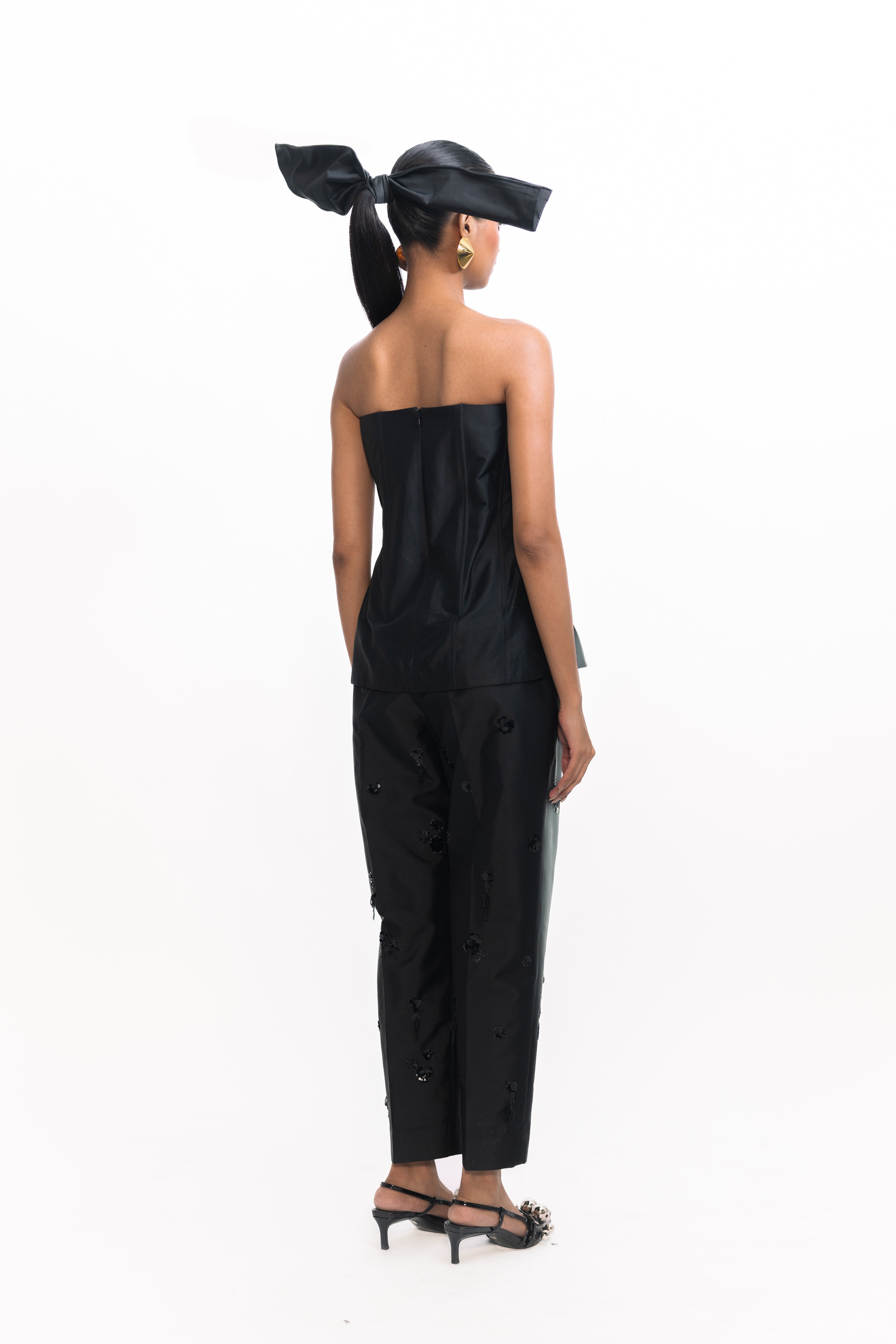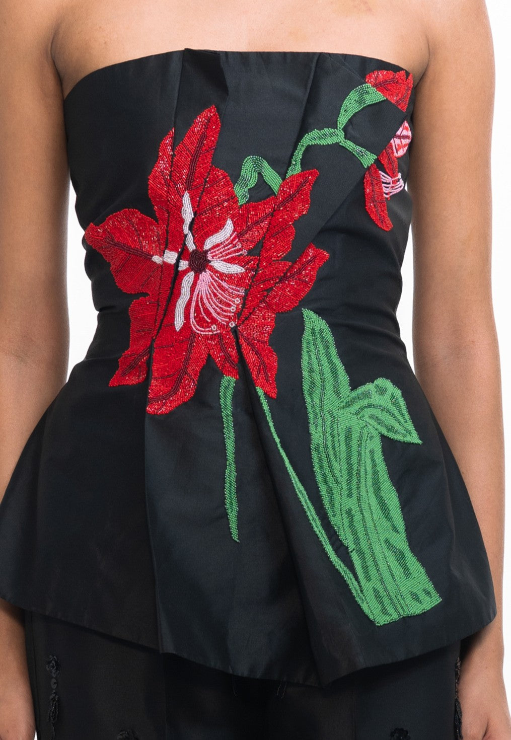 This fitted corset tube top combines sleek structure with delicate romance. The sculpted bodice is adorned with intricate floral embroidery accented by subtle sequins, adding a soft shimmer and textural detail. Perfect for pairing with high-waisted skirts or tailored trousers for an elevated evening look.