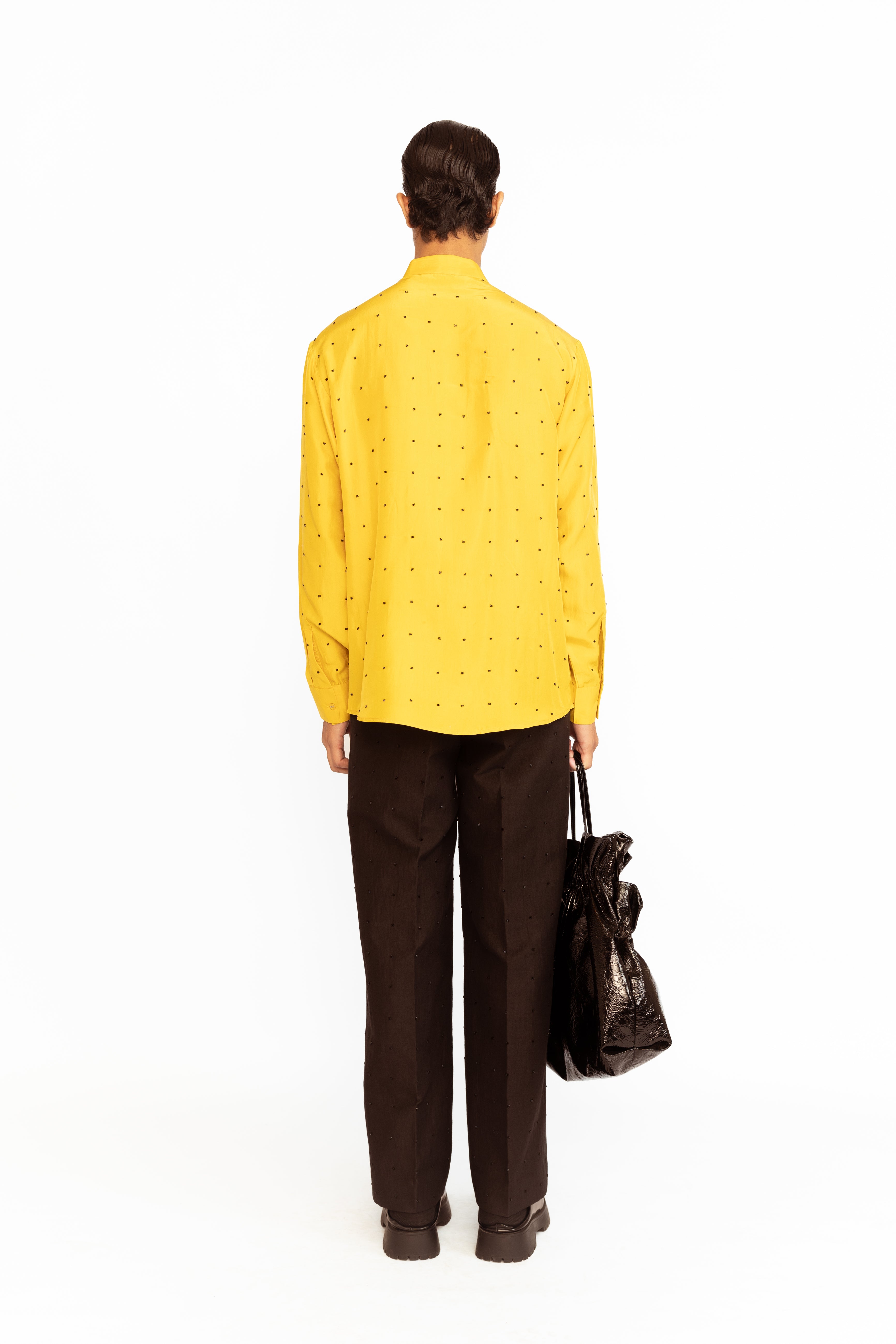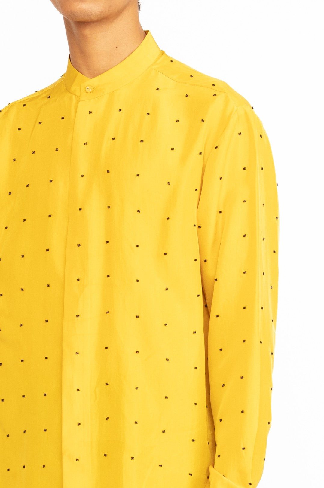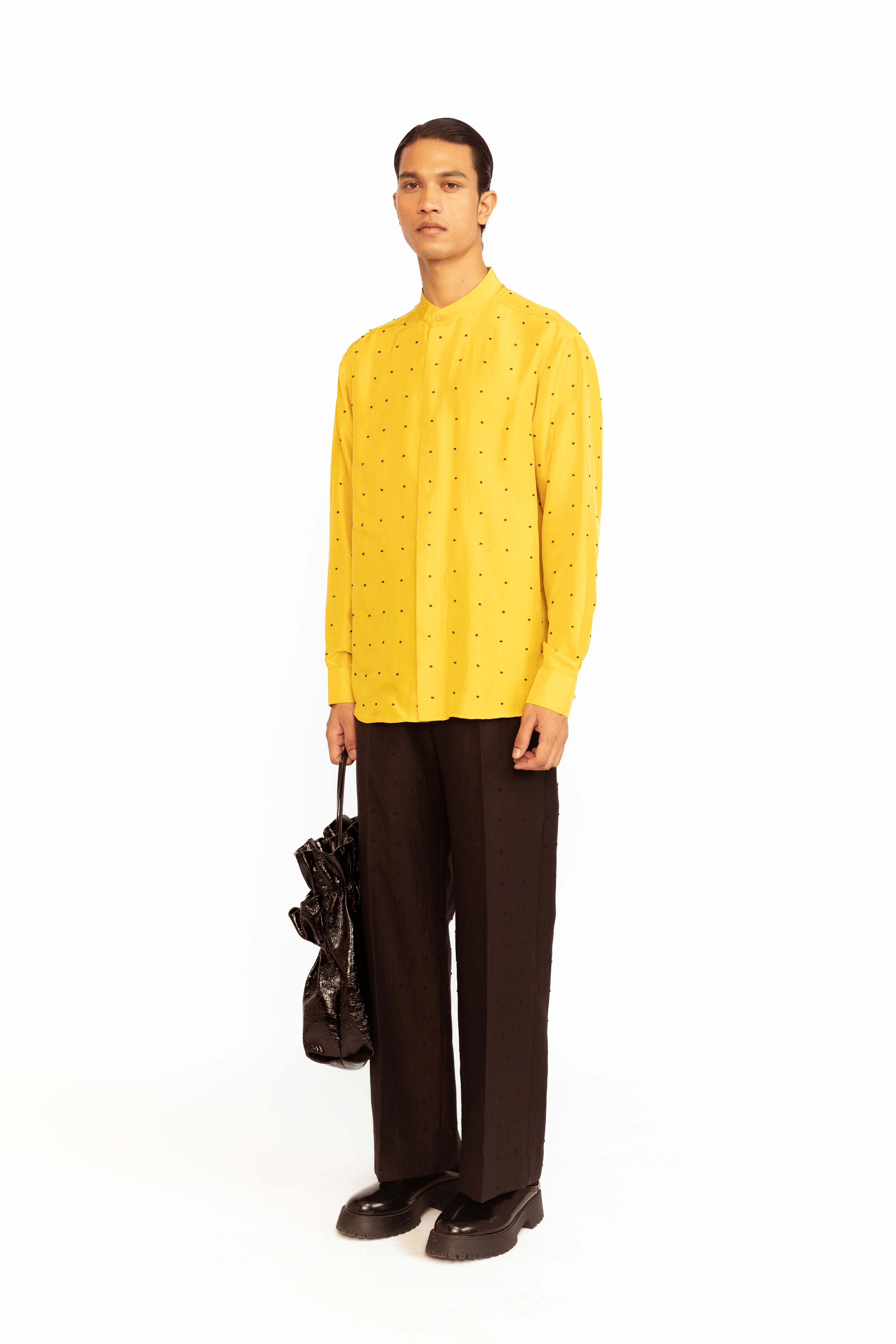 A full-sleeved shirt featuring intricate grid bead embroidery, a classic mandarin collar, and a concealed placket for a clean, sophisticated finish.