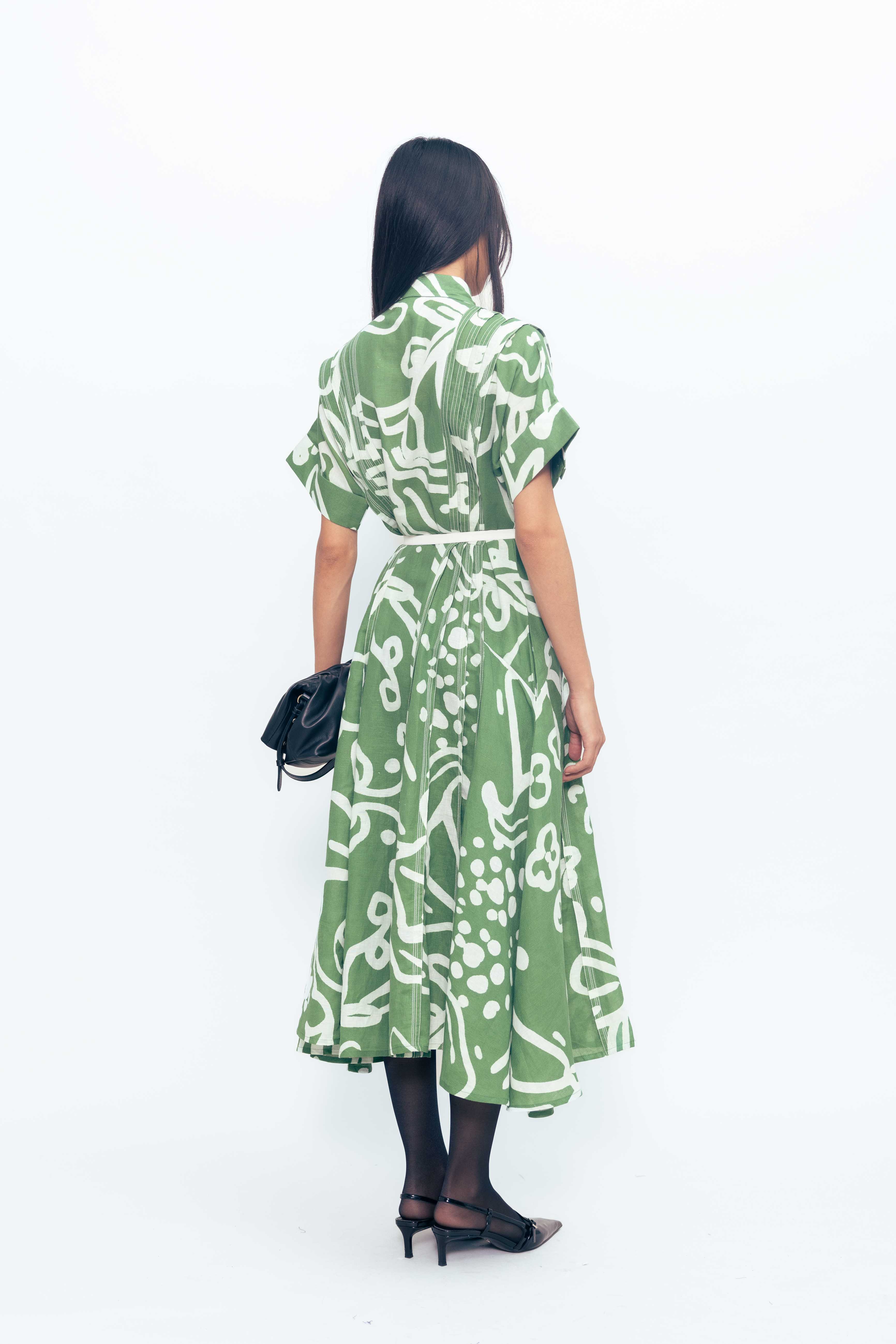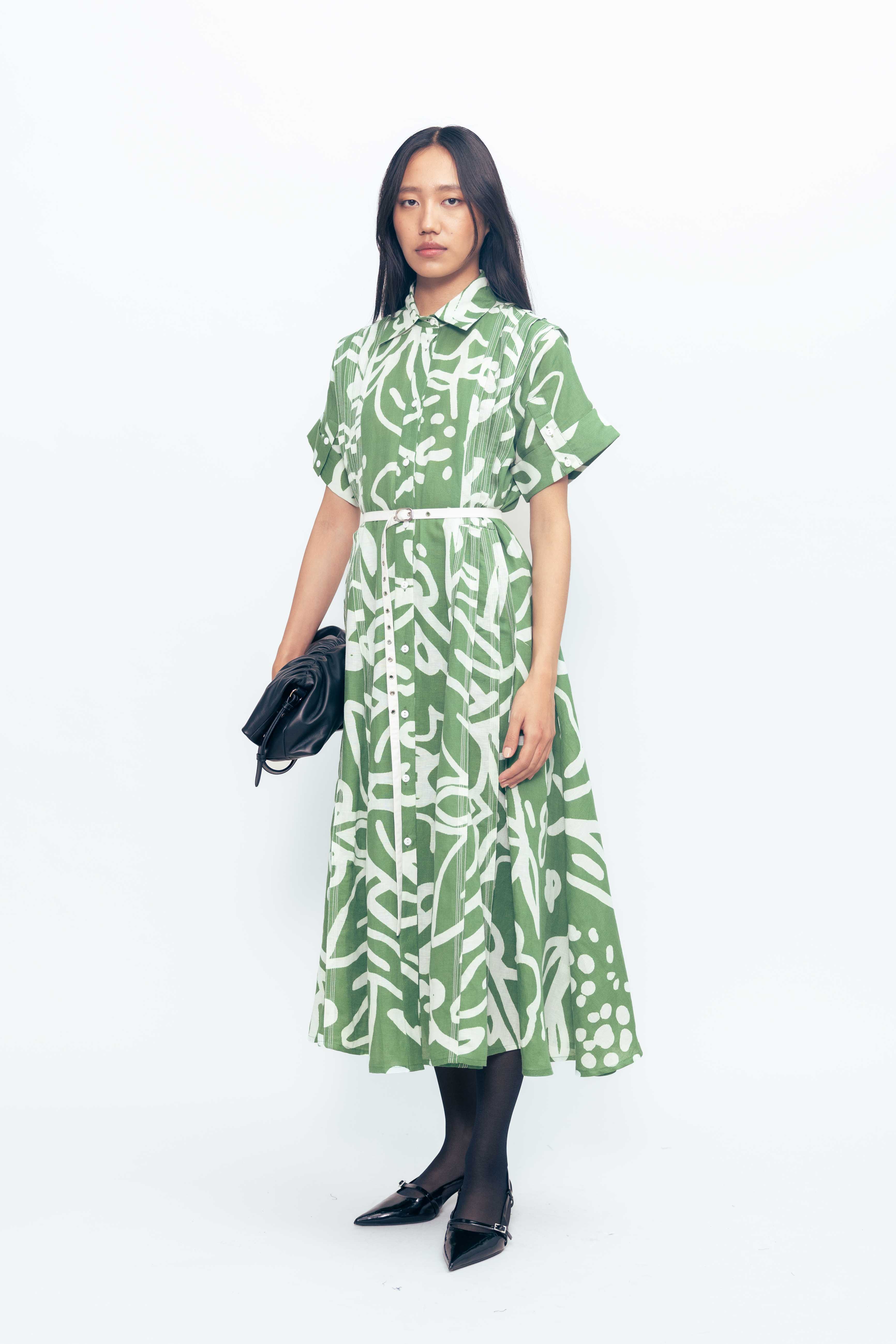This midi dress blends understated structure with delicate detailing for a quietly refined look. Pintuck accents offer subtle texture, while contrast topstitching highlights the silhouette with thoughtful precision.
