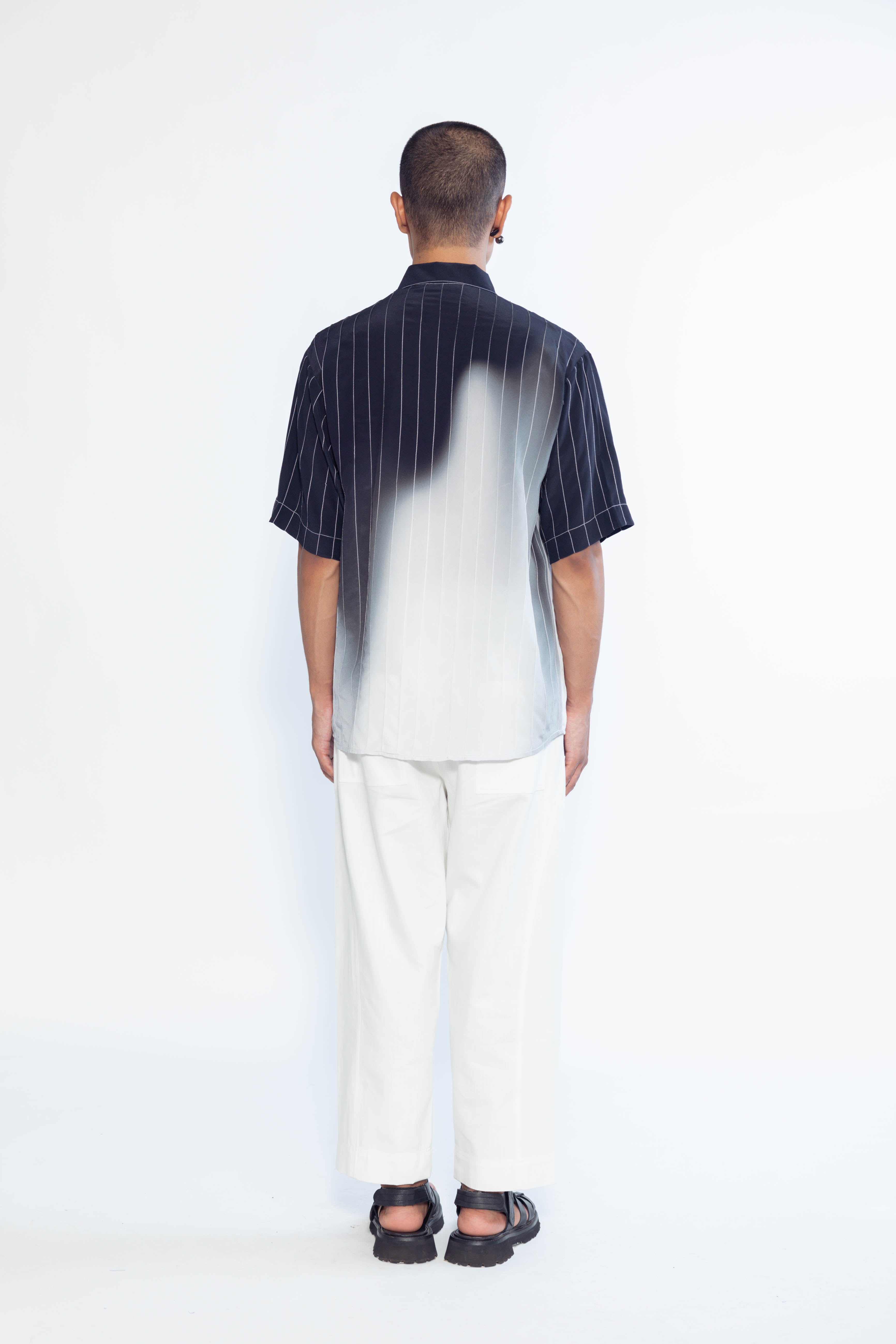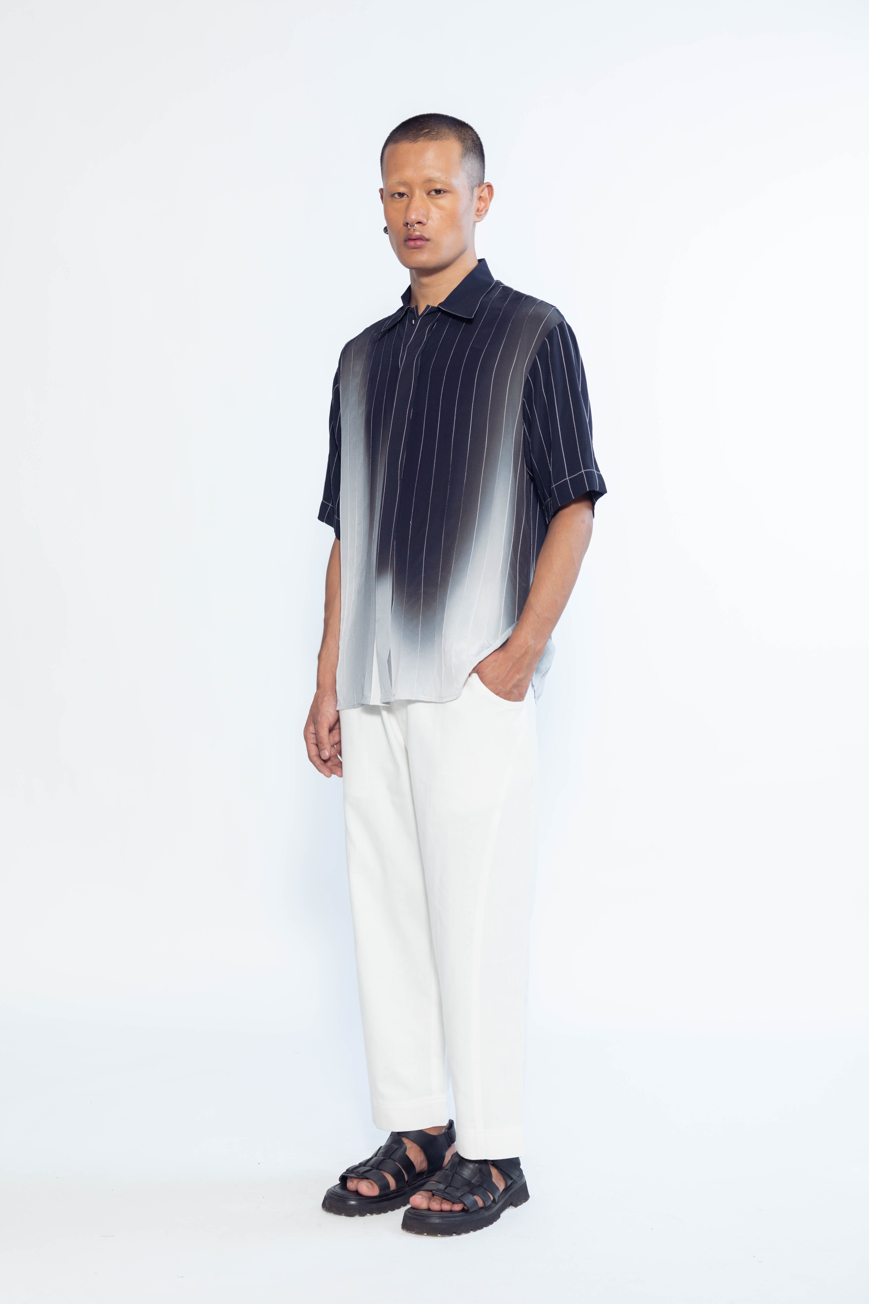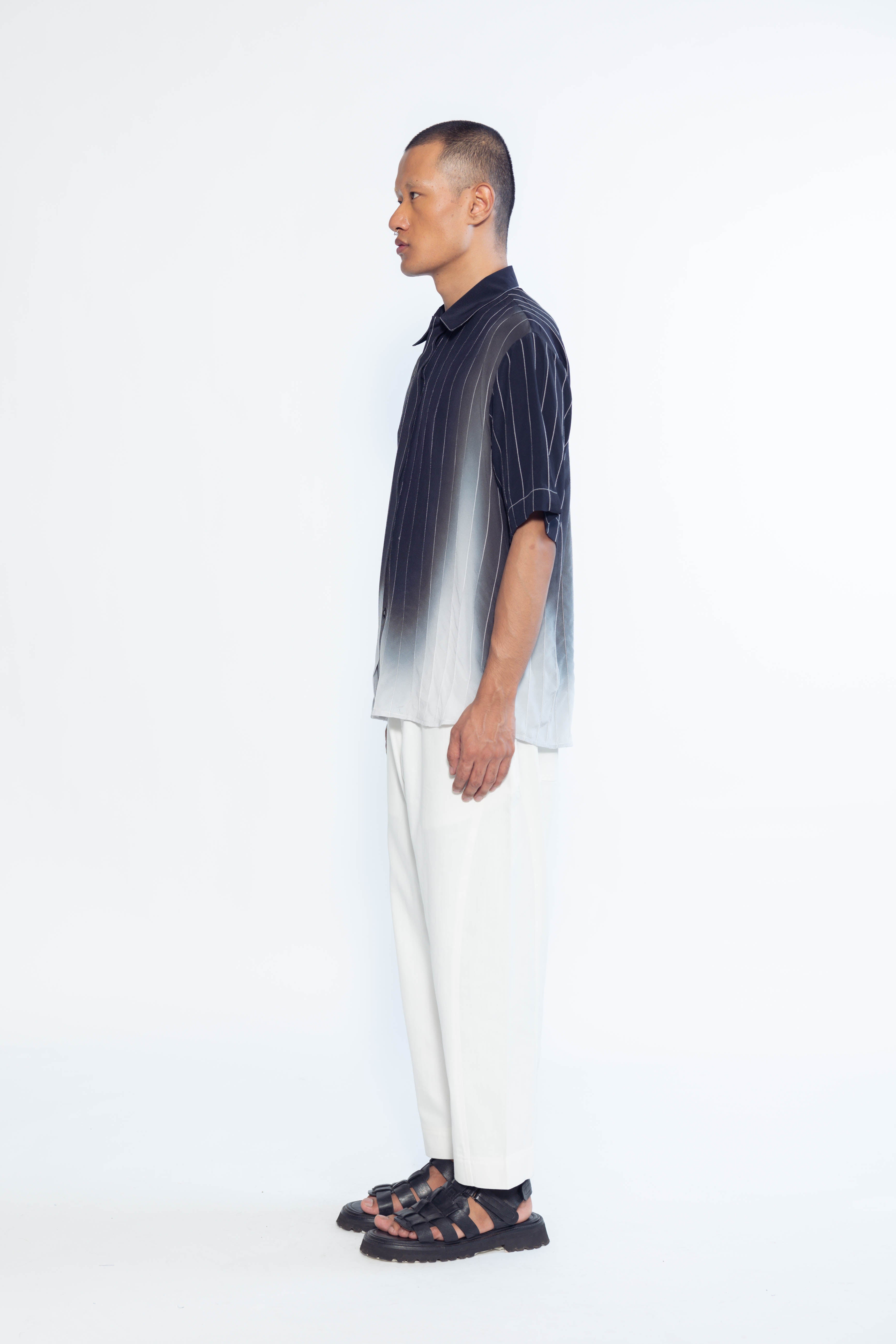 Soft gradients move from deep to light, giving the surface a quiet sense of motion. Fine pintucks run through the front, stitched in contrast to bring subtle structure and visual rhythm. A concealed double-fold placket keeps the closure clean, finished with tonal buttons that sit almost invisible. The shape is precise — short sleeves, a regular fit, and fluid movement through the body. A study in balance: crisp in construction, gentle in presence.