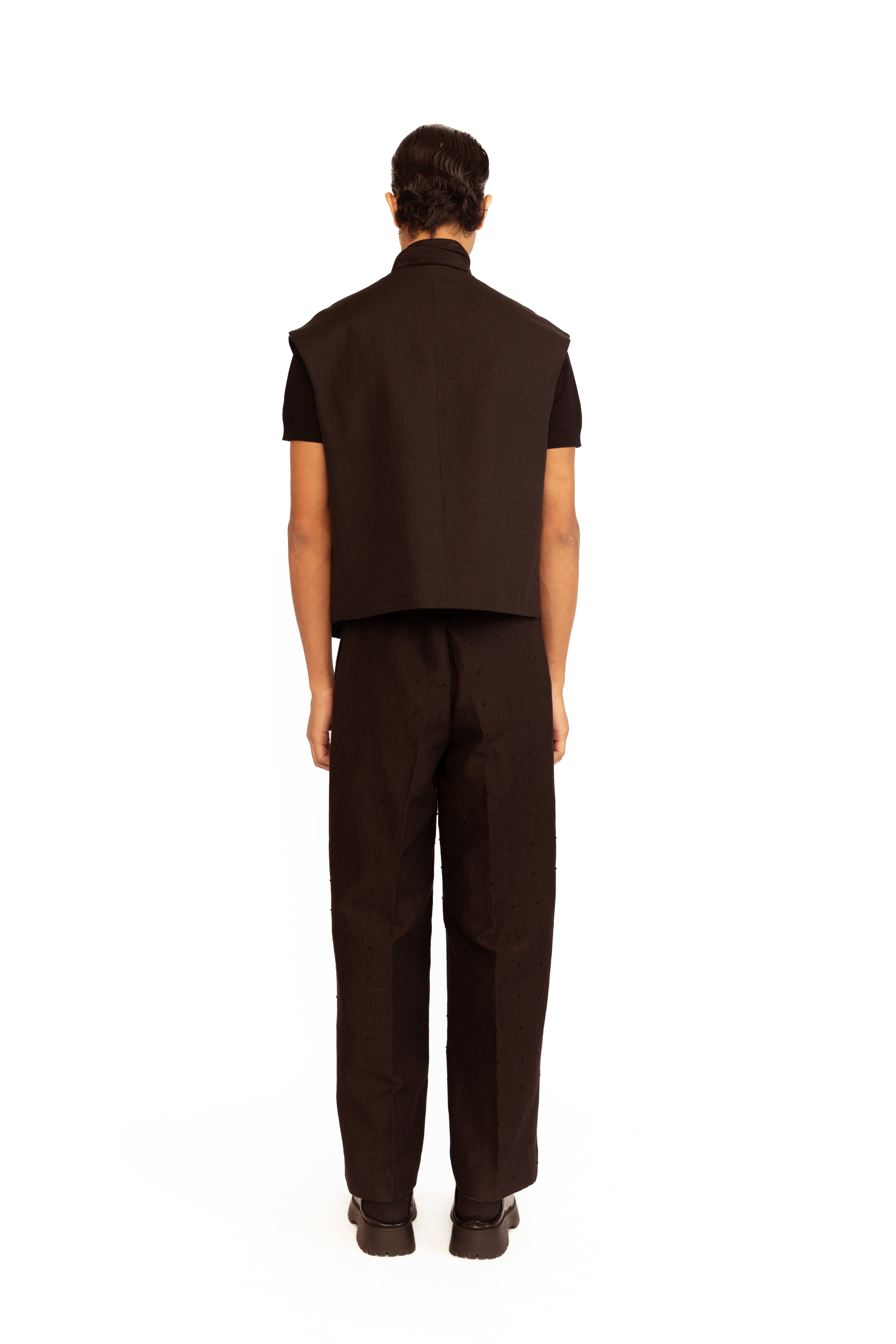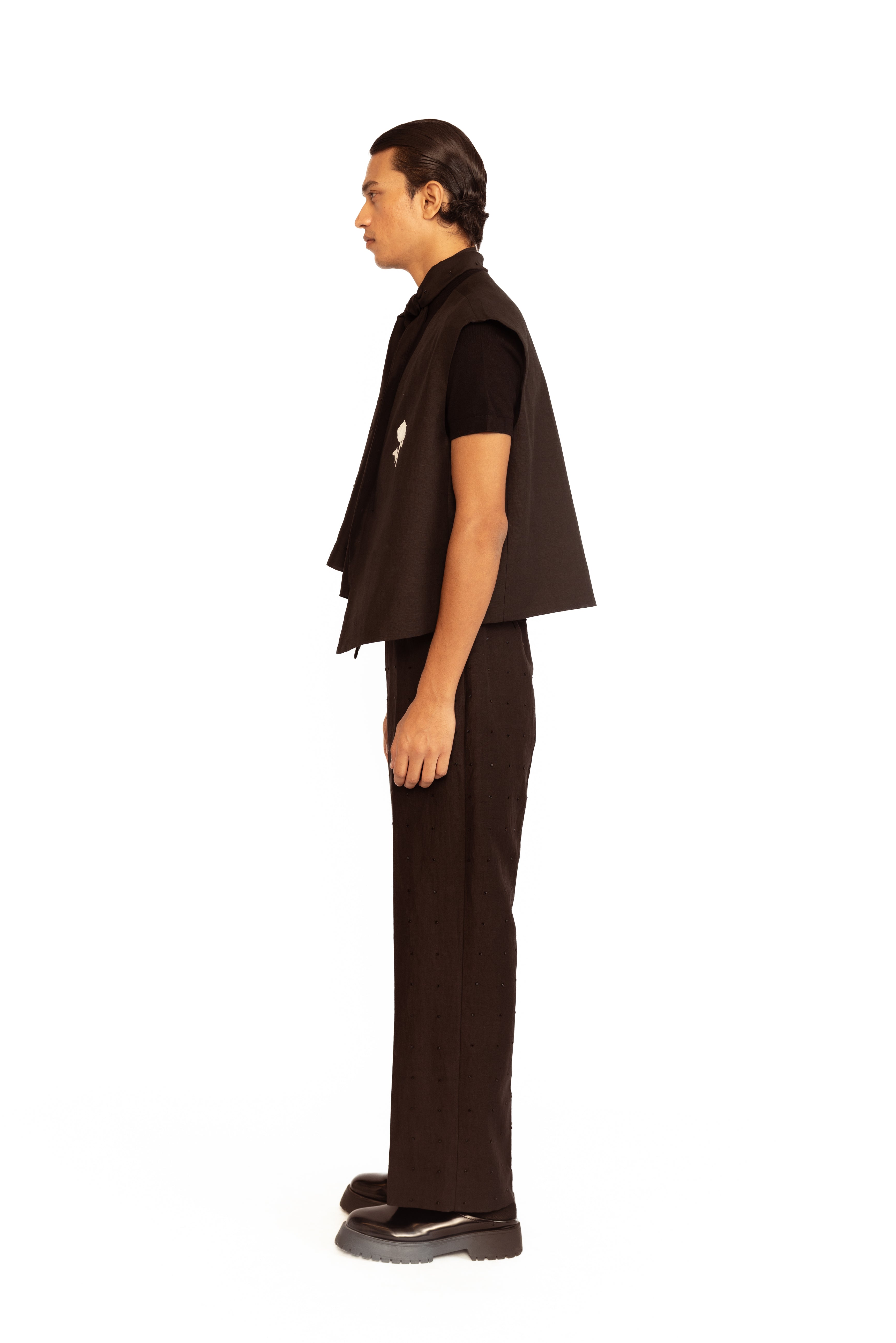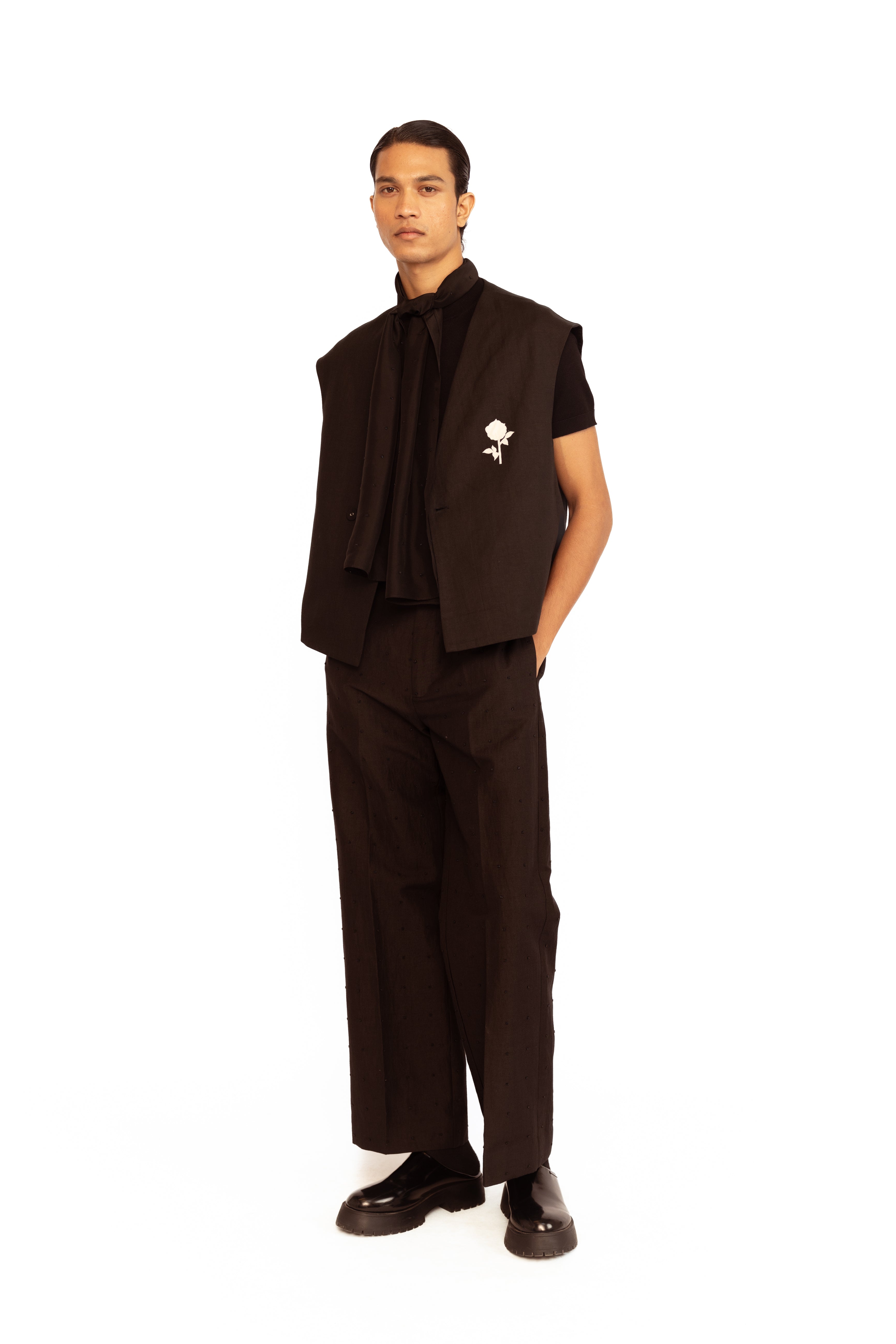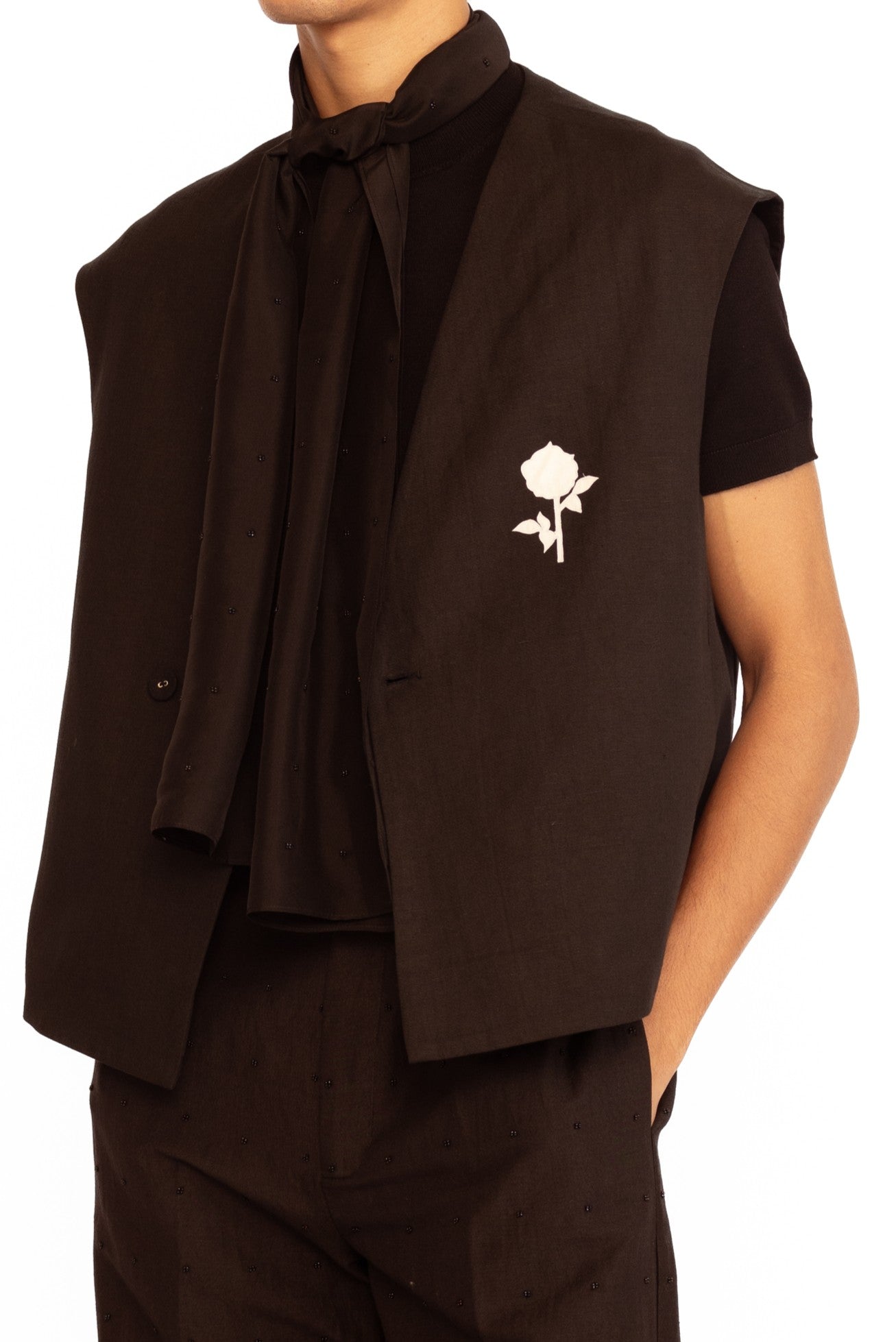 A contemporary classic — this sleeveless vest is elevated with intricate rose applique, blending modern tailoring with artistic detailing.