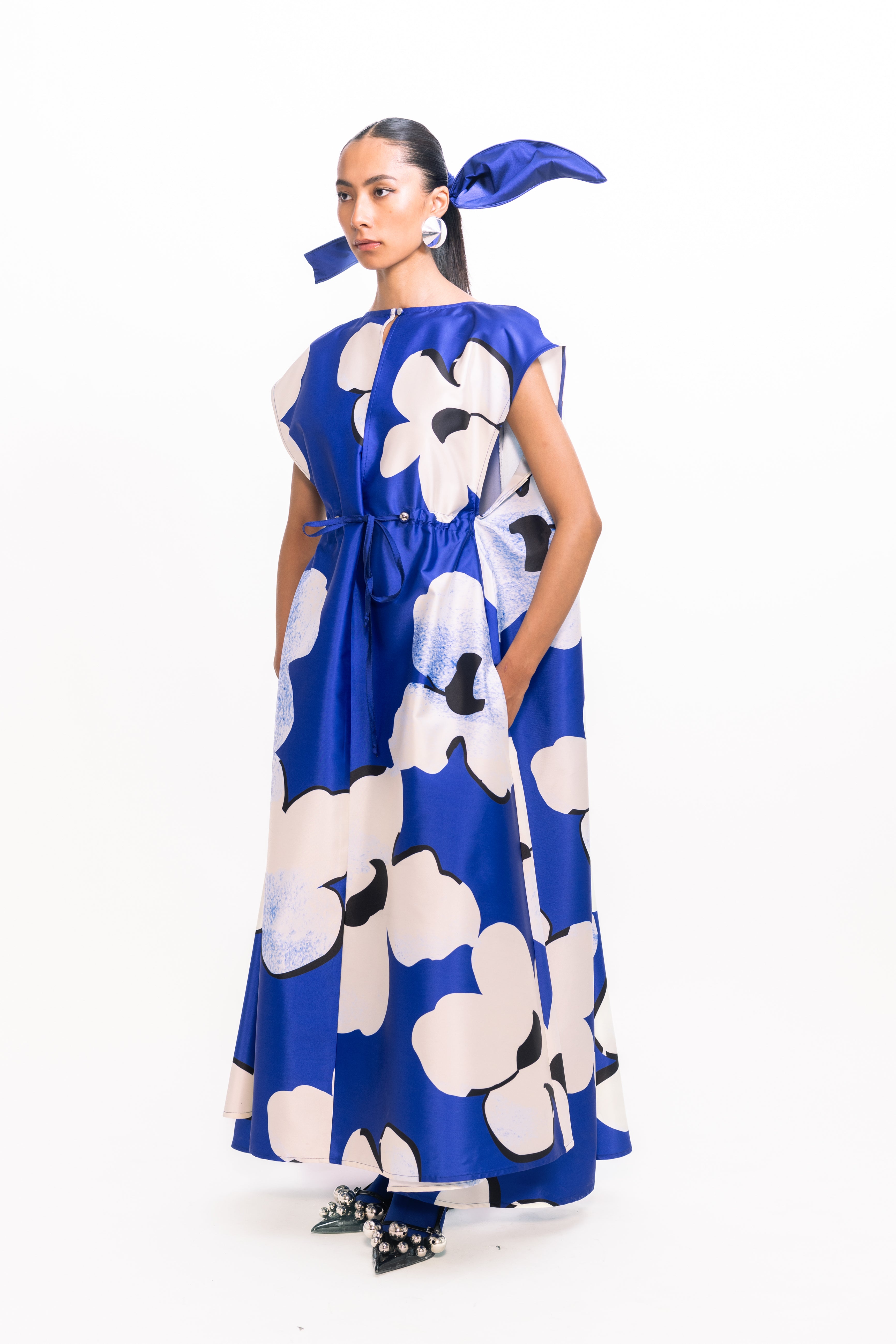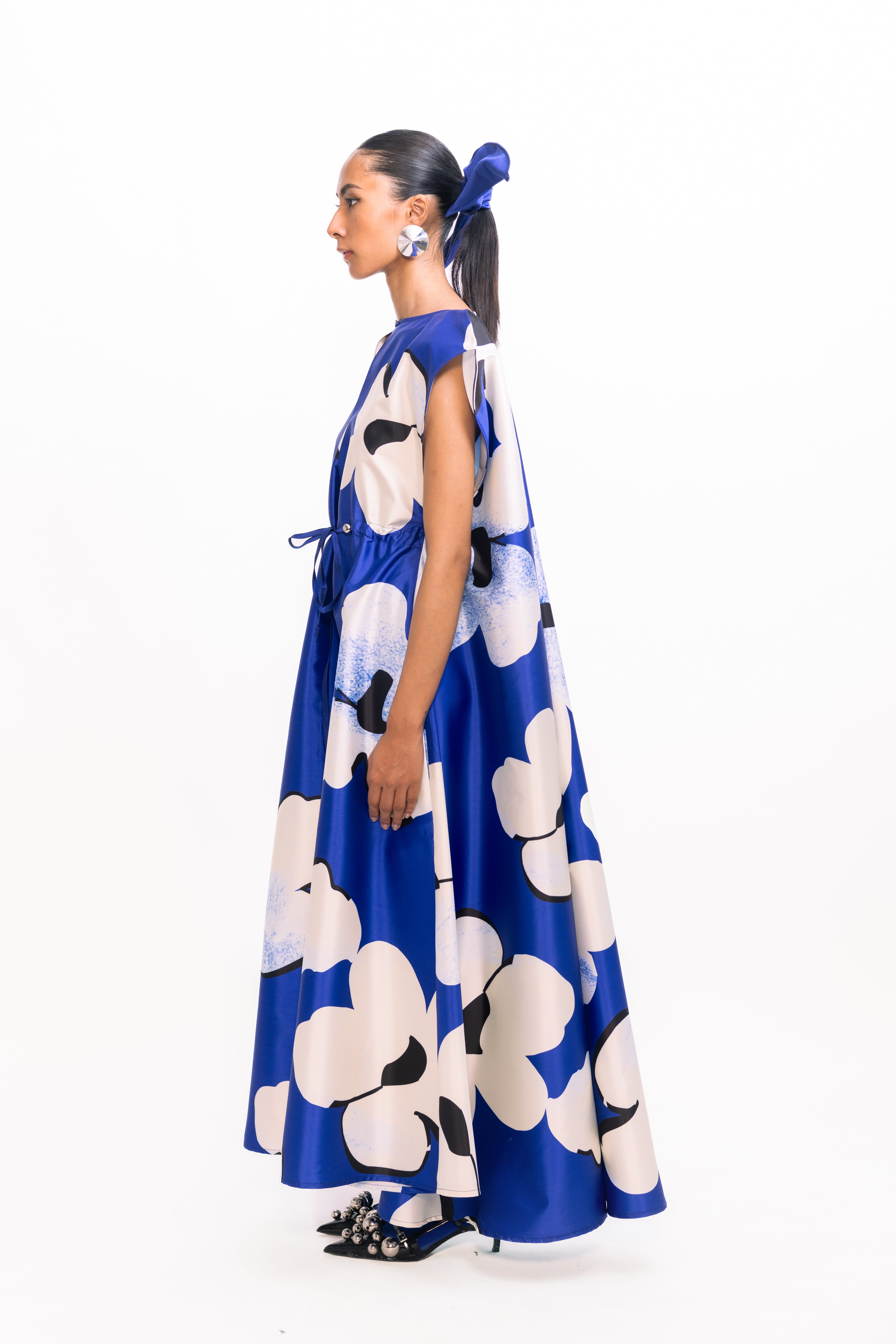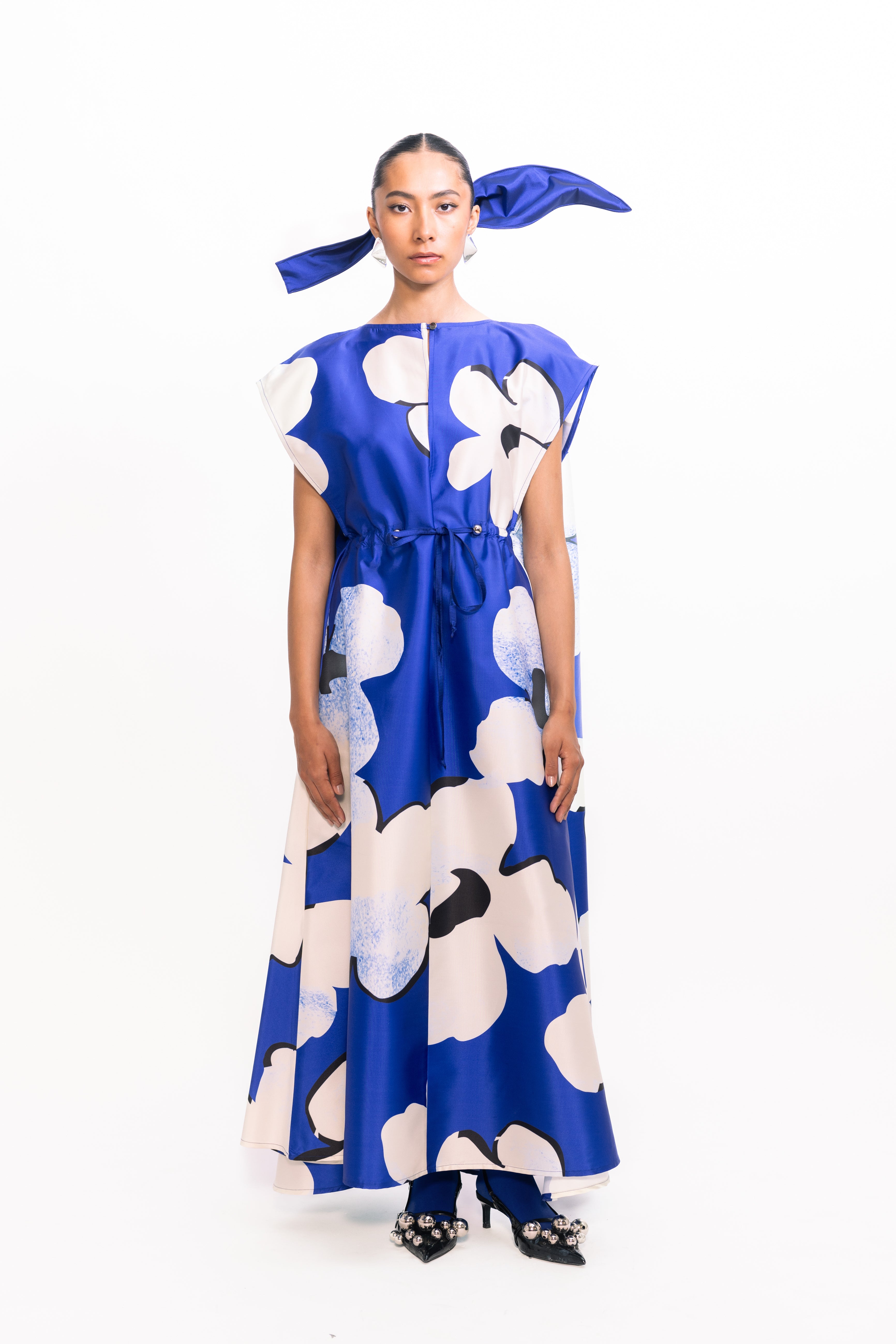 This long dress features a soft drawstring waist that allows for a customizable, cinched fit. The skirt flows into a graceful, trail-like back, adding a touch of drama and movement with every step. Effortlessly elegant, it transitions beautifully from daytime gatherings to evening occasions.