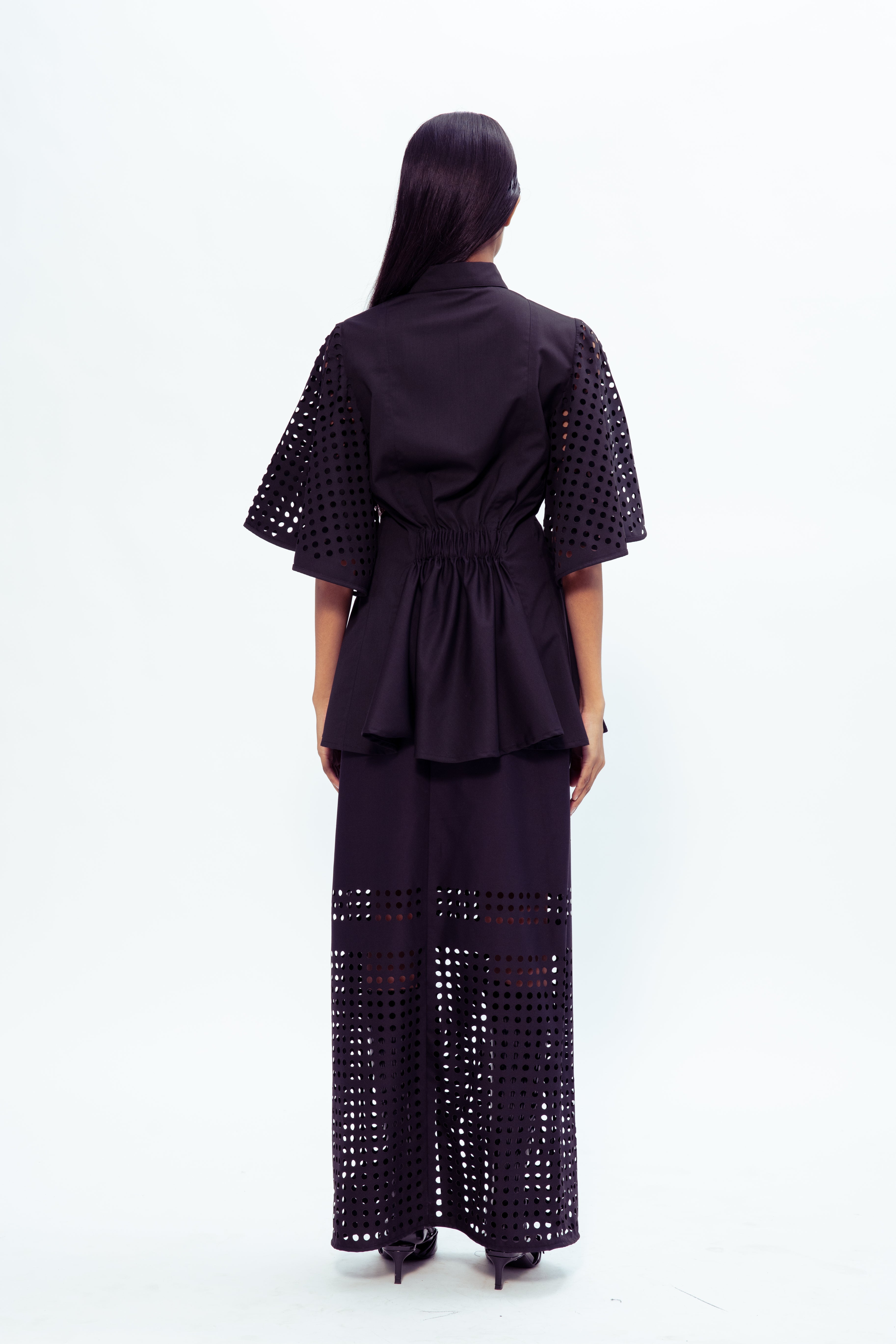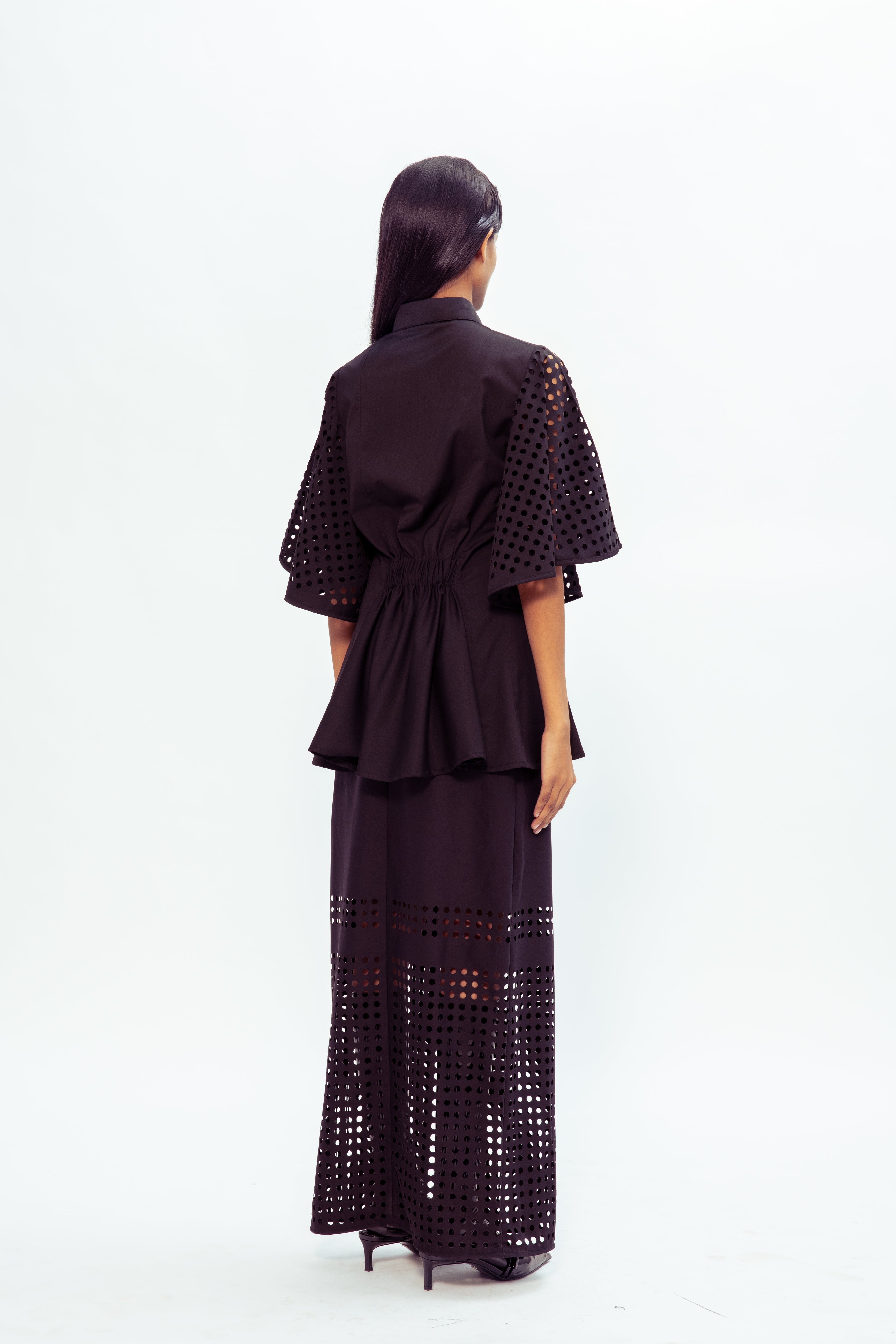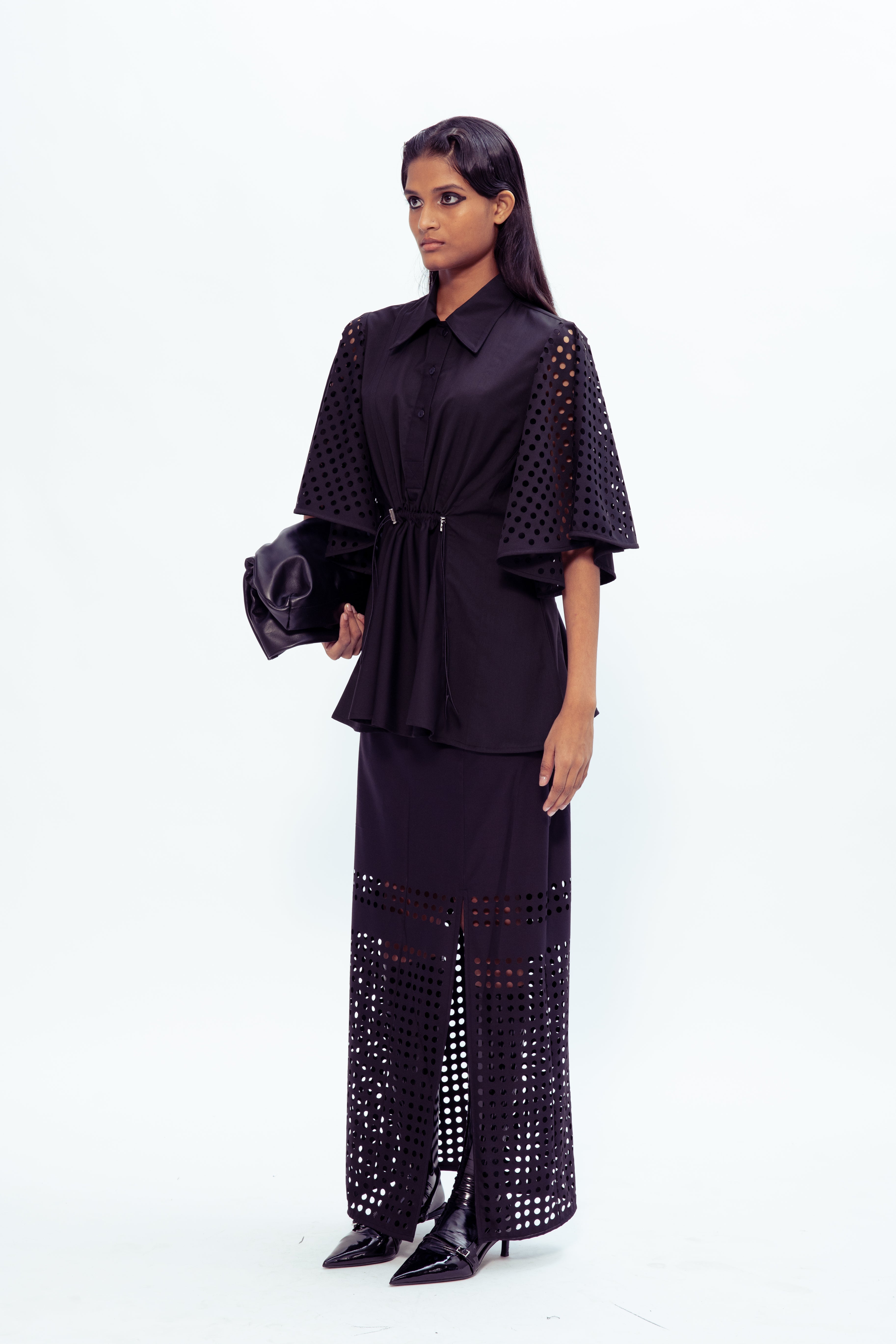 This contemporary co-ord set pairs a laser mesh top and midi skirt for a look that’s lightweight, breathable, and full of edge. The top features adjustable drawstring details for a customizable fit, while the skirt’s single pleats add subtle movement and texture.