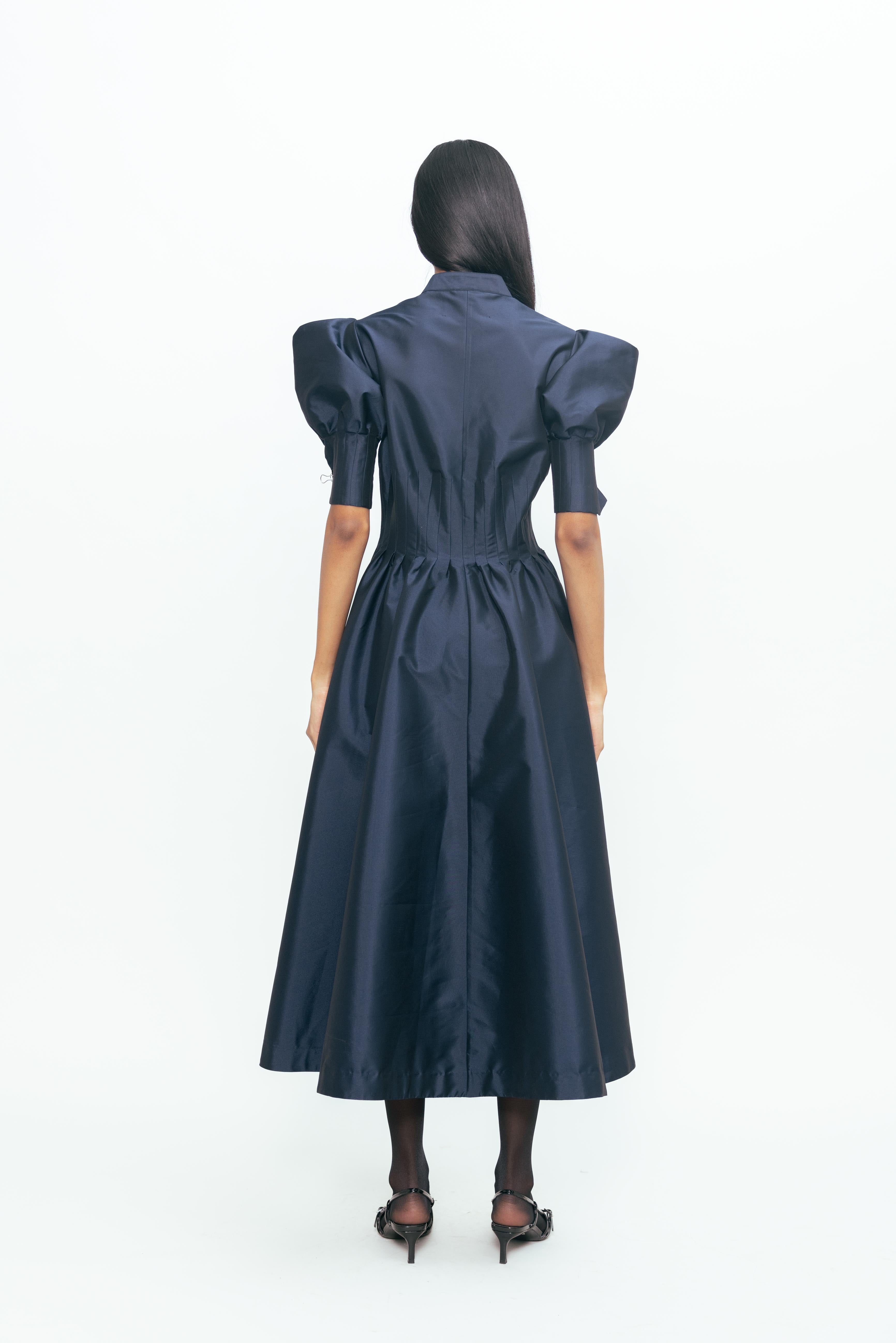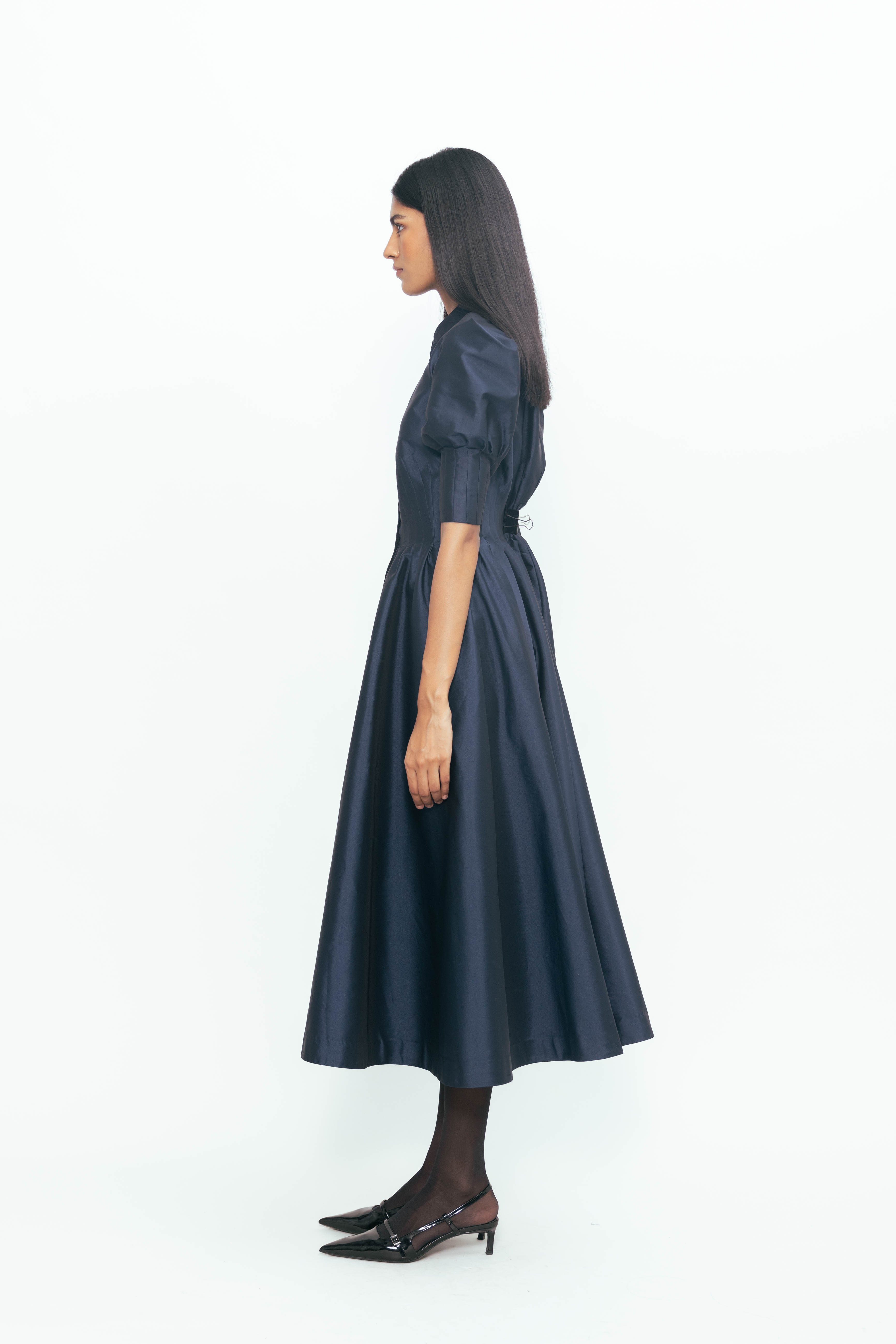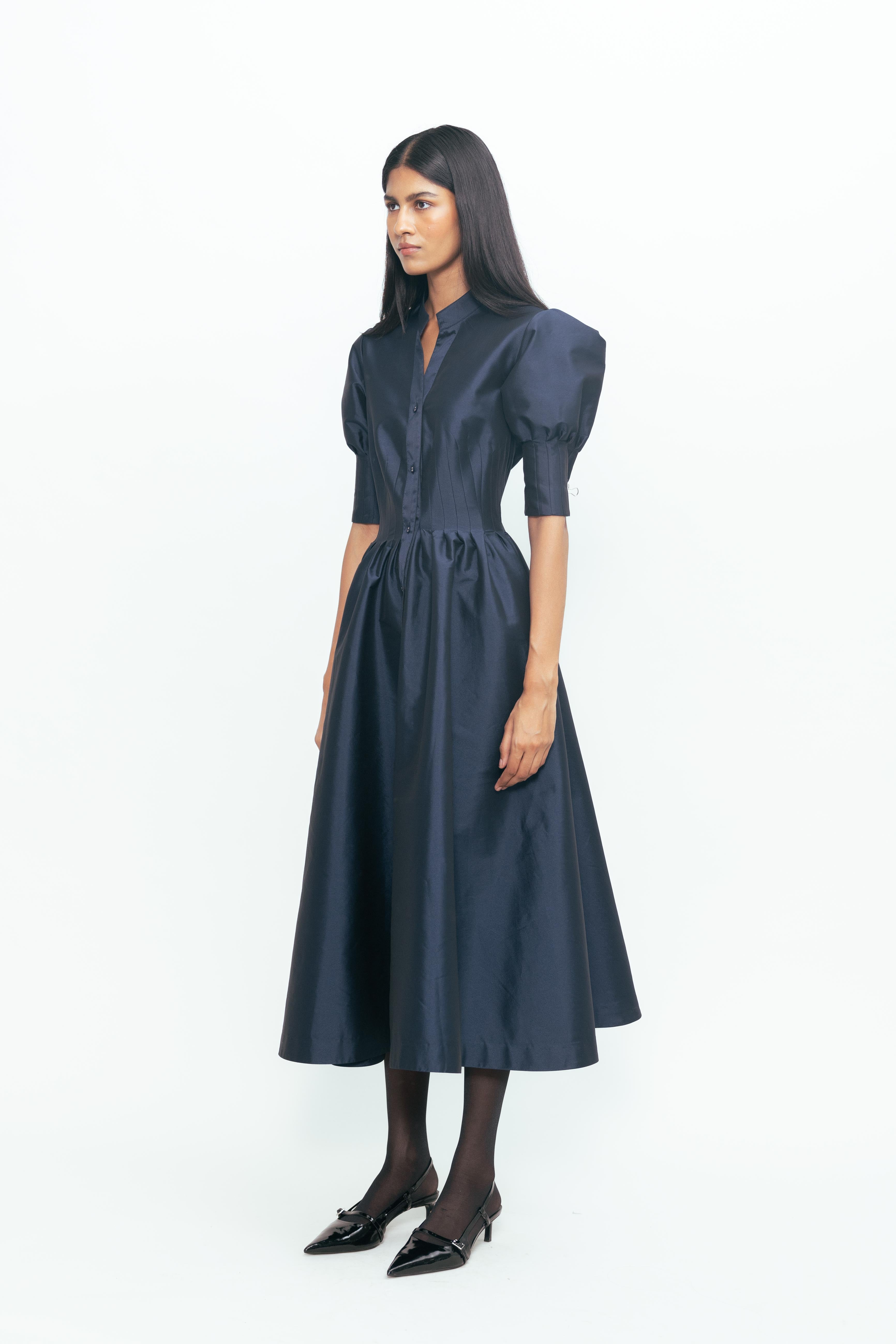 This midi shirt dress features a classic design cinched at the waist for a flattering silhouette. It boasts stylish puff sleeves with cuffs that add a touch of elegance and volume. The dress falls gracefully to a midi length, making it versatile for both casual and semi-formal occasions. Its combination of structure and softness offers a chic yet comfortable look.