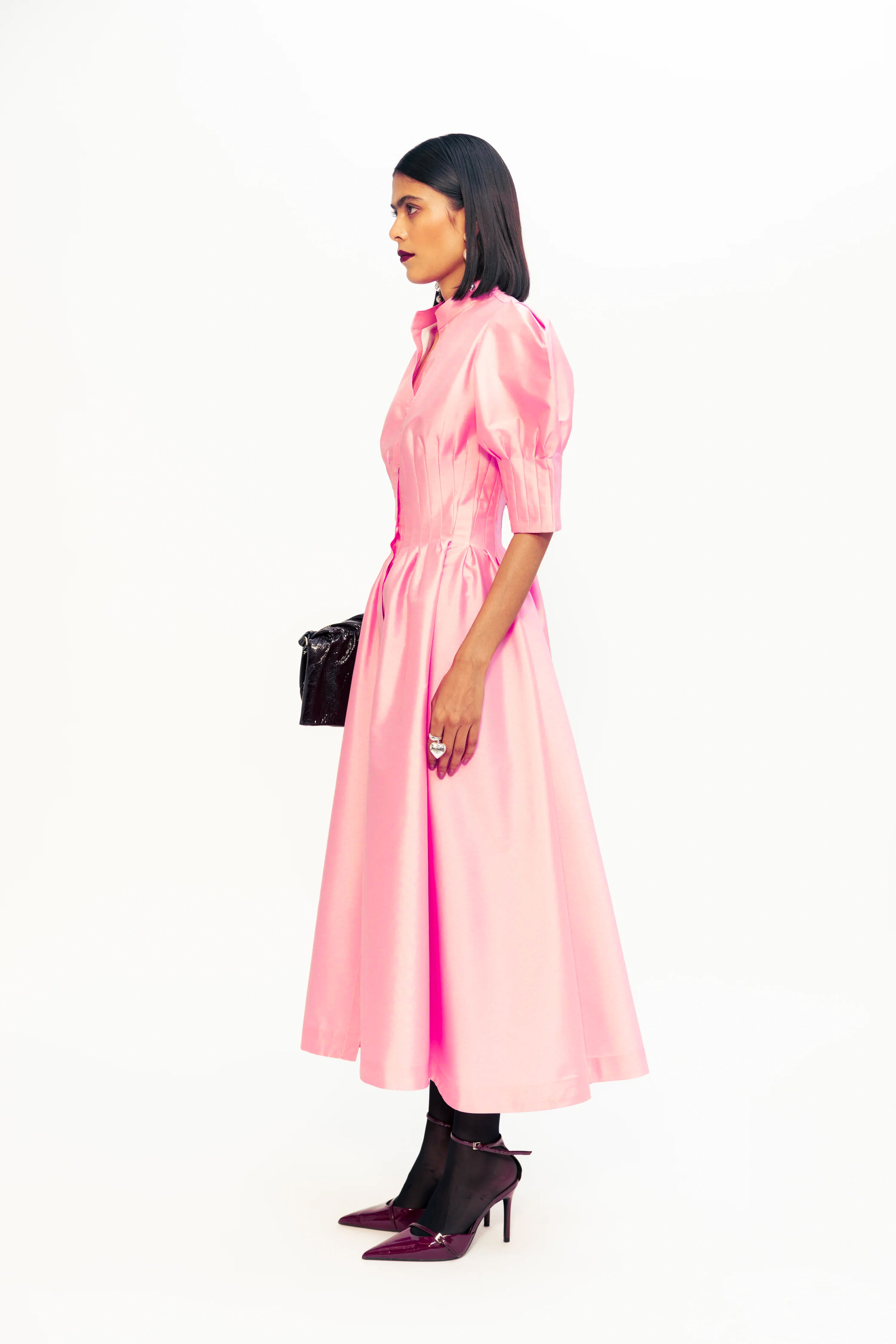 This midi shirt dress features a classic design cinched at the waist for a flattering silhouette. It boasts stylish puff sleeves with cuffs that add a touch of elegance and volume. The dress falls gracefully to a midi length, making it versatile for both casual and semi-formal occasions. Its combination of structure and softness offers a chic yet comfortable look.