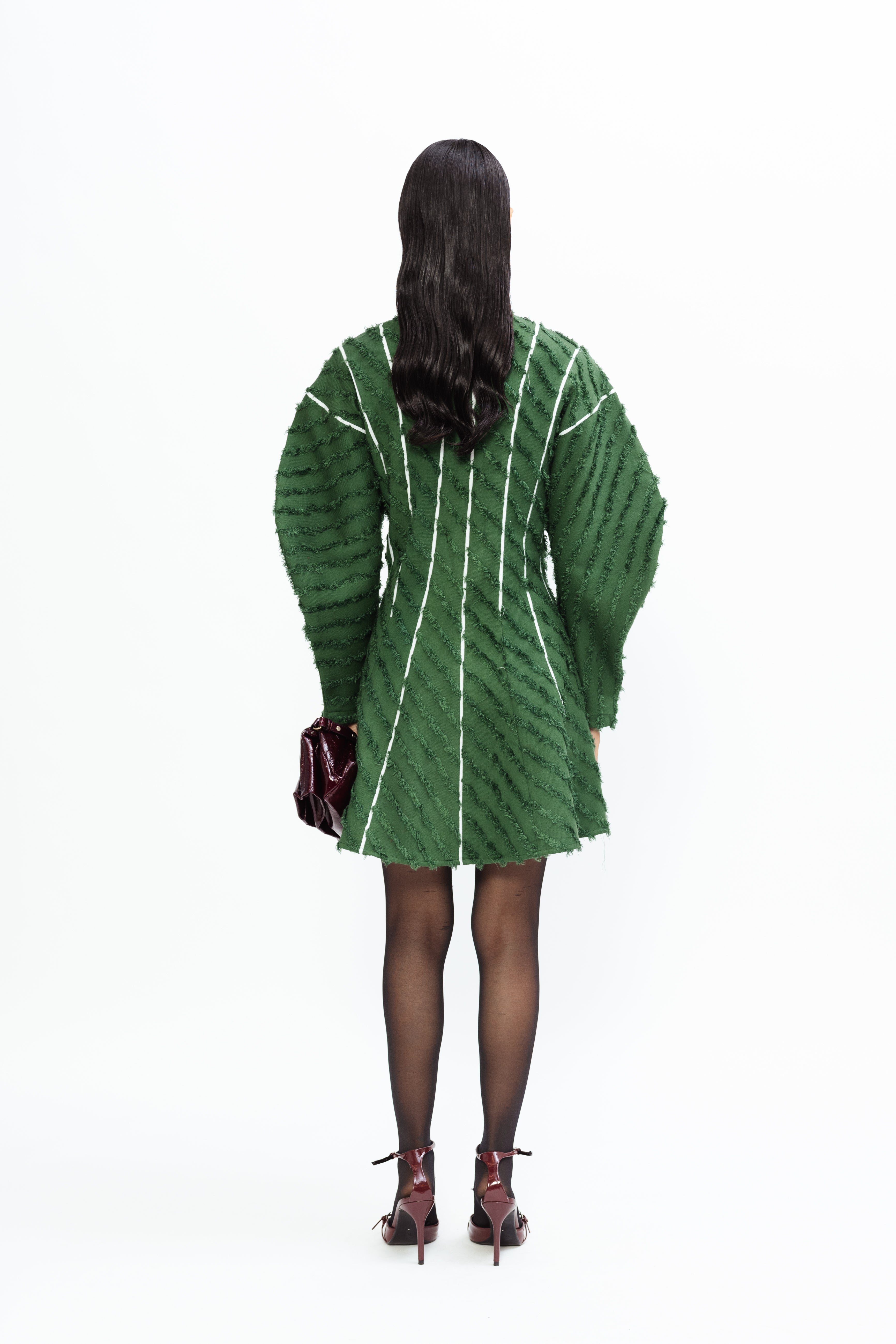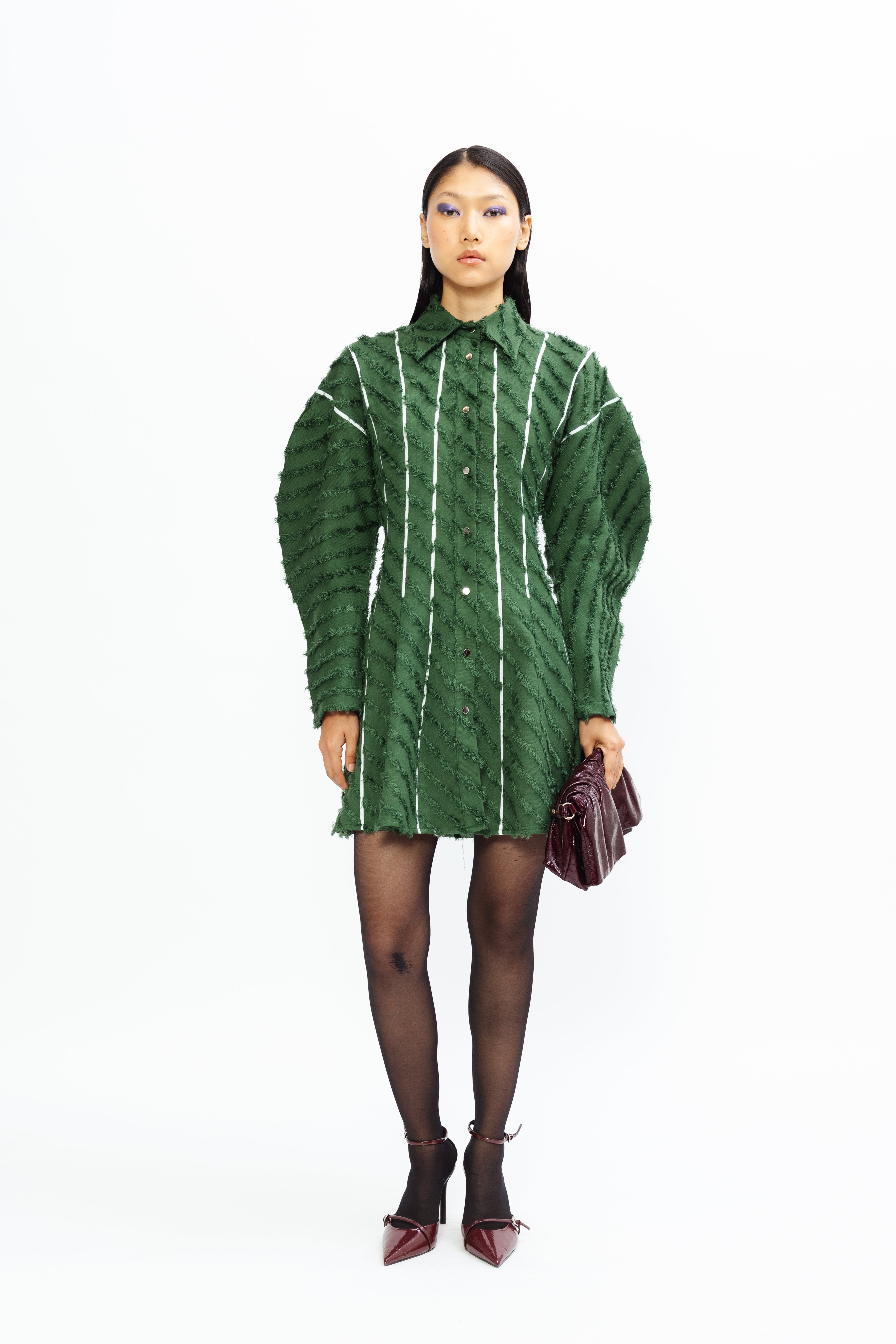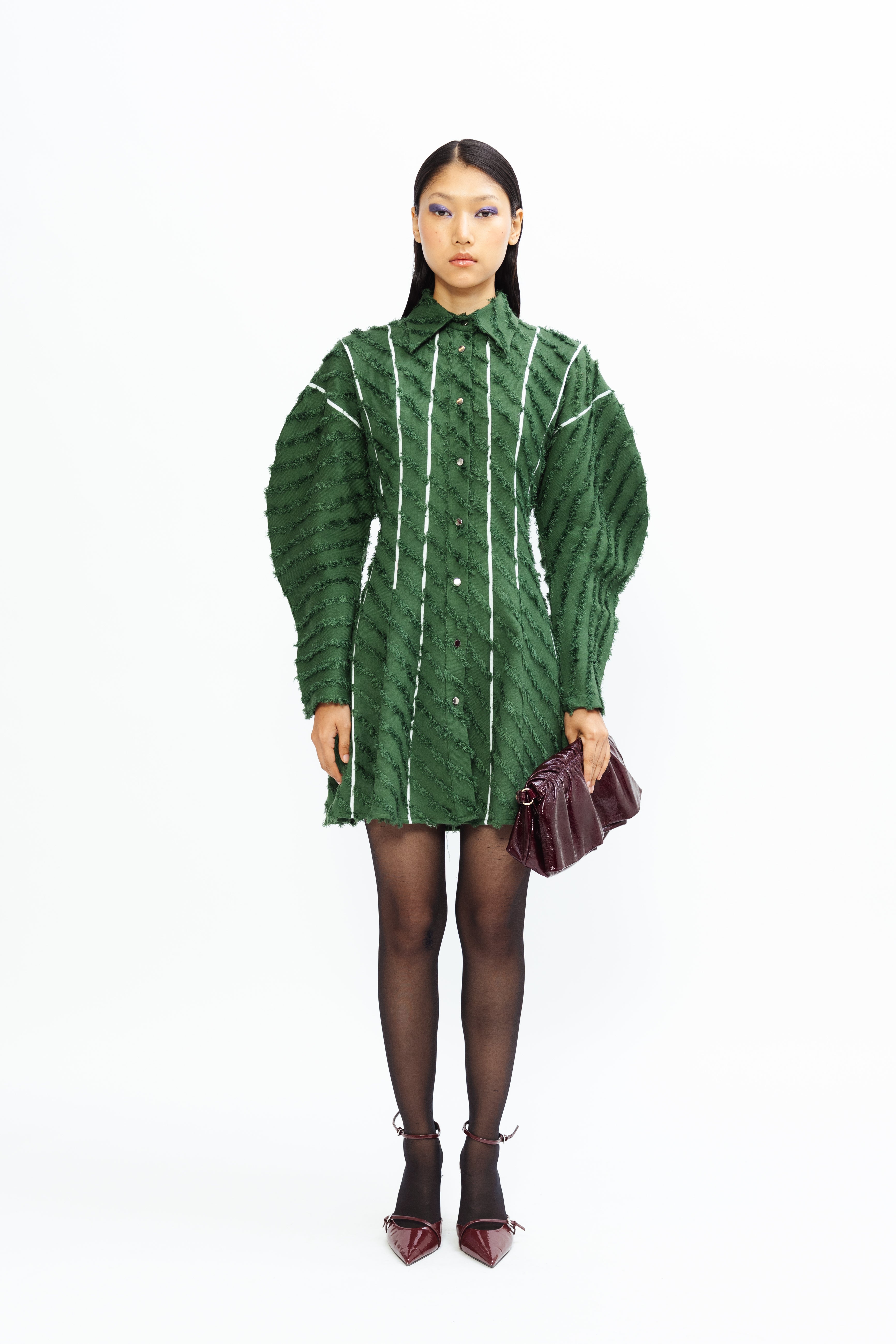 A signature short dress crafted in soft wool, defined by subtle slot detailing that adds structure and character. The clean silhouette and tactile fabric combine comfort with understated sophistication, making it an effortlessly stylish wardrobe staple.