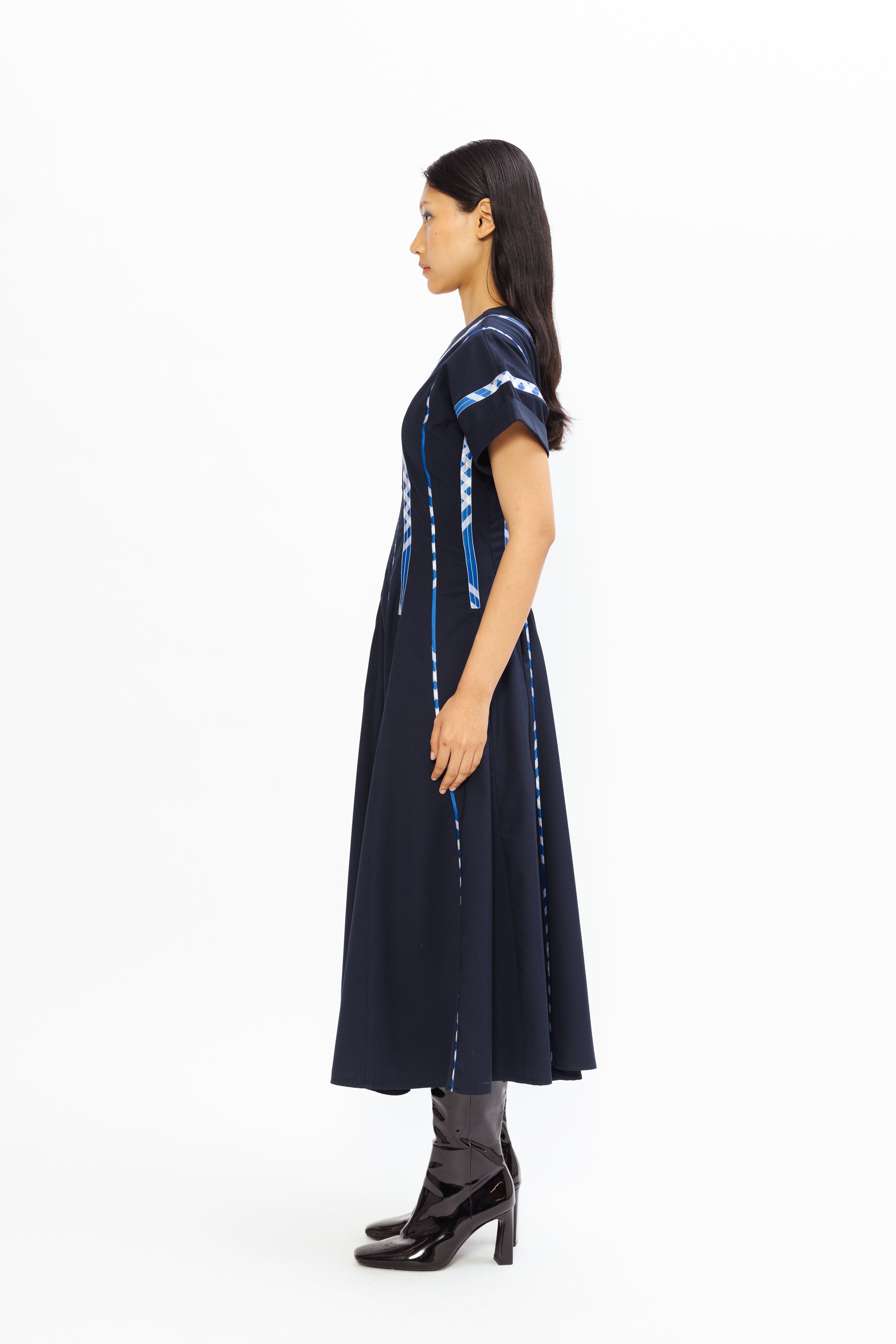 A mid-length dress with a V-neck and contrast slots all over is a chic and playful piece. The V-neckline adds a flattering touch, while the contrast slots throughout the dress create visual interest and texture. This design offers a balance of sophistication and modern flair, making it a standout choice for any occasion.