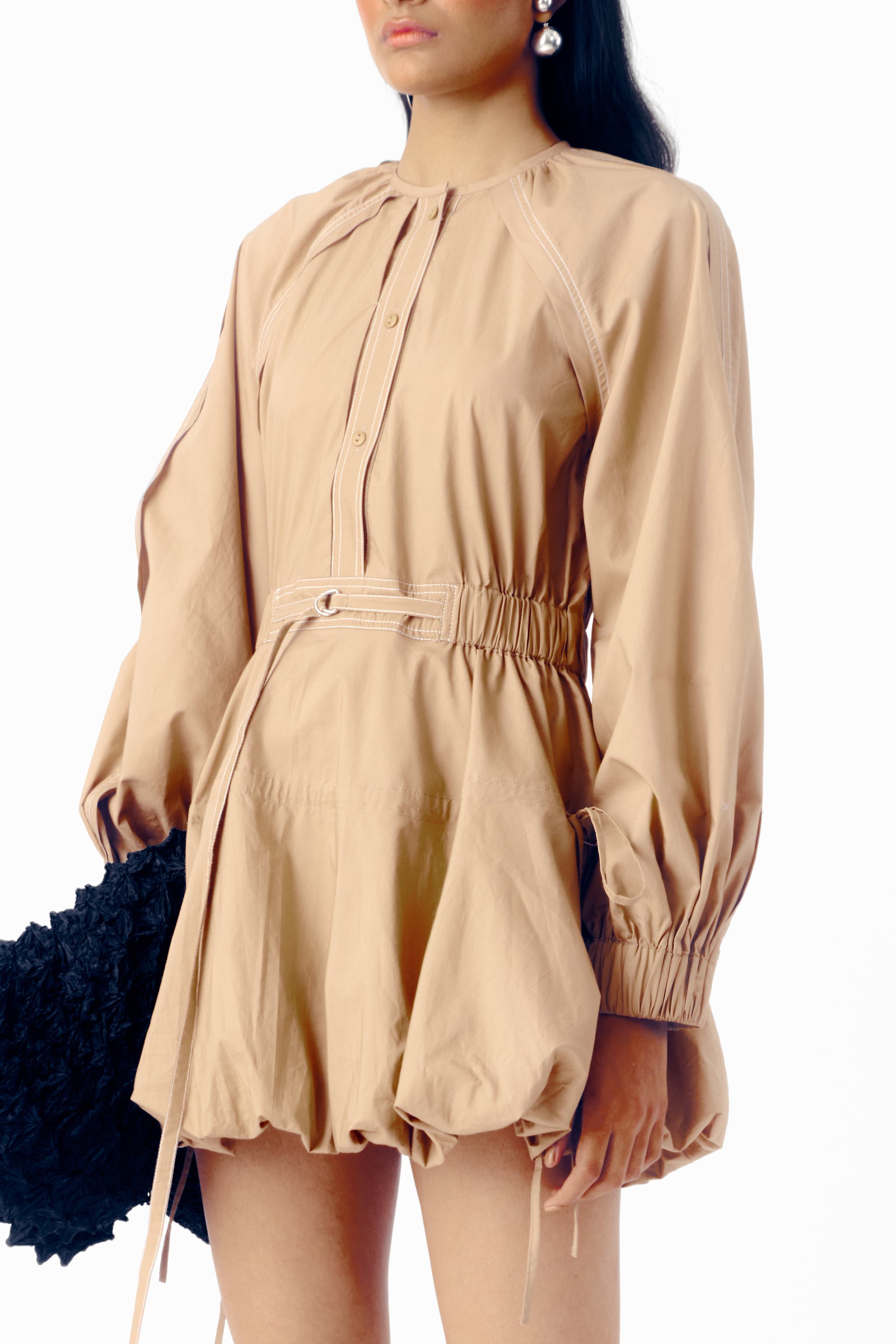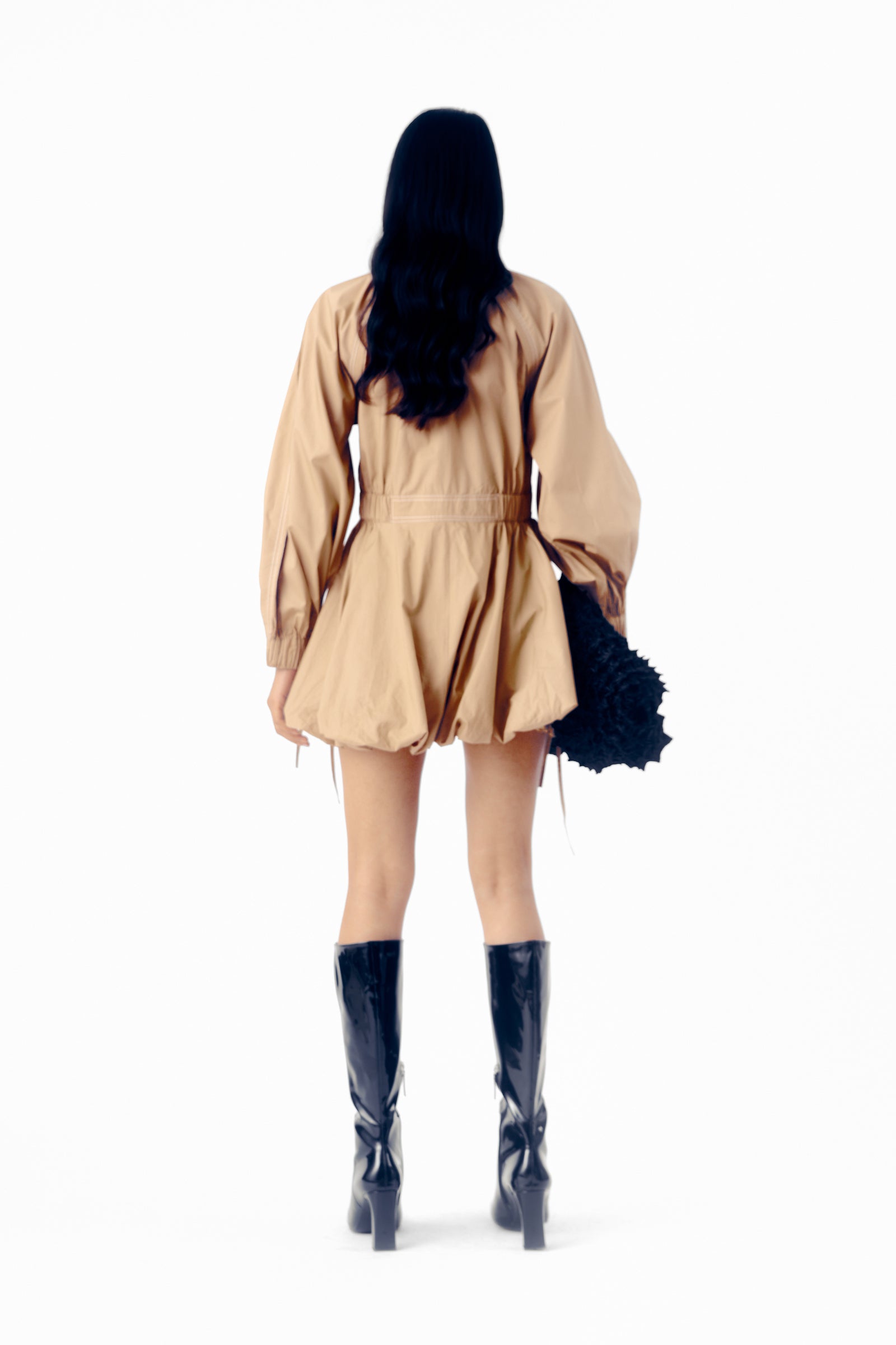 This short balloon dress features a playful silhouette with a balloon skirt and raglan sleeves, offering both comfort and style. The attached belt cinches the waist for a flattering fit and adds a touch of definition to the relaxed silhouette. Perfect for a casual yet chic look.