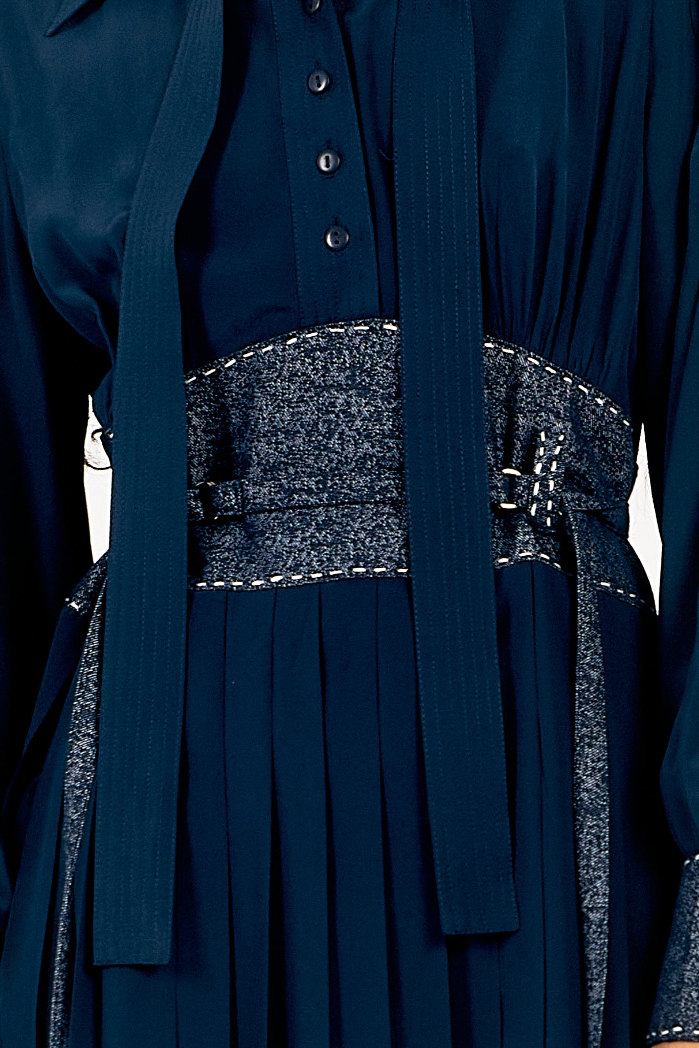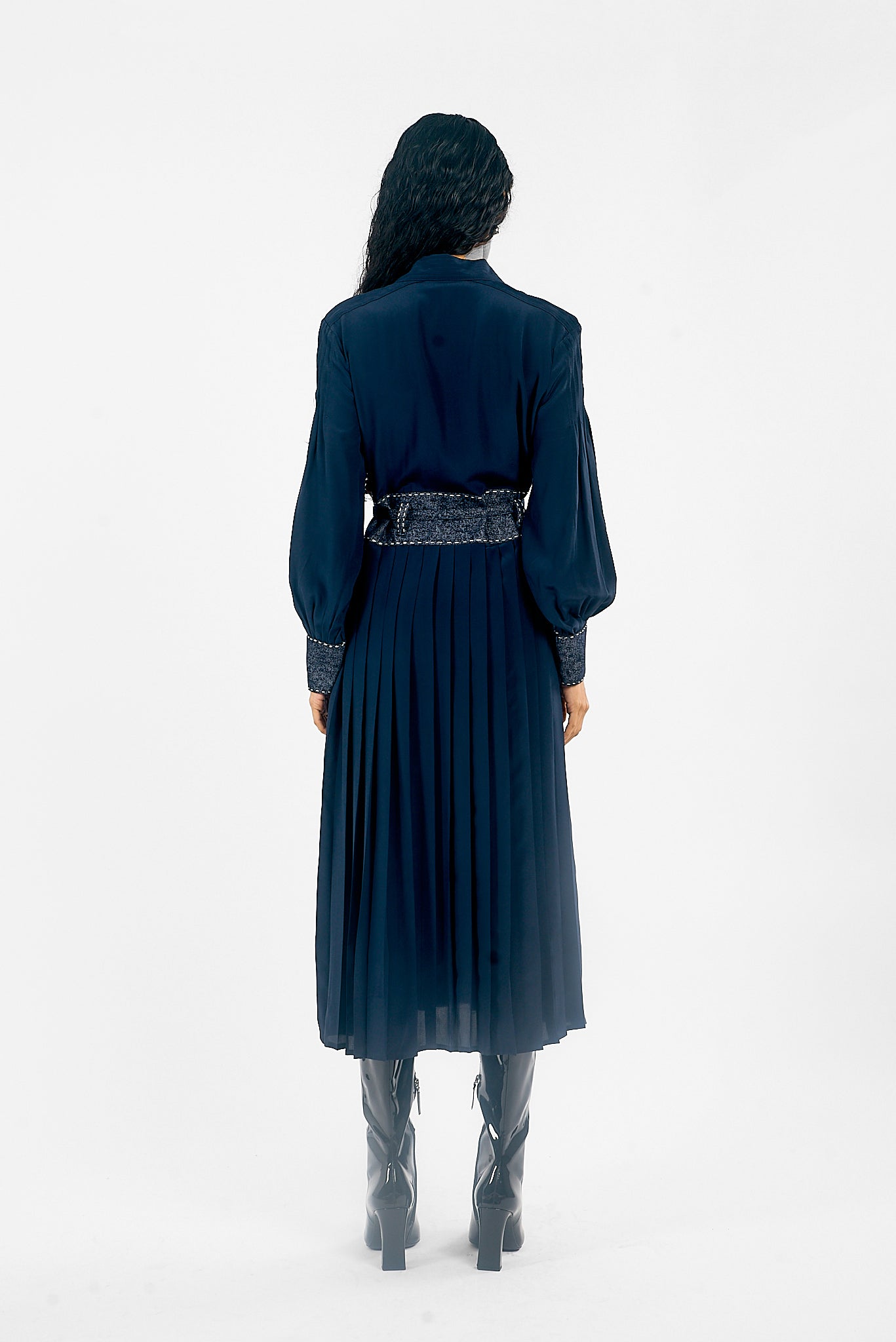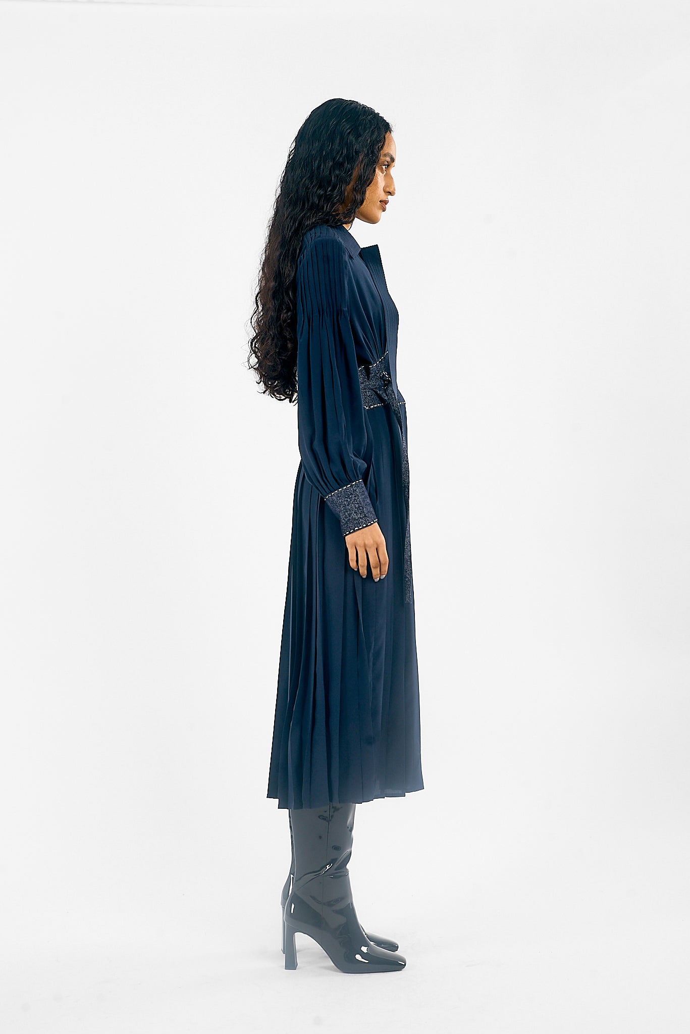 This crepe pleated midi dress with a side-belted waist, featuring chambray denim cuffs and a matching chambray belt at the waist. The combination of soft pleats and denim accents creates a stylish, structured silhouette with a modern, mixed-fabric appeal.