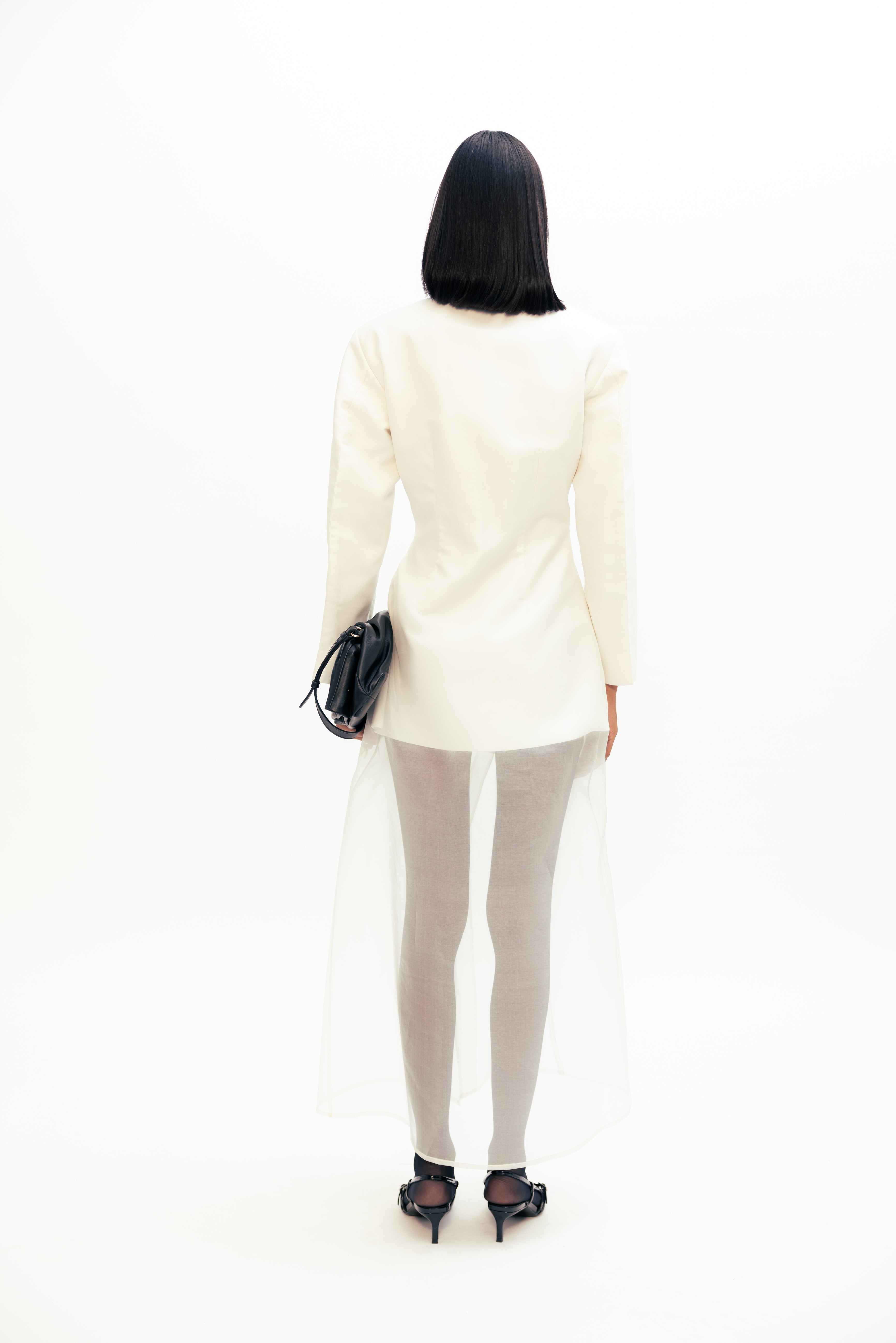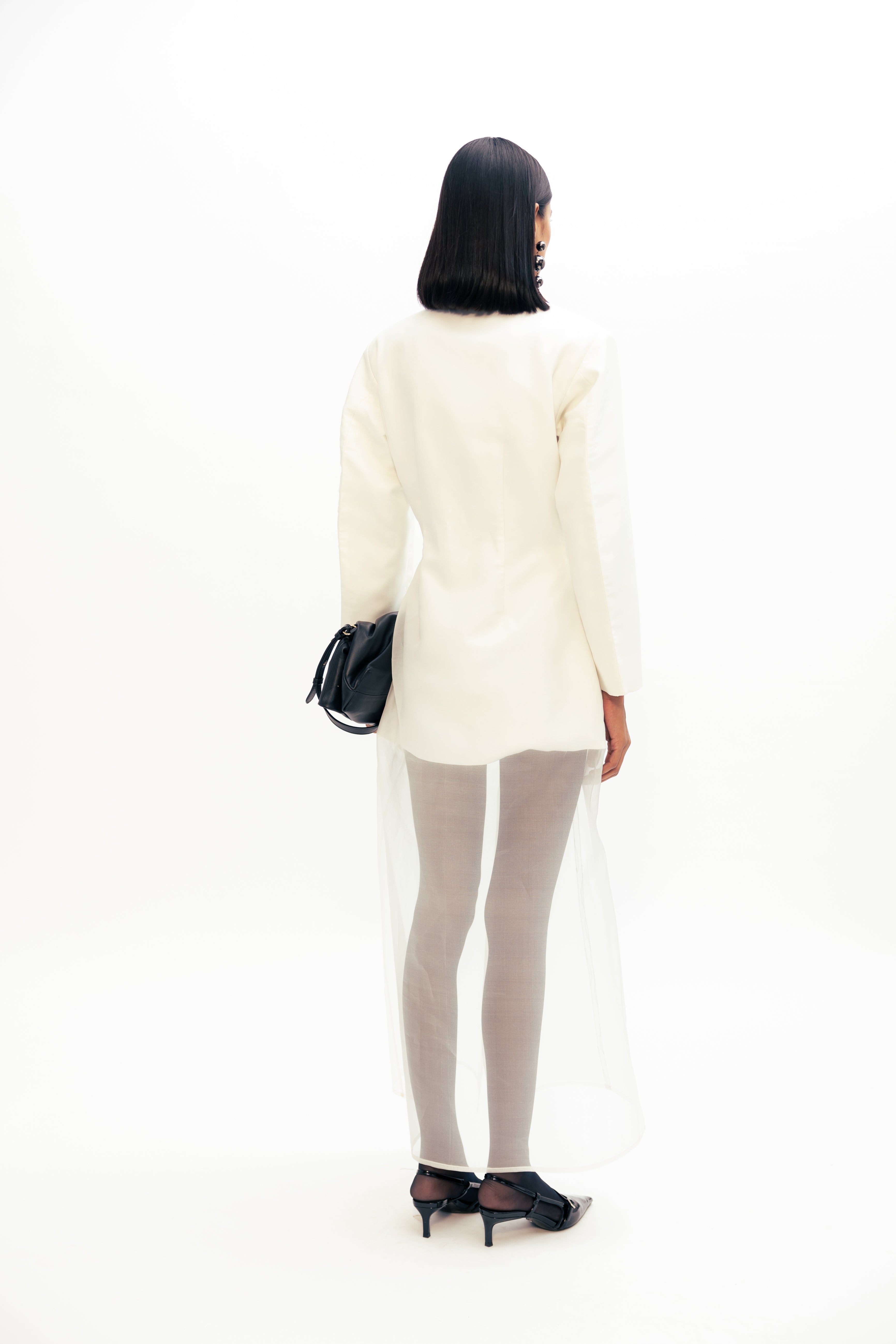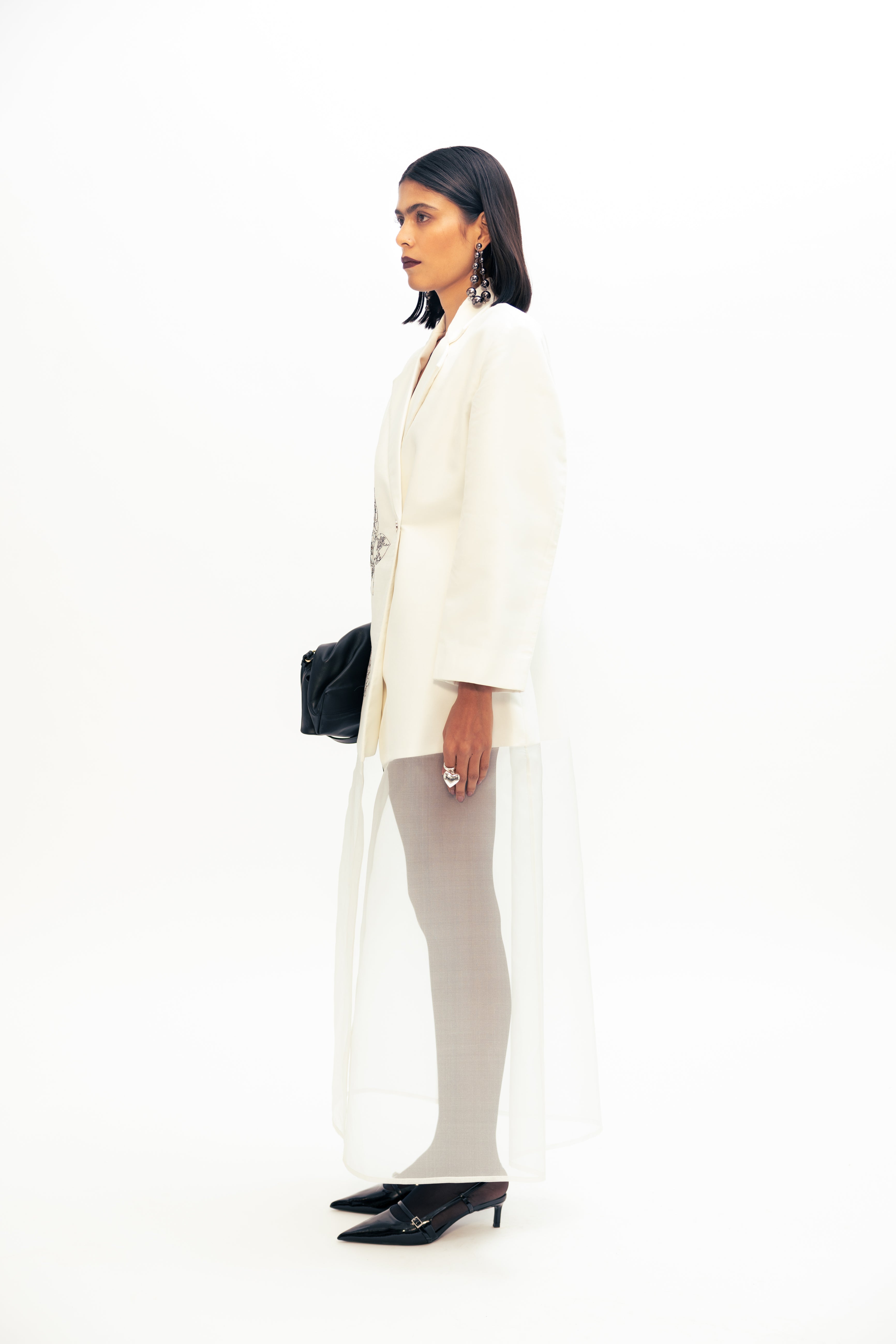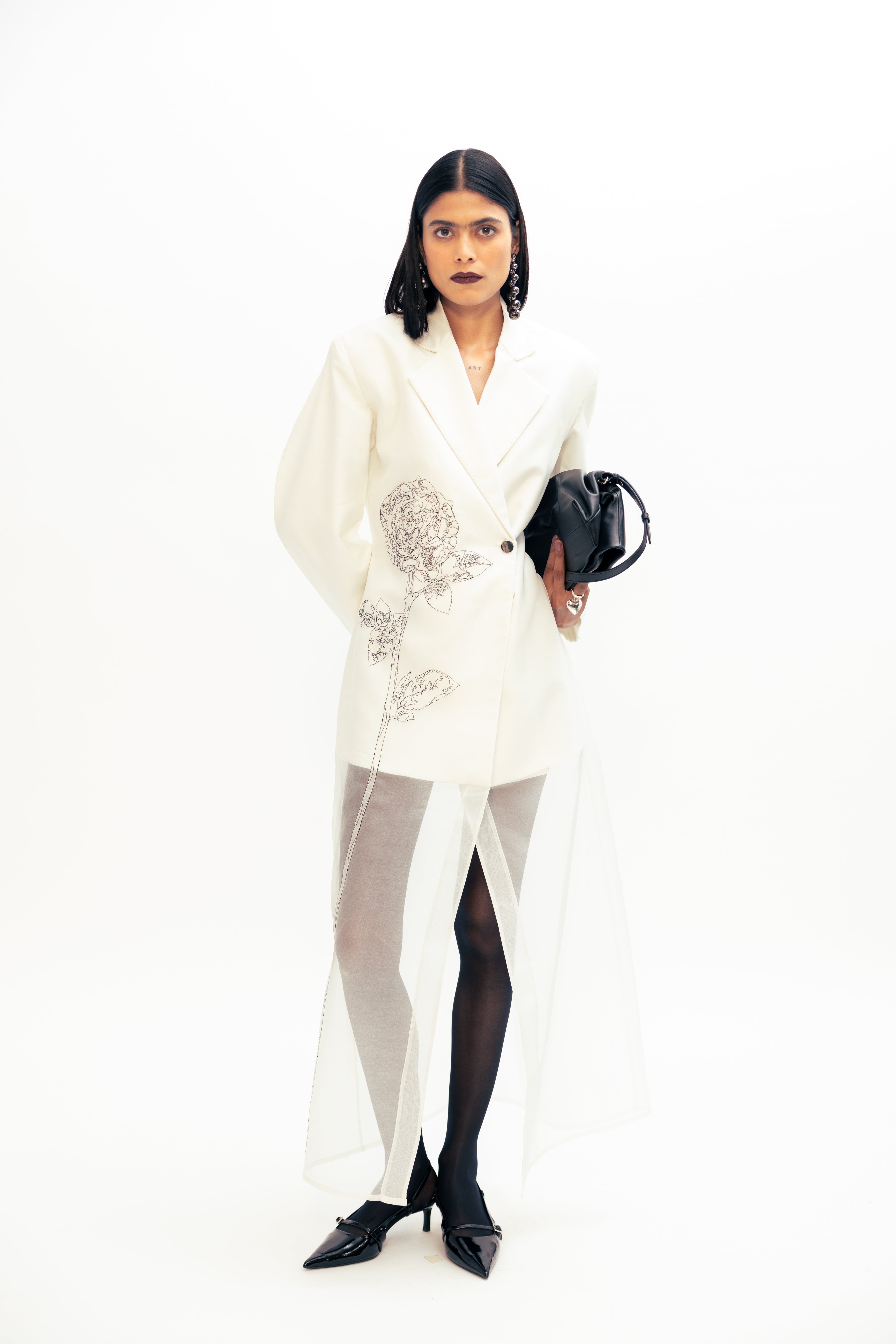 A stylish sheer blazer dress featuring delicate Freesia embroidery and a tailored silhouette for an elegant, modern look. Perfect for evening events.