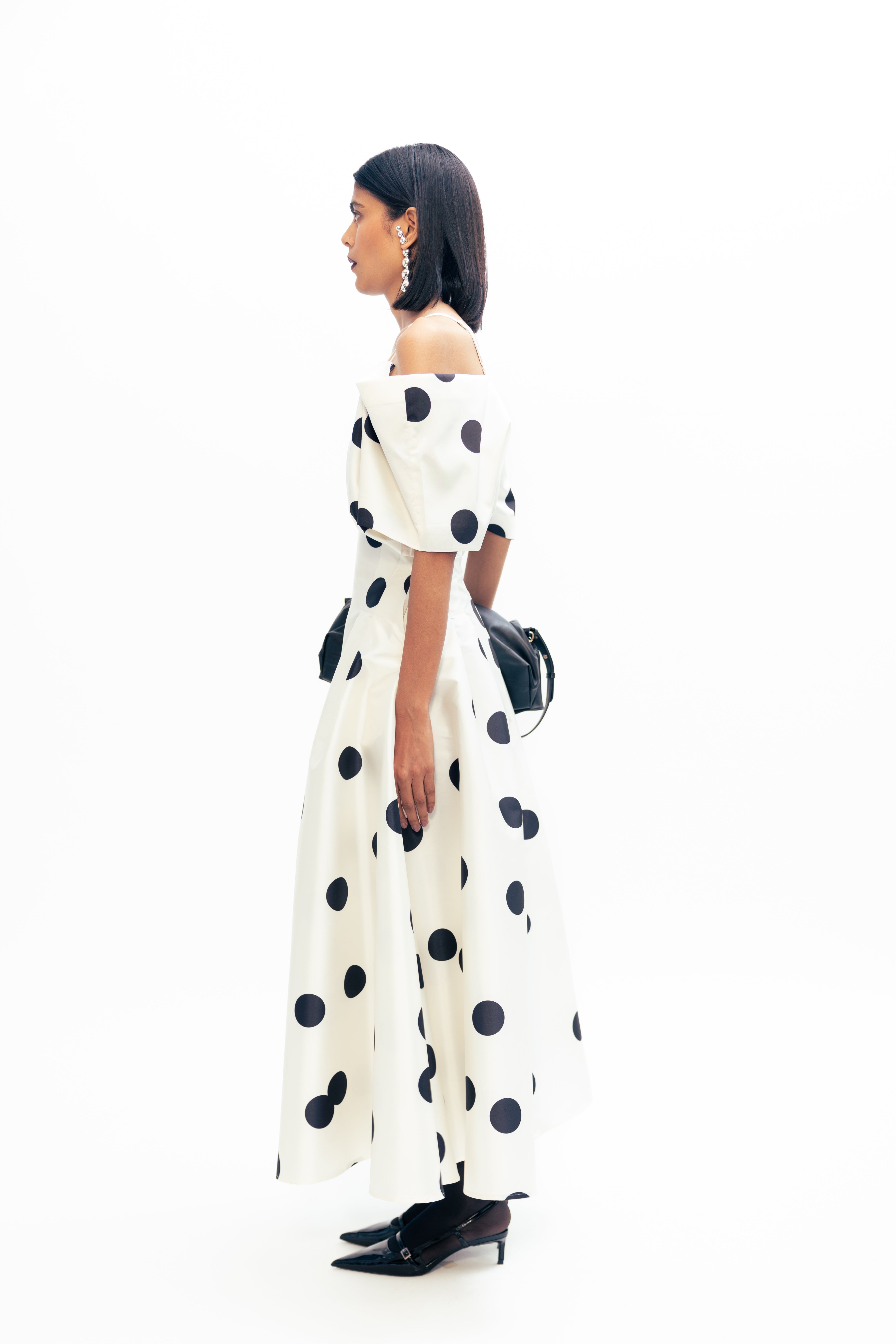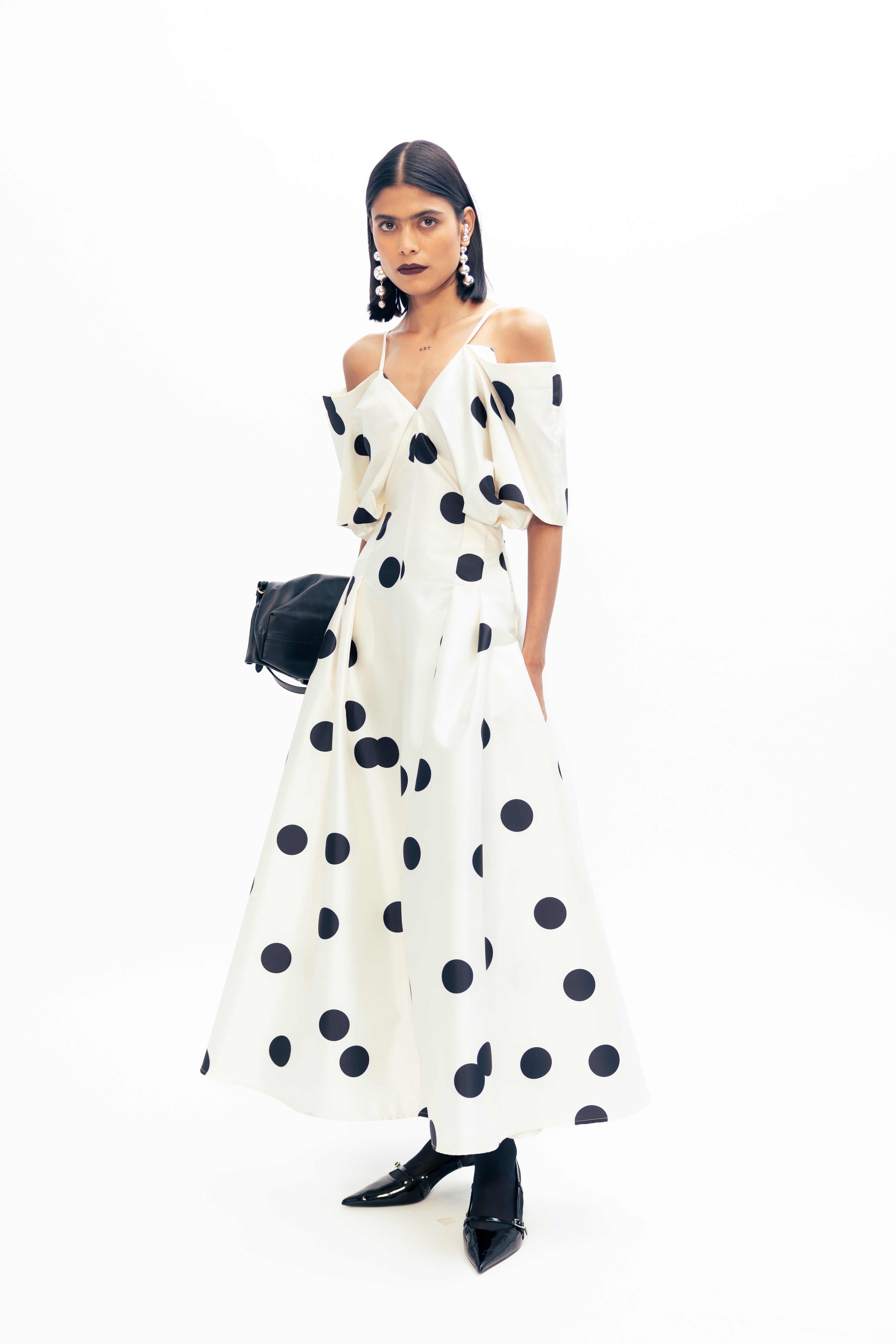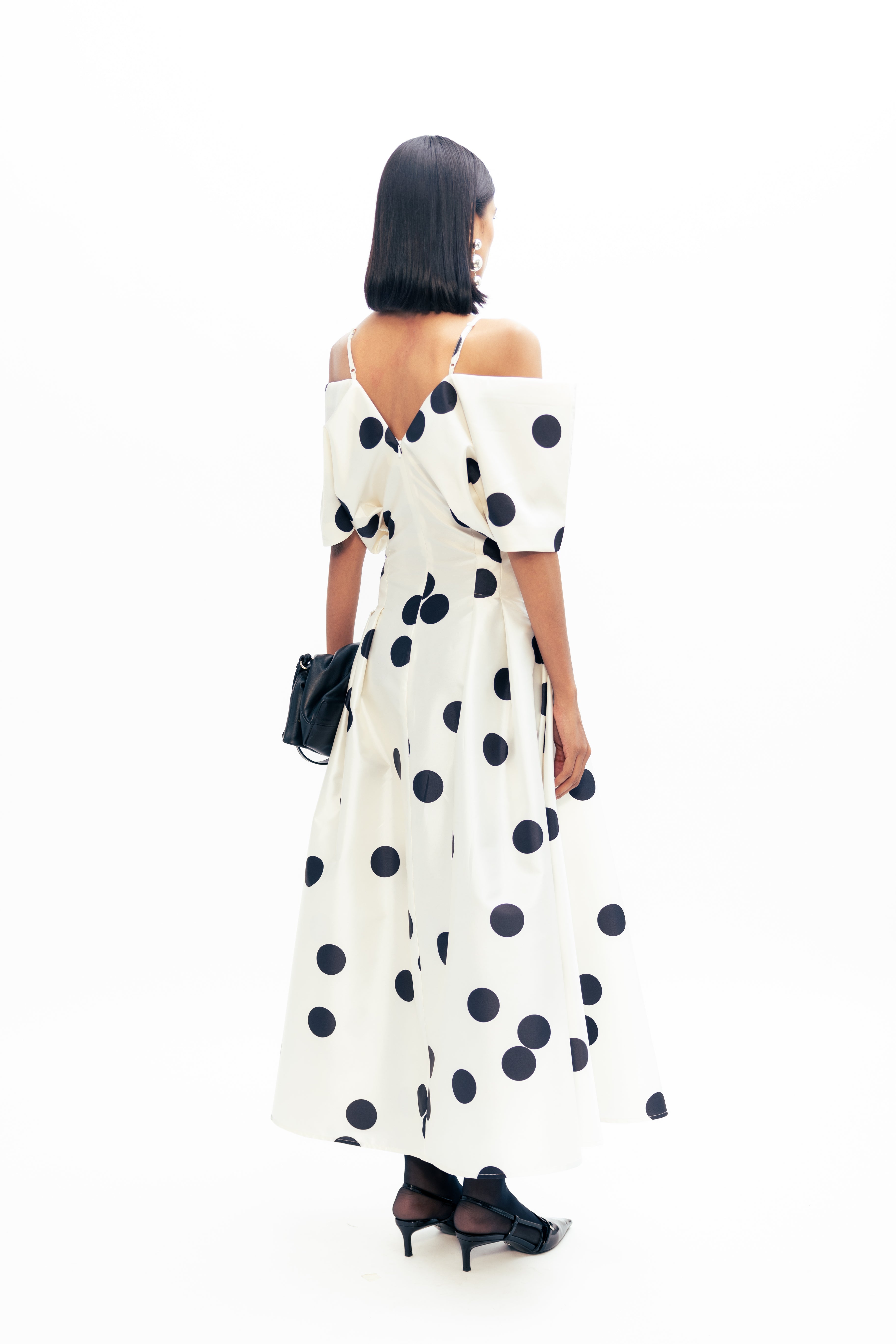 A voluminous silhouette commands attention with bold proportions and sculptural folds. Oversized circular motifs bring playful contrast to the crisp surface, while the off-shoulder neckline and structured pleats frame the form with intention. Subtle sheen and fluidity add movement, creating a striking interplay of elegance and drama. Finished with delicate straps and a cinched waist, this piece transforms presence into statement.
