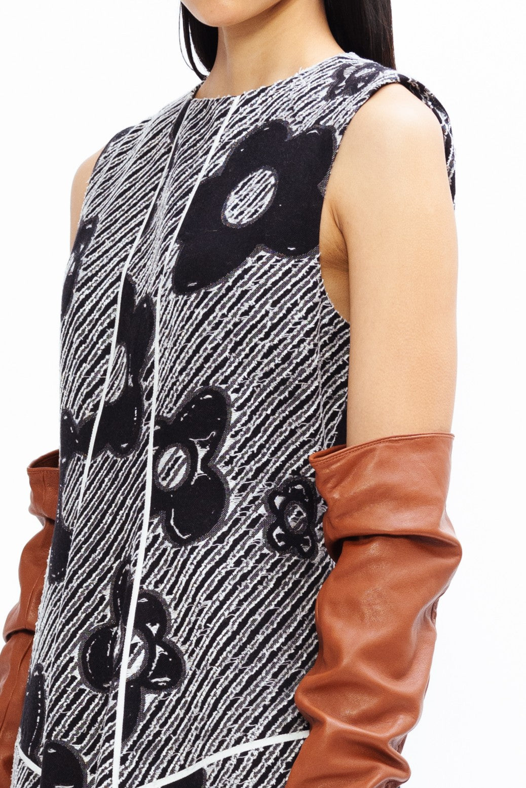 This paneled fit-and-flare dress features an oversized, structured silhouette with a slightly relaxed fit that blends modern artistry with timeless femininity. The bold black-and-white graphic pattern, showcasing abstract florals and diagonal linework, adds a textured visual appeal. Thoughtfully paneled to accentuate the waist and create graceful movement, this piece makes a refined yet striking statement.
