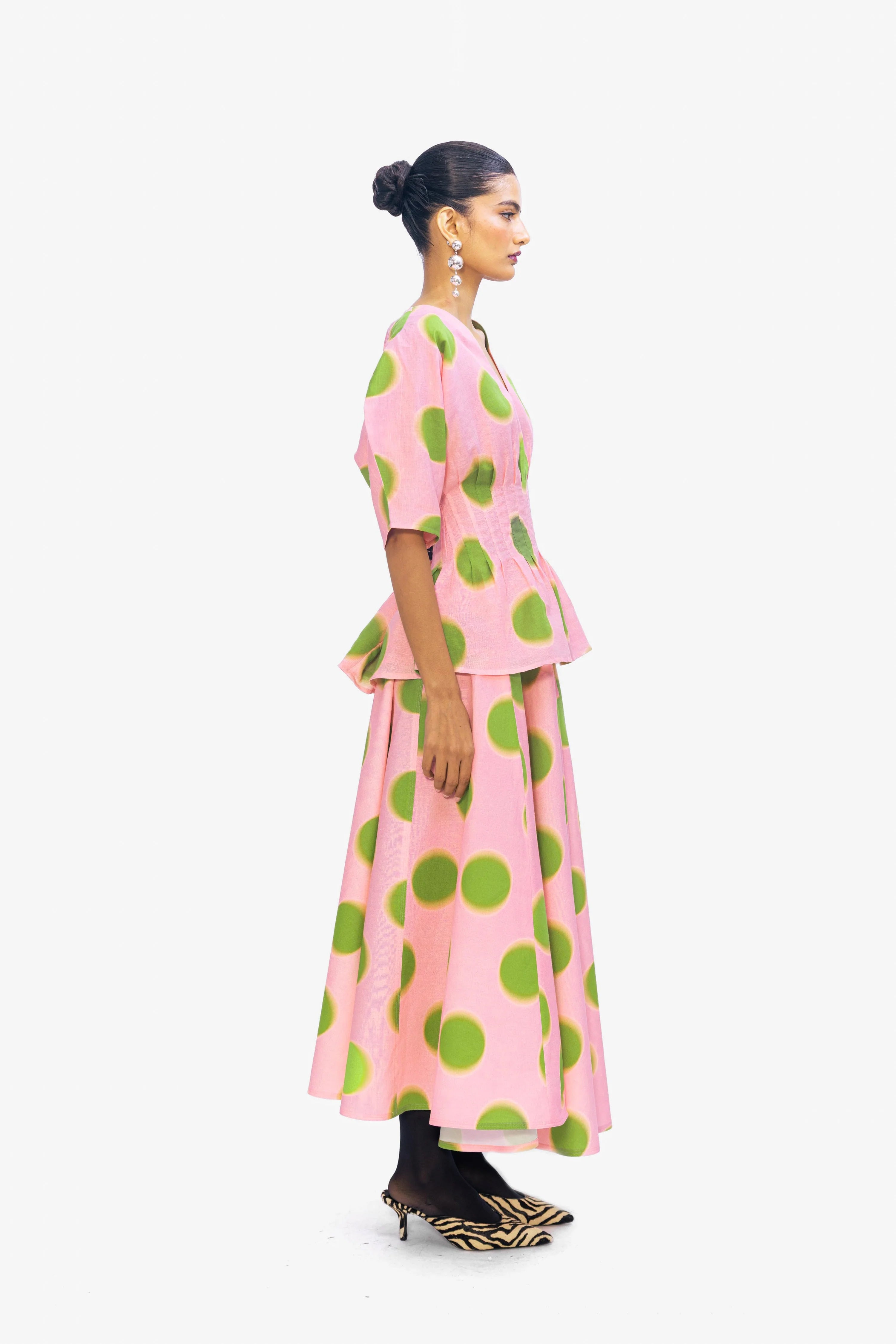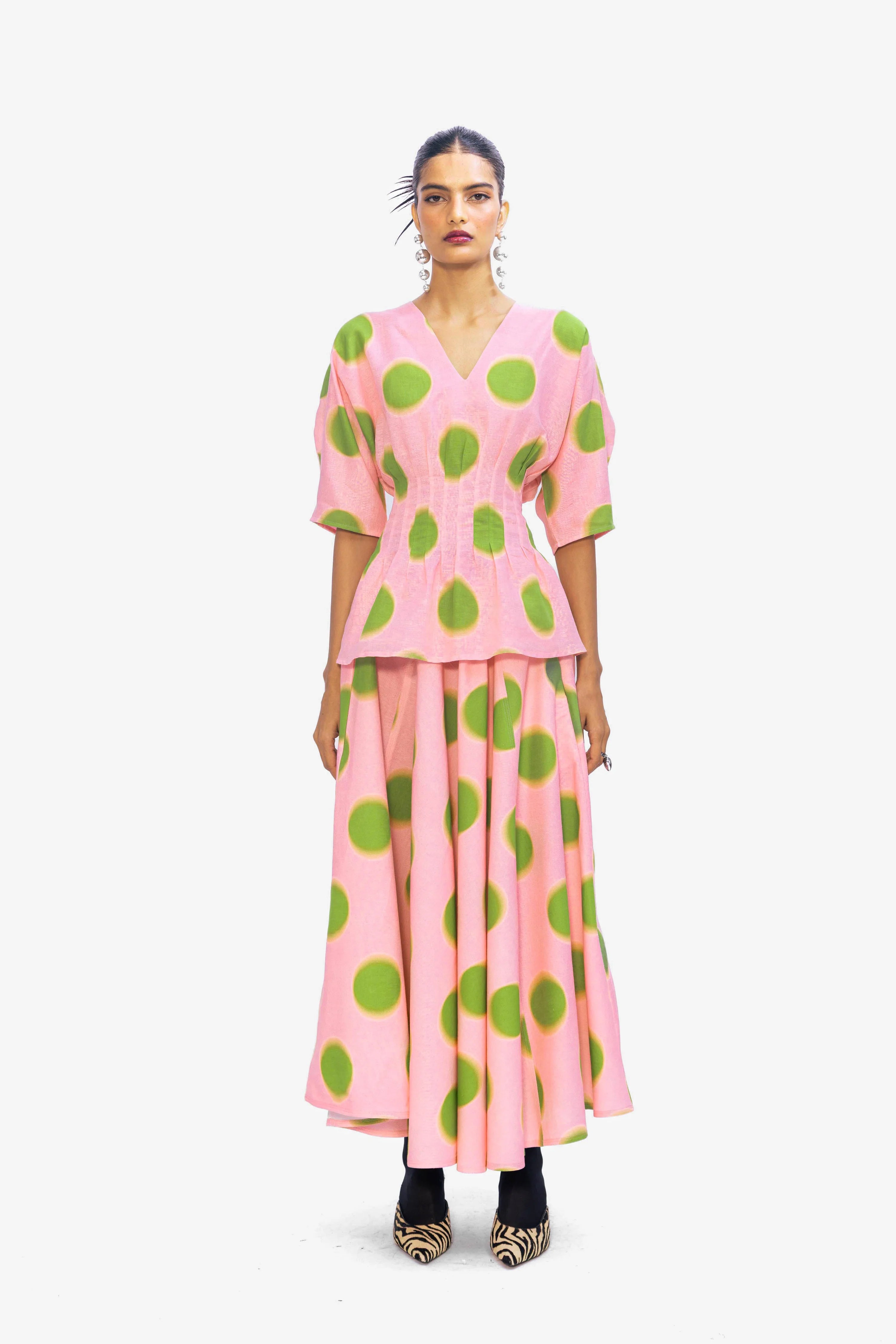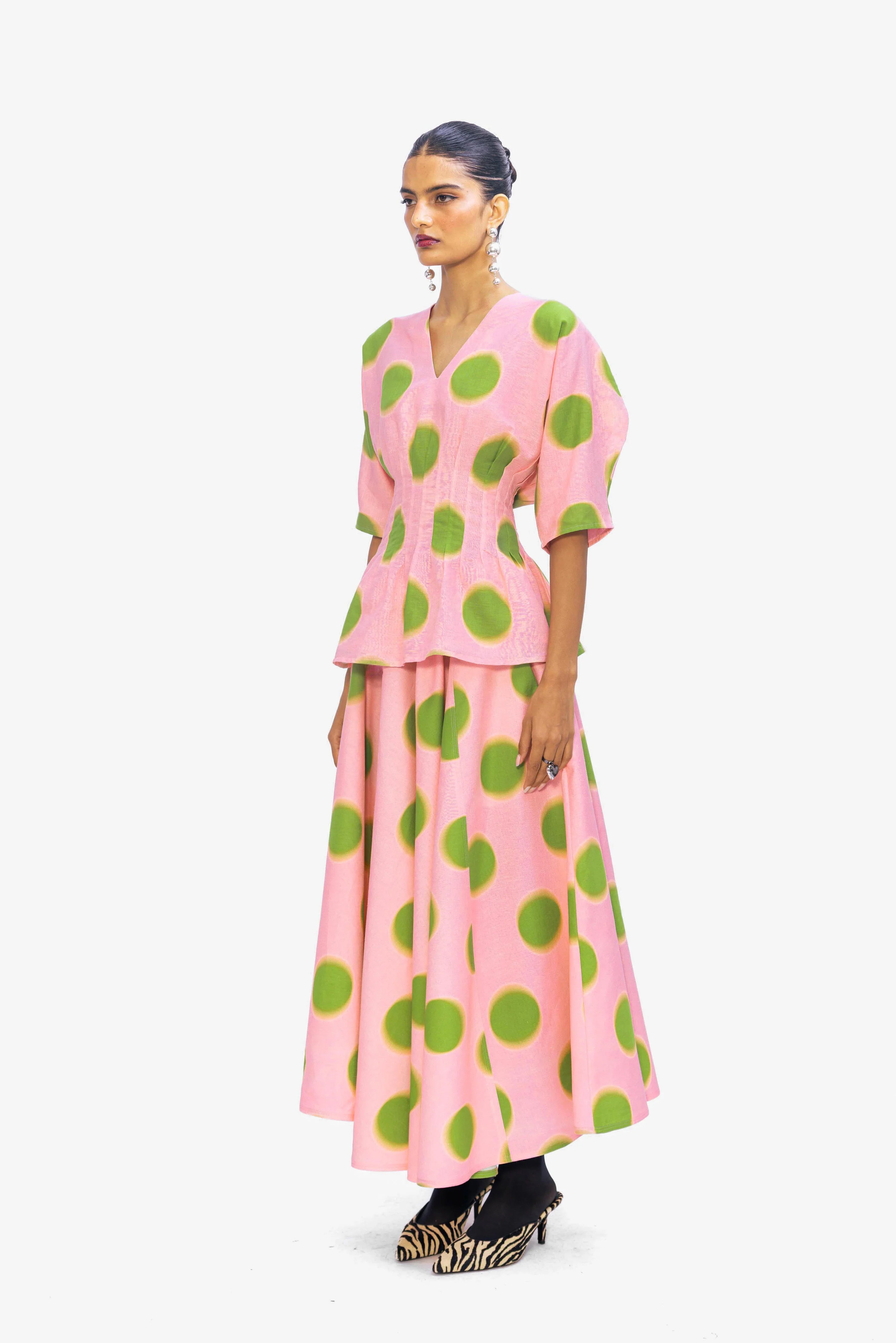 A V-neck peplum blouse in pink with oversized green polka dots, designed with gathered detailing at the waist to create a playful yet feminine silhouette.