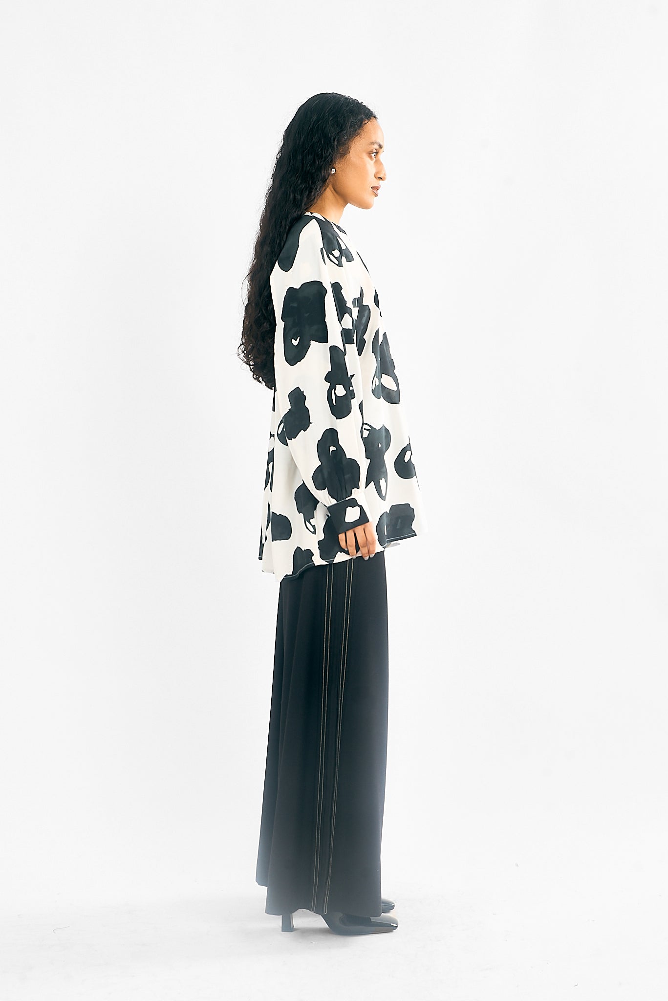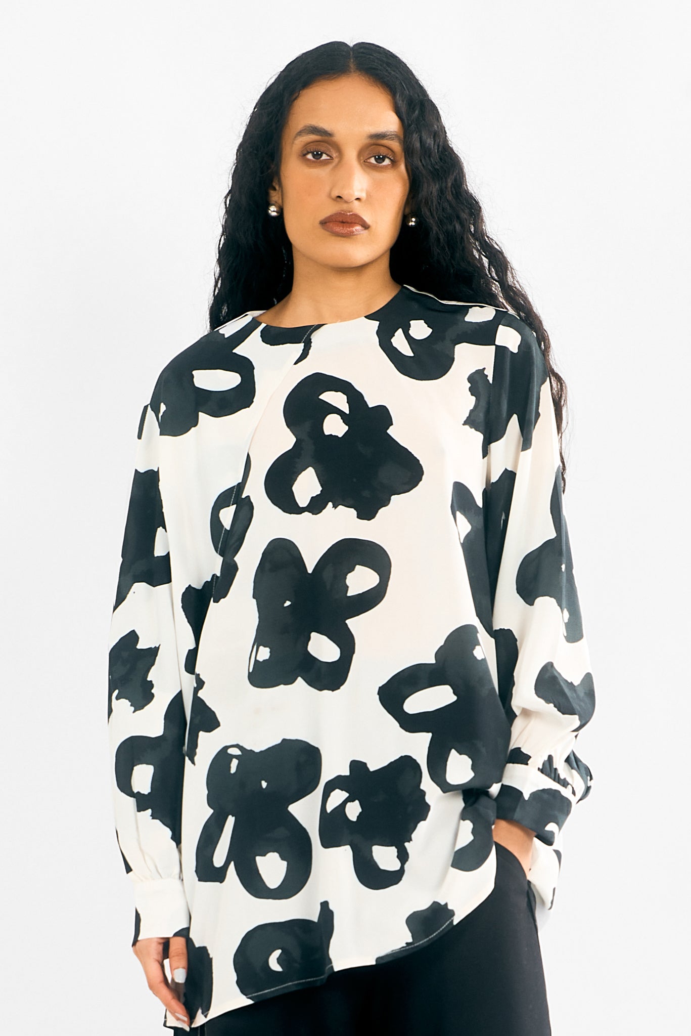 This round-neck top with flap sleeves and a vibrant digital print. The design combines a relaxed silhouette with striking graphic patterns, offering a modern and bold look with unique sleeve detailing.