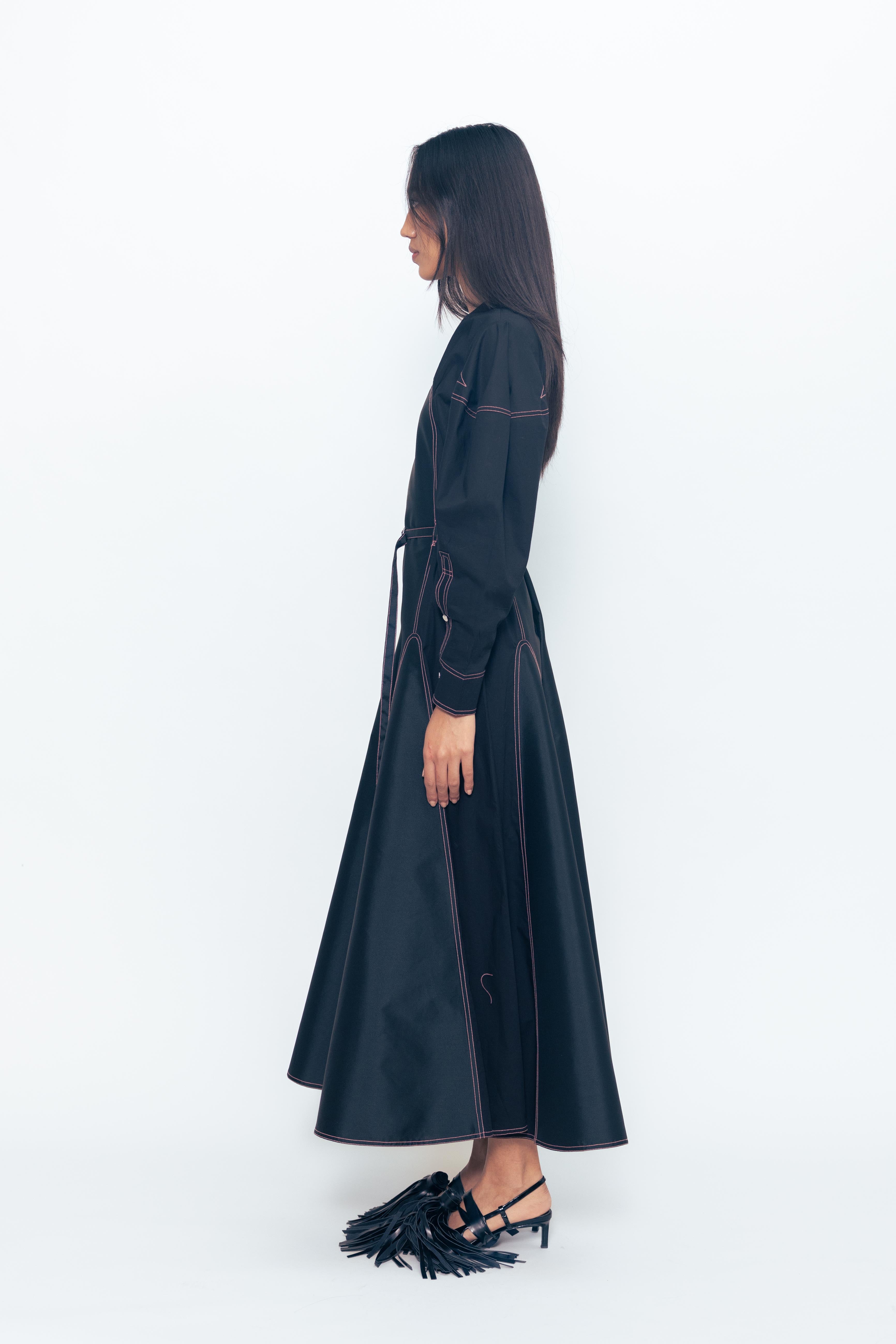 A bold interplay of texture and tone defines this piece, where crisp structure meets fluid form. Panels shift from matte to sheen, creating contrast not just in color but in light. The silhouette is elongated and balanced, drawn in at the waist with a defined tie that anchors the look. Each section feels deliberate—patchworked with purpose—offering a sense of motion, clarity, and quiet drama.