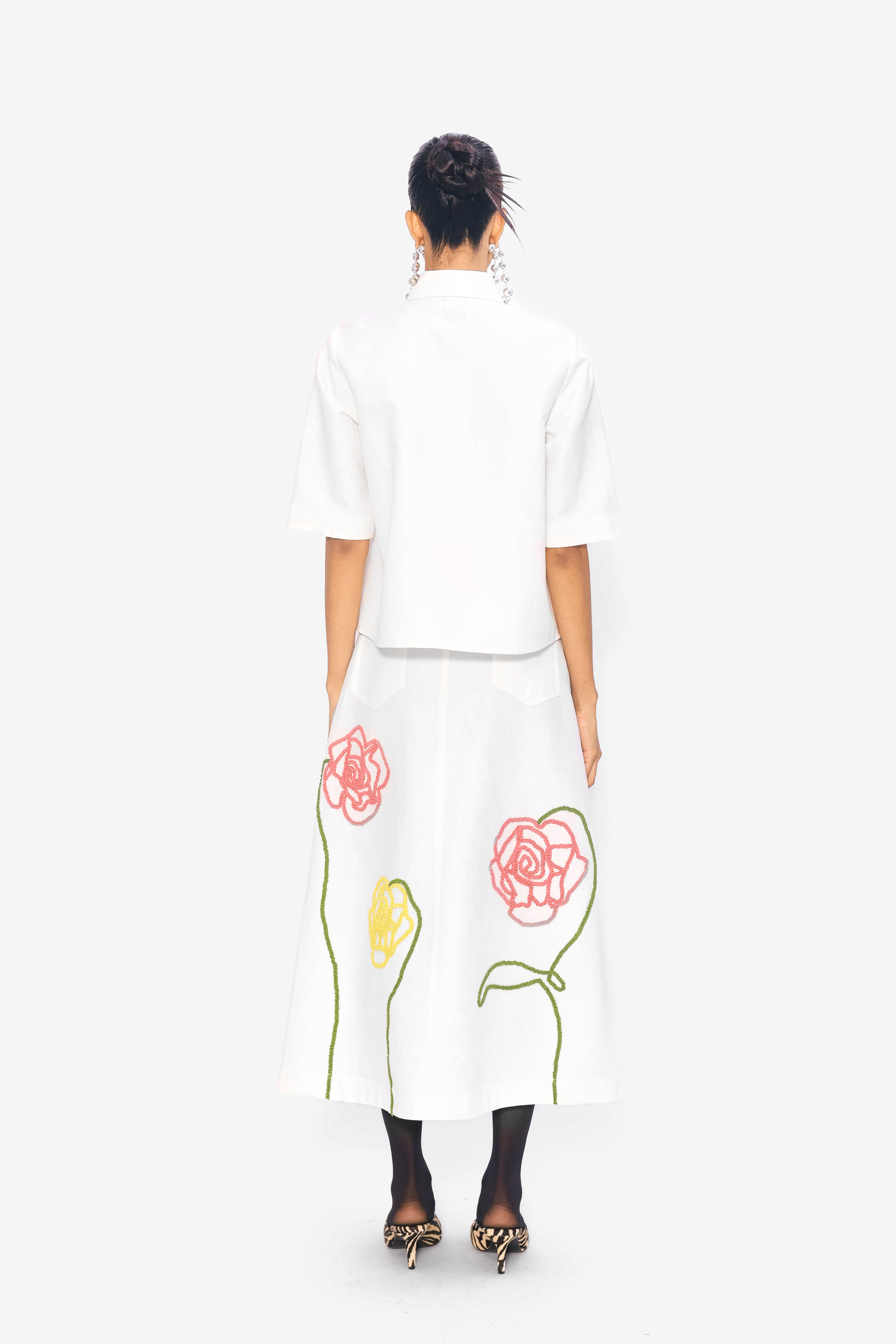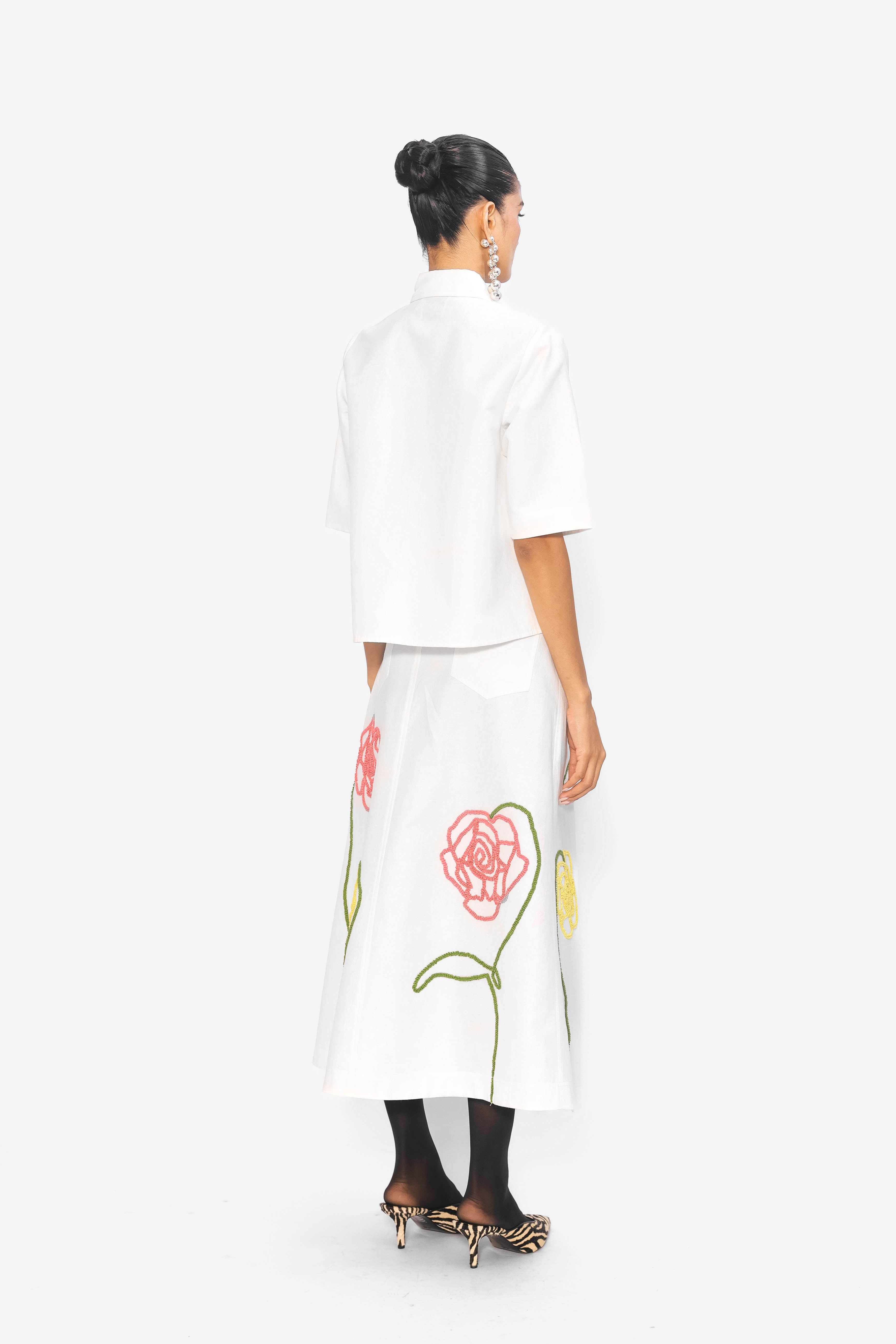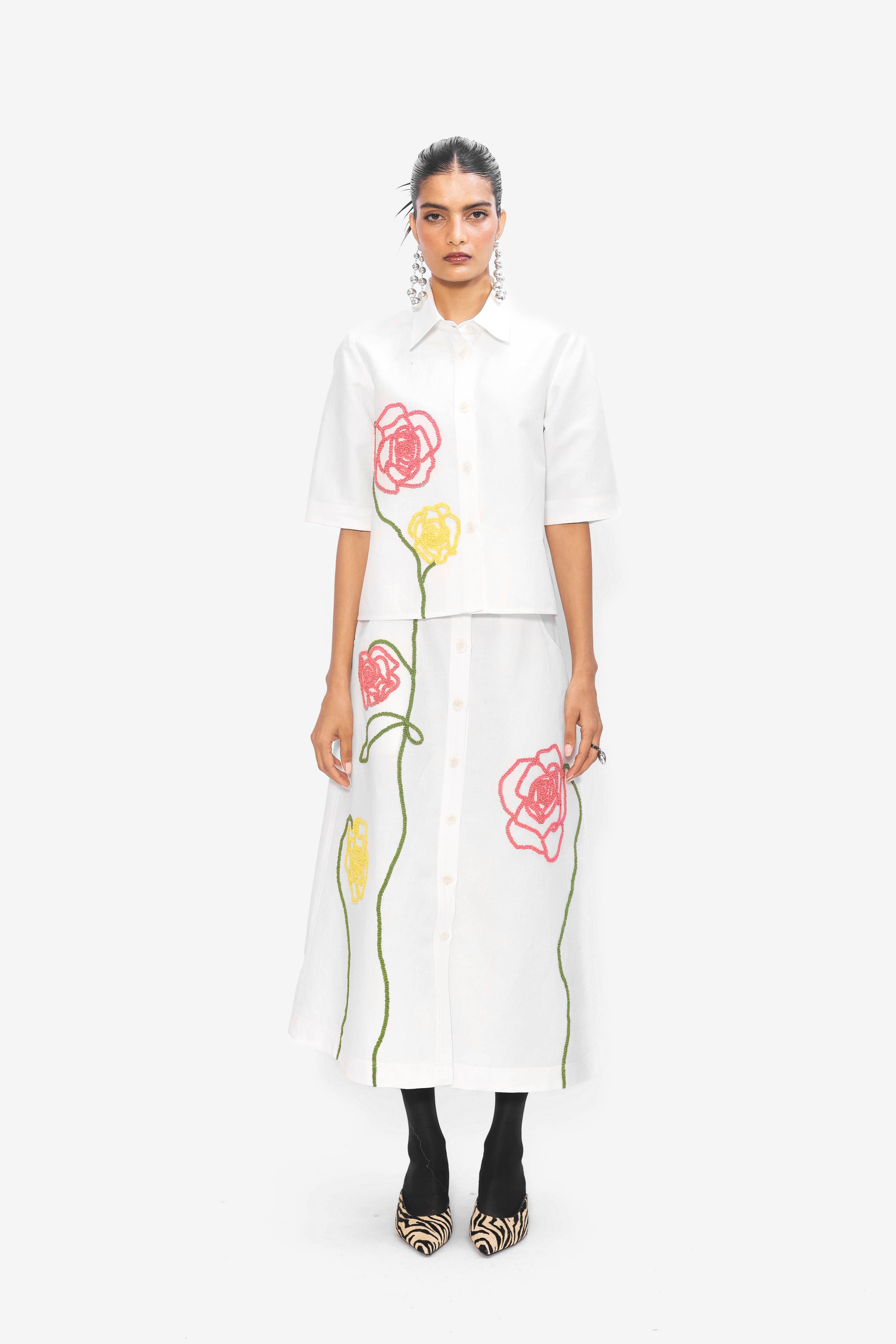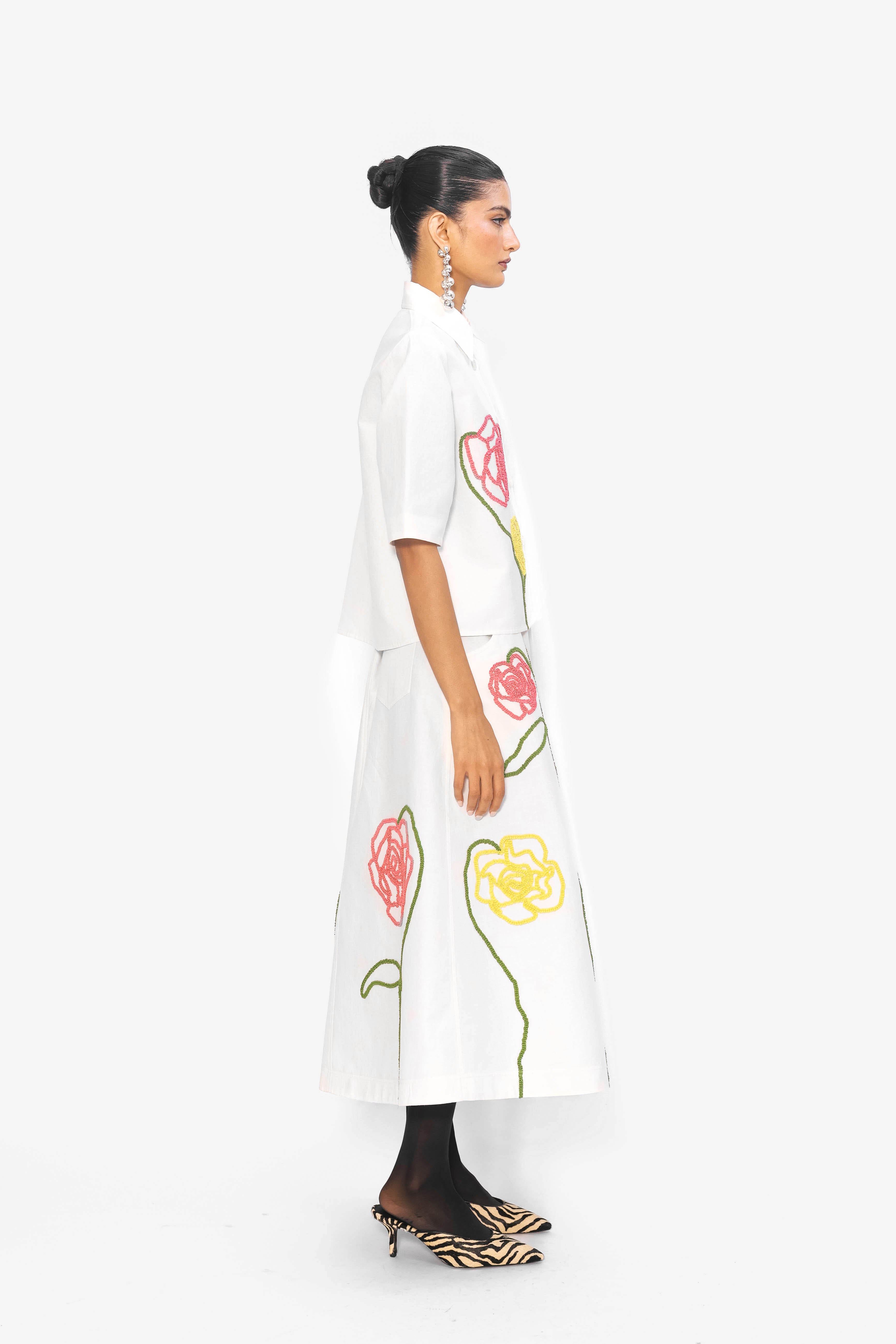 A relaxed boxy short-sleeve shirt featuring intricate hand-embroidered floral motifs in multicolor. Crafted to balance comfort with artisanal detail, it adds a vibrant, elevated touch to everyday dressing.