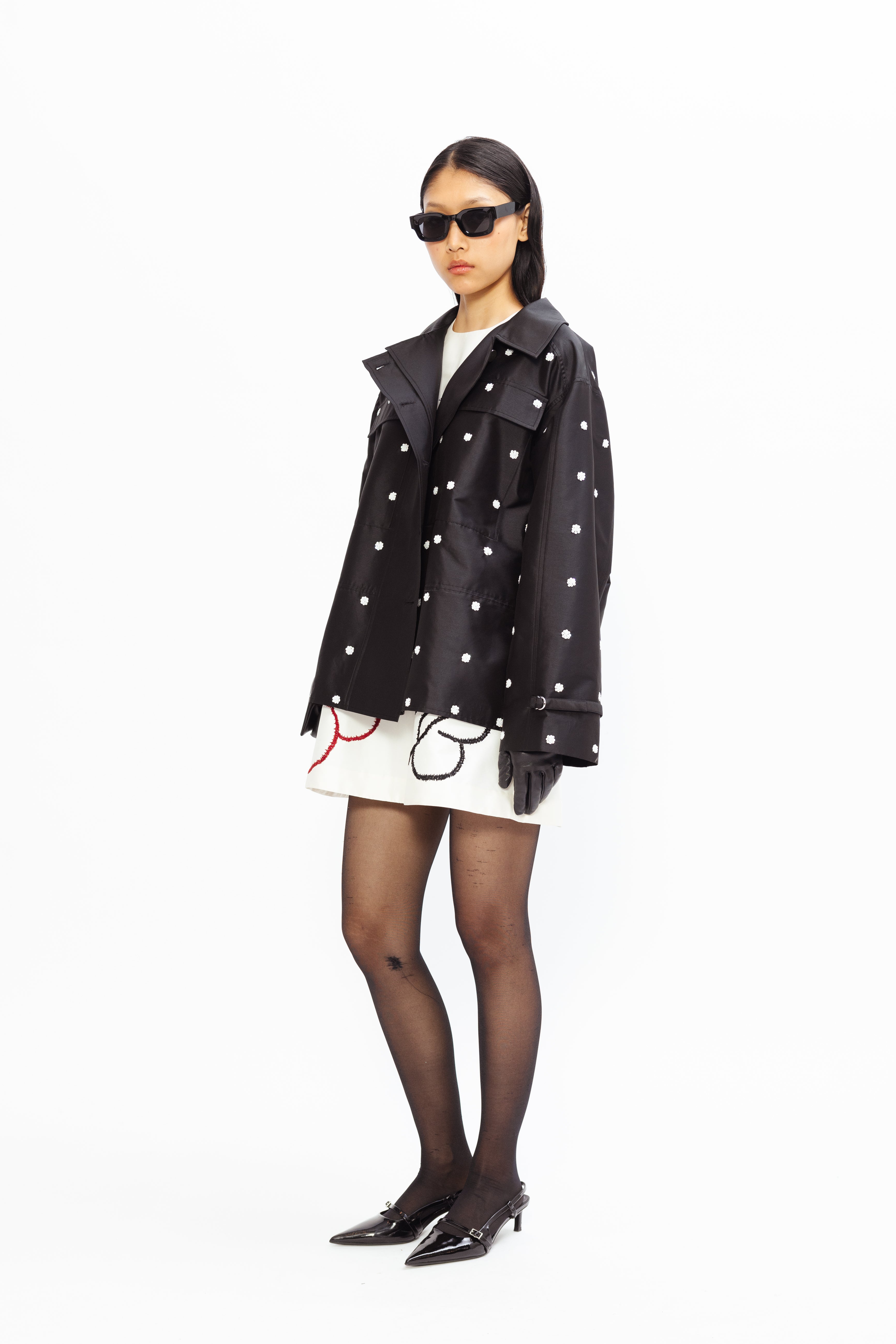 A chic and structured short trench jacket featuring intricate embroidery, a distinctive double-collar detail, and a belted waist for a flattering fit. Perfect for layering in style.