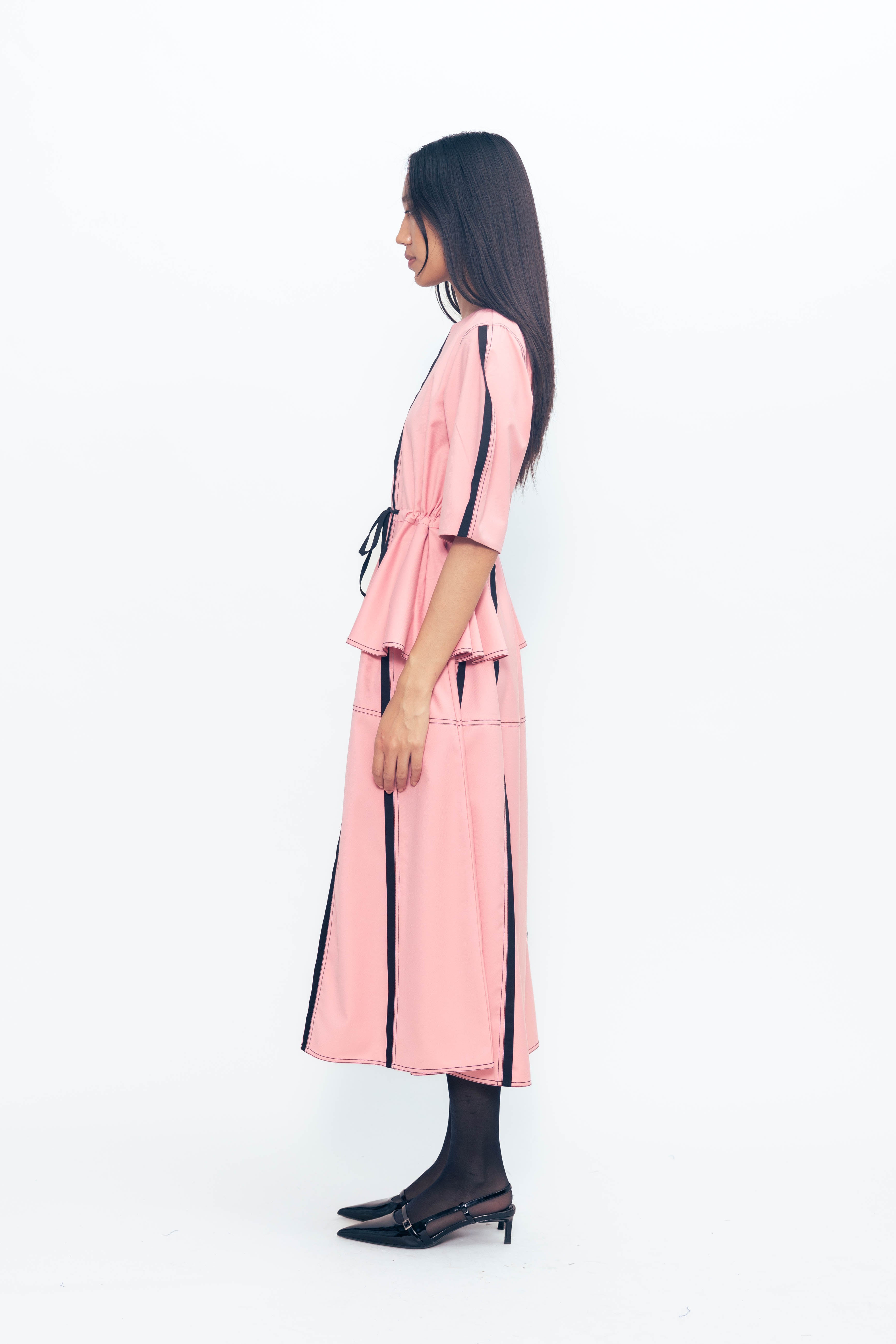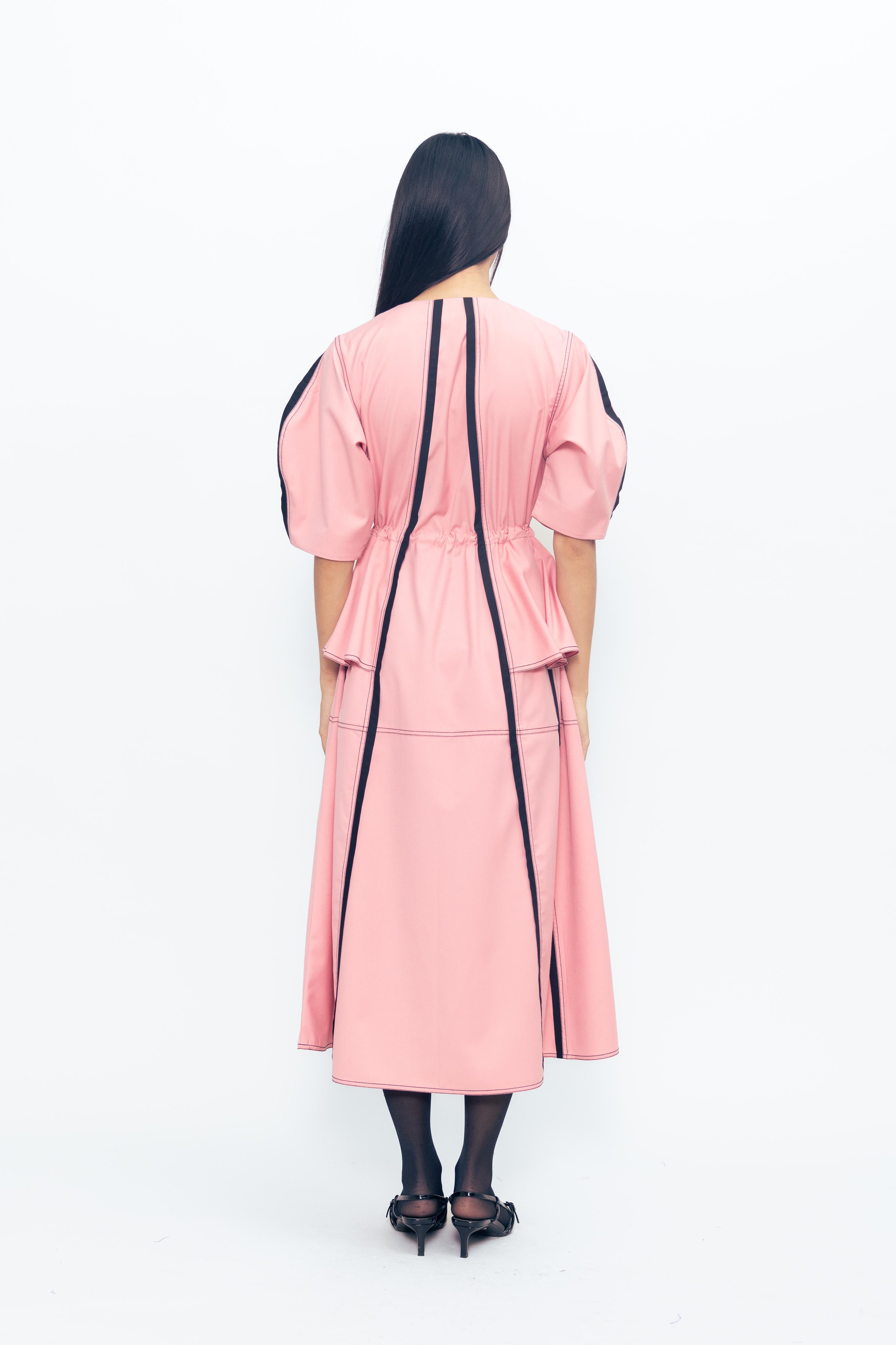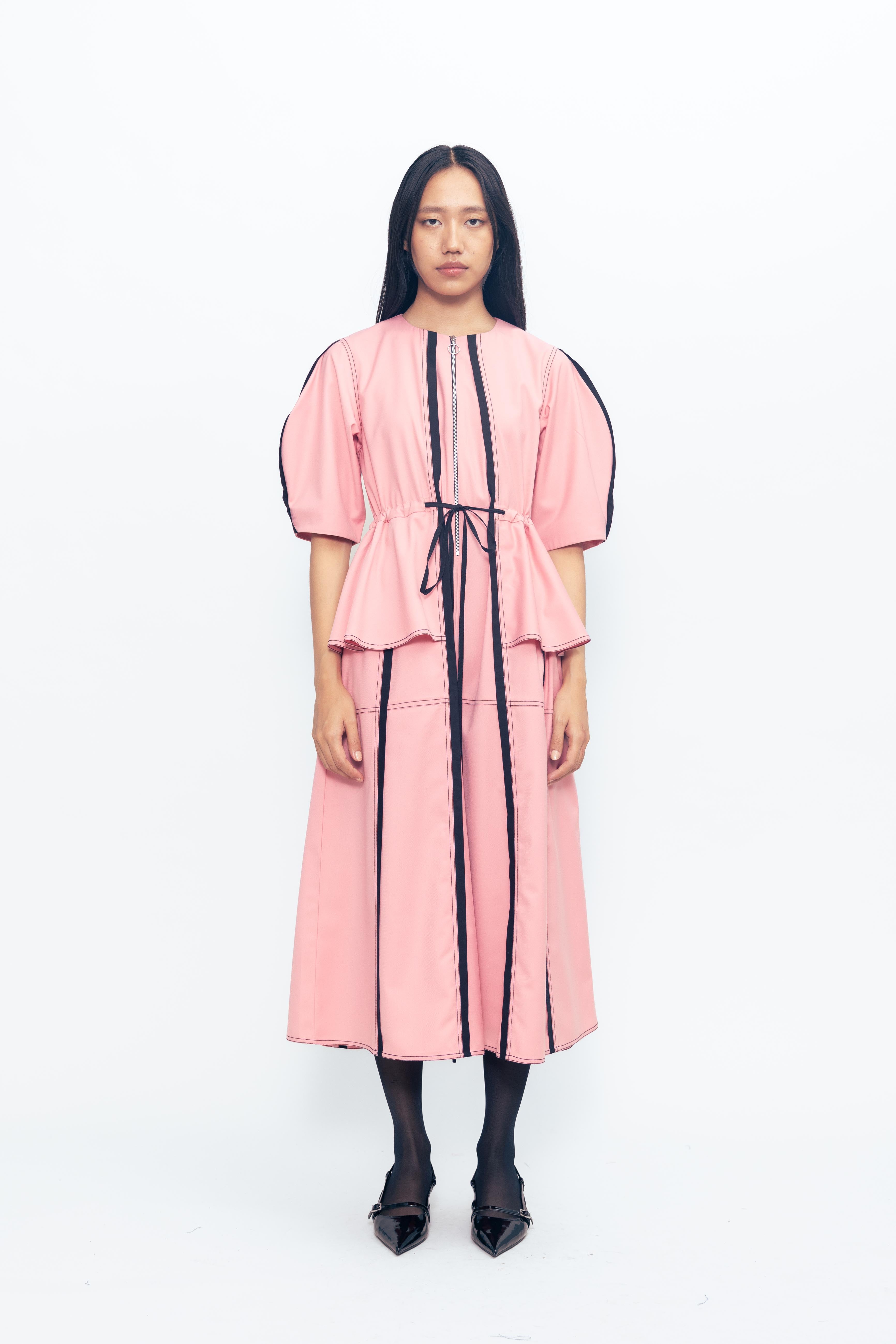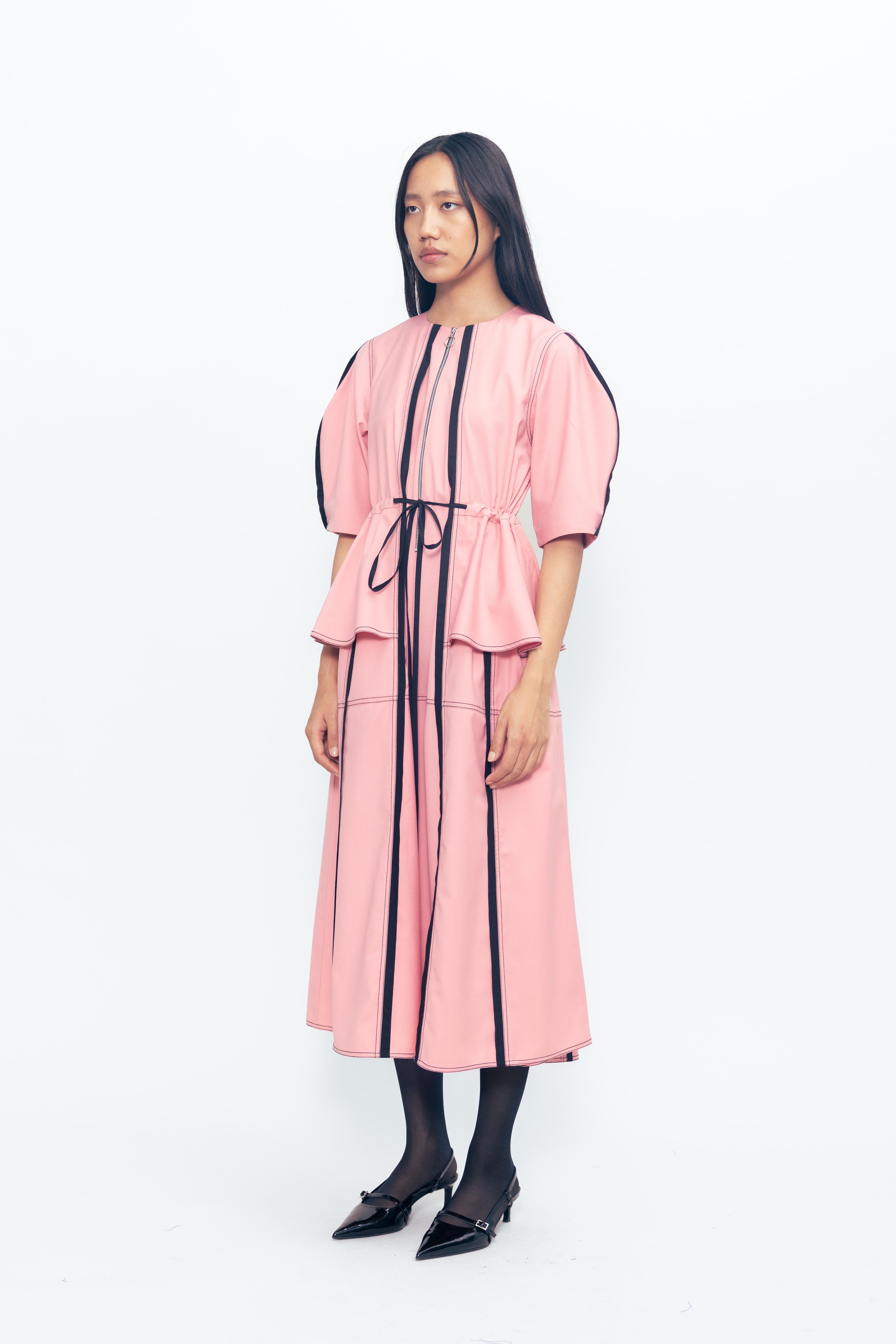 This dress reimagines classic volume with a modern edge through its dramatic leg o' mutton sleeves and clean, structured silhouette. The drawstring detailing allows for subtle shaping, adding versatility to the form. With its smooth drape and bold contrast palette, it strikes a balance between statement-making and effortlessly wearable—ideal for day-to-night transitions with a twist