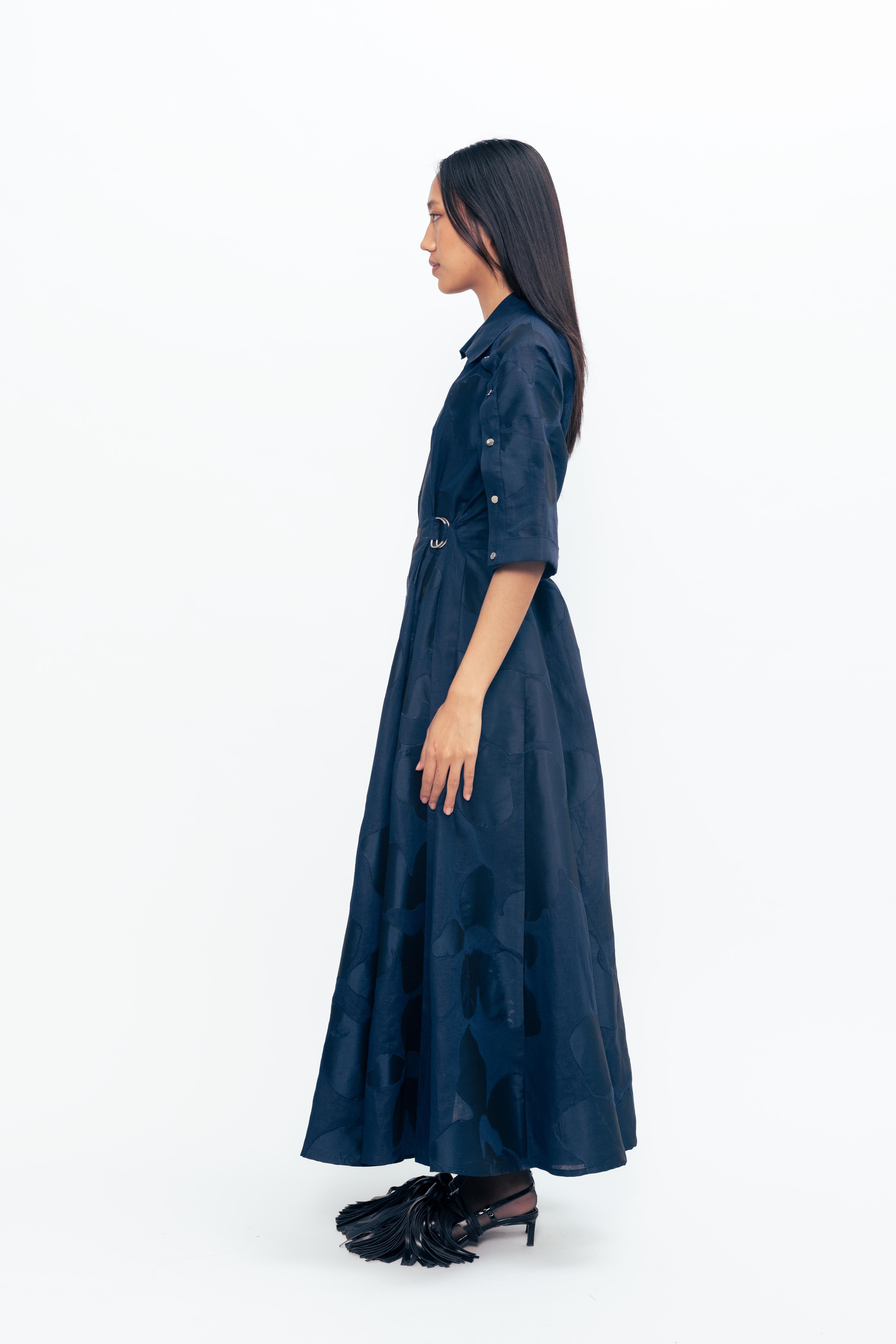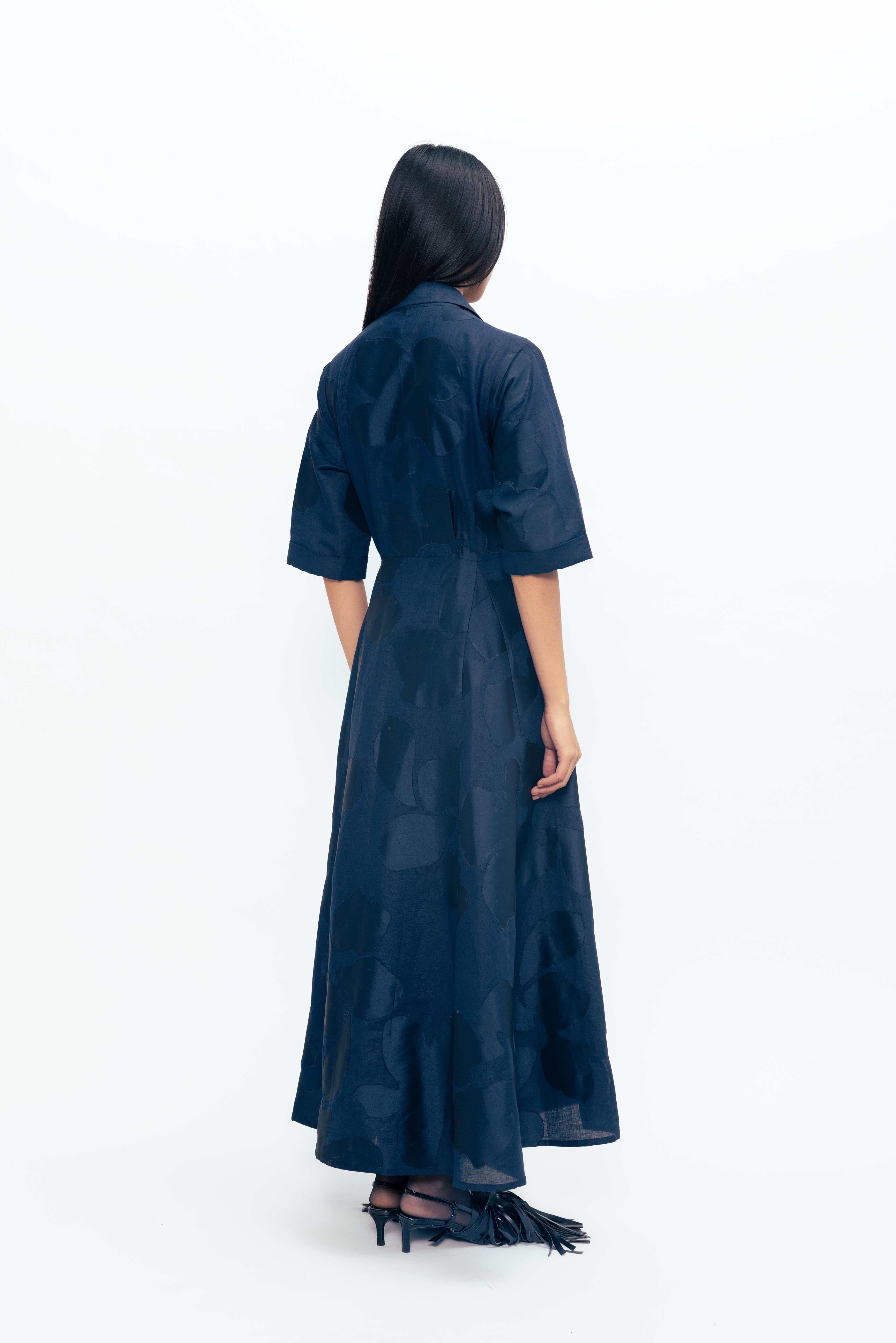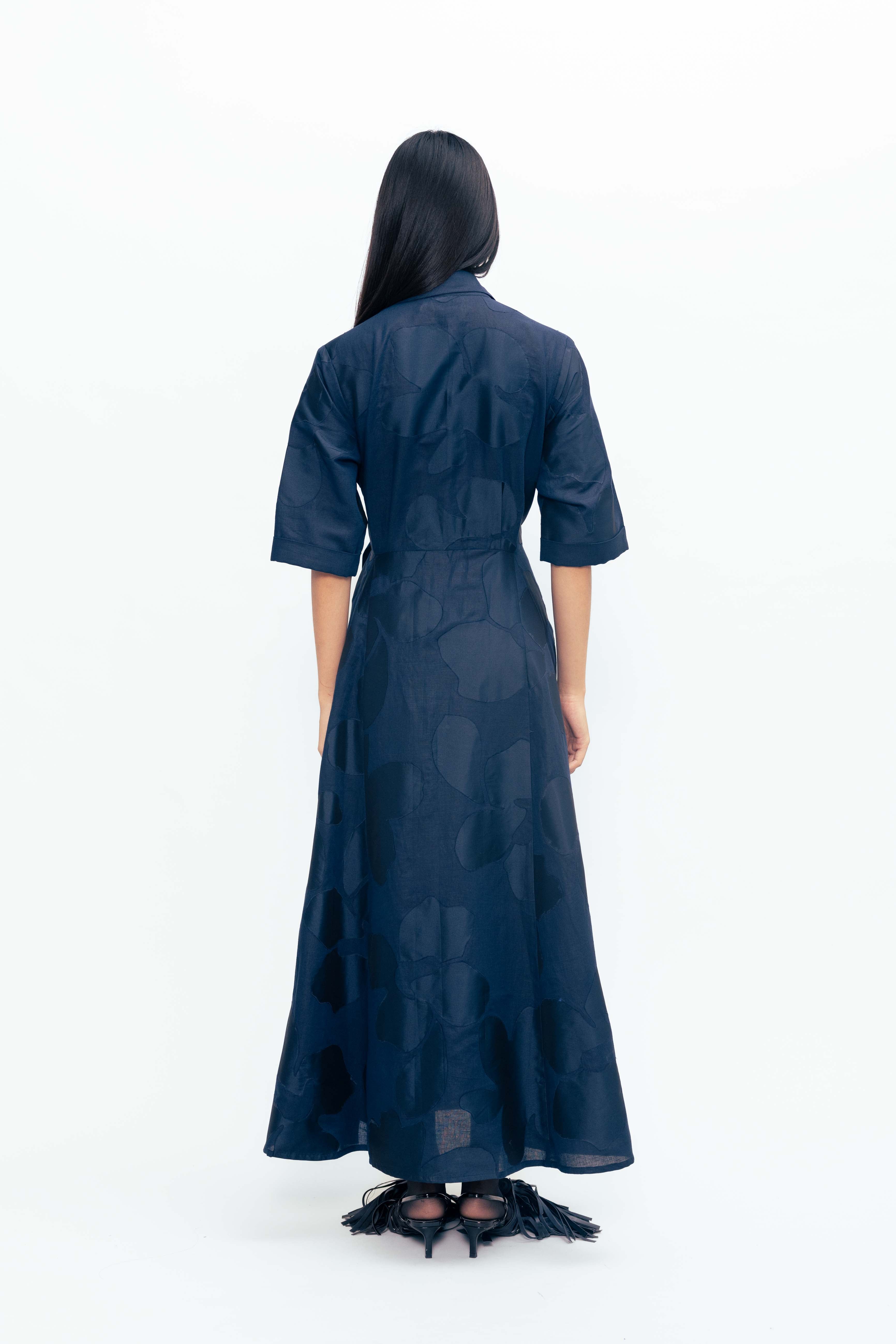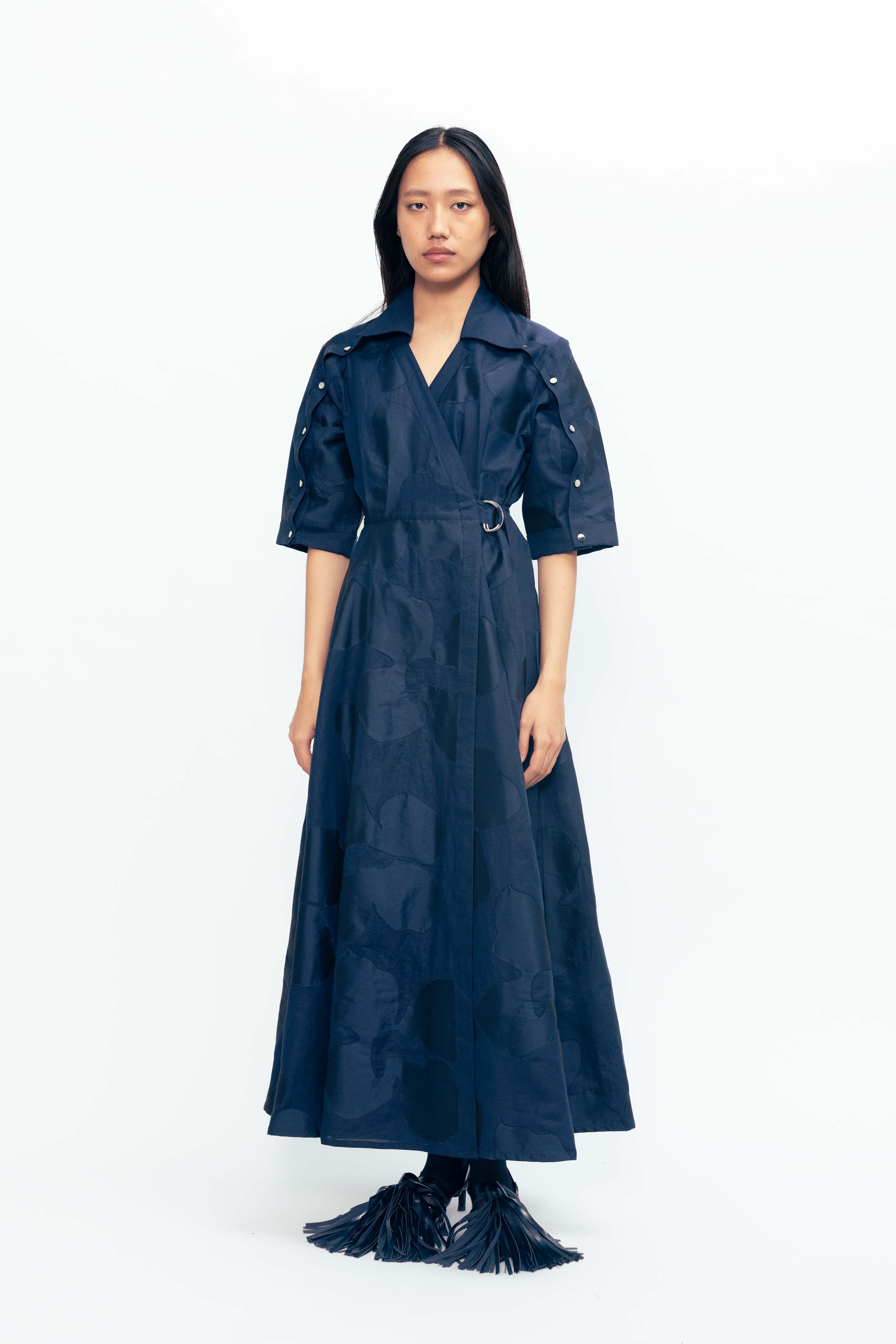Defined by contrast and movement, this piece brings structure and softness into quiet conversation. Appliqued panels shift in tone and texture, creating a subtle rhythm across the surface. Slit sleeves open with intention, adding ease and fluidity to a form that holds its shape with clarity. Balanced and expressive, it’s a piece that moves between light and depth with understated confidence.