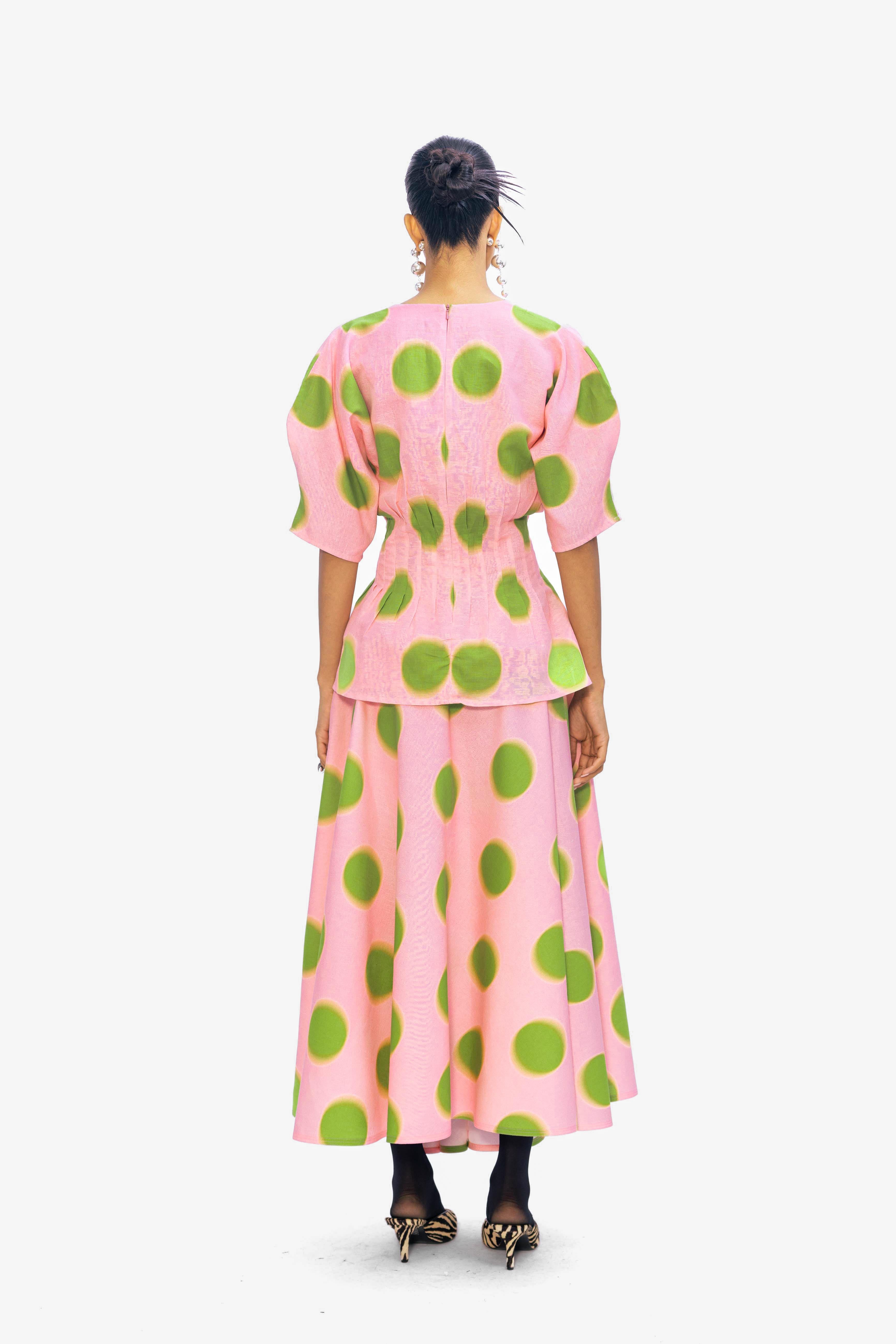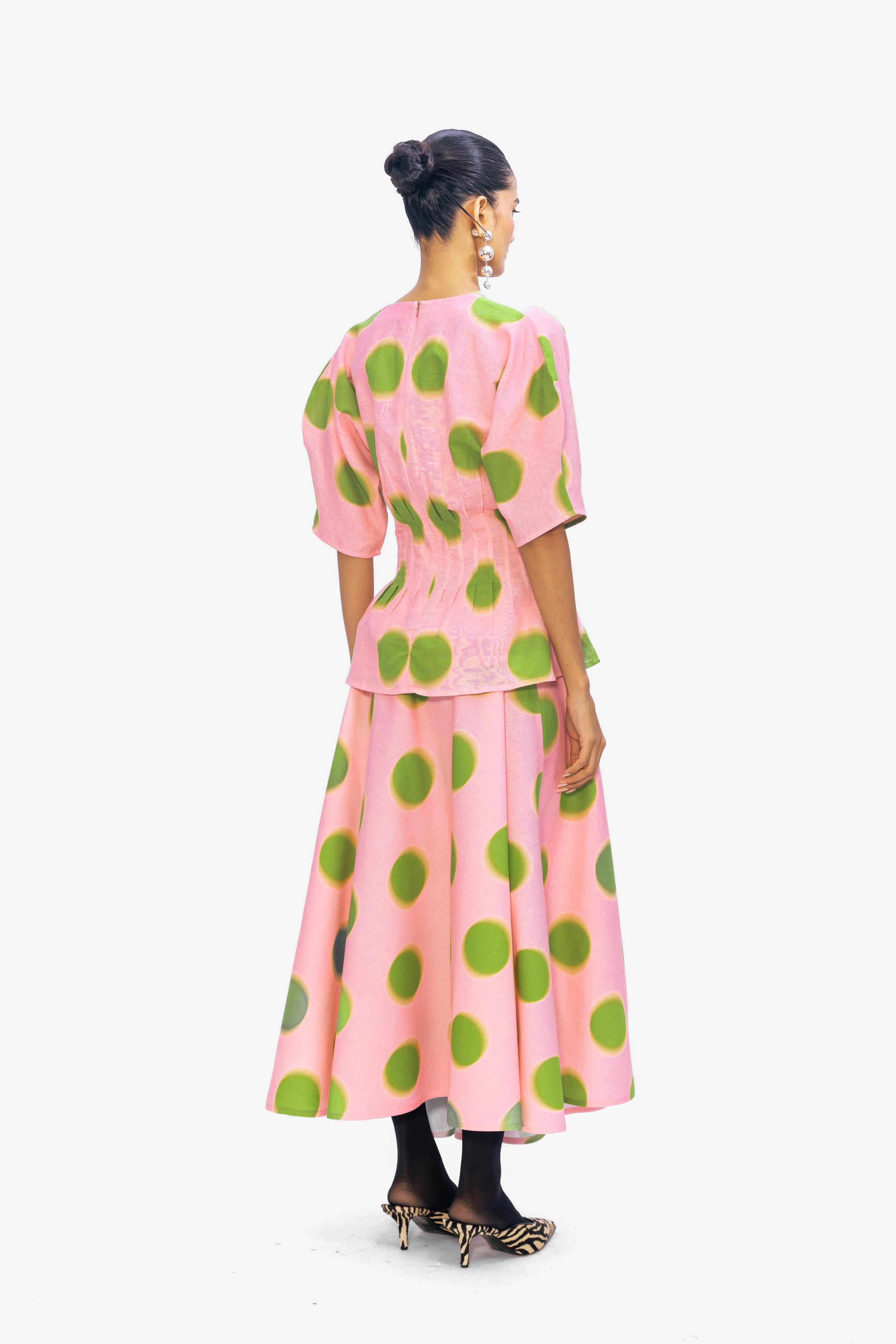 A pink A-line midi skirt adorned with oversized green polka dots, featuring a flattering silhouette for a playful yet polished, summer-ready look.