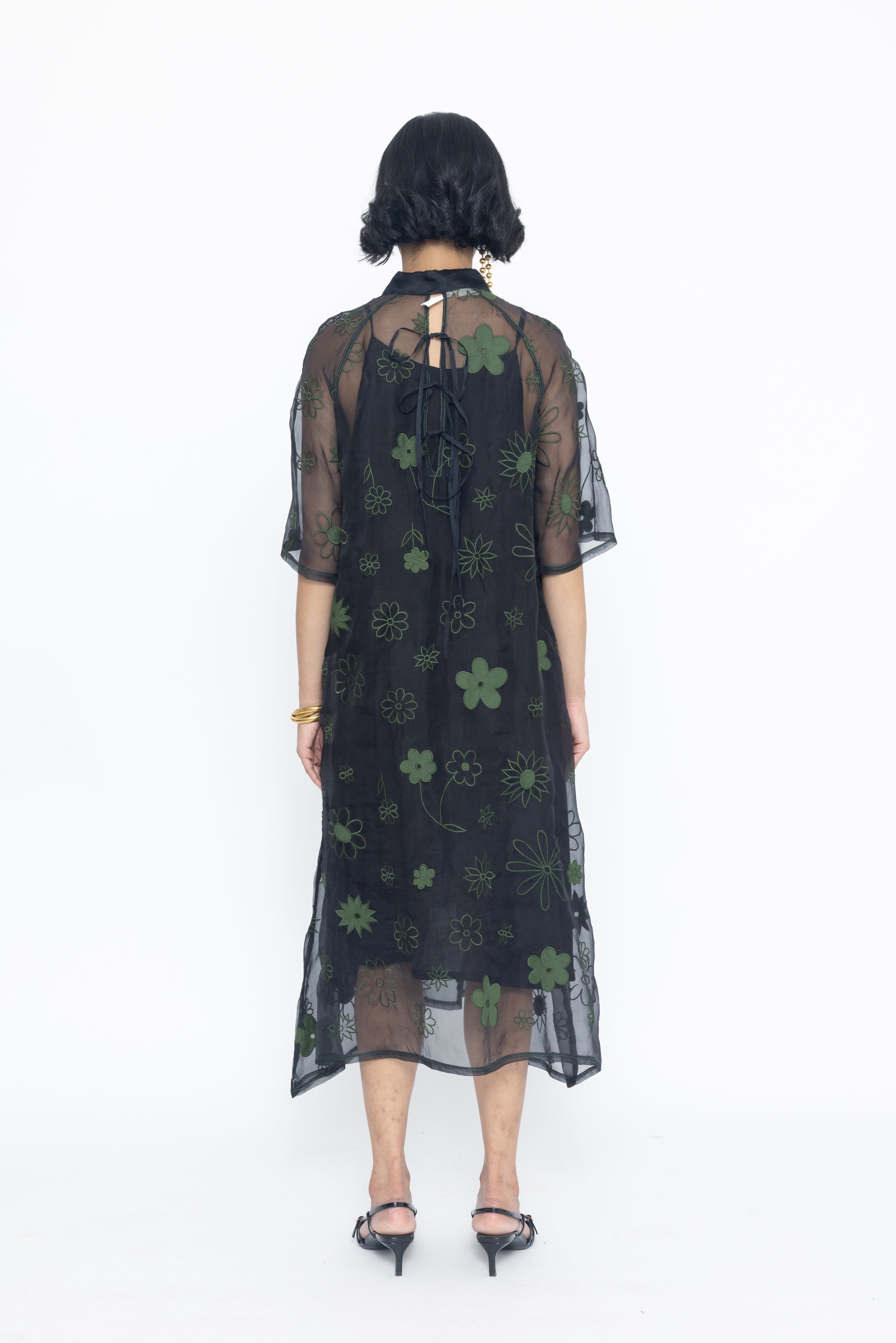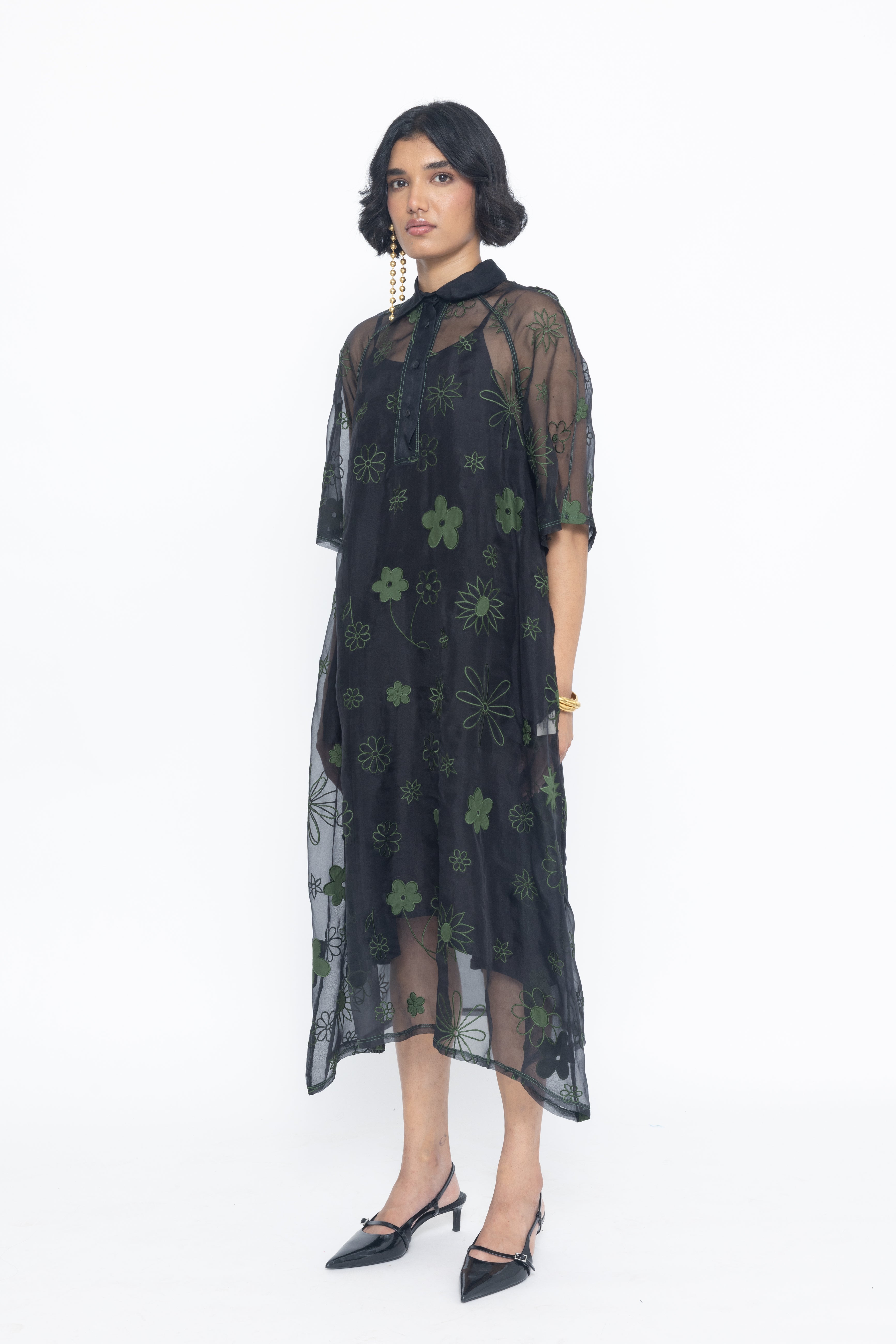 Half placket organza dress with floral embroidery and contrast top stitch. comes with cotton slip.