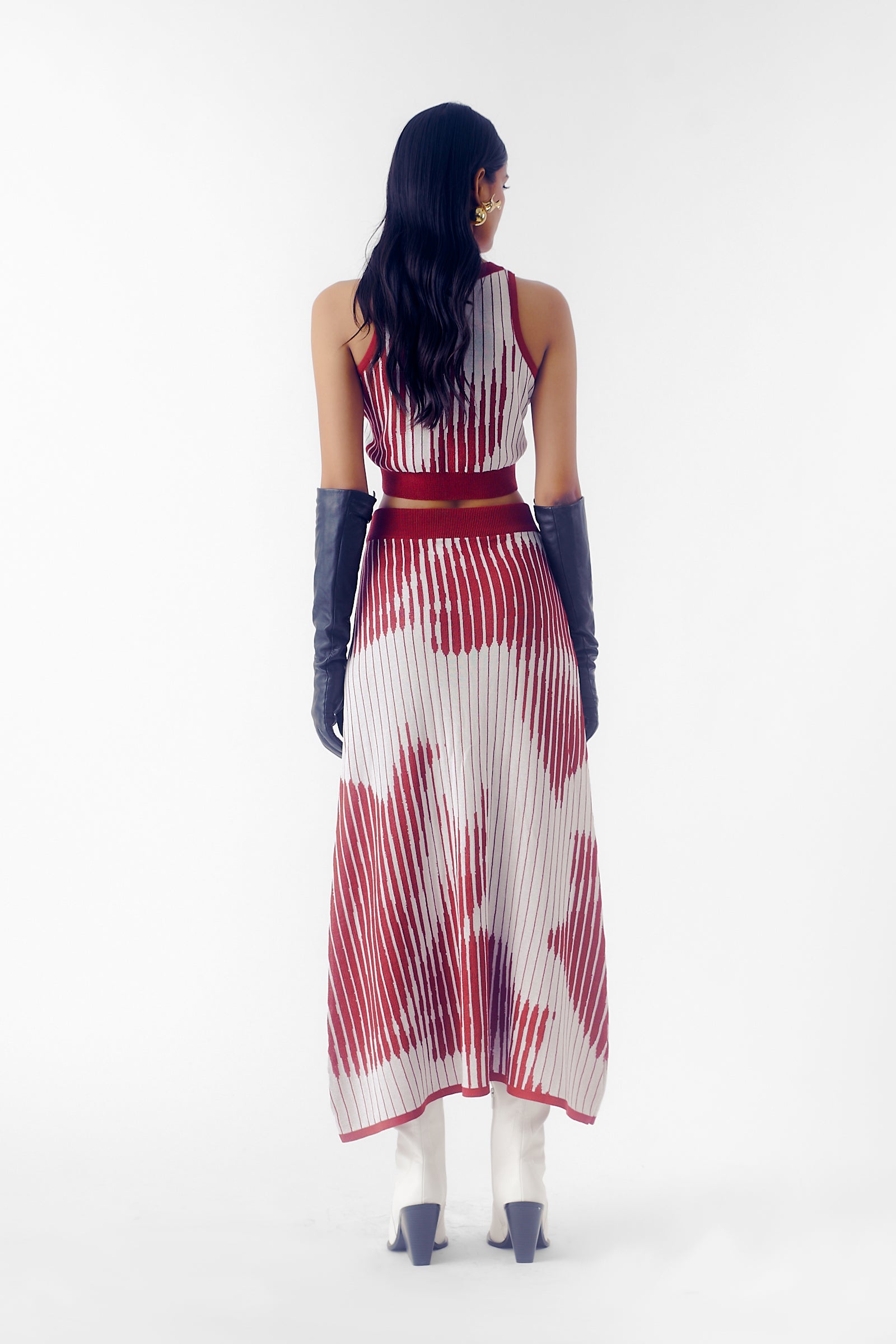 This sleeveless knit crop top with a front placket typically has a short length, exposing the midriff, and is crafted from stretchy knit fabric. It features a buttoned or snap closure down the front, offering a stylish and versatile option for warm weather or layering. Paired with a skirt.