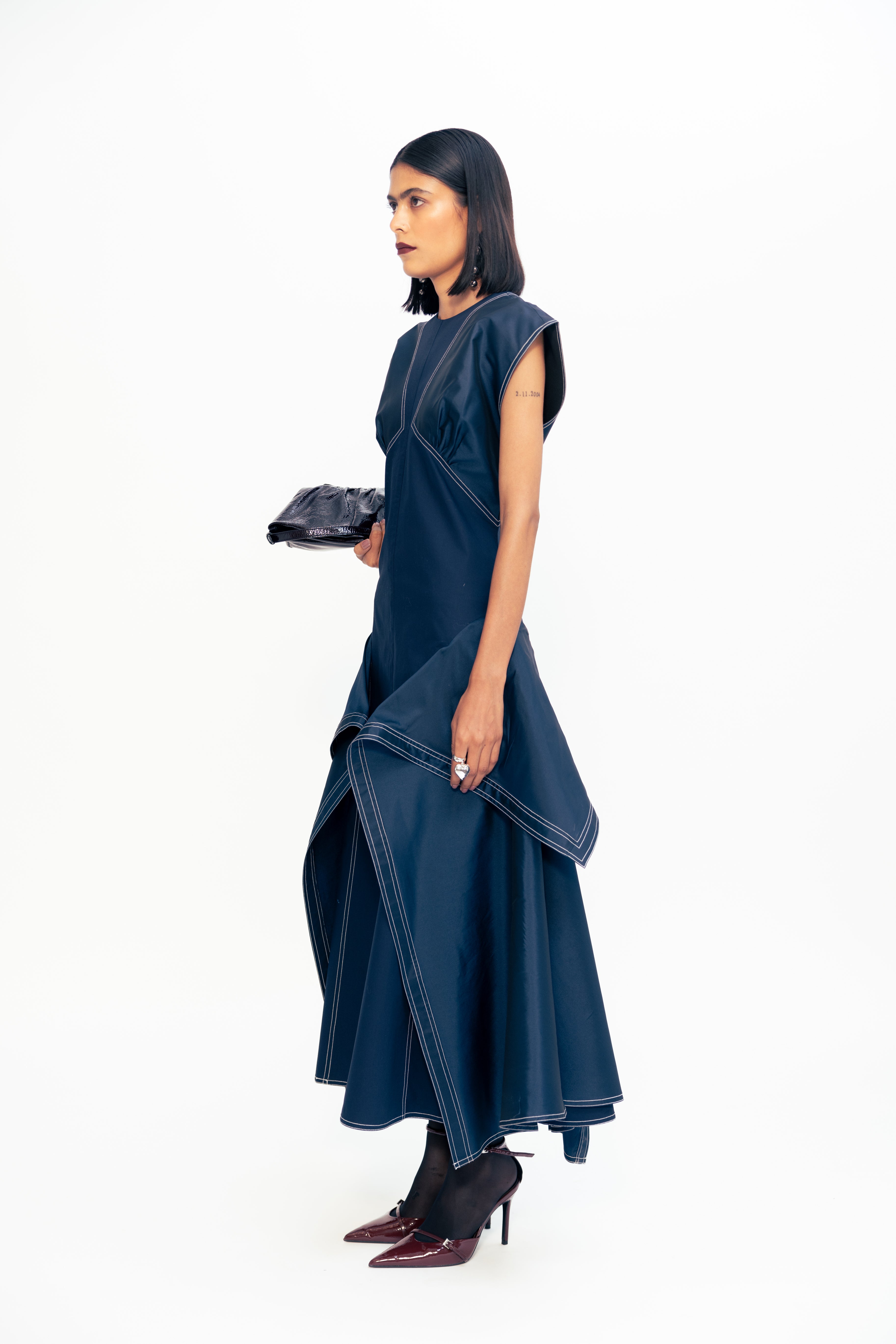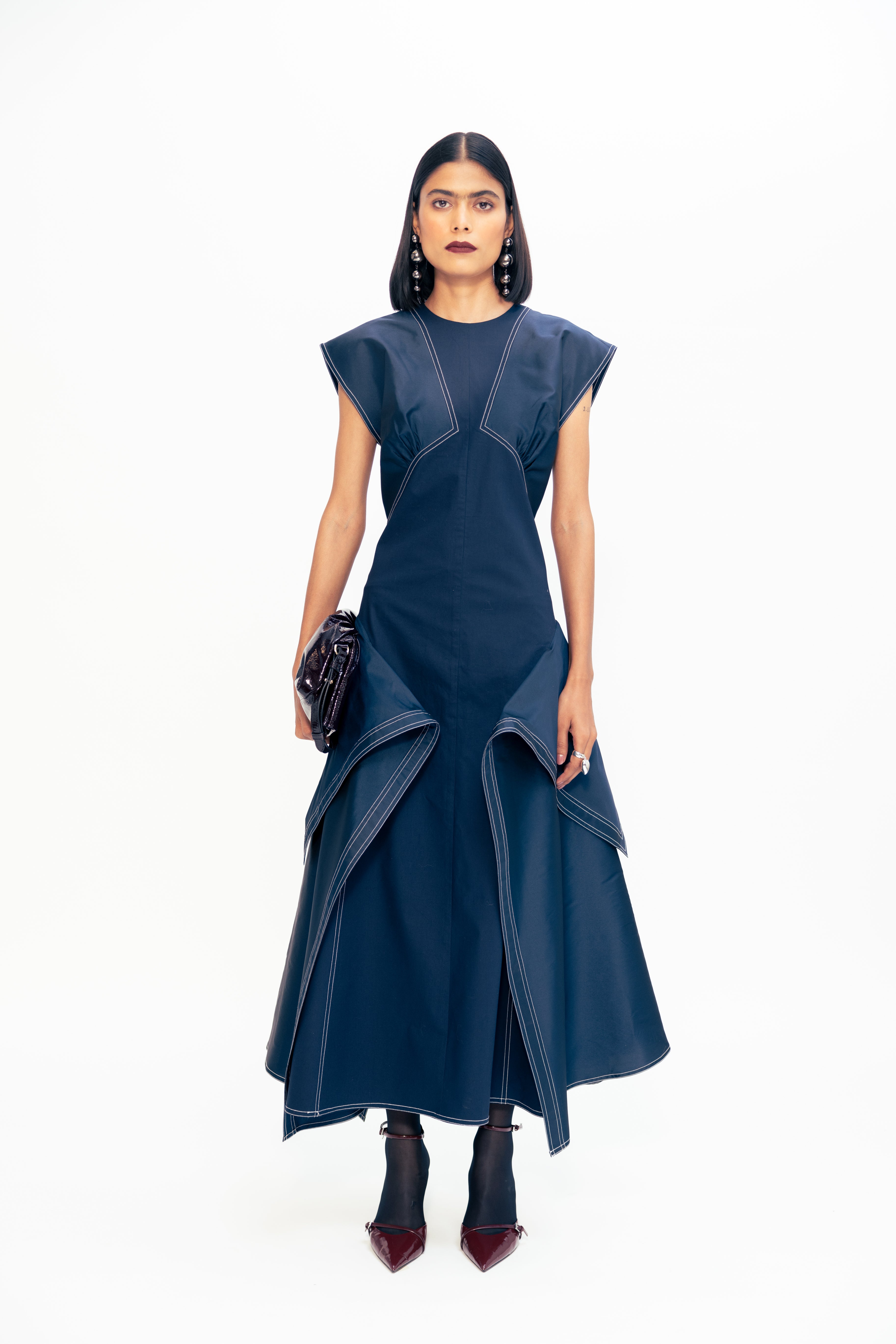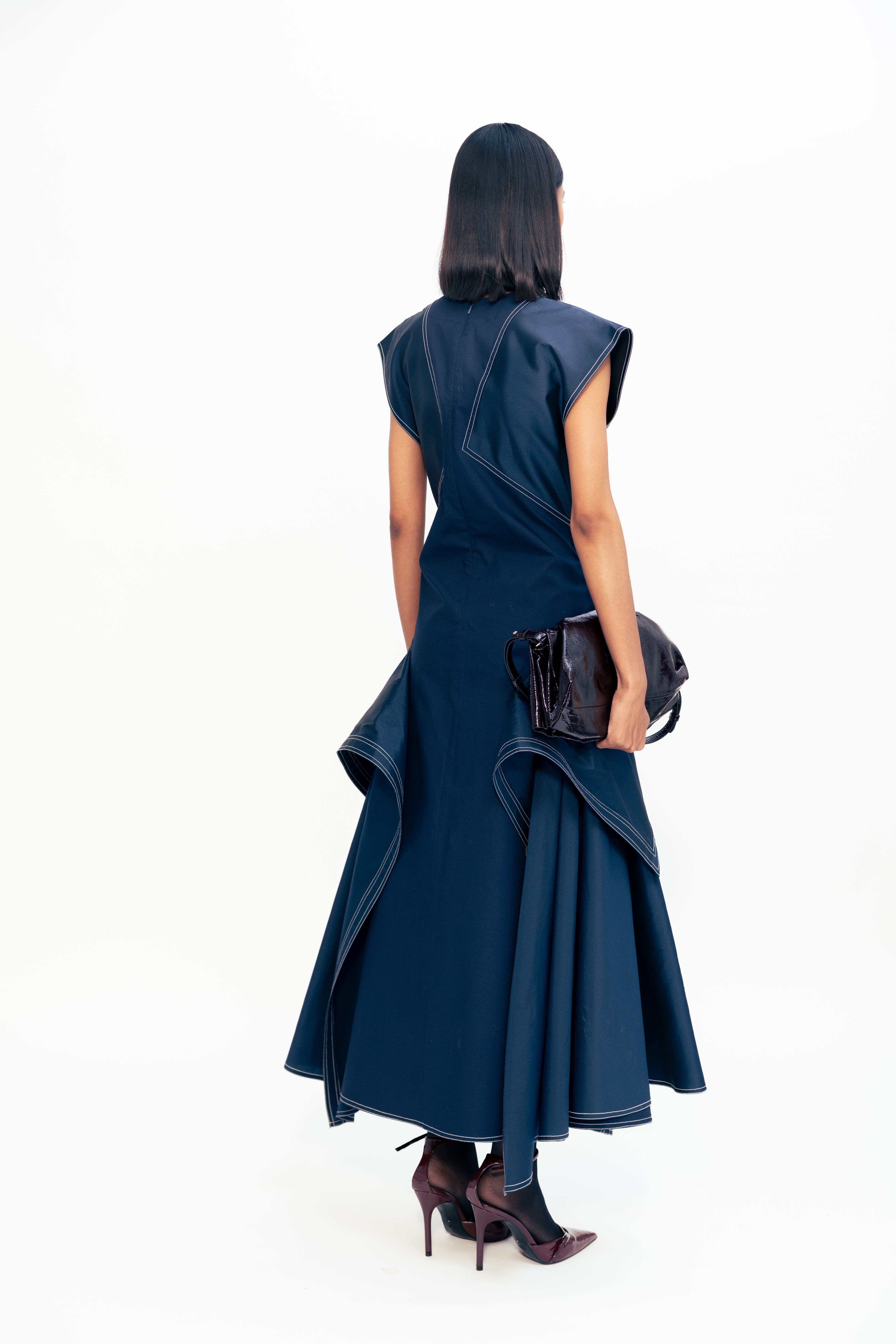 This panelled cascade godet dress showcases graceful movement and architectural detail. Strategically placed panels flow into cascading godets, creating a fluid, flared silhouette with beautiful volume and dimension. Perfect for formal events or elegant evenings, it blends modern structure with timeless femininity.