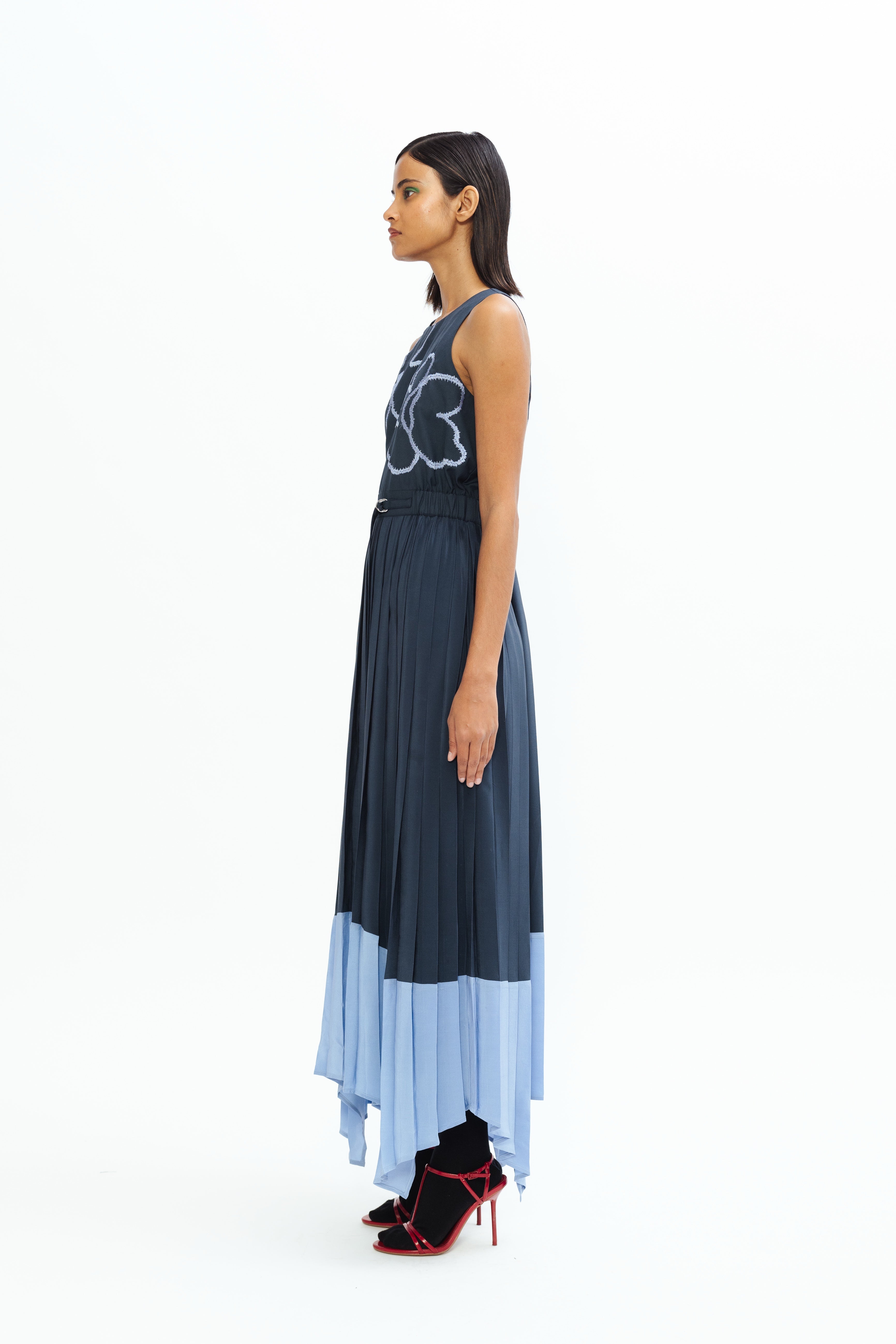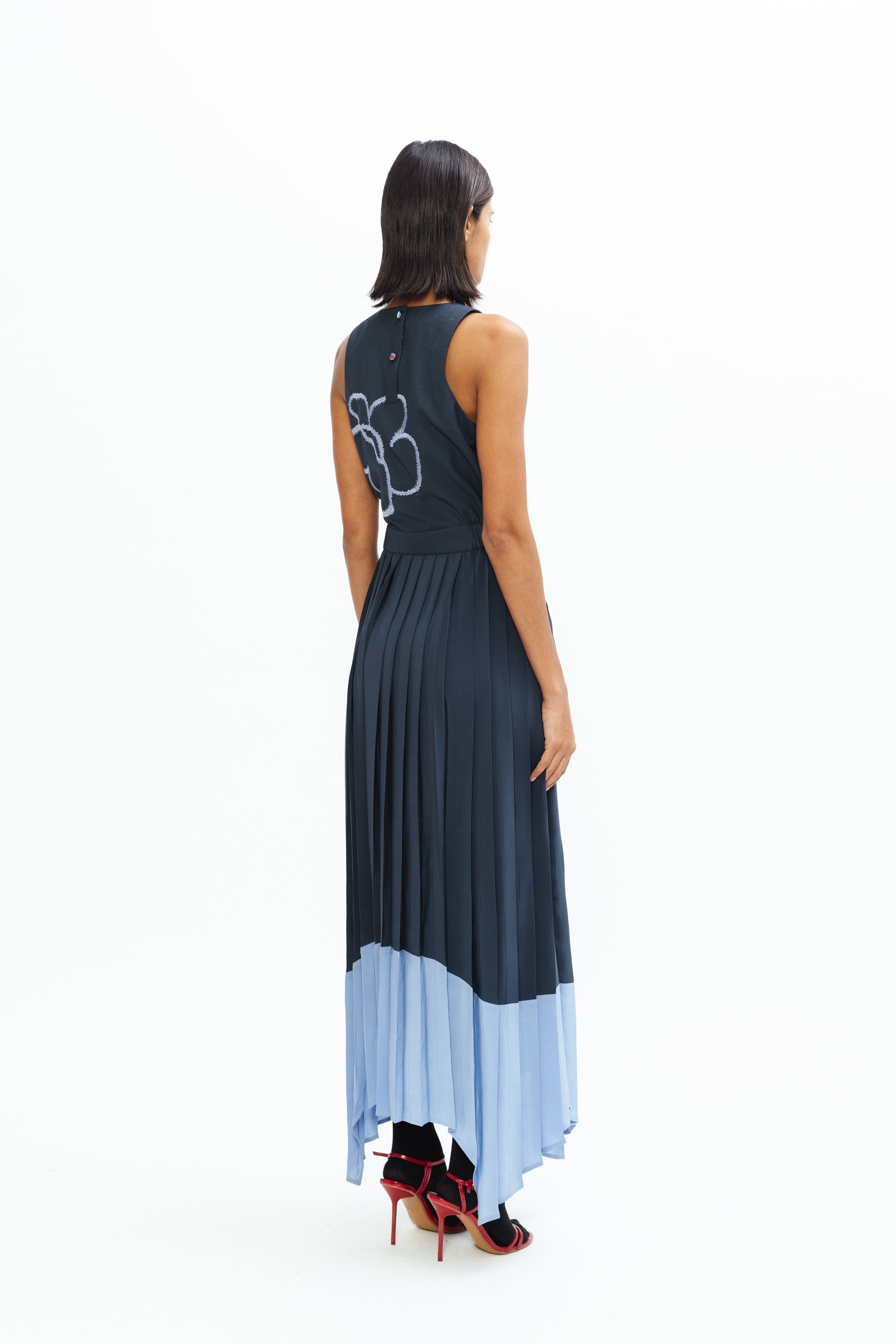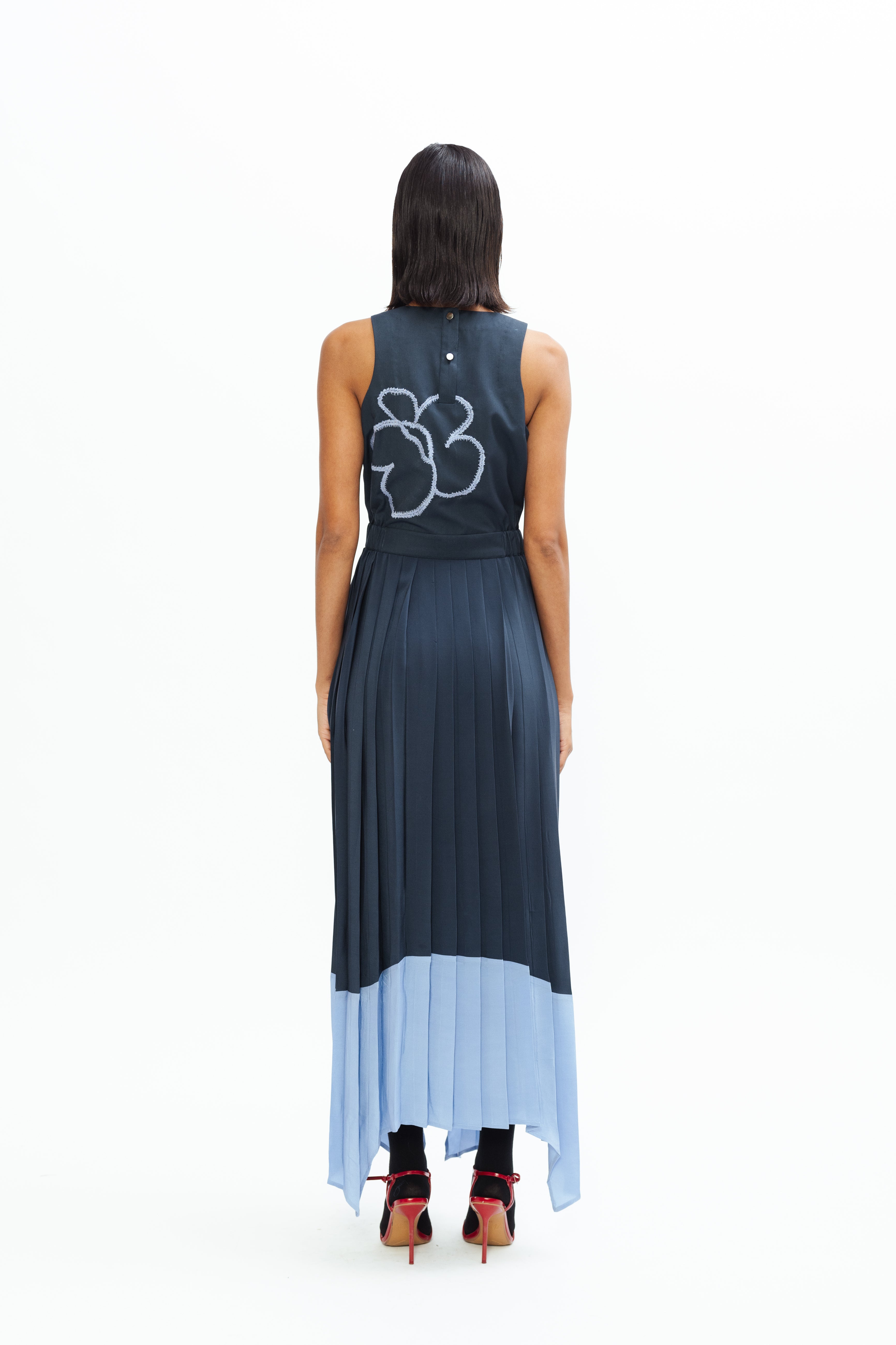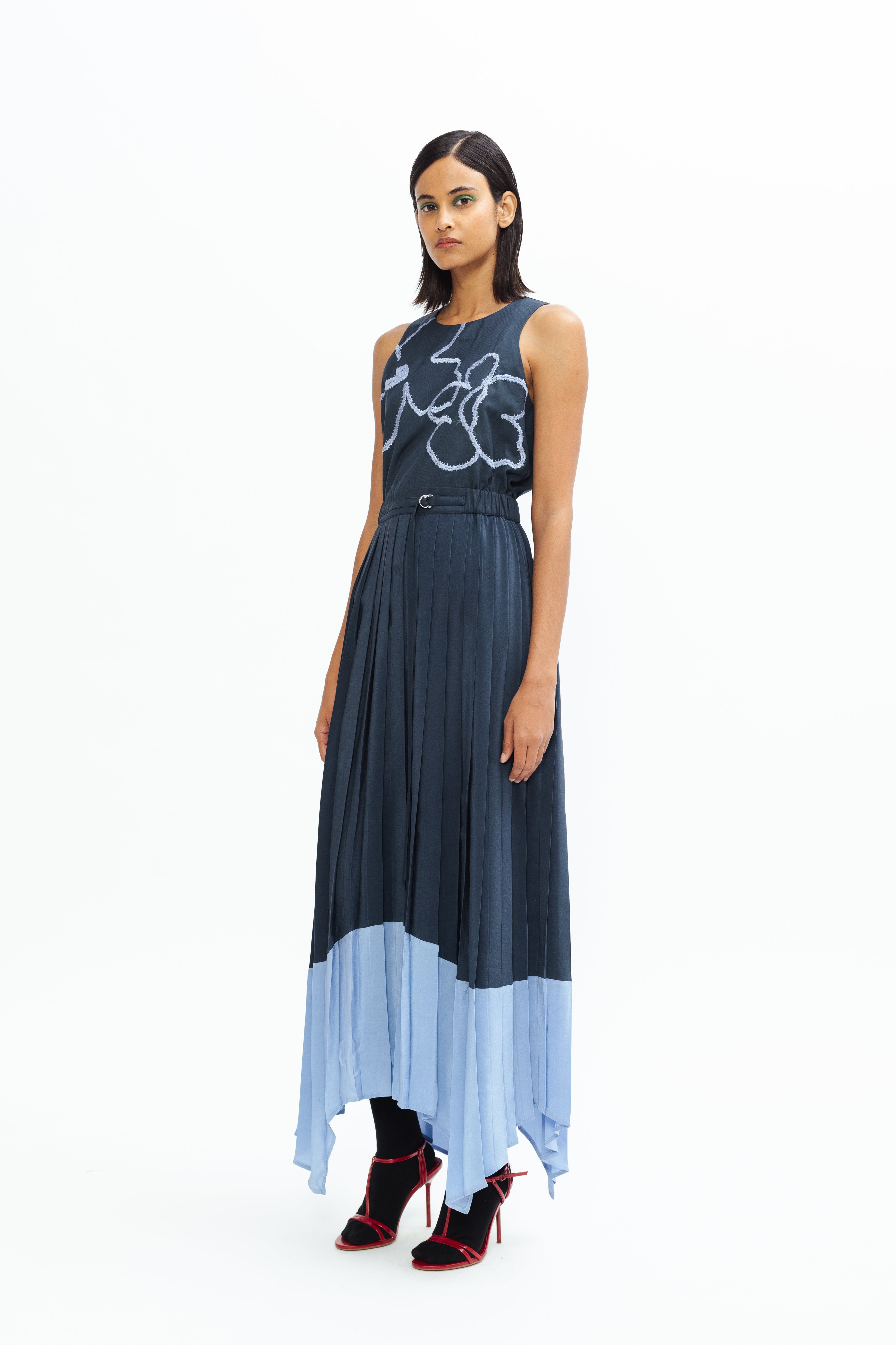 This maxi-length pleated skirt exudes sophistication with its fluid movement and elegant flow. Designed with an asymmetrical hemline, it features a layered gradient effect that transitions beautifully from deep navy to light blue, creating a refined and contemporary color-blocked statement.