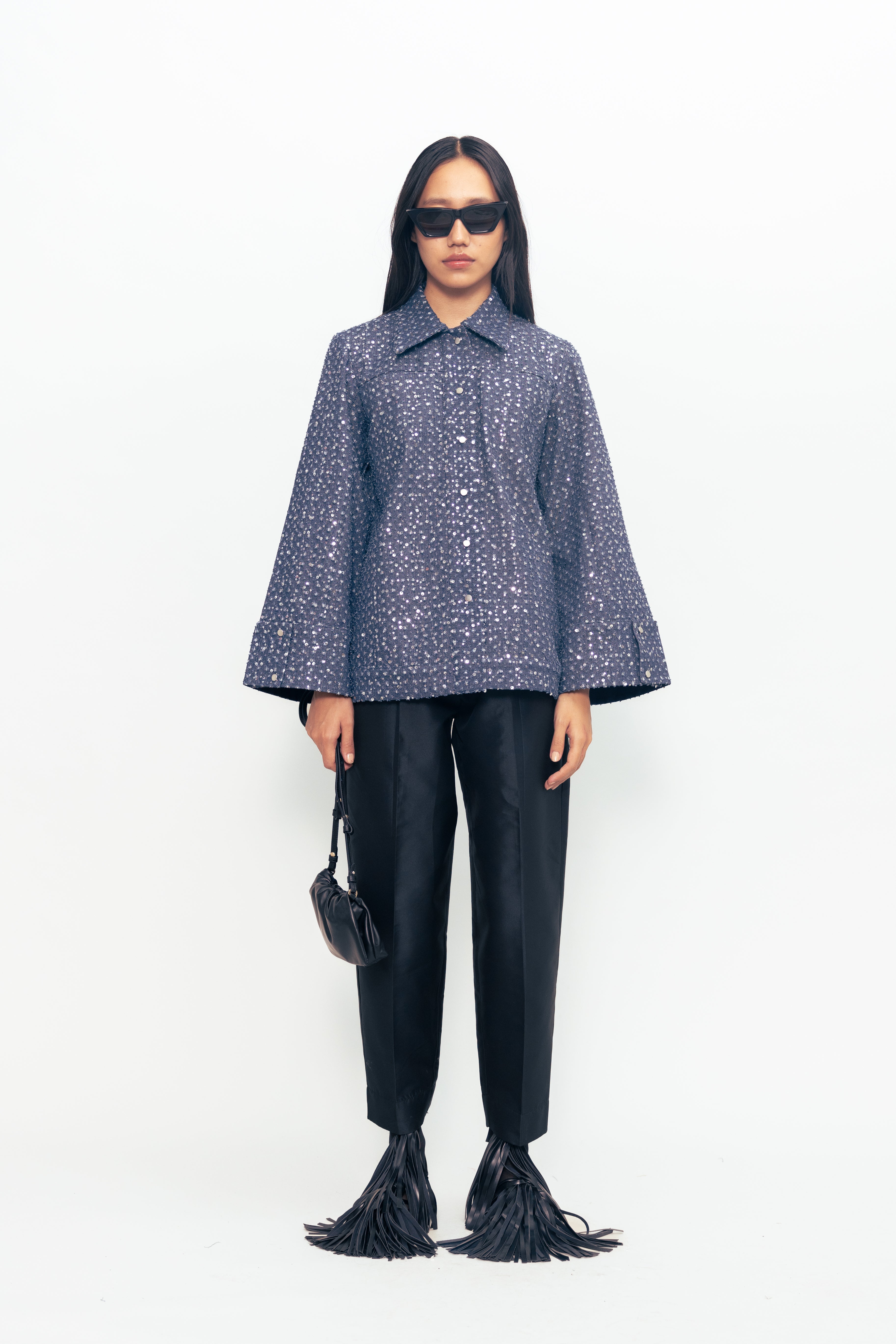 This piece reimagines classic denim with a refined touch of shine. Subtle sequins are scattered across its surface, catching light without overwhelming the look. The oversized sleeves bring volume and ease, giving it a bold yet wearable silhouette. A clean grey-blue tone grounds the piece, keeping it versatile for both casual and statement moments.