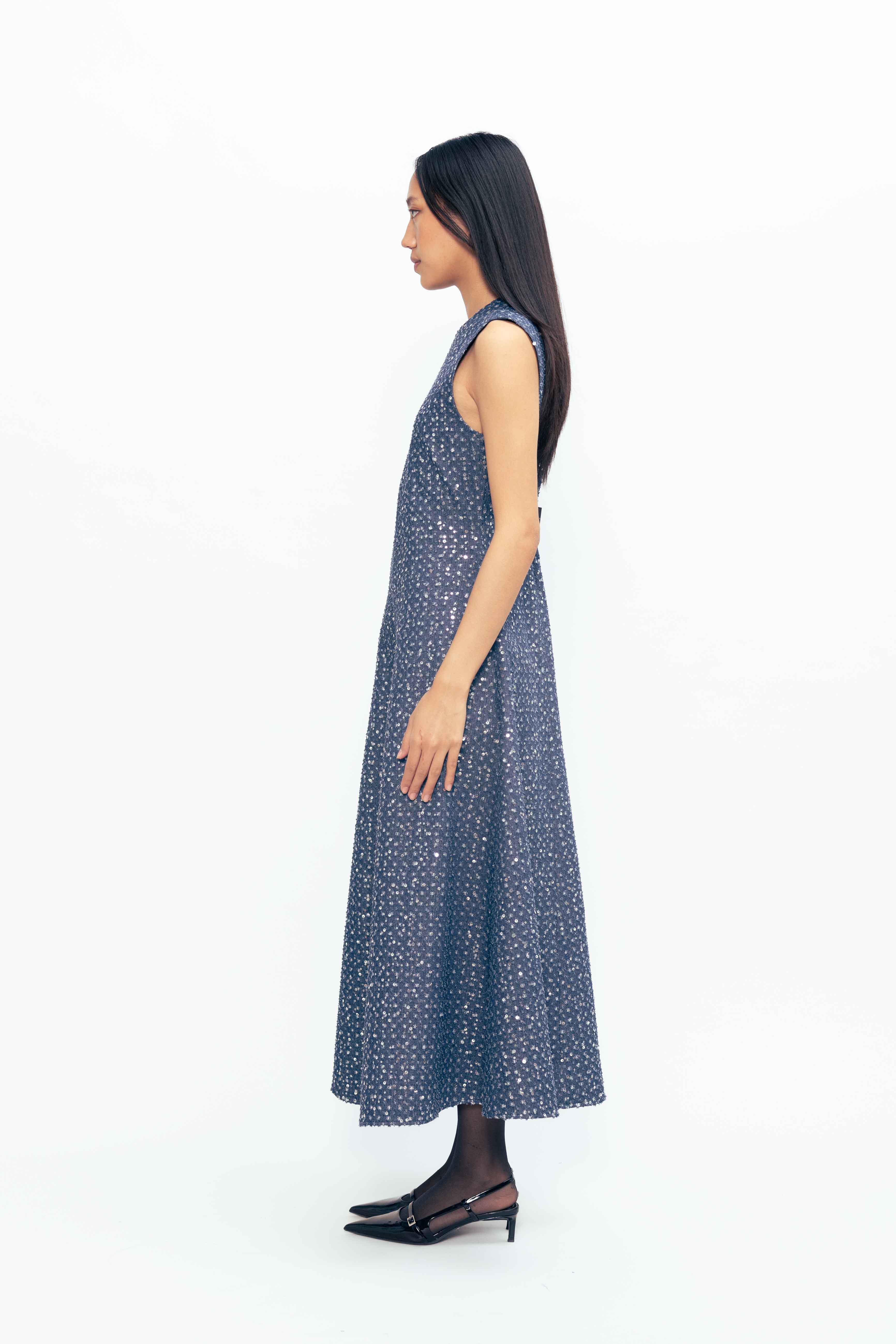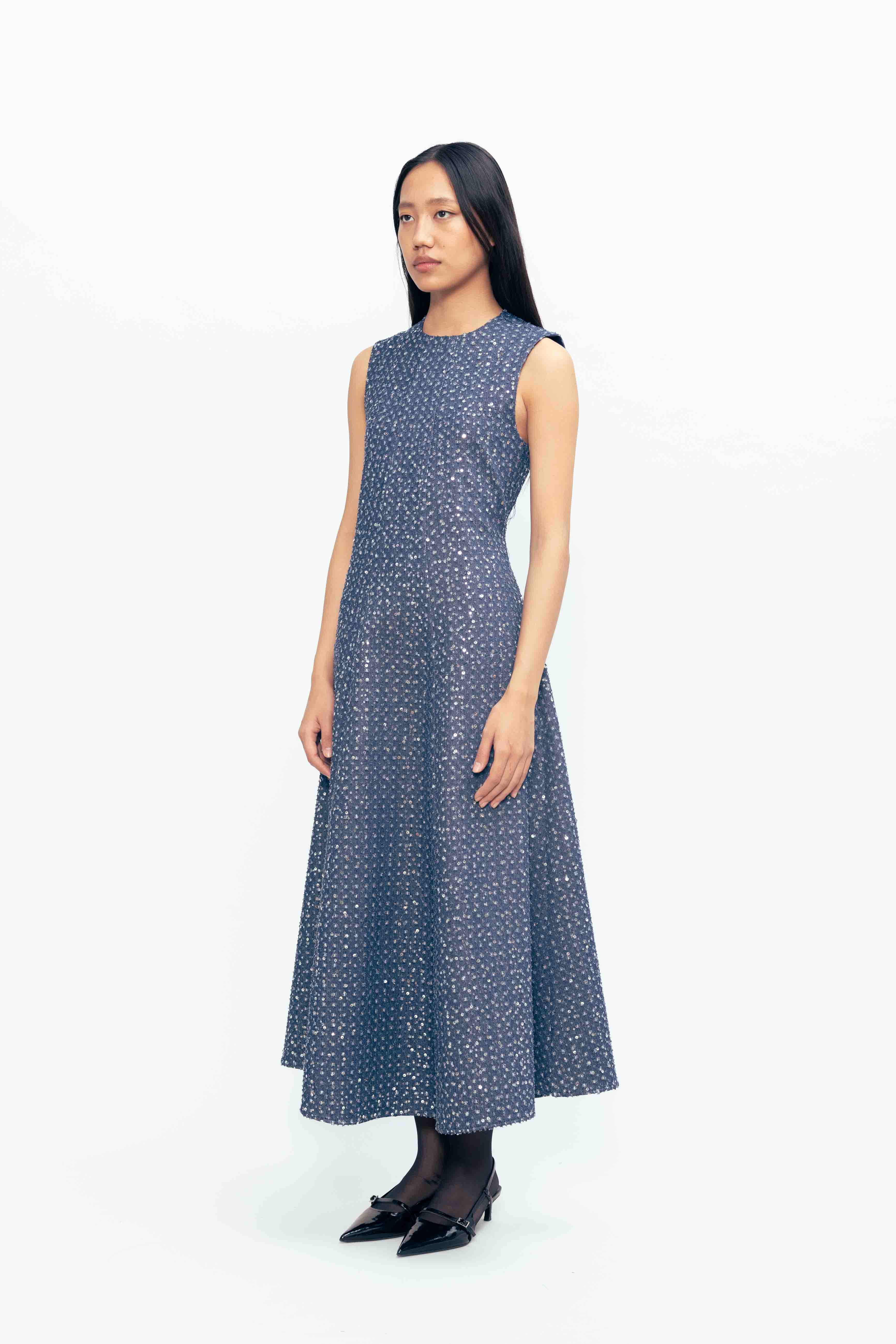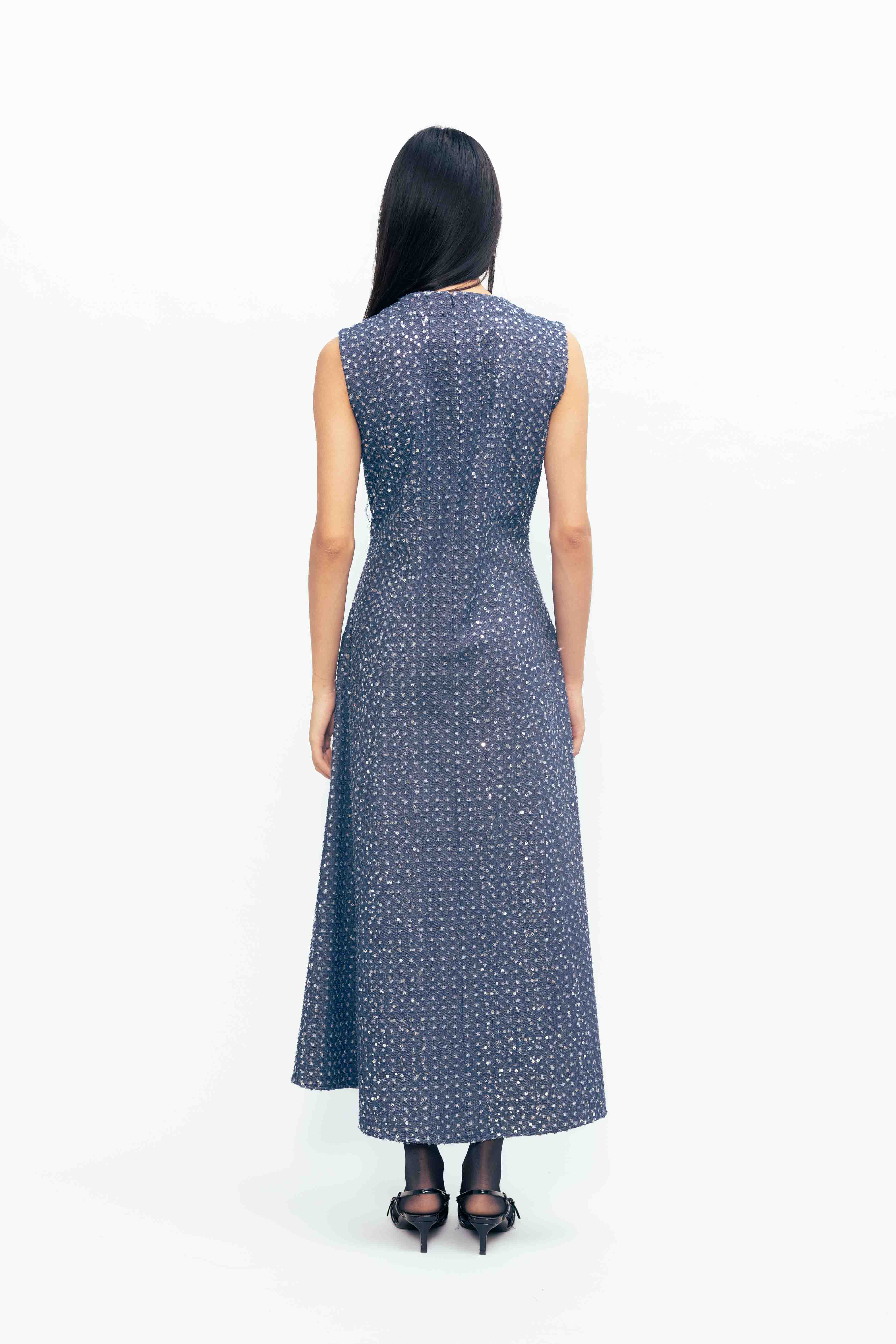 A feminine shape meets subtle detailing in this fit-and-flare midi. Light sequin work adds soft texture and dimension, while the grey-blue base keeps it versatile and grounded. Designed to define at the waist and flow with movement, it offers a balanced look — polished enough for occasions, relaxed enough for everyday.