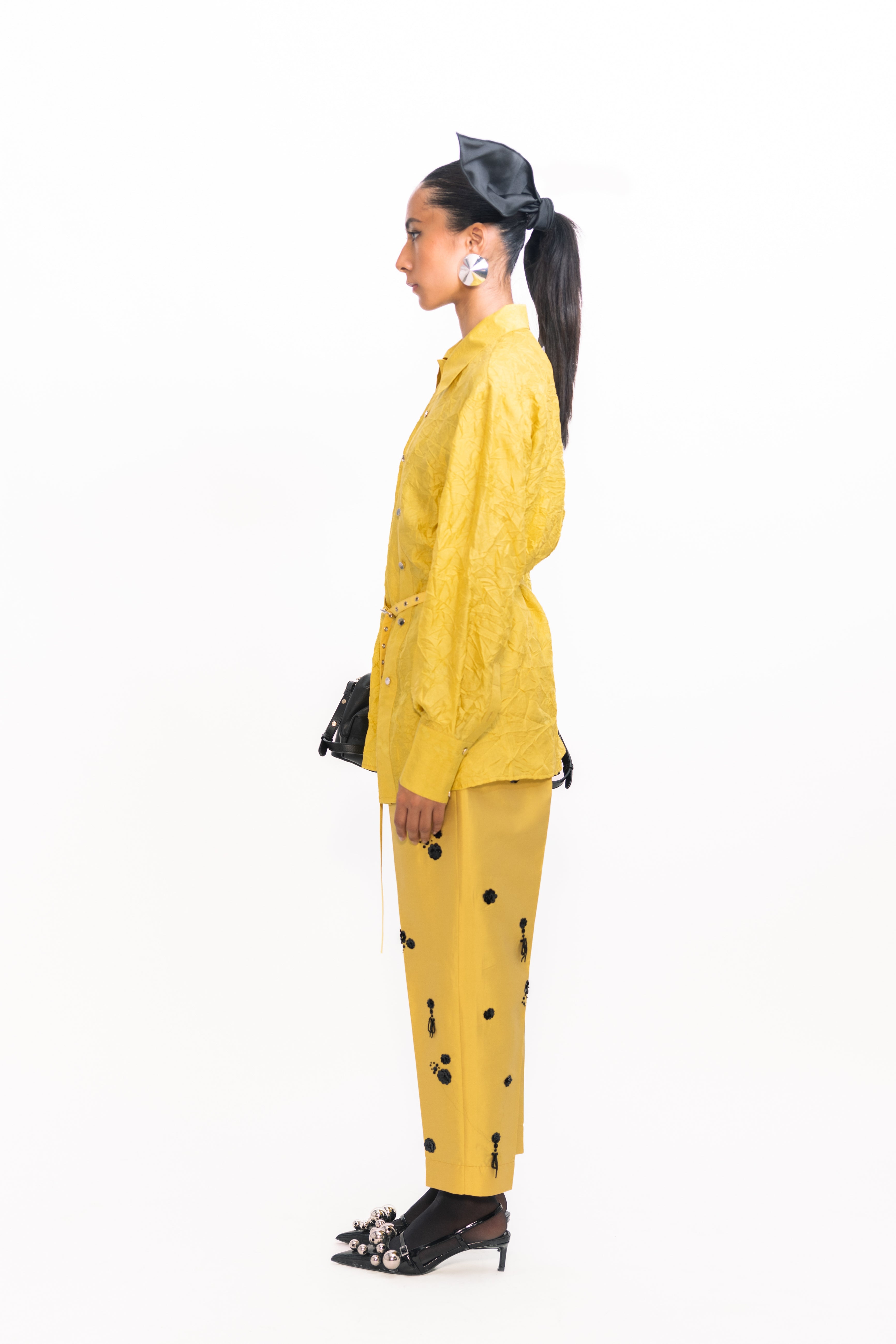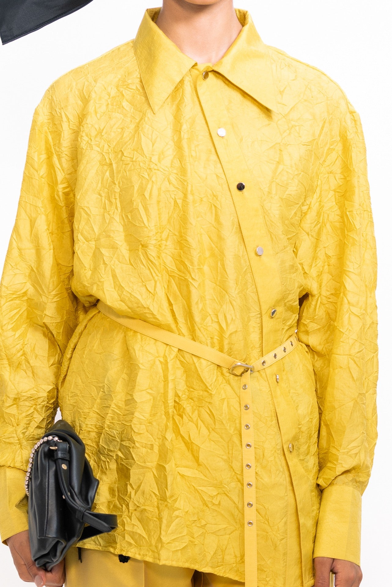Crafted from luxuriously textured crinkled silk, this full-sleeve shirt features a sleek belted waist that subtly defines the silhouette. An off-center placket adds a modern, asymmetrical twist, while the soft drape of the fabric lends understated elegance—perfect for both elevated workwear and chic evening styling.
