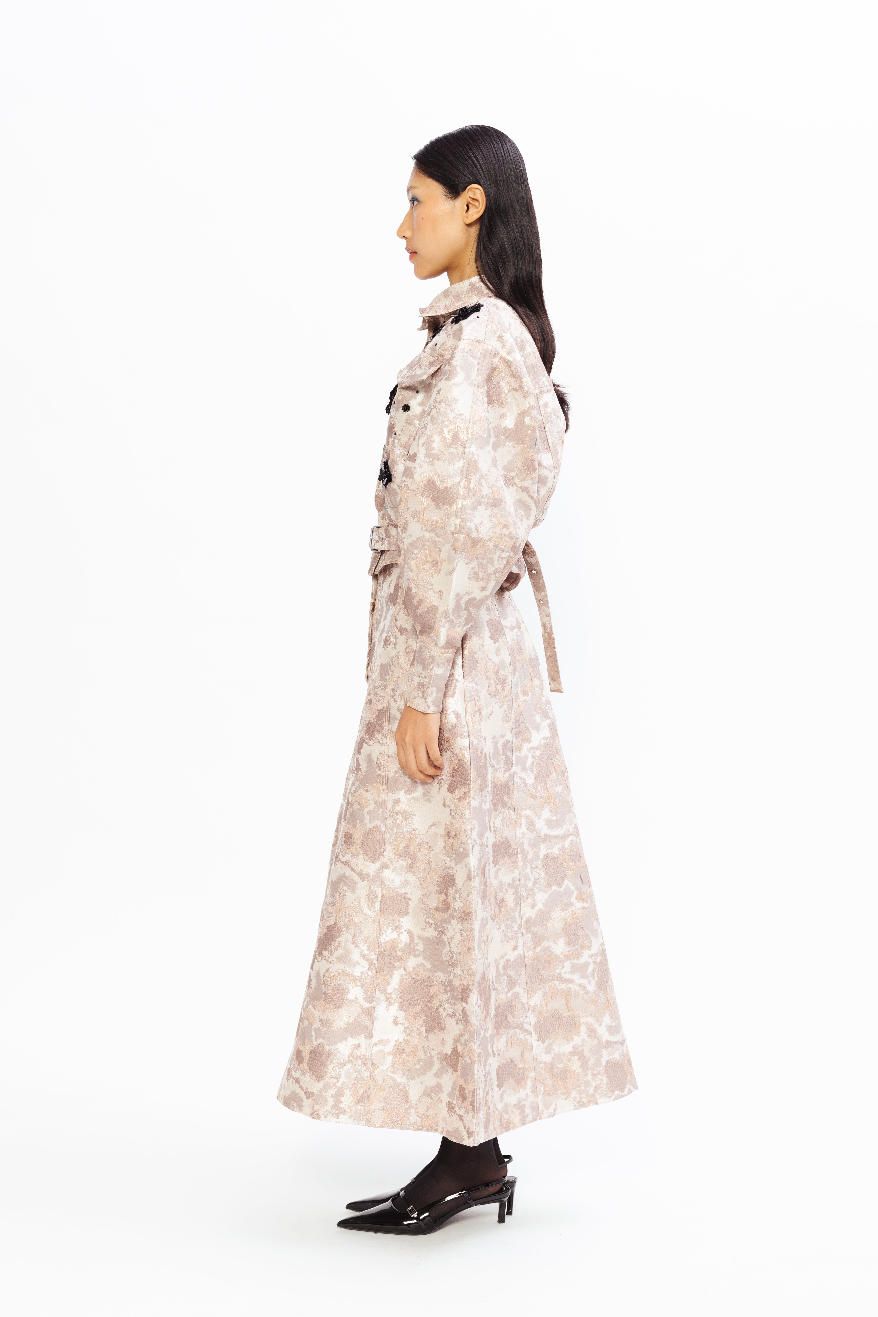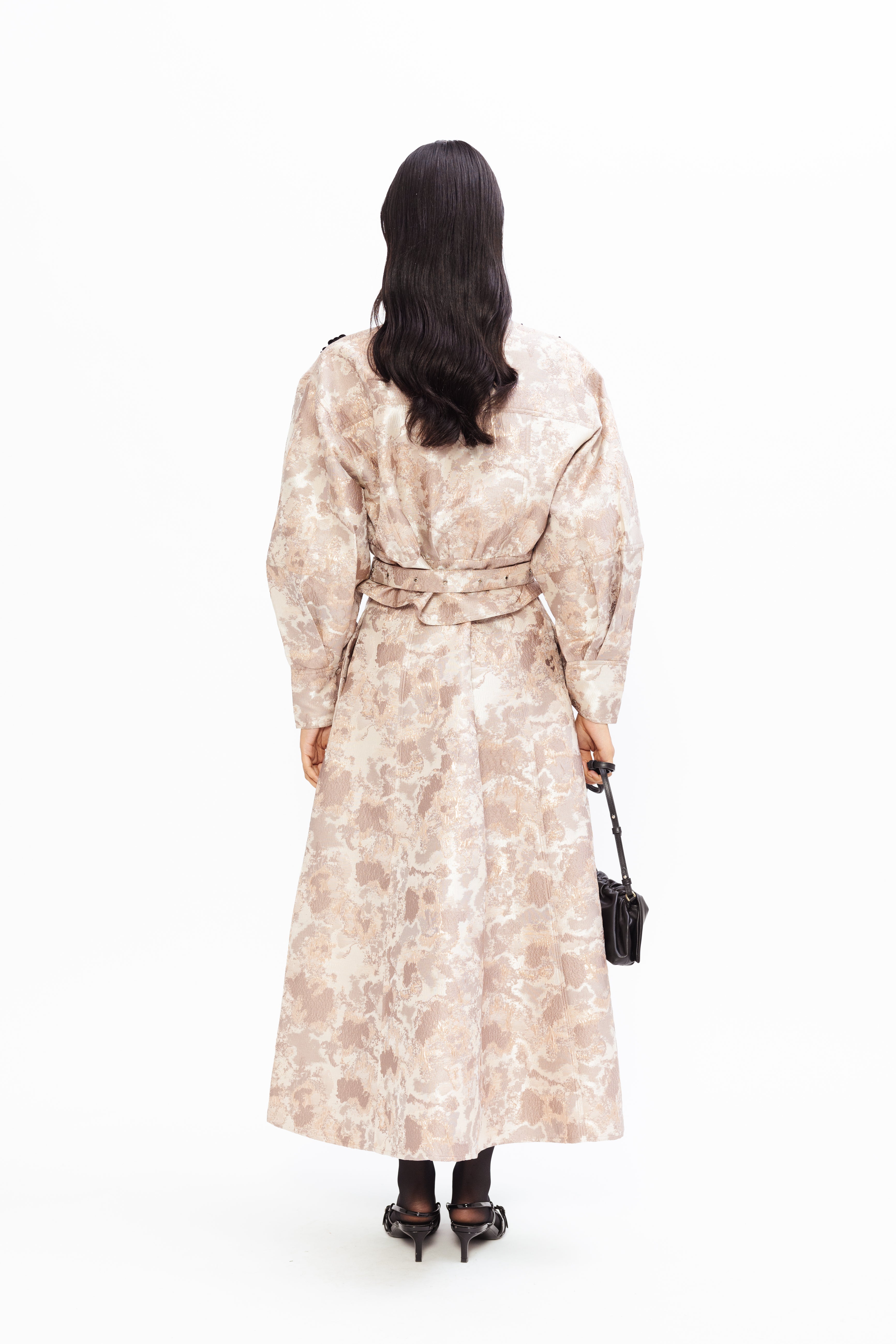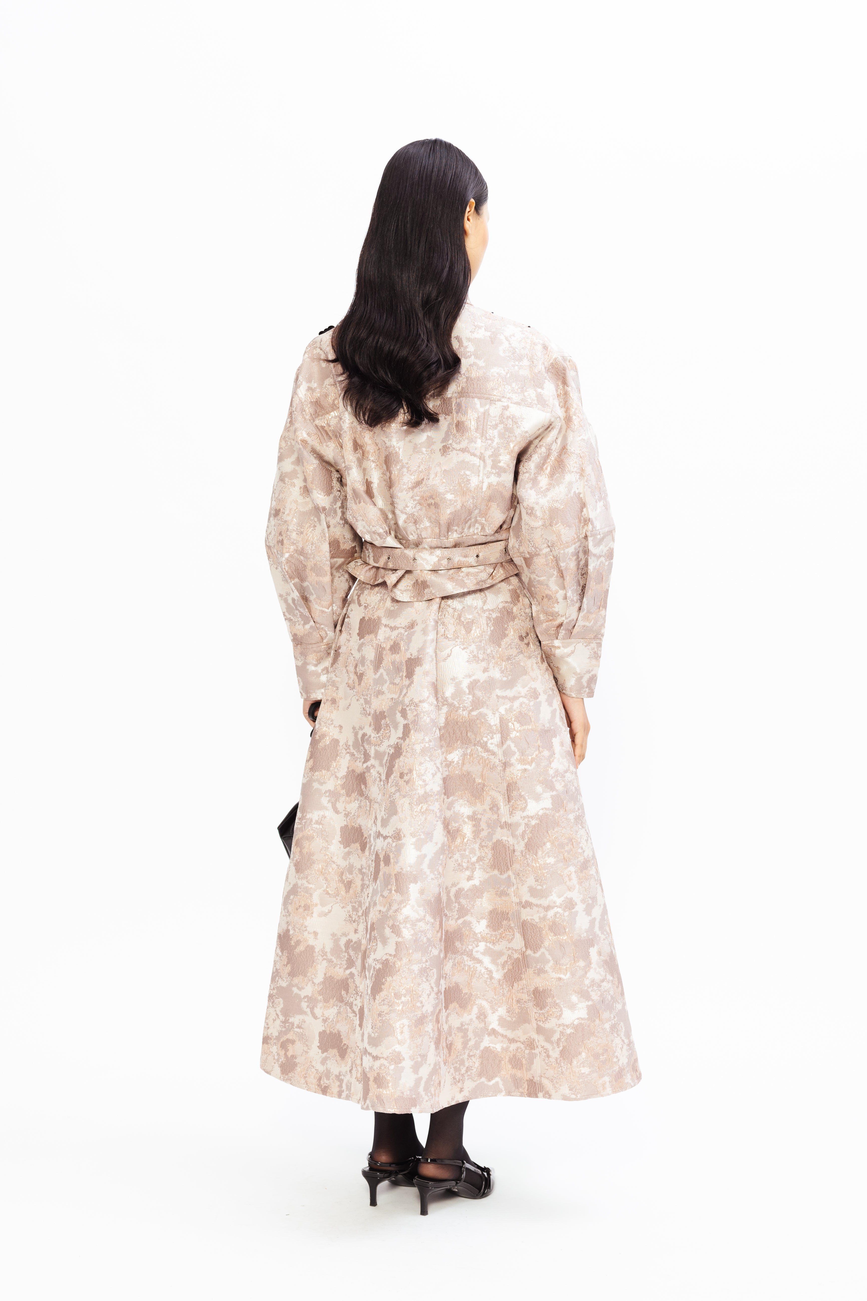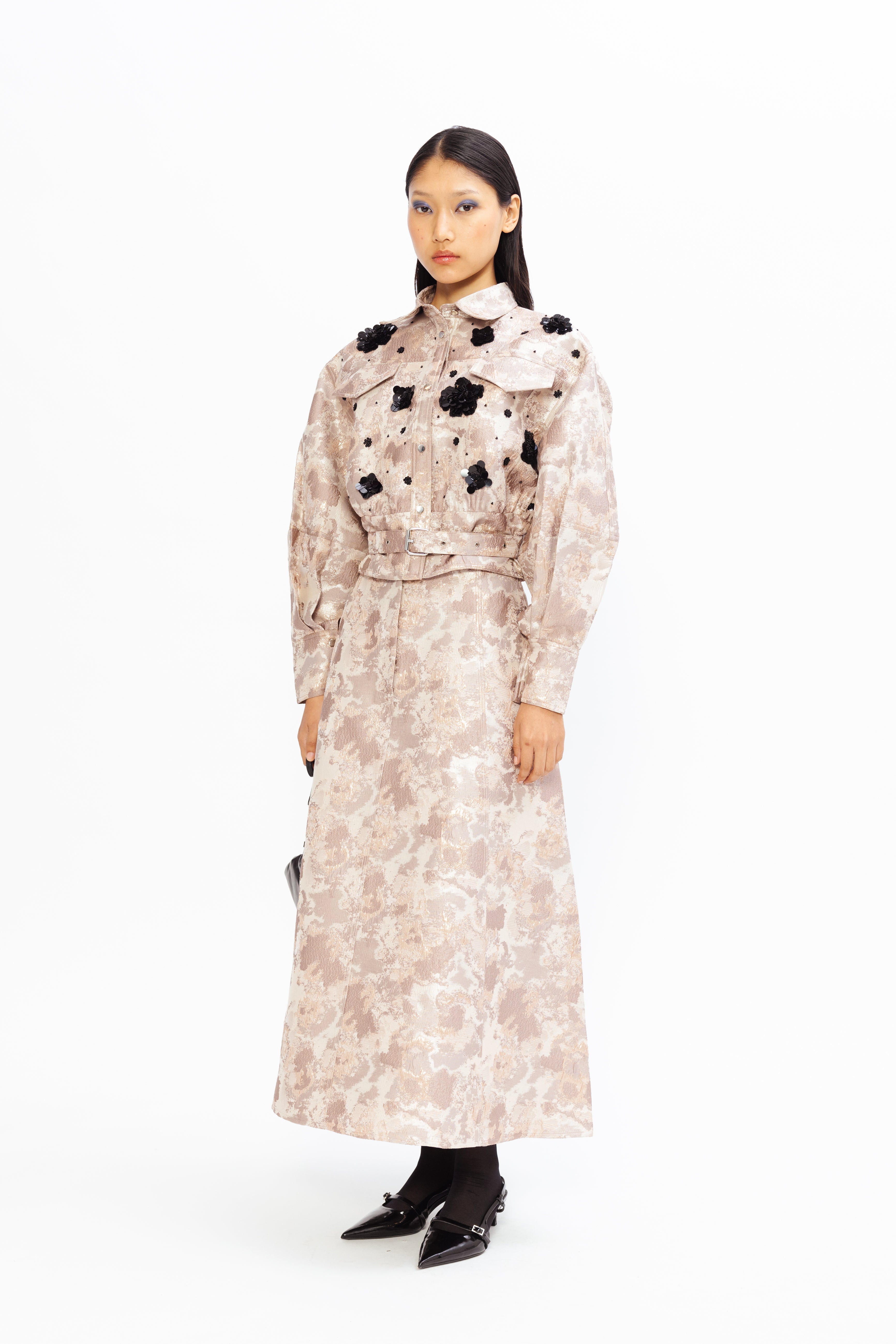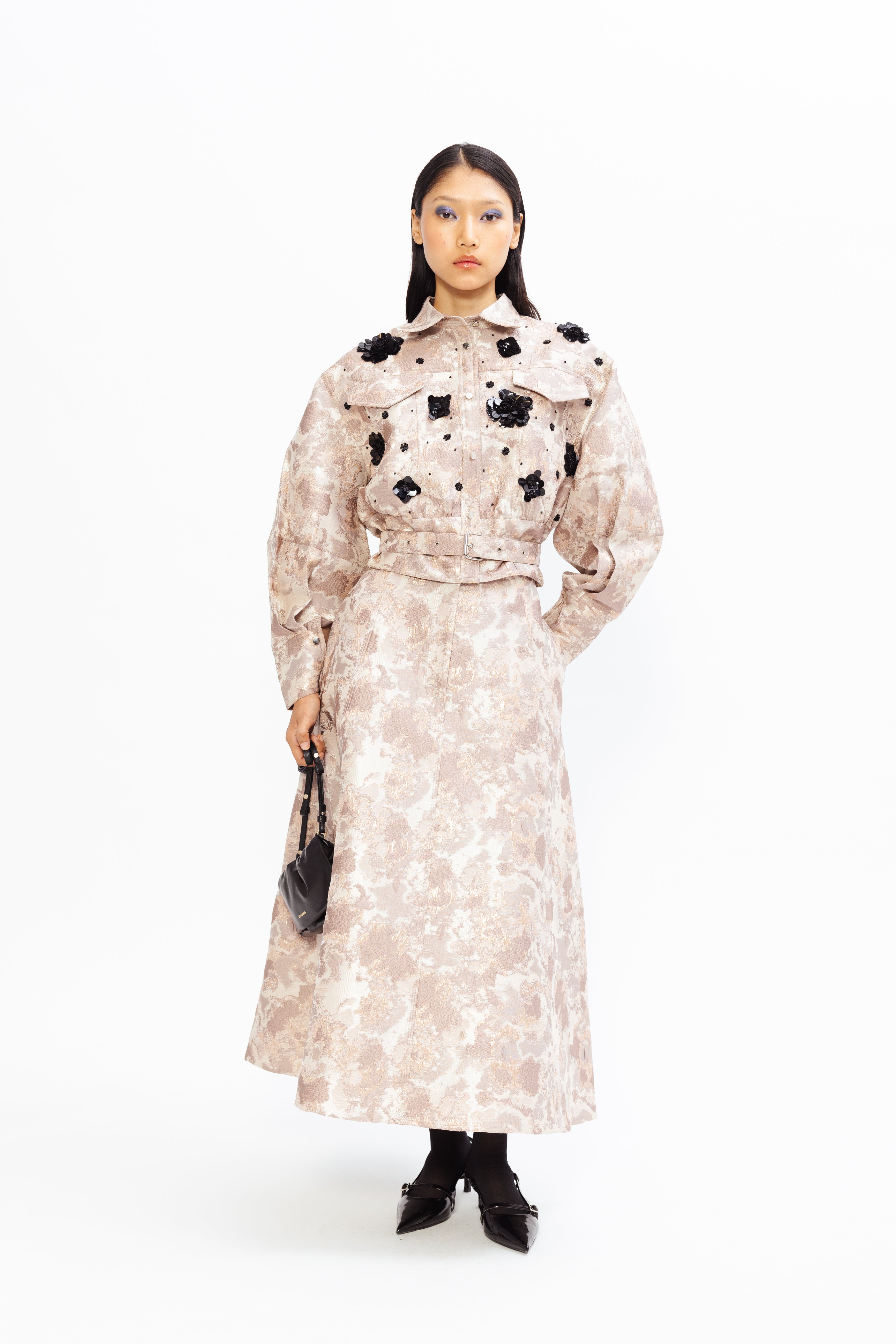 This structured A-line skirt, crafted in rich brocade, offers graceful movement while complementing a range of body types. The textured fabric lends a luxurious feel, making it a versatile styling option and a true statement piece for any occasion.