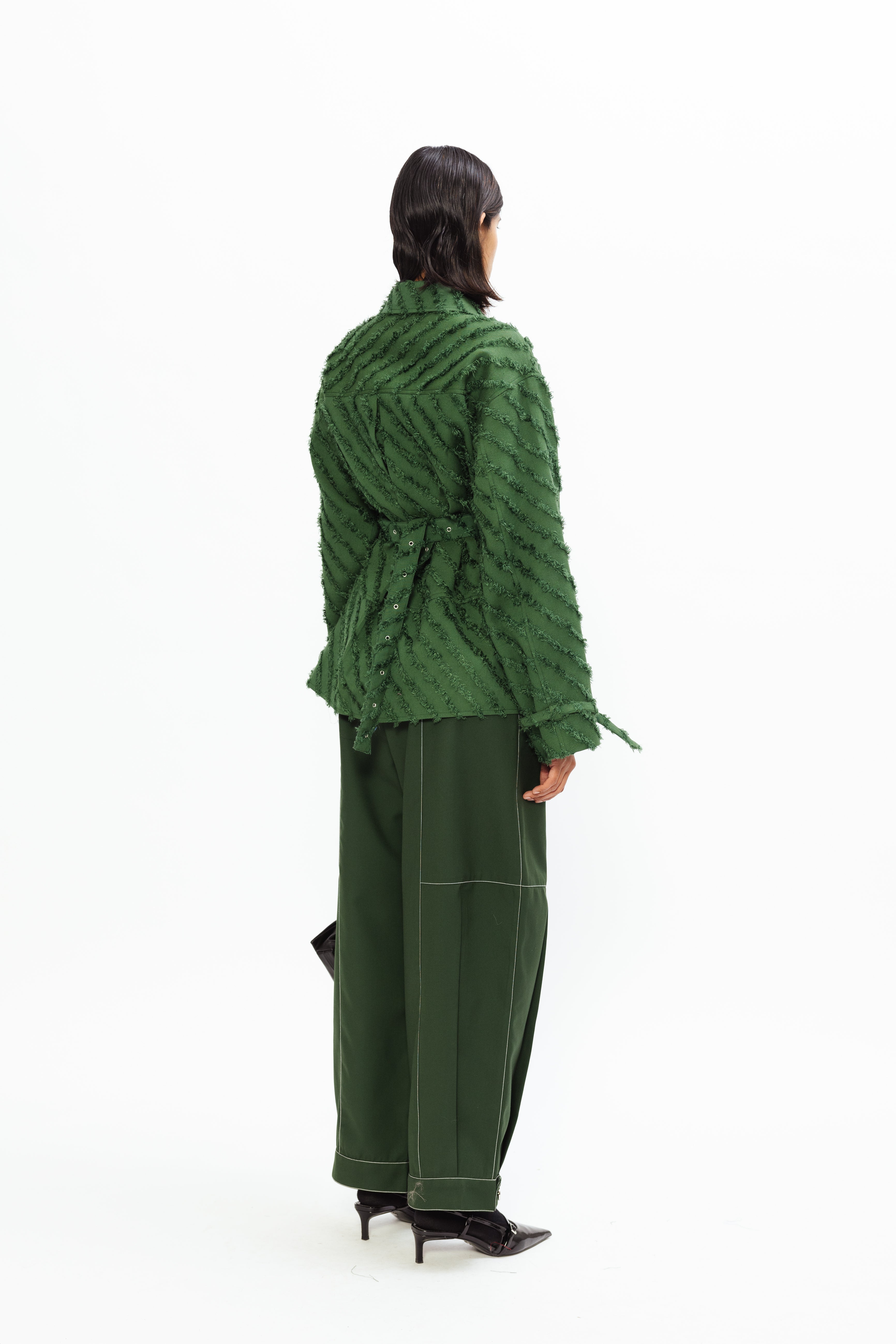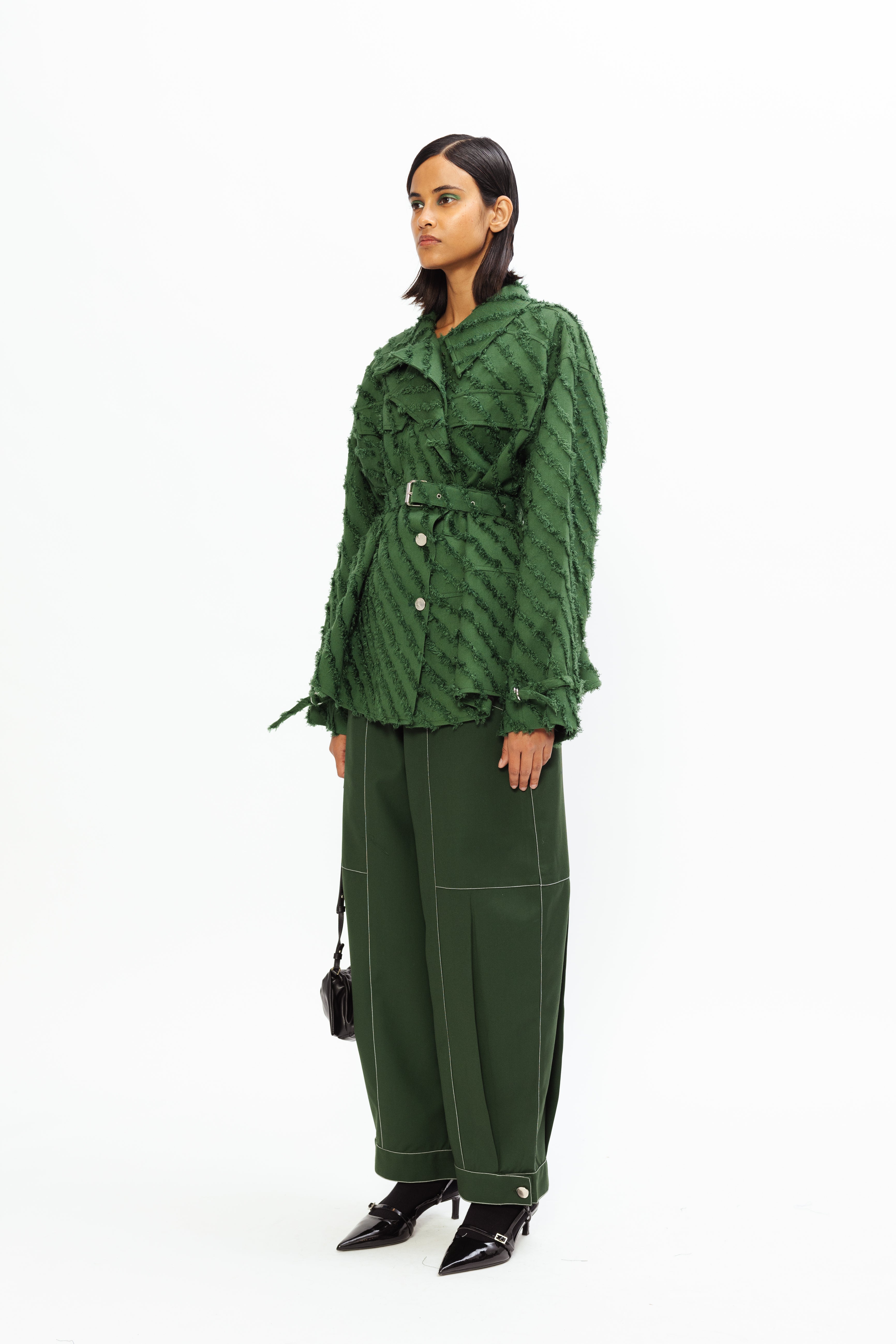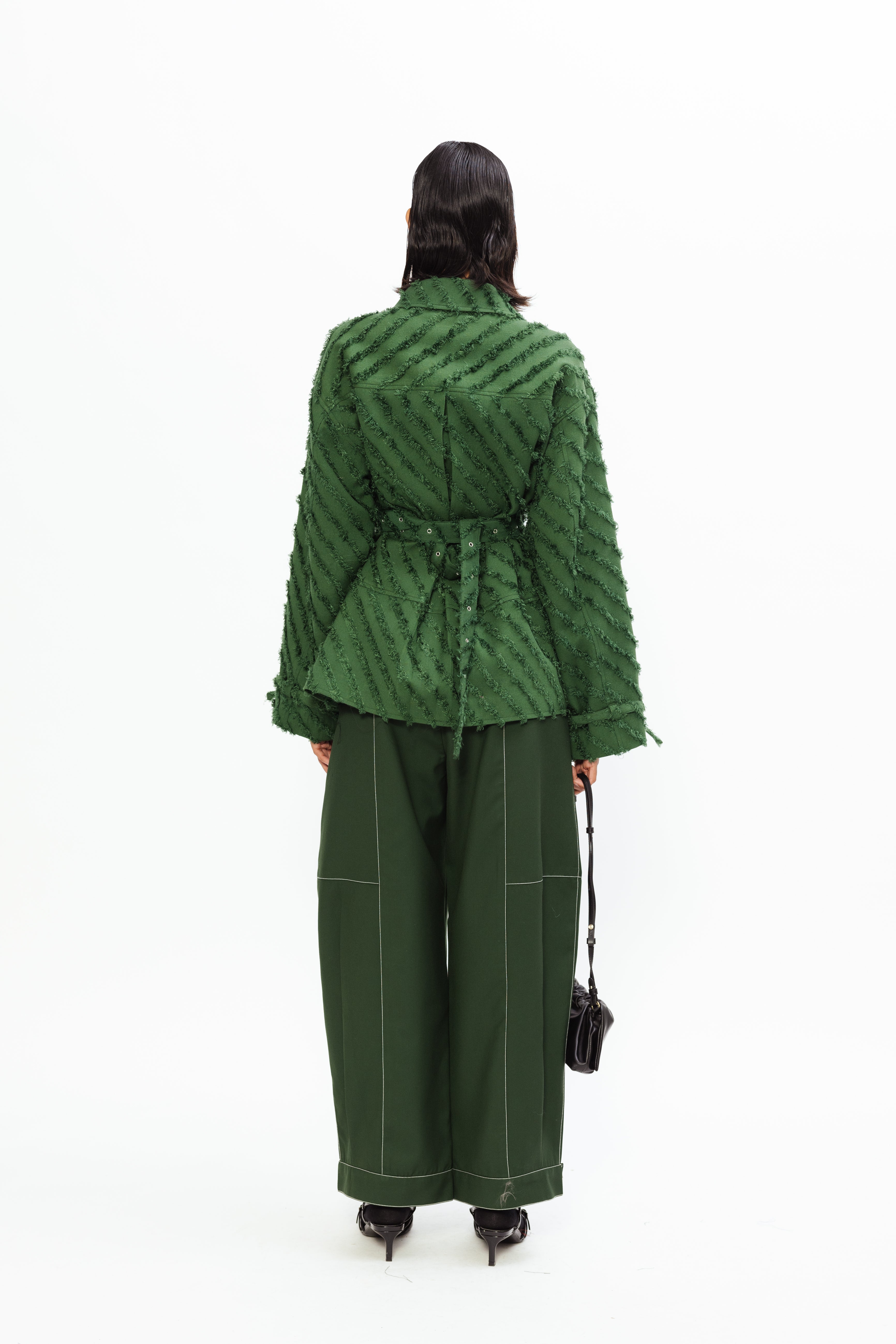 Wide-leg trousers in a rich hunter green, elevated with contrast top-stitch detailing. The fluid silhouette and structured finish create a balanced look that’s both contemporary and effortlessly refined.