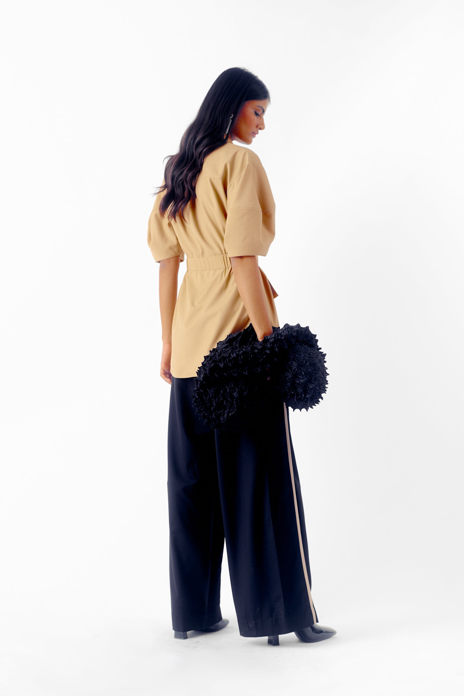 Relaxed fit trousers with a single front pleat for subtle tailoring, complemented by contrast slits for a modern touch.