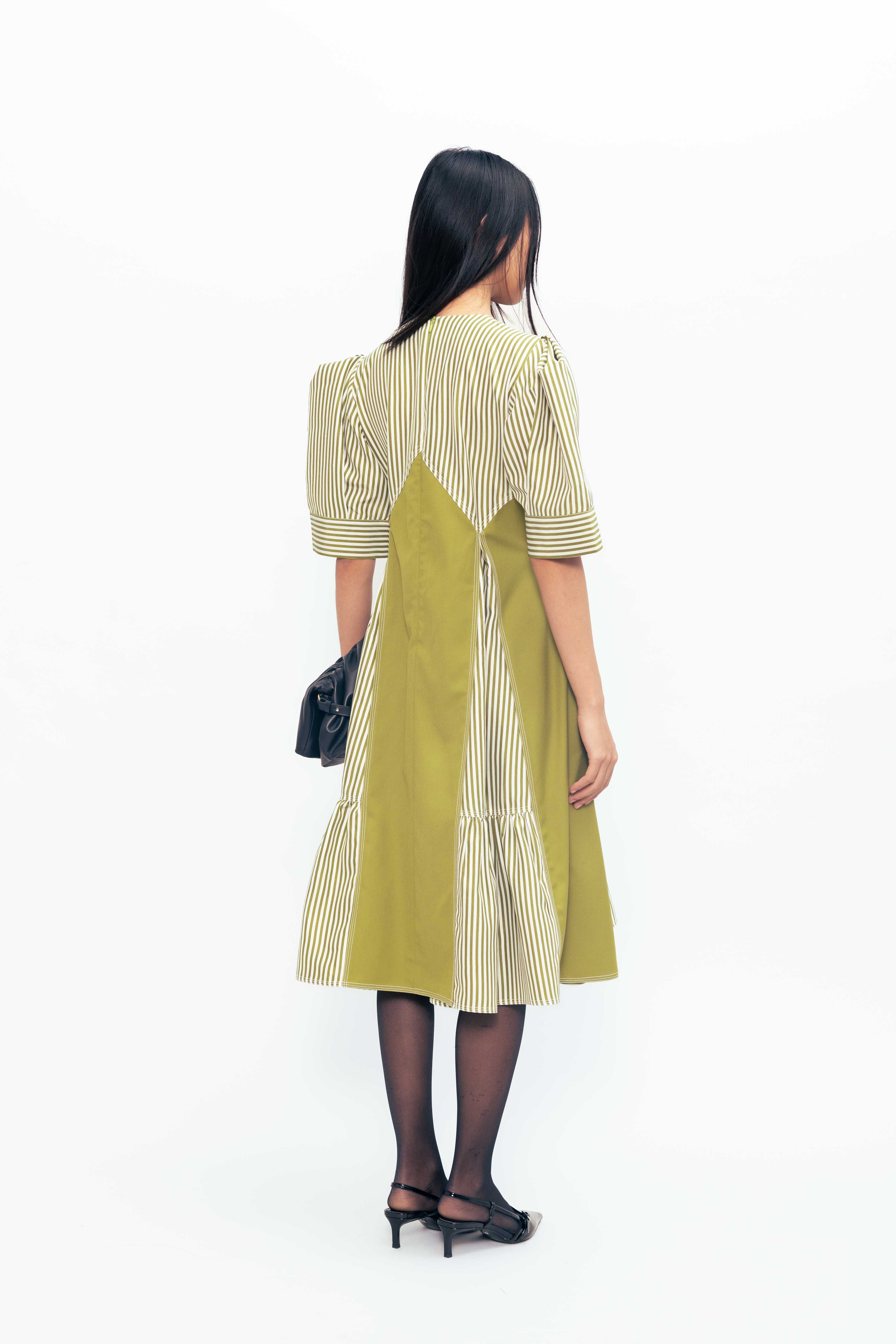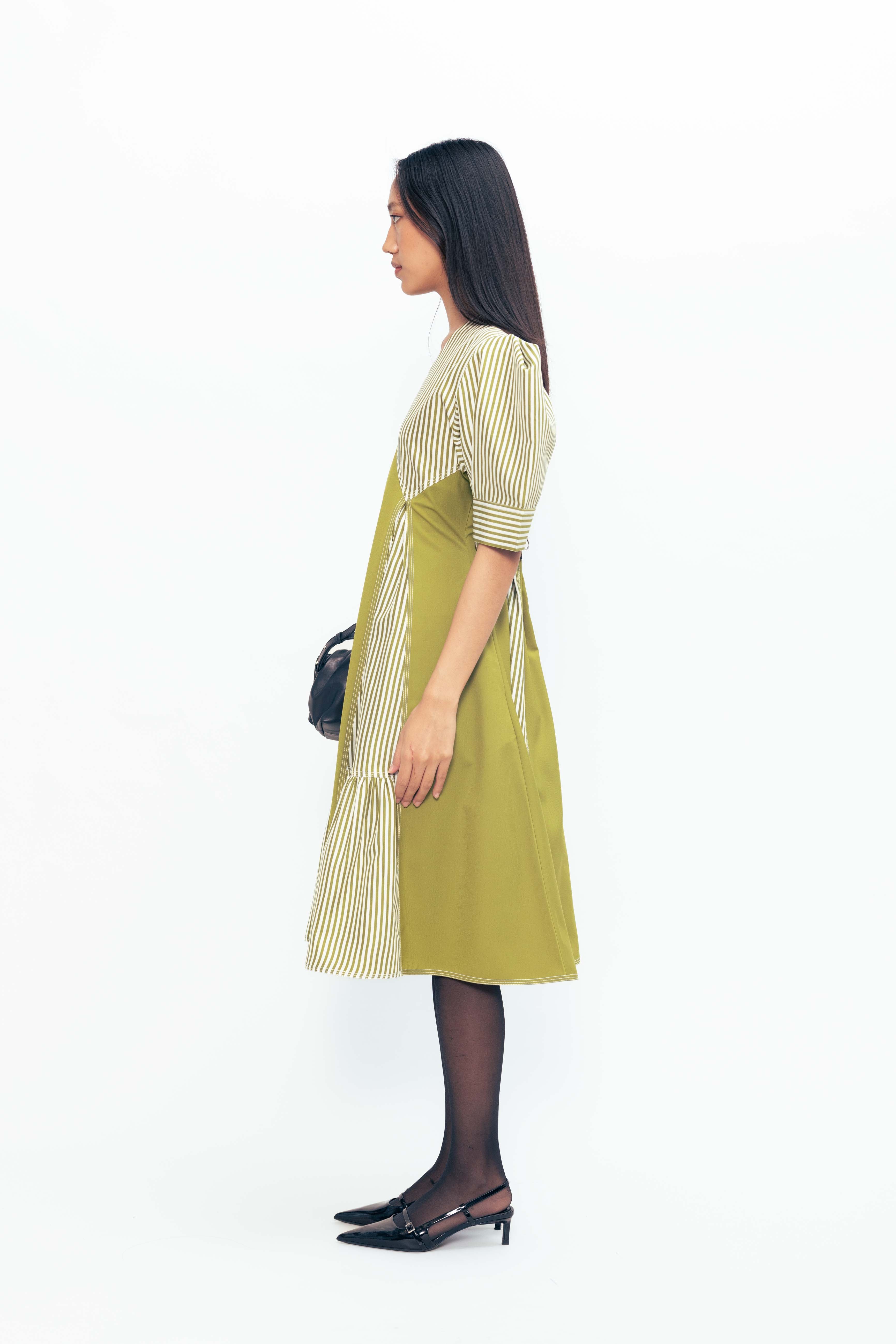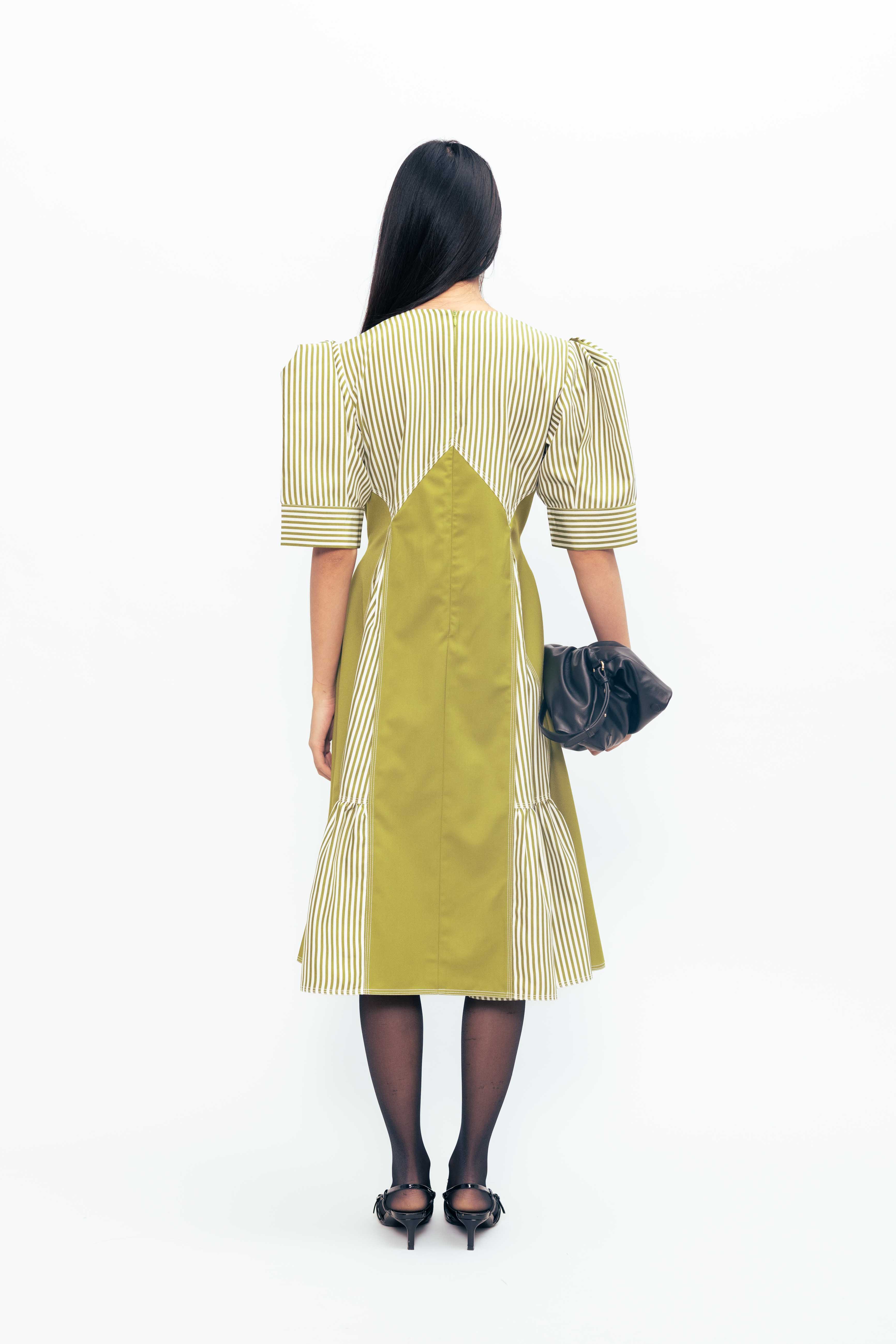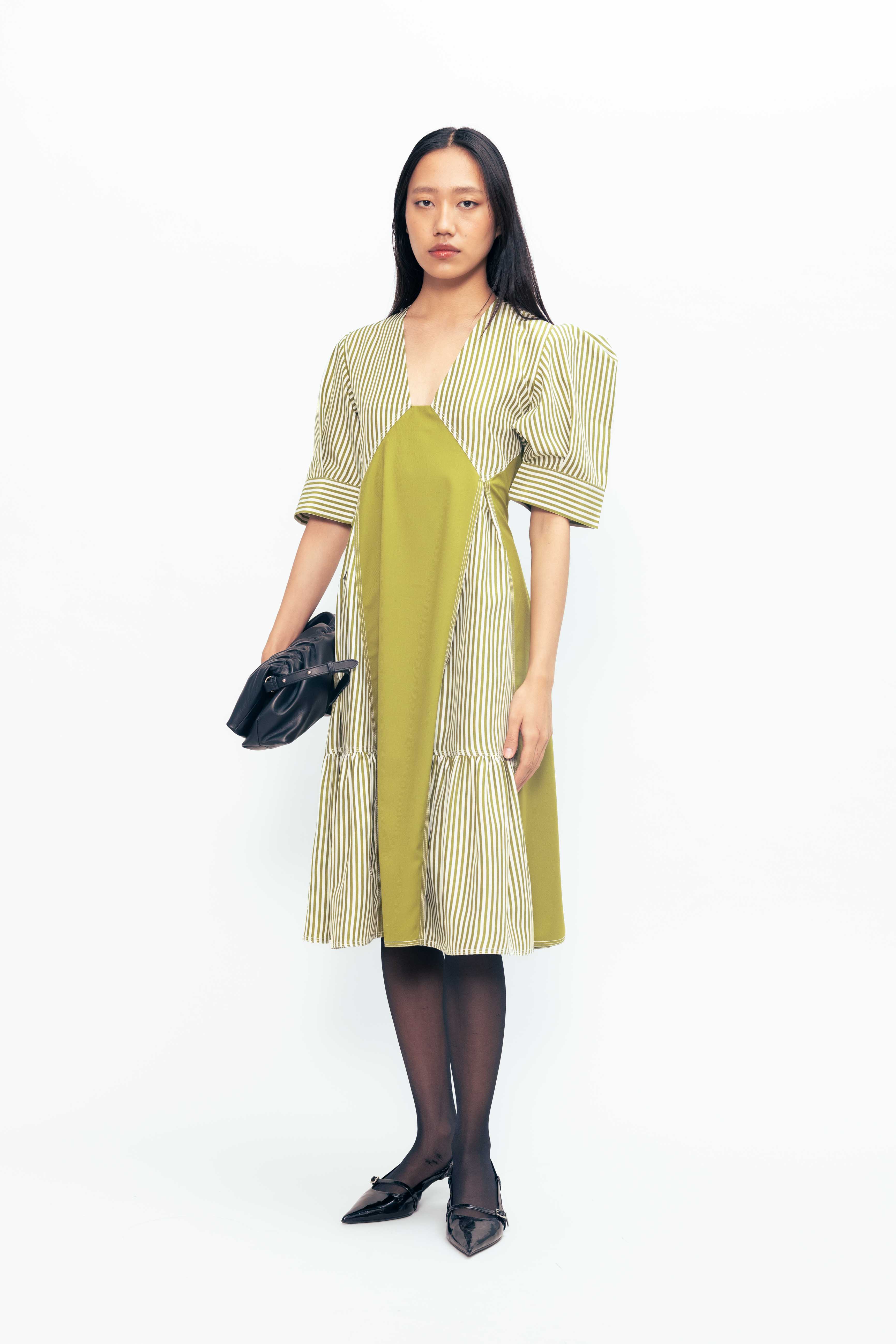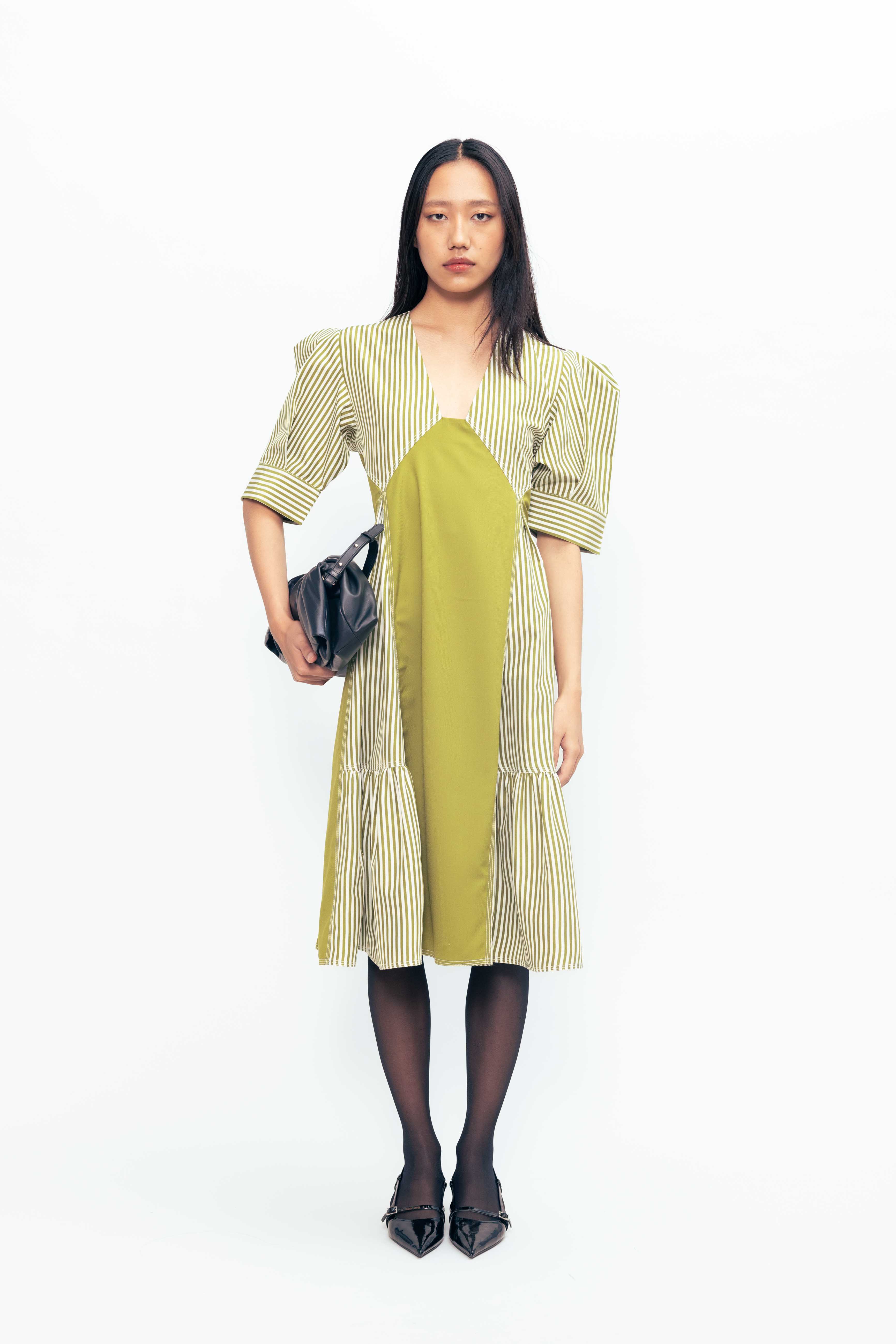 This extended shoulder dress blends tailored structure with graceful detailing for a refined, contemporary look. The extended shoulders create a sharp, sculpted silhouette that adds a modern edge, while soft pleats bring fluidity and texture to the overall form.