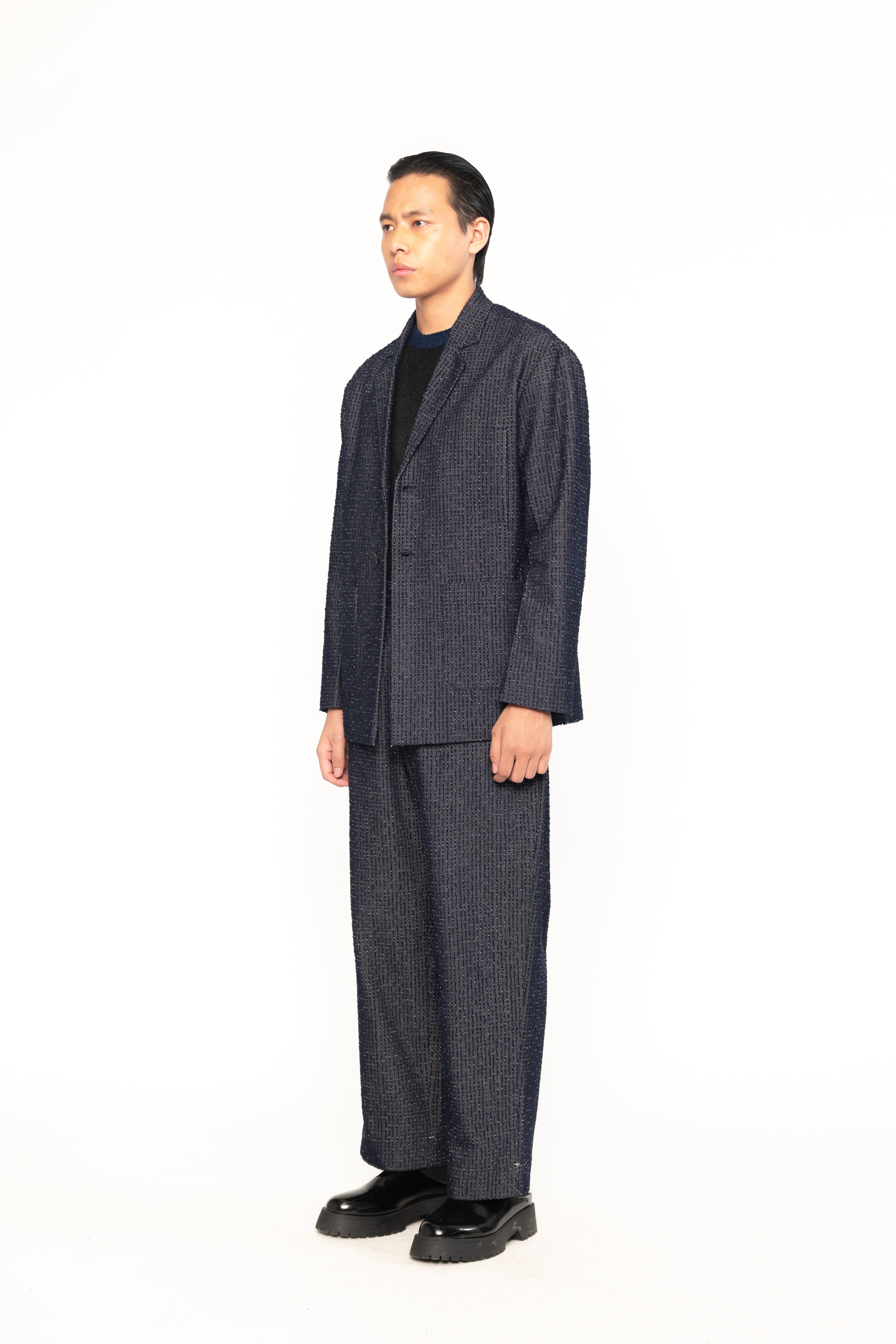 This textured denim men's blazer combines the classic structure of a blazer with the casual, rugged appeal of denim. The textured fabric adds depth and visual interest, making it a stylish, modern piece suitable for smart-casual occasions.