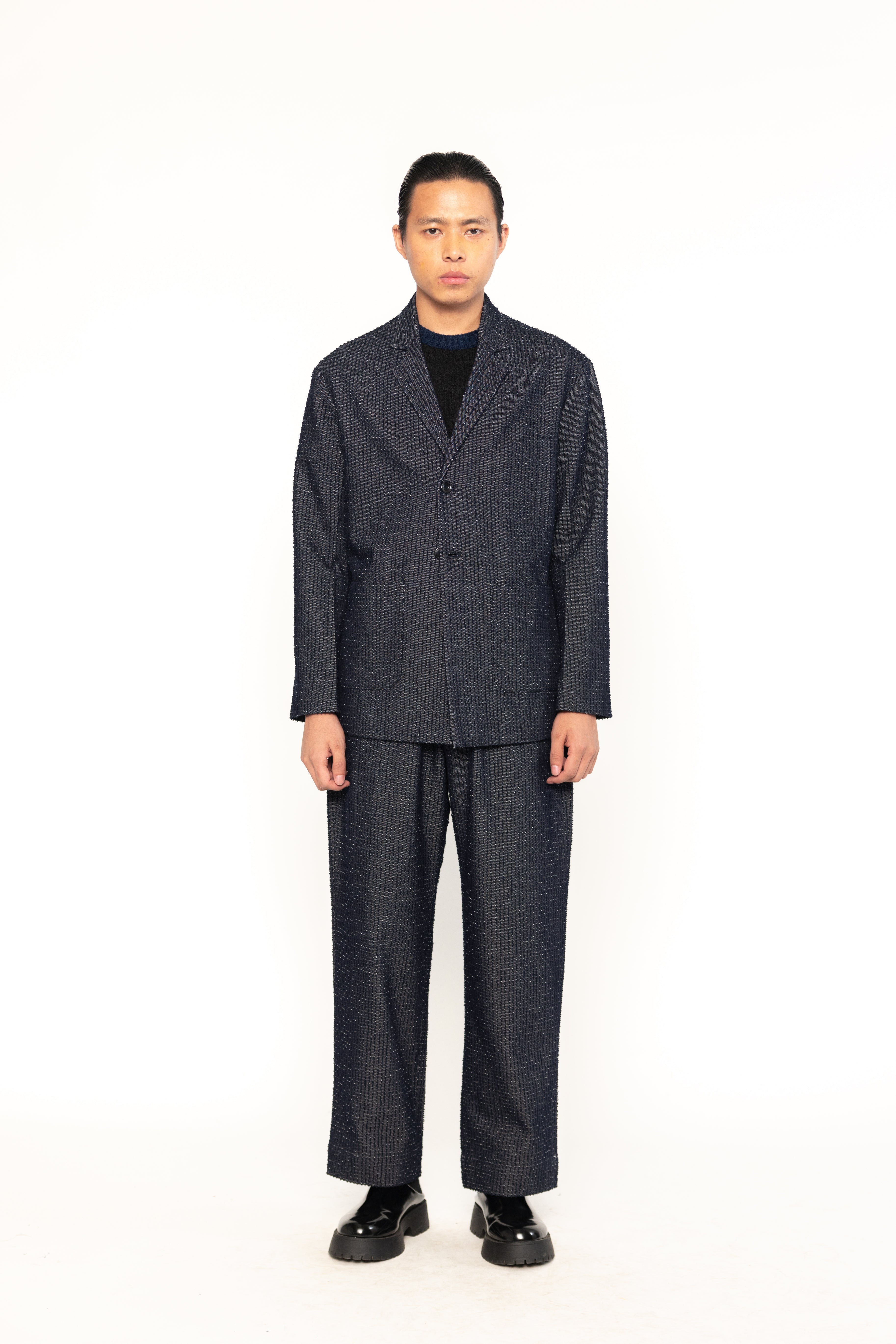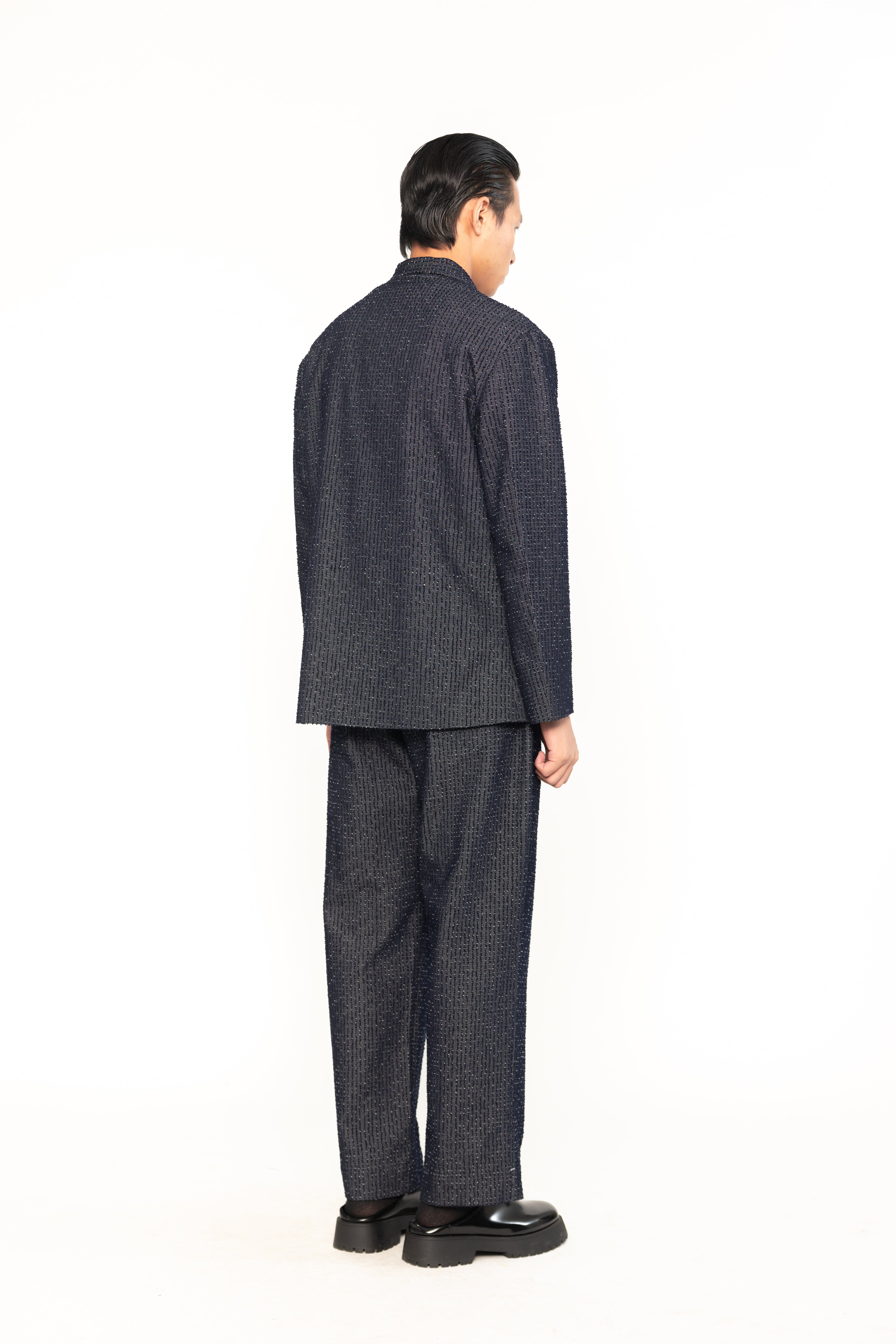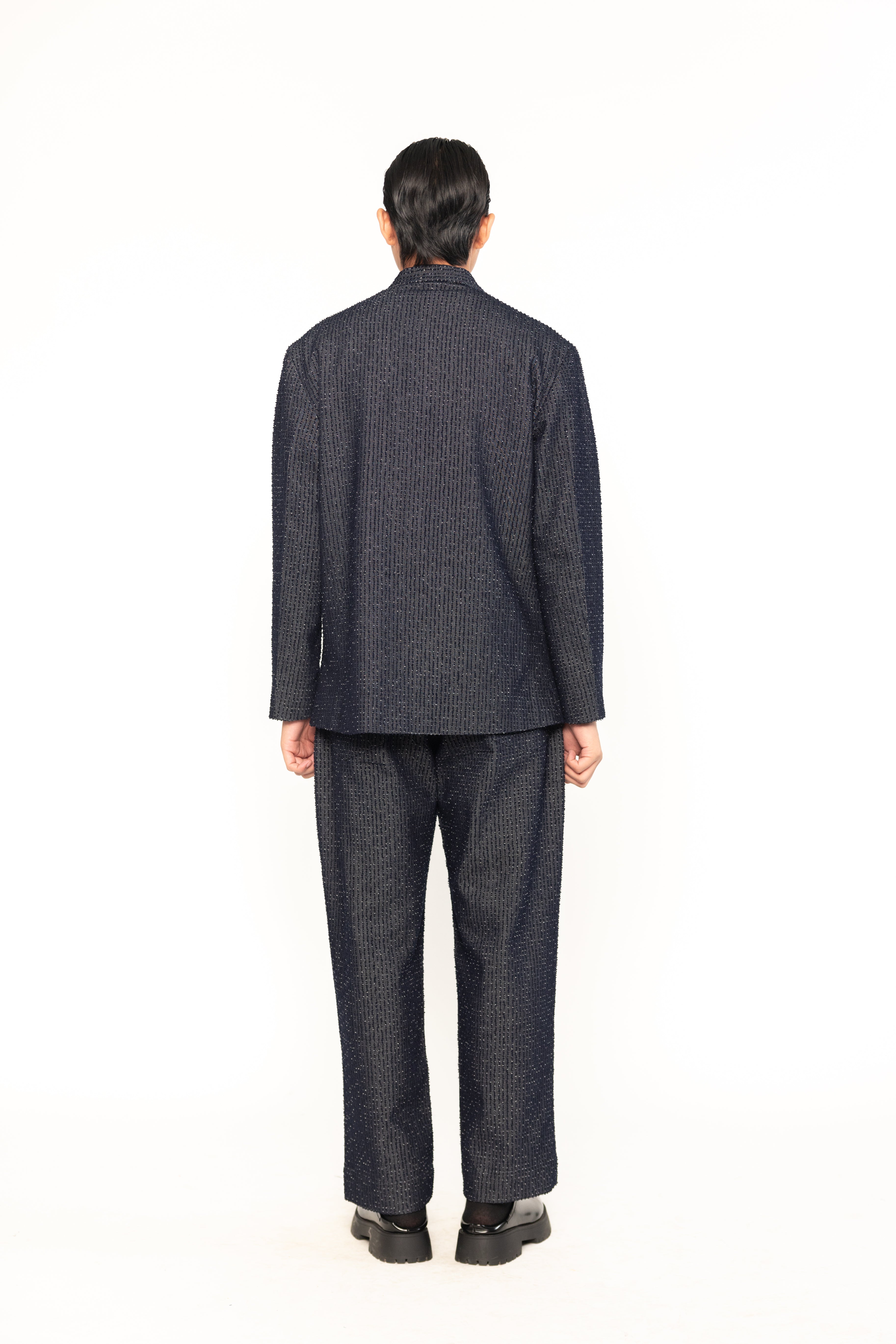 Relaxed-fit textured denim trousers offer a comfortable, laid-back fit with a unique, textured denim fabric. The relaxed silhouette ensures ease of movement, while the textured finish adds depth and visual interest, making them ideal for casual wear.