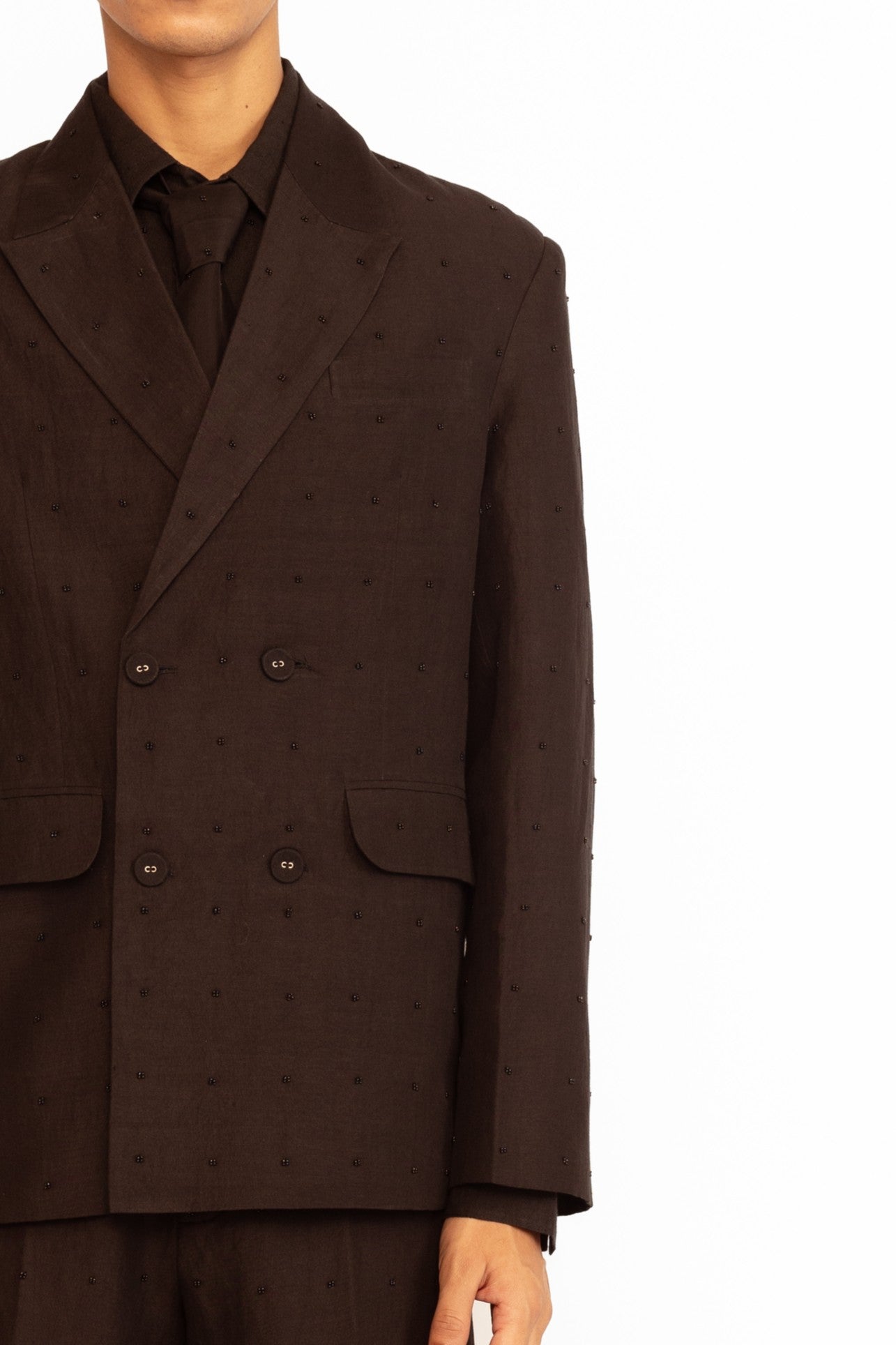 A statement piece with intricate detailing. This blazer features elegant lapel collars and a structured silhouette, highlighted by delicate grid bead embroidery for a touch of texture and shine. Designed with functional pockets and a four-button closure, it blends classic tailoring with modern embellishment for a sophisticated finish.