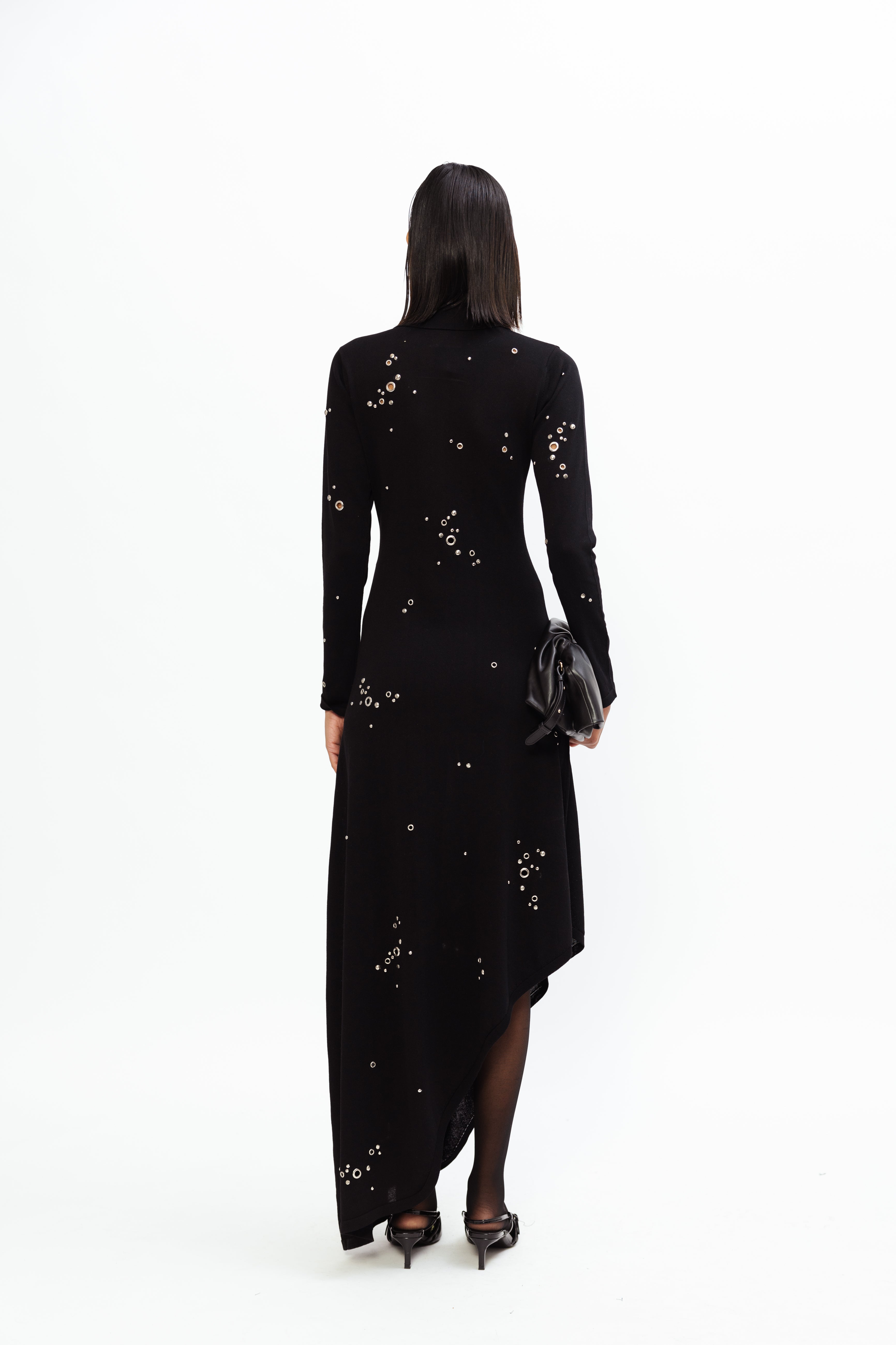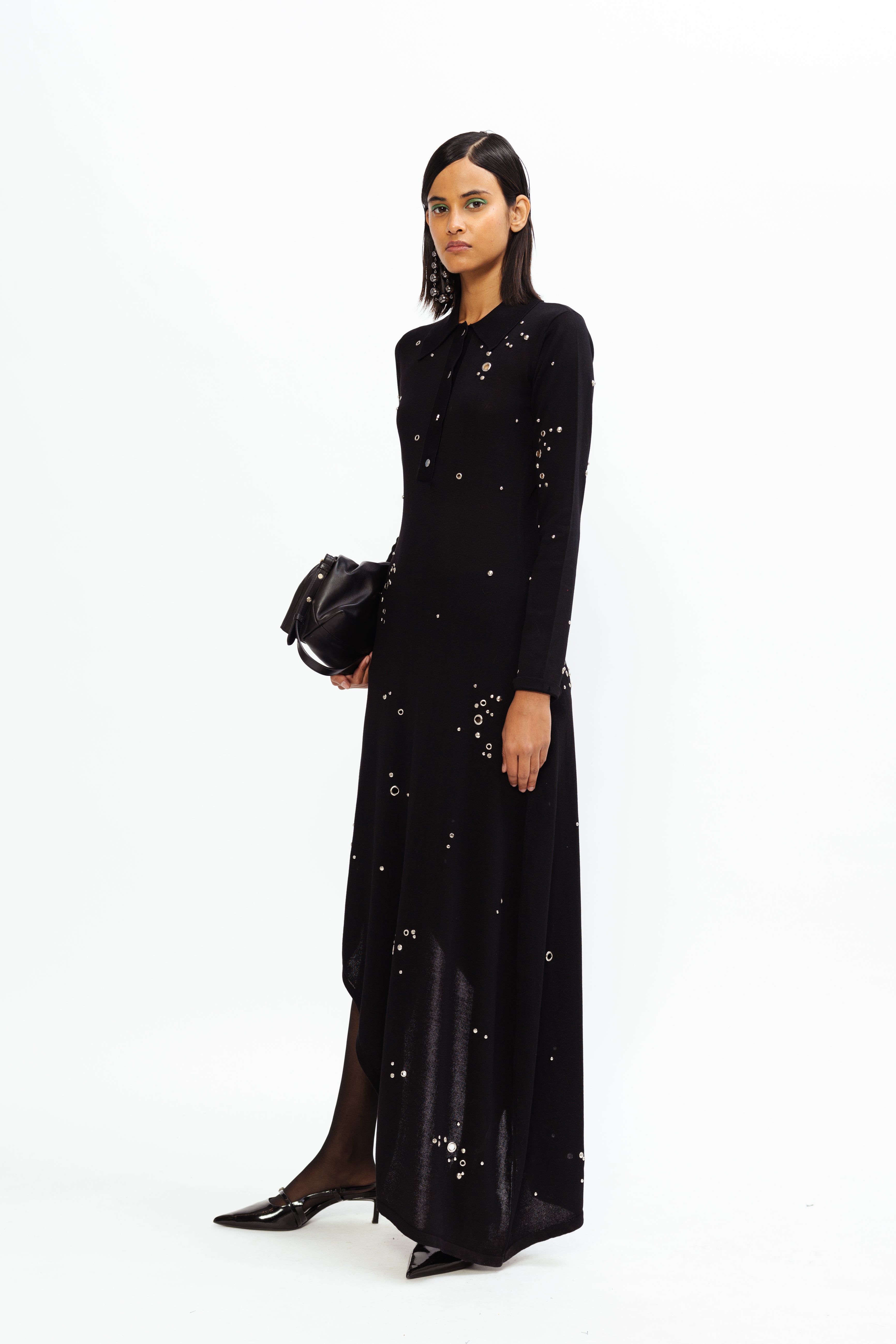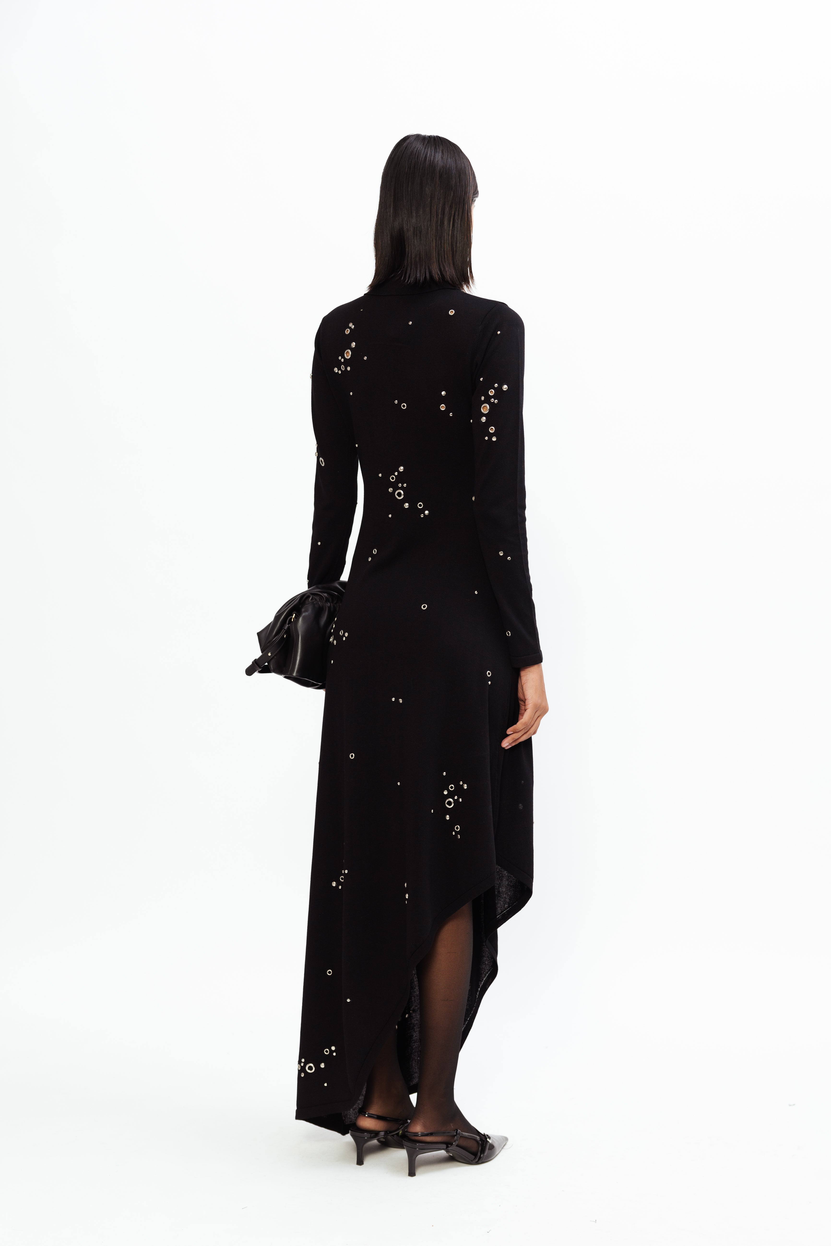 Crafted from a soft, body-hugging knit fabric, this dress offers both comfort and a sleek, streamlined silhouette. The black base is accentuated with metallic grommet embellishments scattered throughout, adding a subtle shimmer and edgy appeal. Finished with full-length sleeves, it exudes a refined yet contemporary elegance.