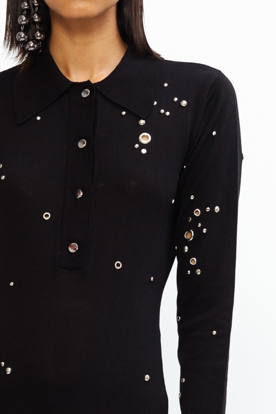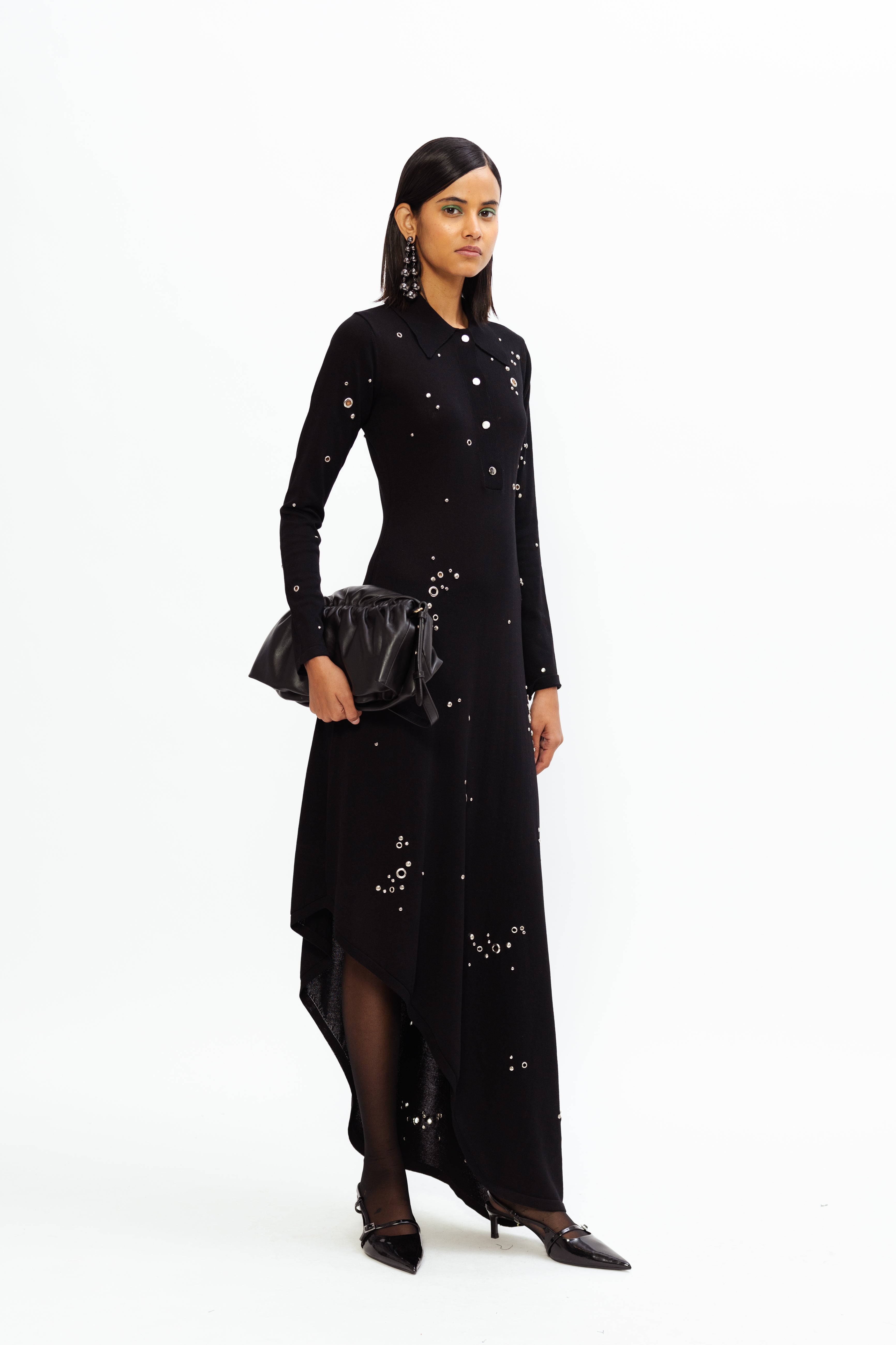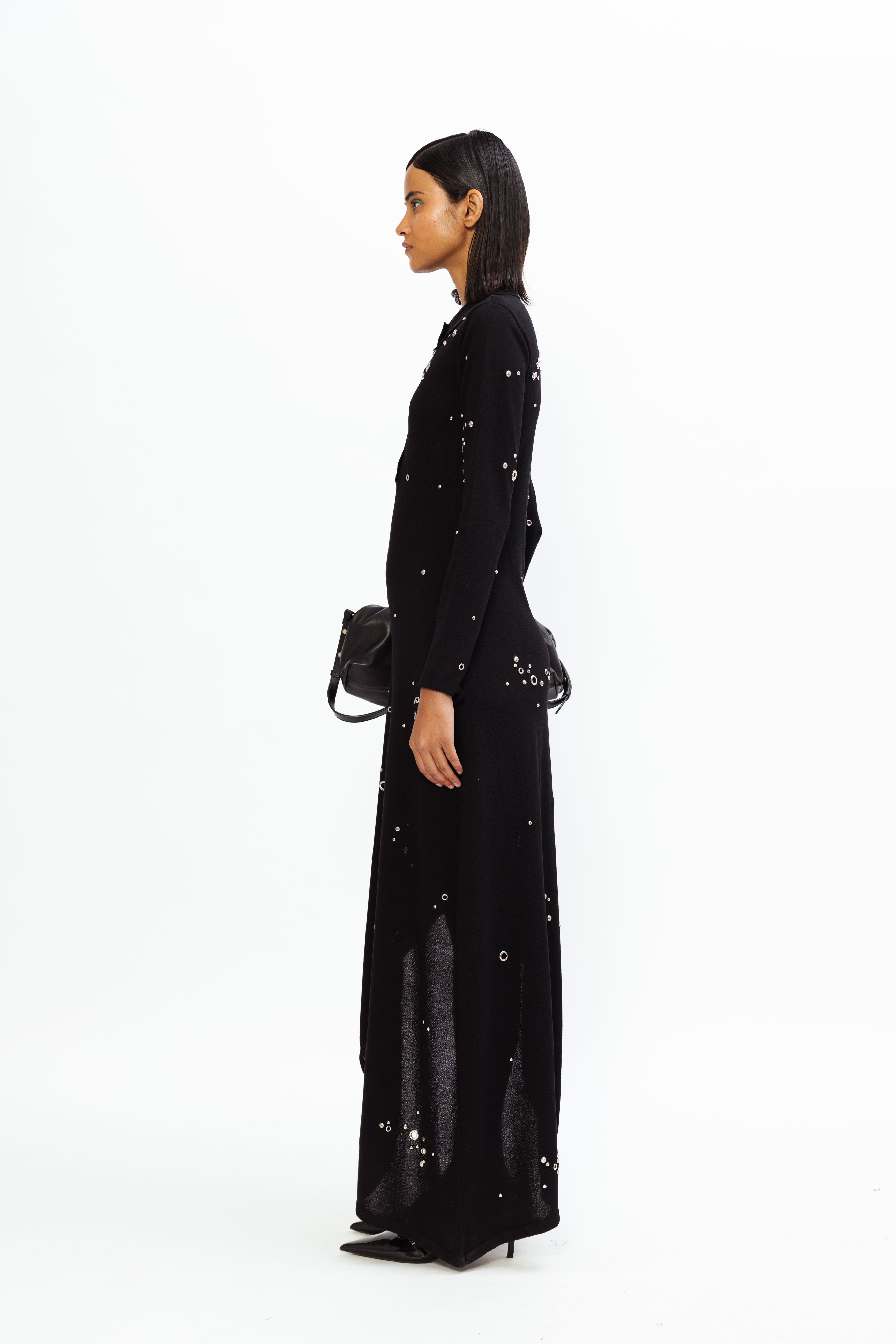 Crafted from a soft, body-hugging knit fabric, this dress offers both comfort and a sleek, streamlined silhouette. The black base is accentuated with metallic grommet embellishments scattered throughout, adding a subtle shimmer and edgy appeal. Finished with full-length sleeves, it exudes a refined yet contemporary elegance.