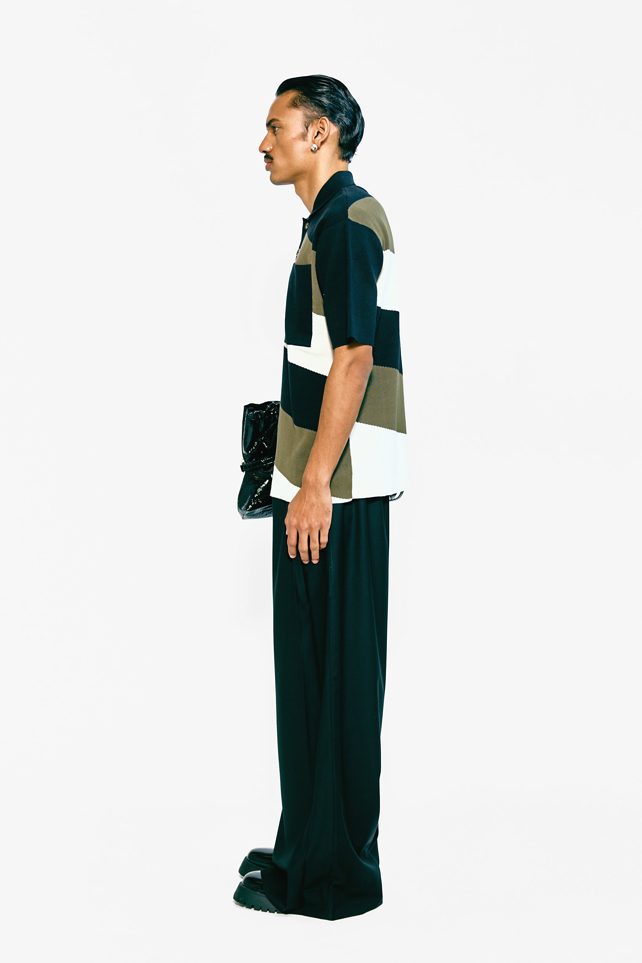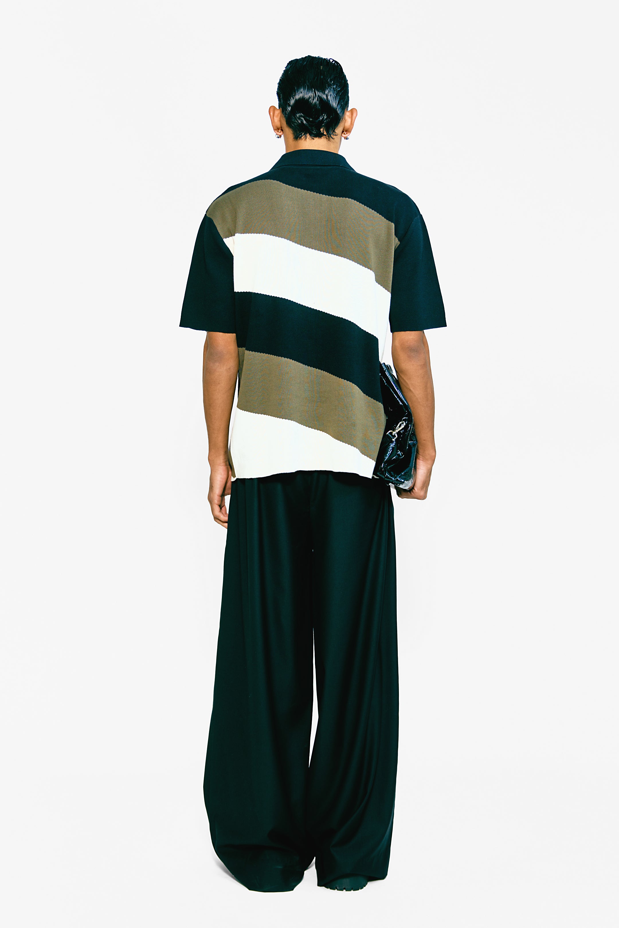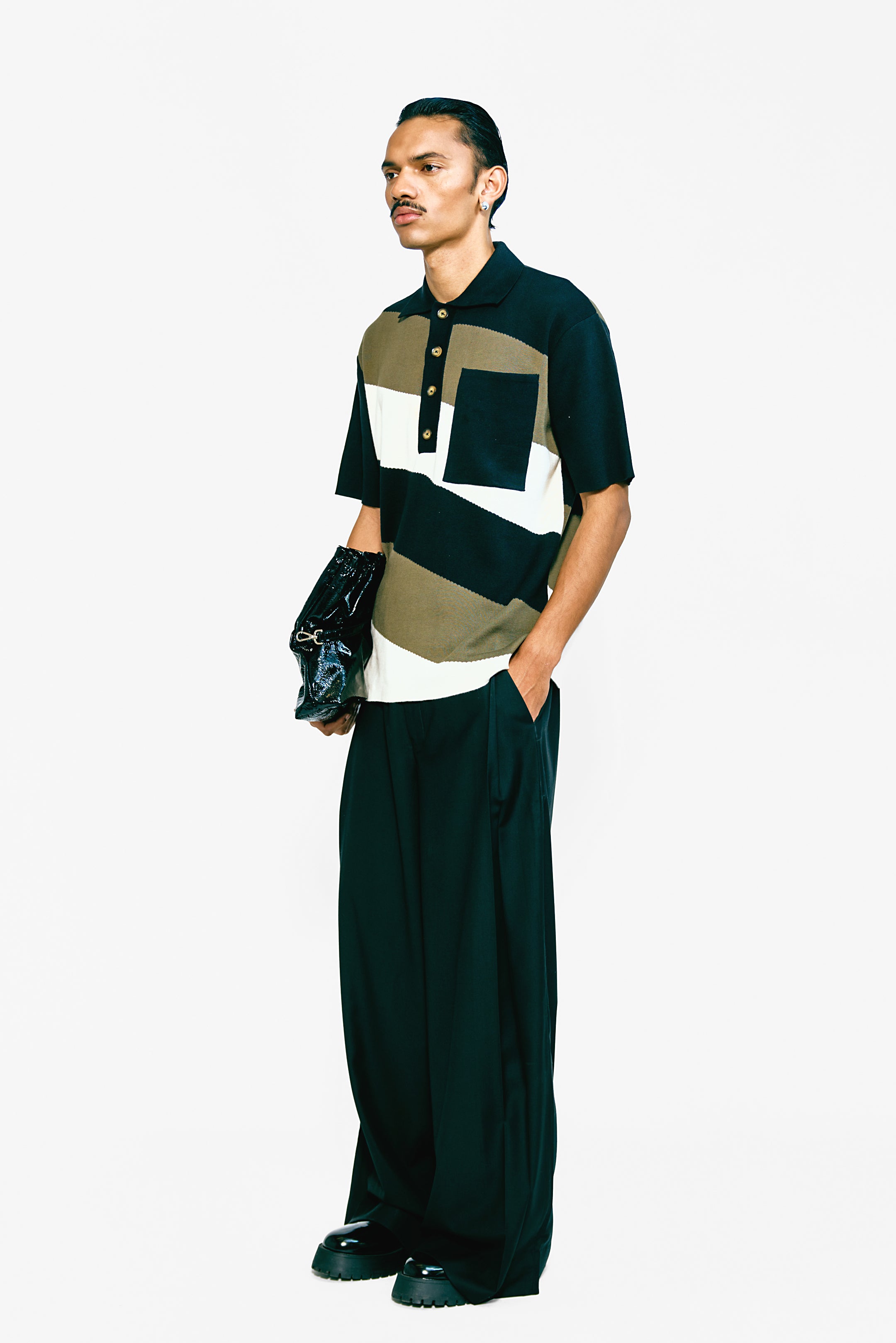 - Classic polo collar with a four-button placket, blending sporty and sophisticated elements.