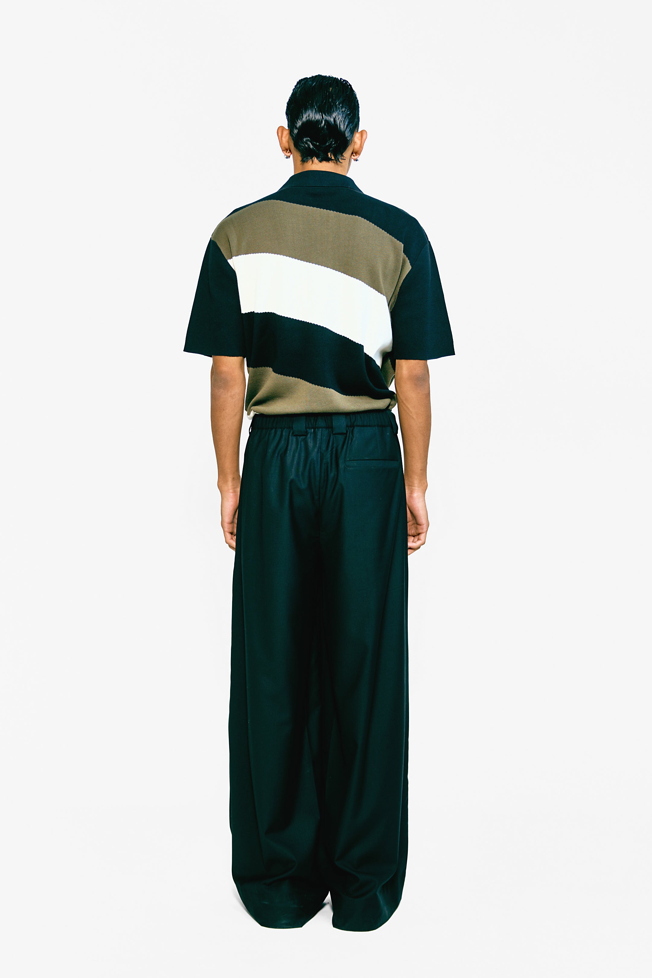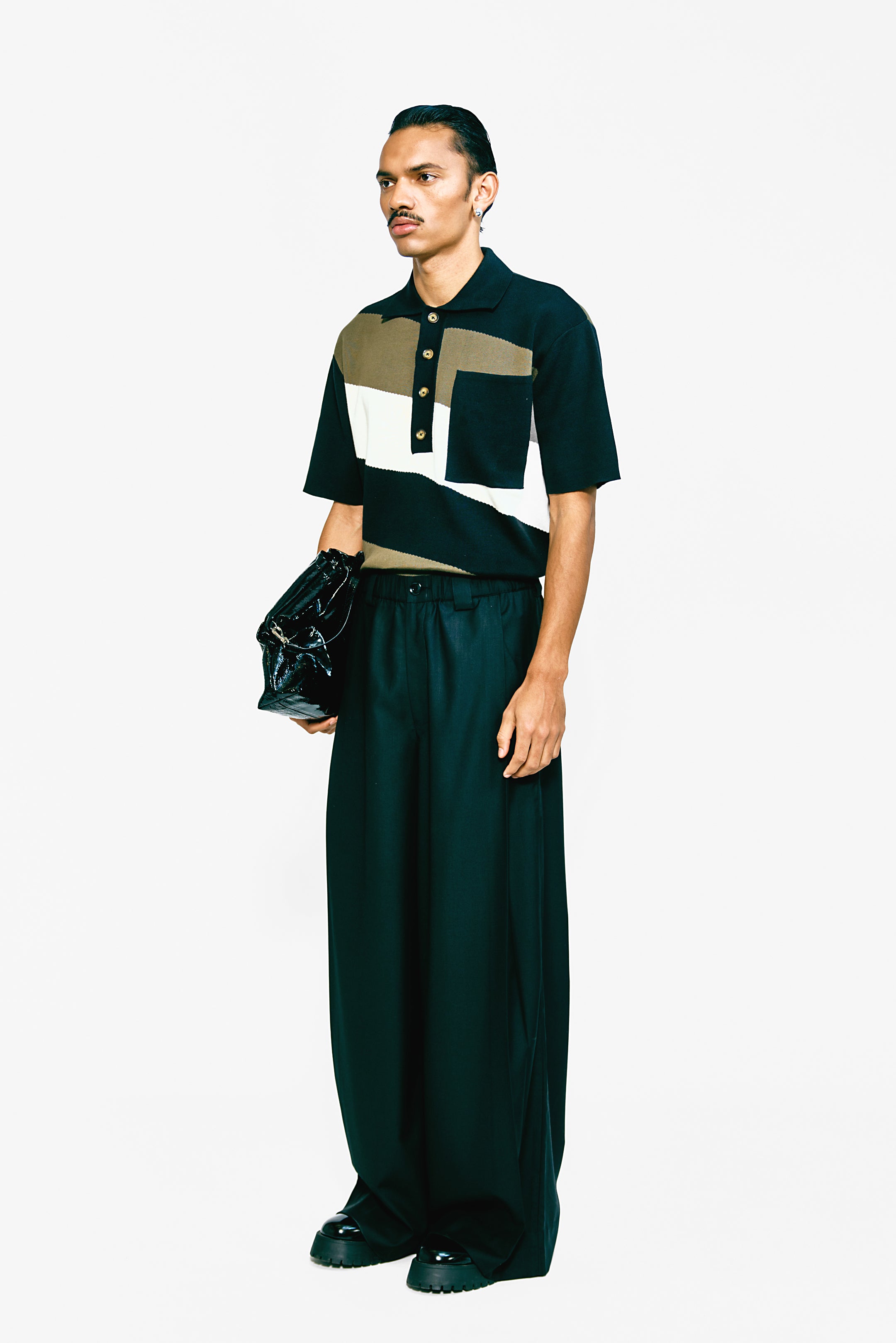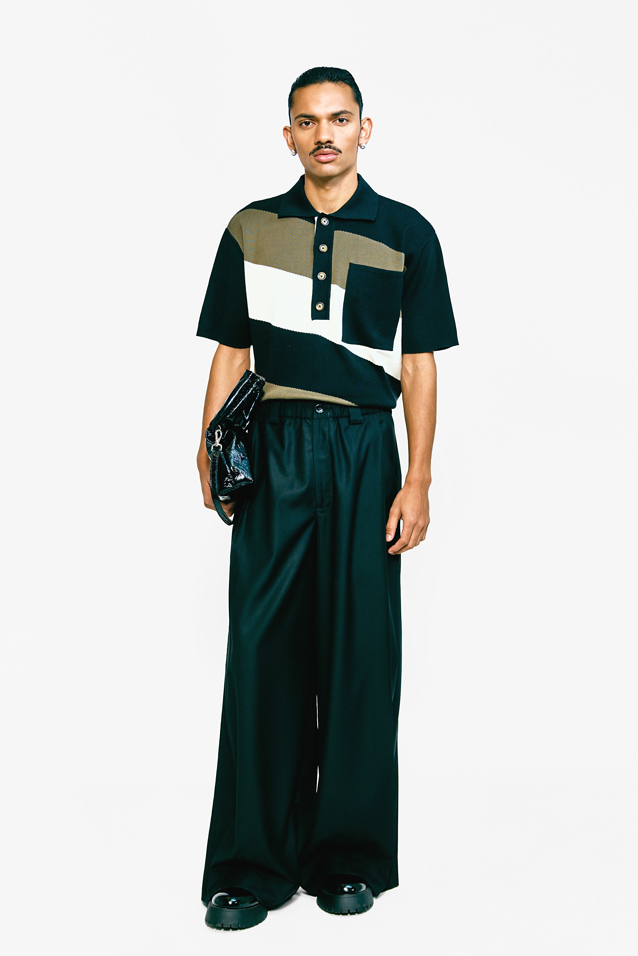- Classic polo collar with a four-button placket, blending sporty and sophisticated elements.