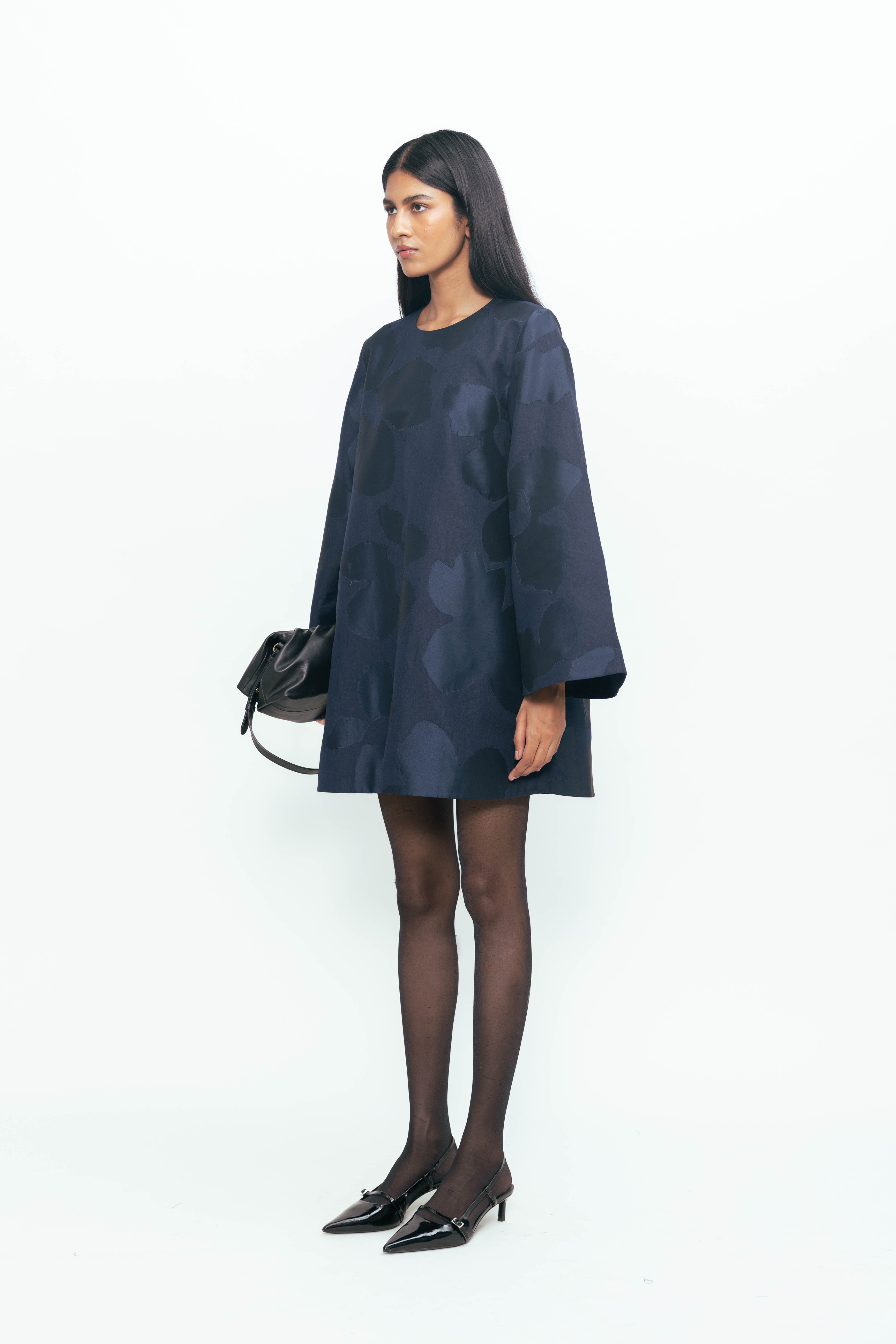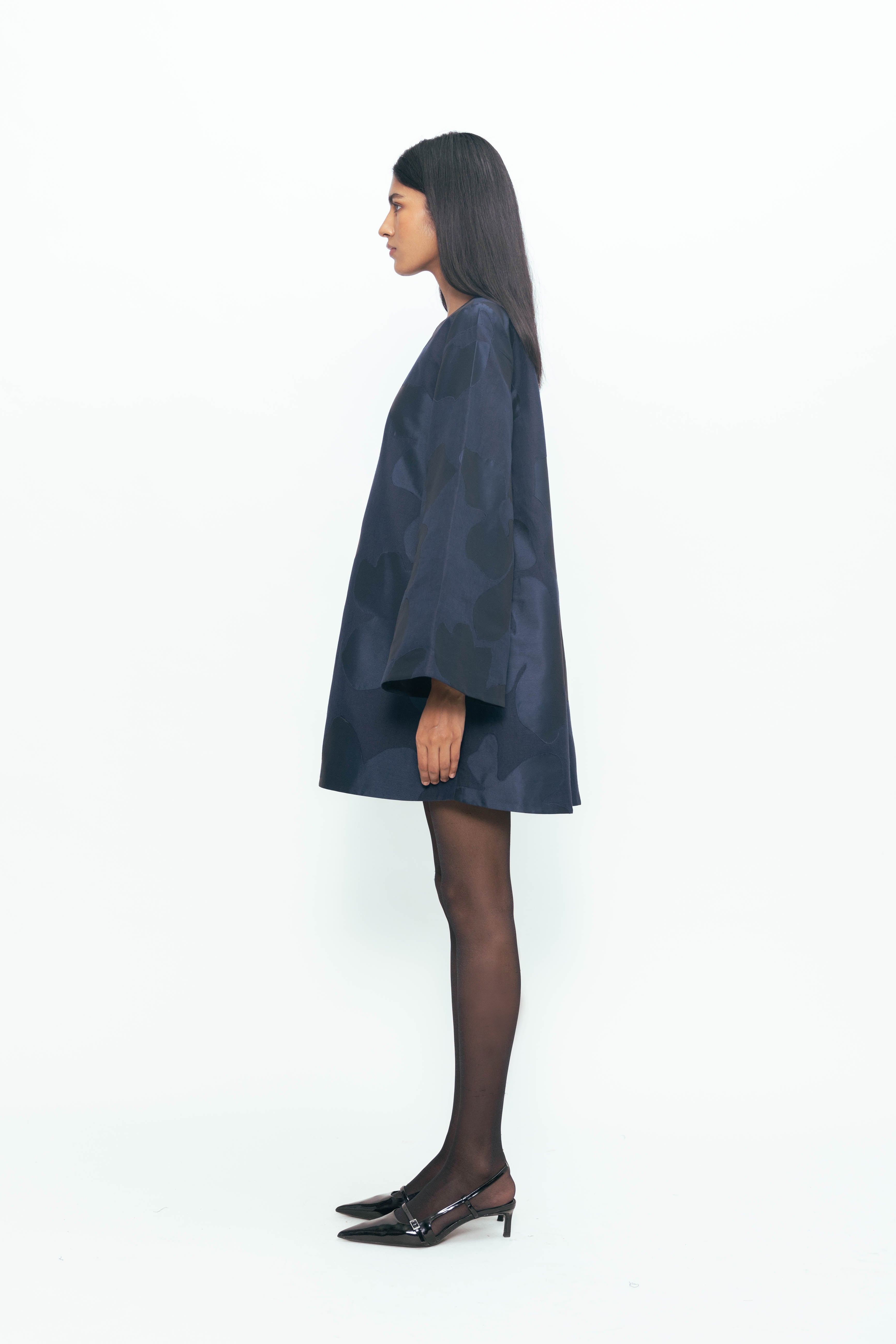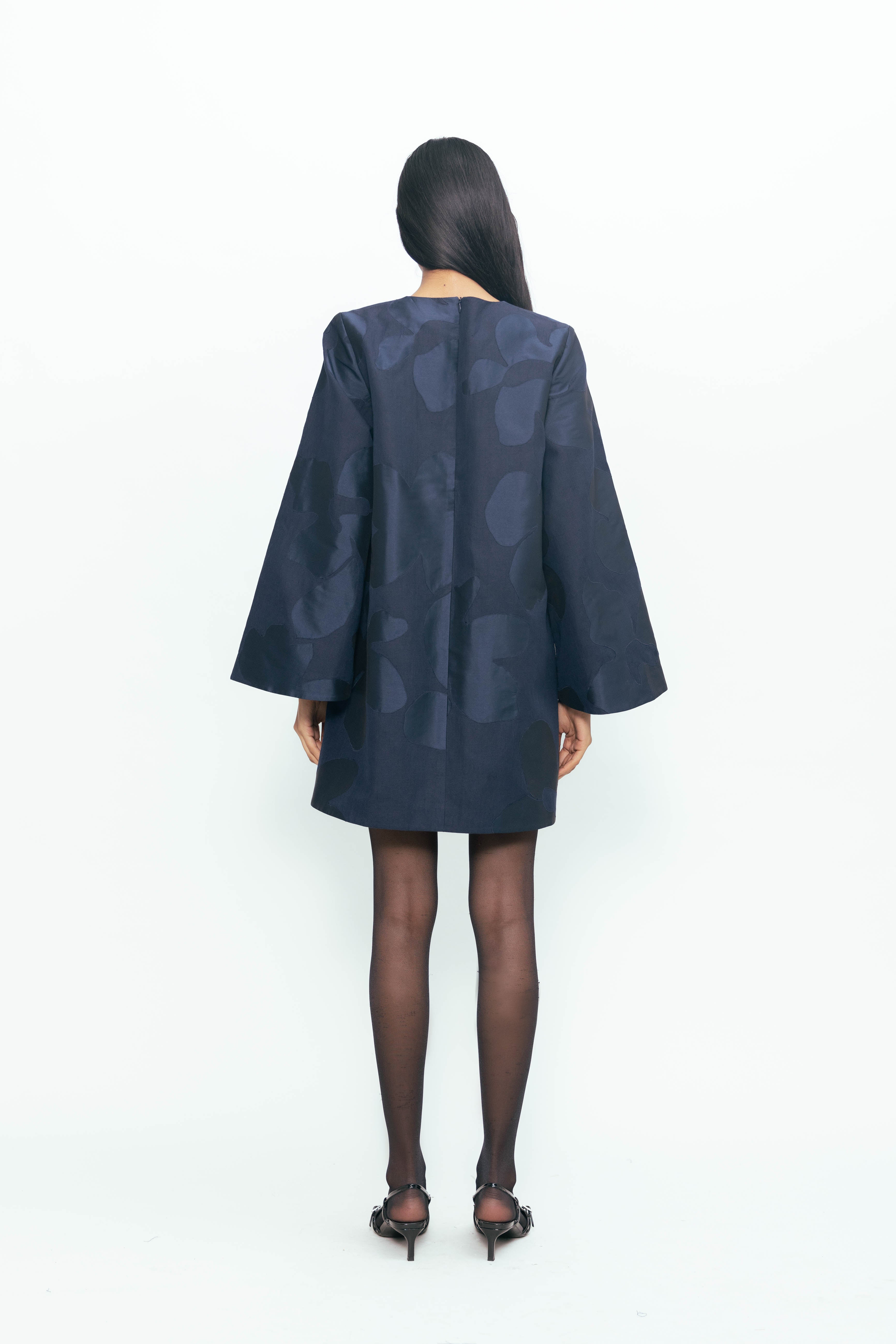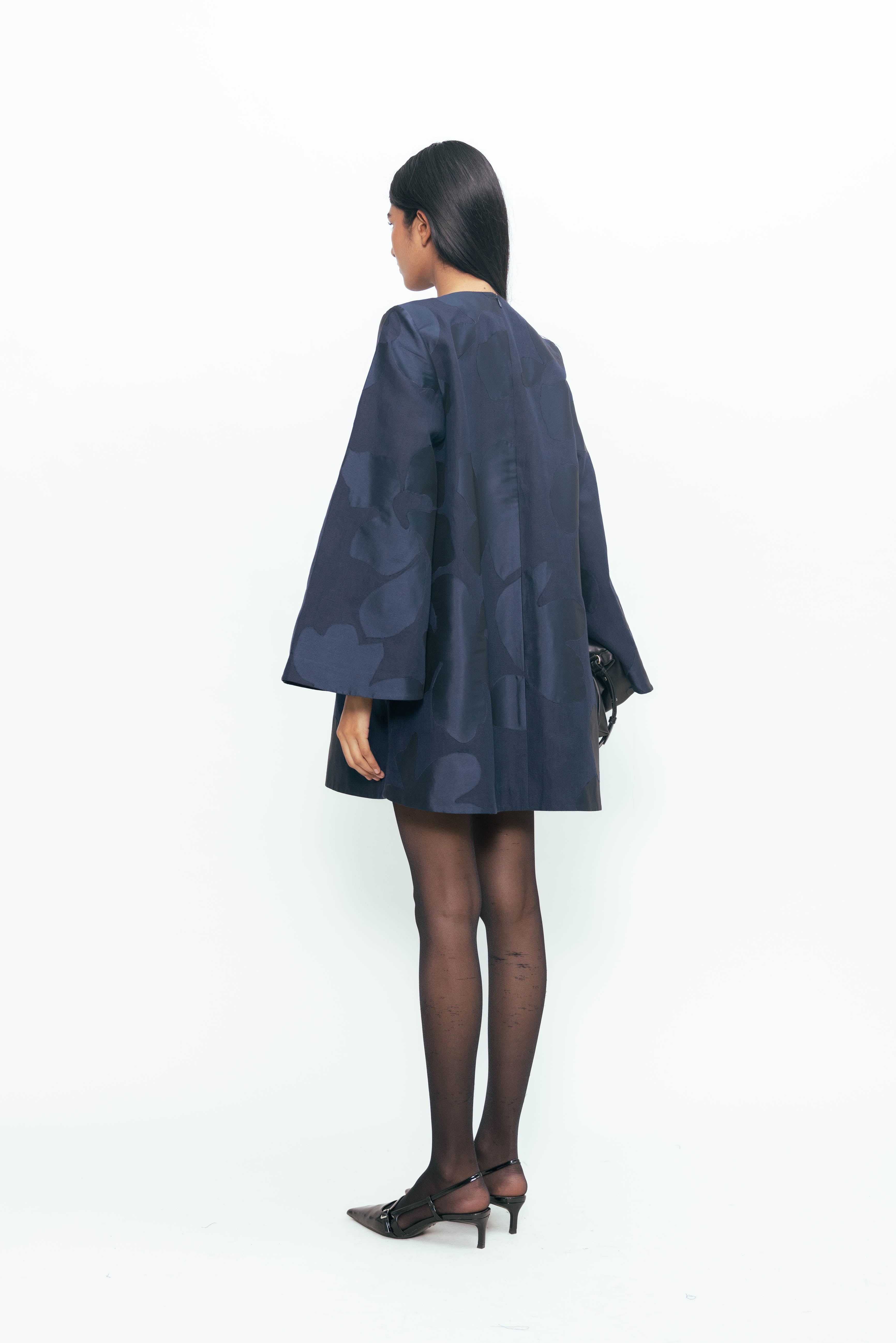 This piece plays with proportion and texture, where exaggerated sleeves bring volume and drama to a compact silhouette. Sharp contrasts in surface and tone create a patchwork of depth—matte meets sheen, soft meets structured—forming a rhythm that feels both spontaneous and intentional. Light moves differently across each panel, bringing quiet motion to a bold, grounded form. Confident, expressive, and full of presence.