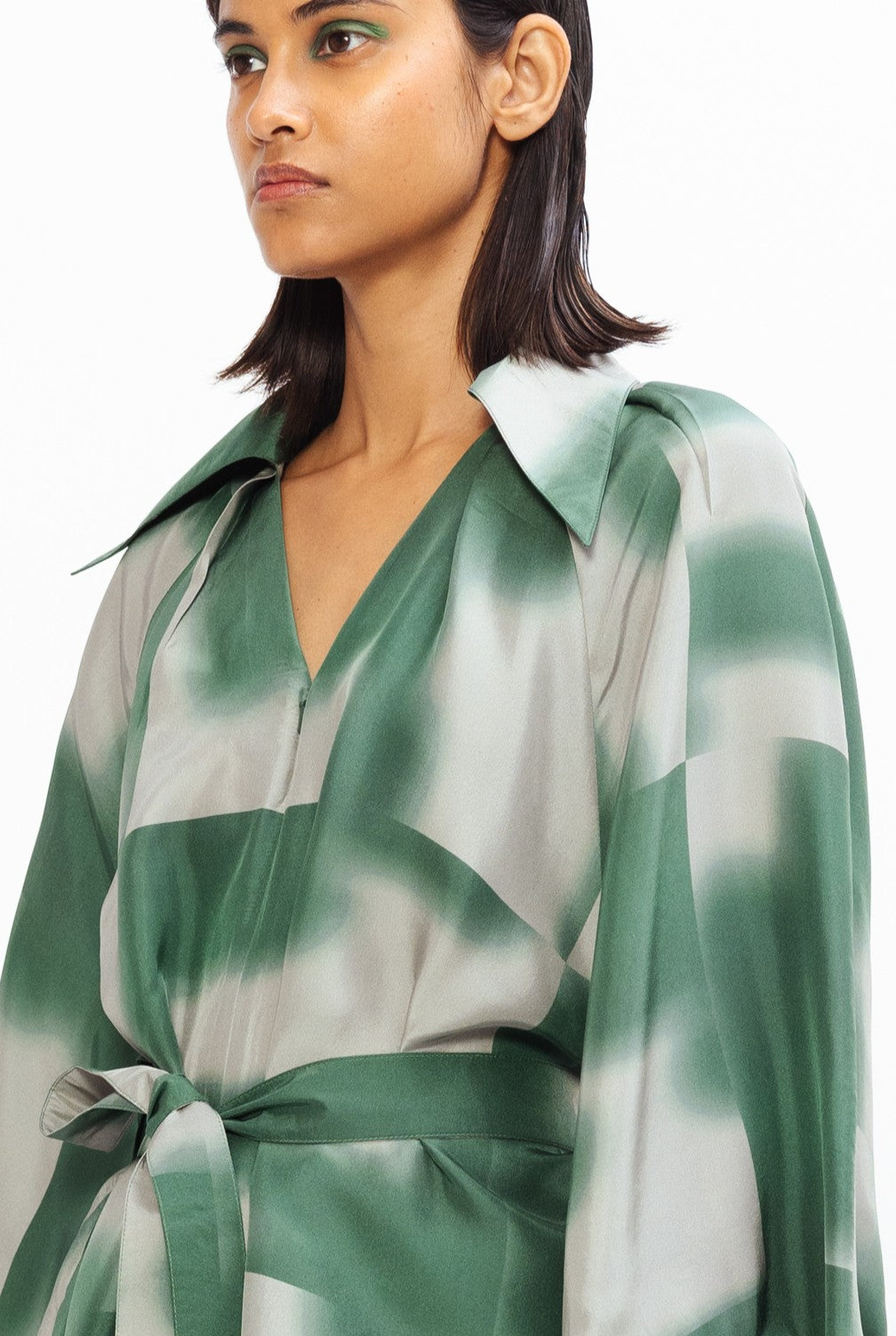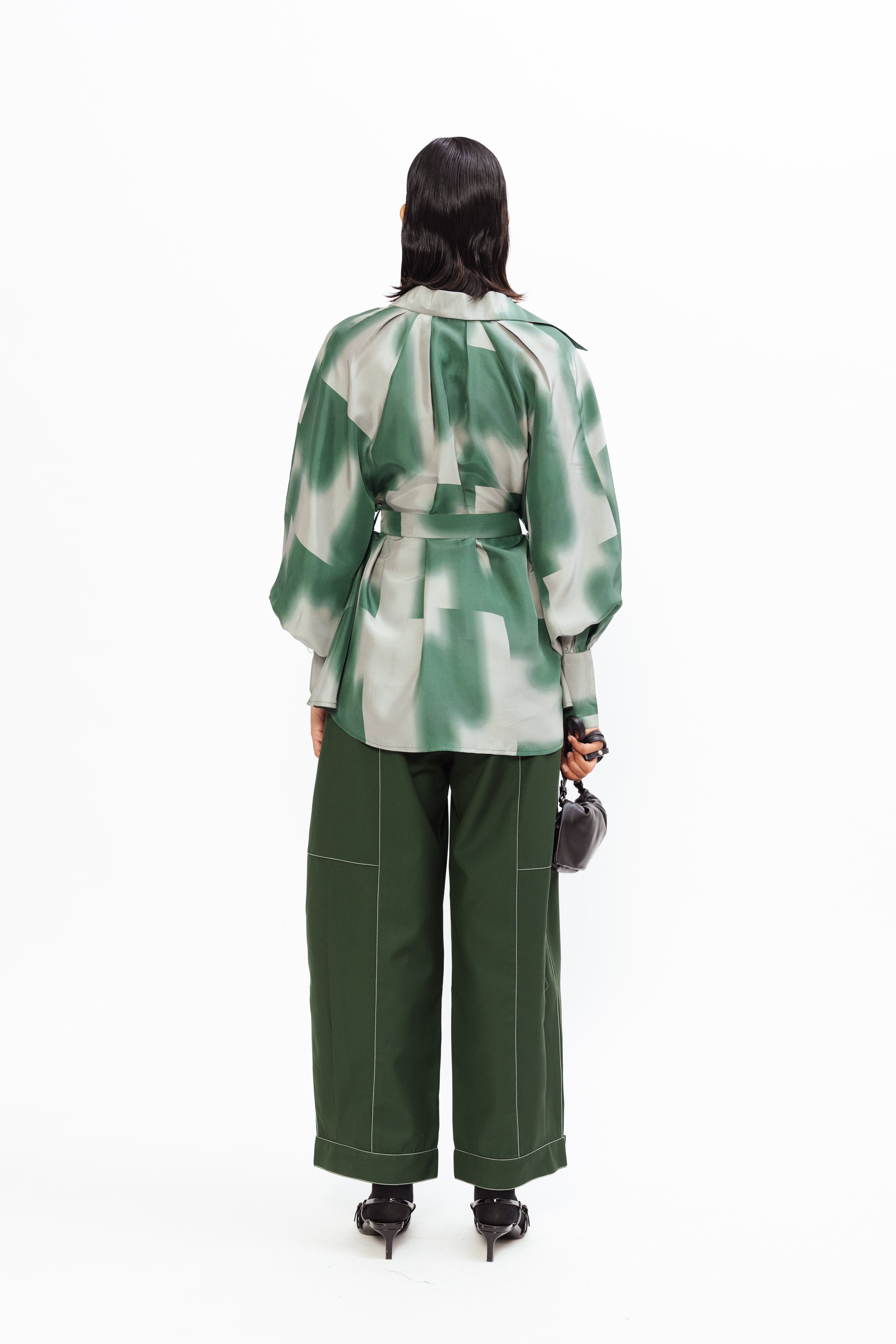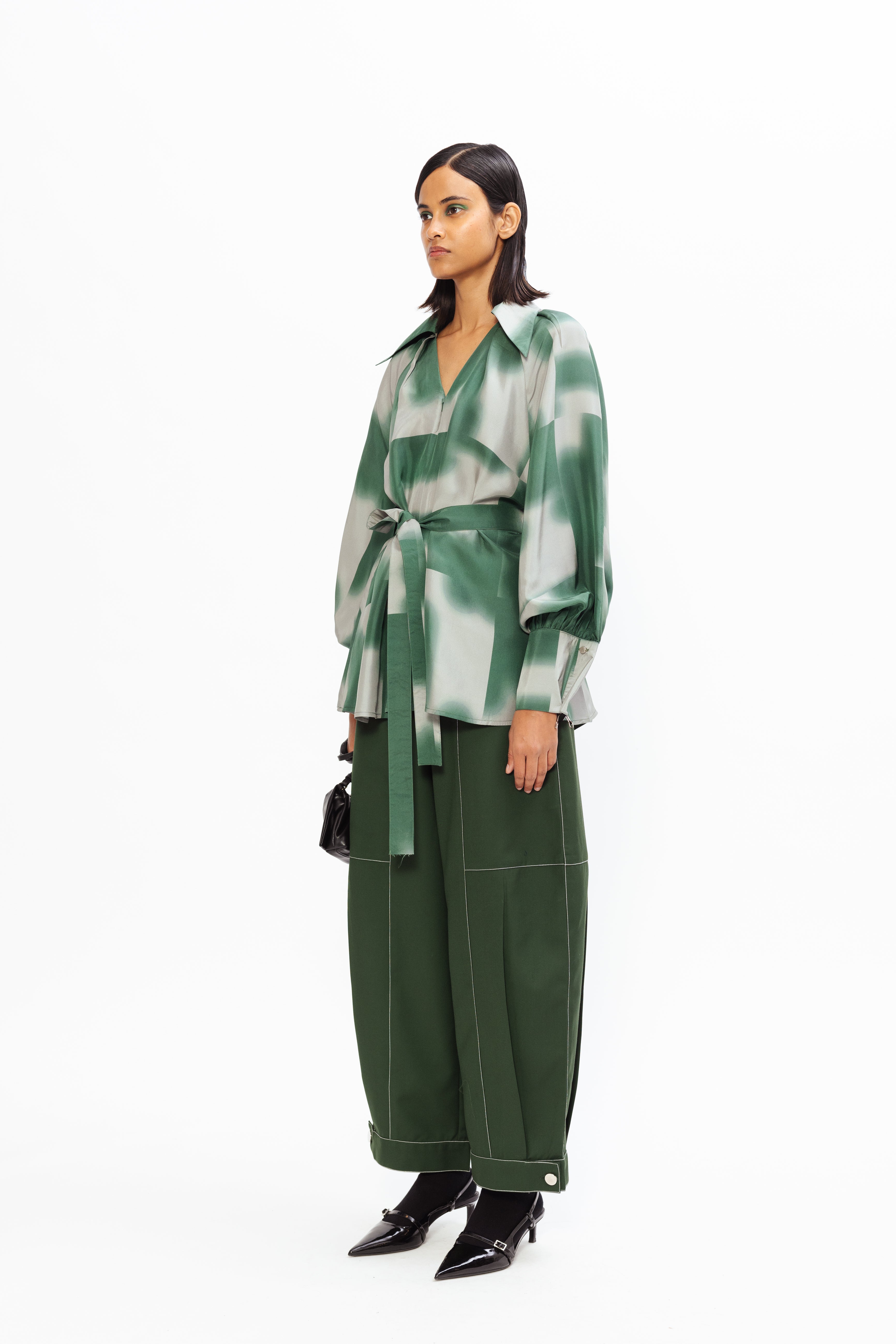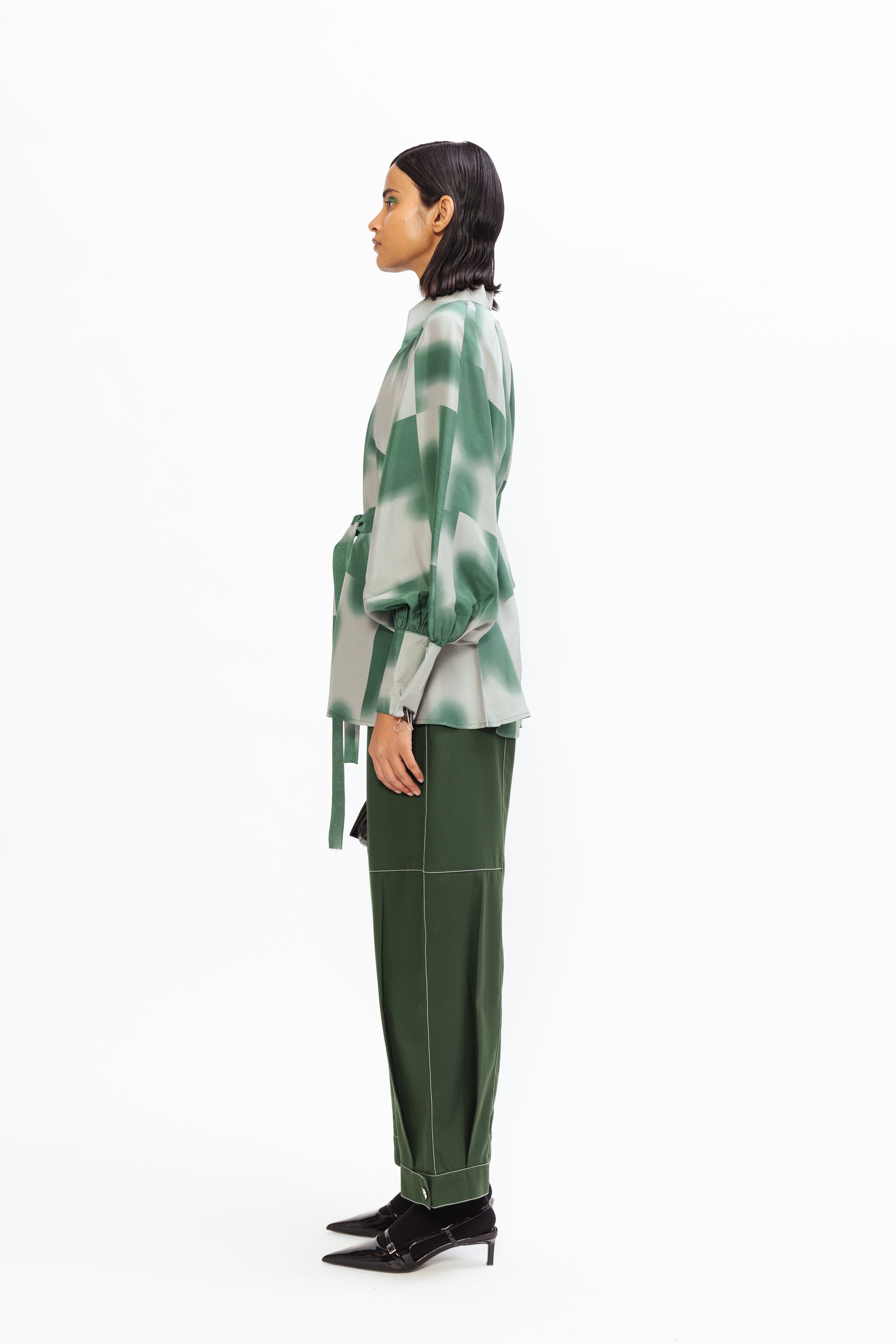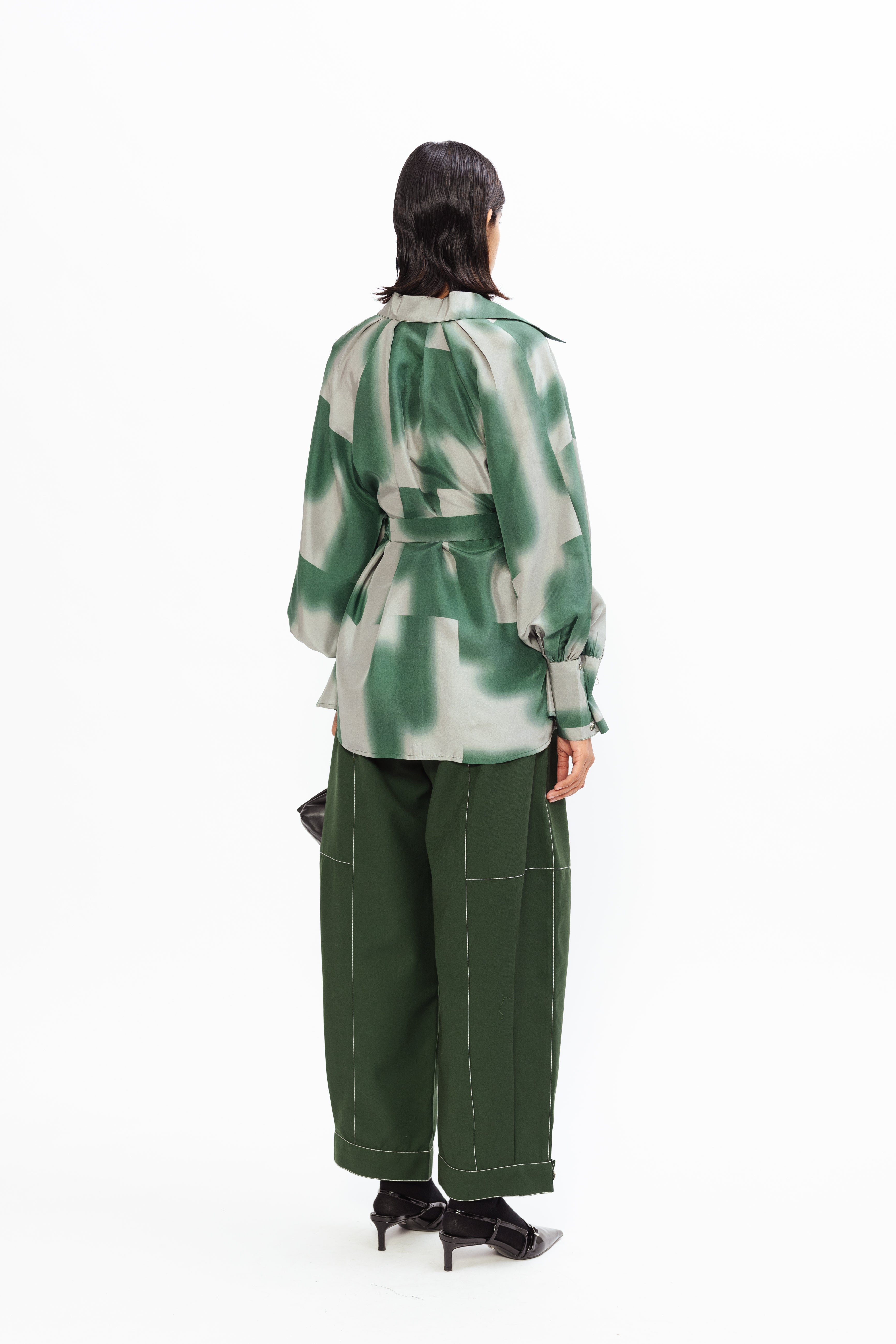 A graceful top crafted in lustrous green silk, featuring voluminous balloon sleeves that gather neatly at the cuffs. The fluid drape and subtle sheen of the fabric lend it an effortless elegance, making it a perfect blend of sophistication and ease for both day and evening wear.